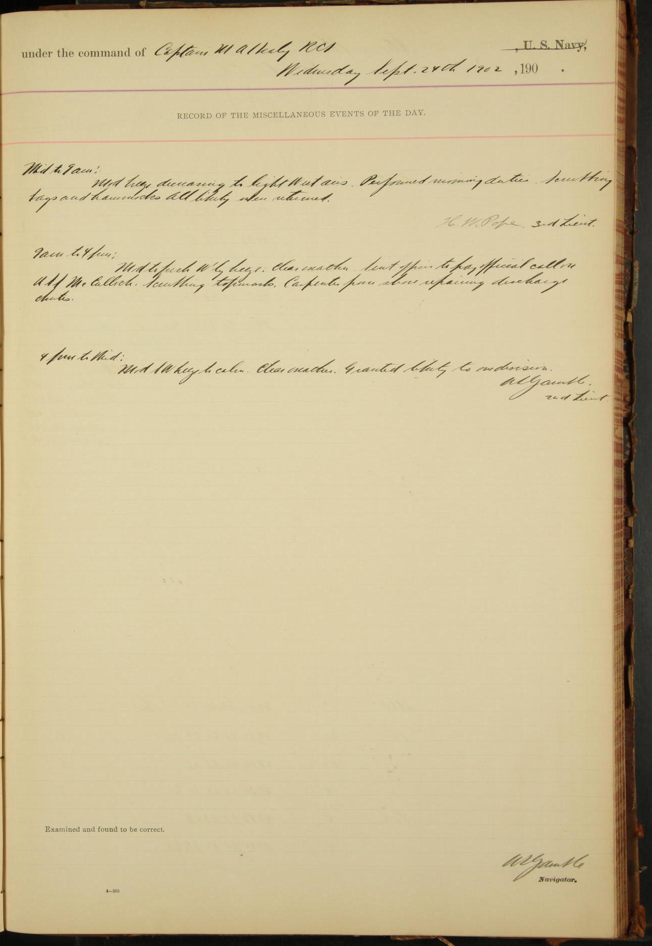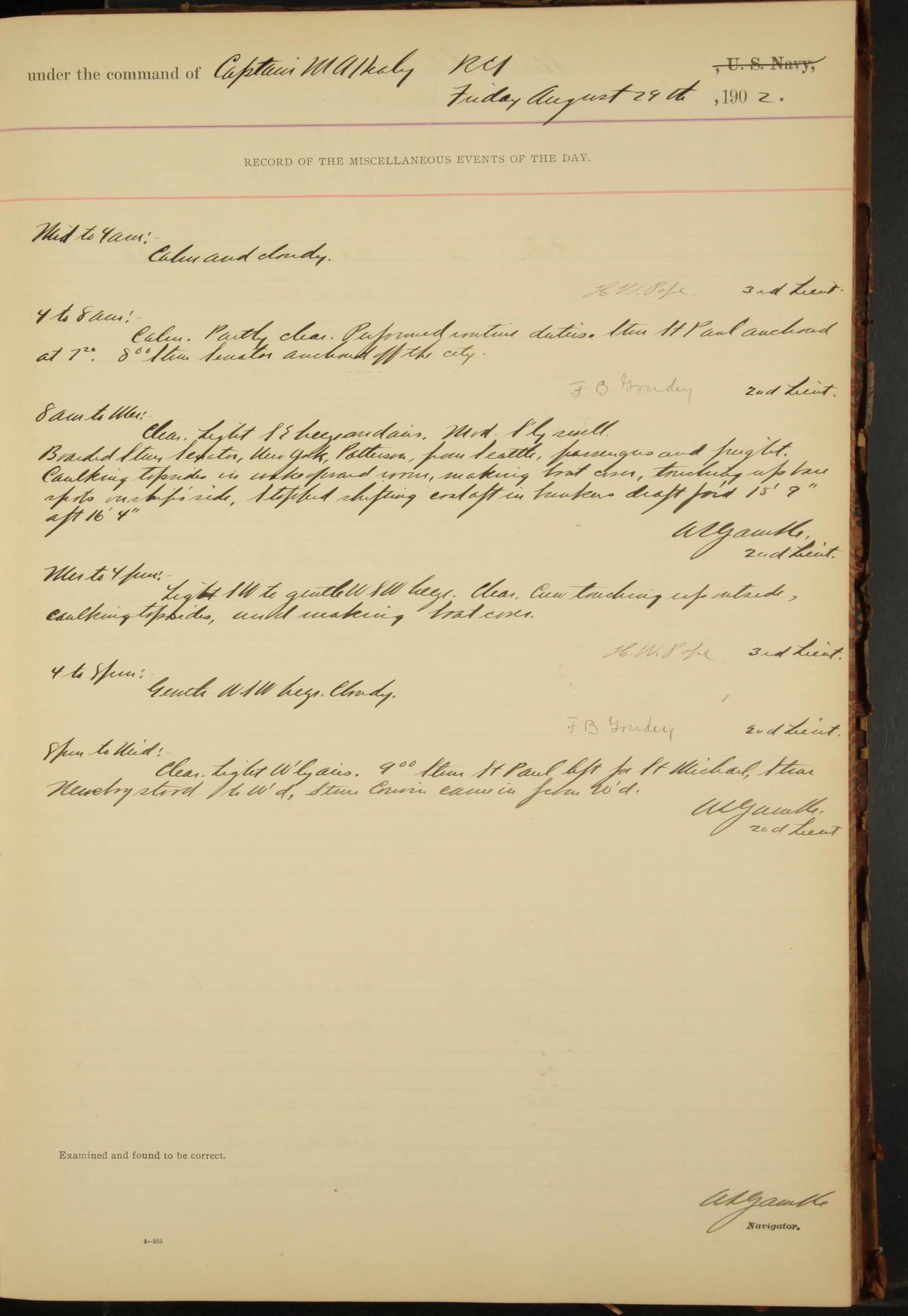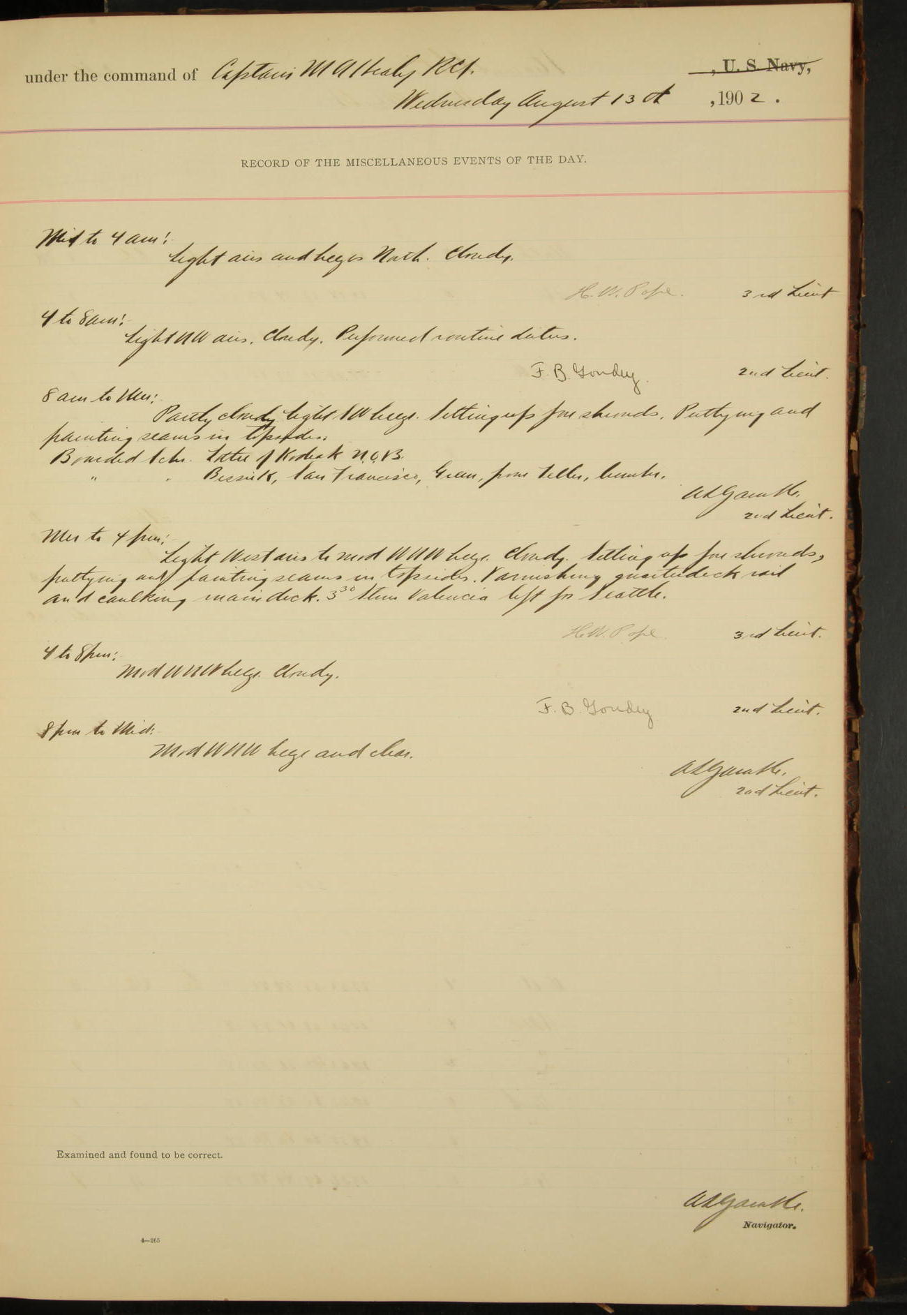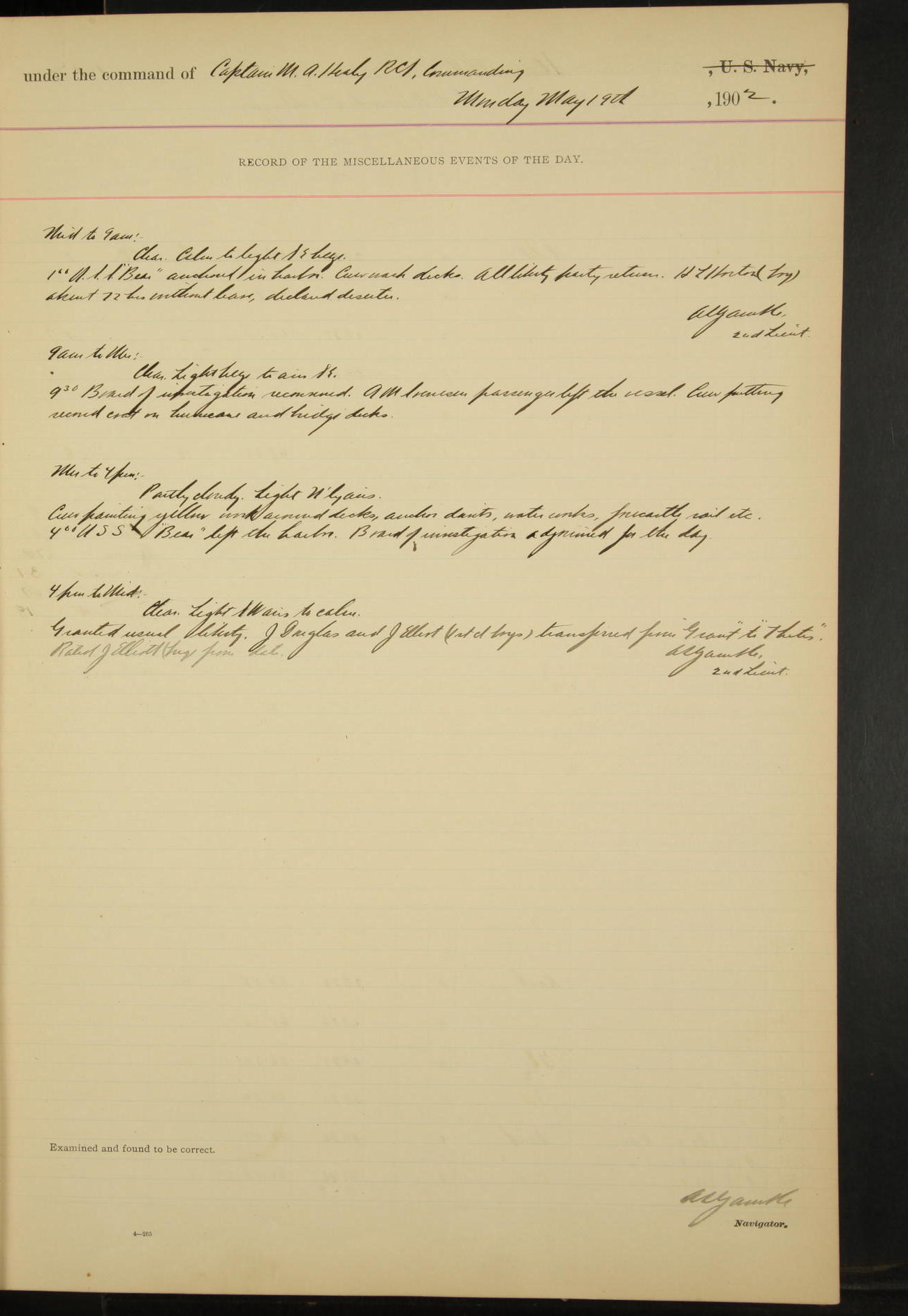 At 12.00 noon Contractor’s force stopped work on vessel and left the ship, leaving the balance of repairs until after the vessel returns from the Navy Yard.
