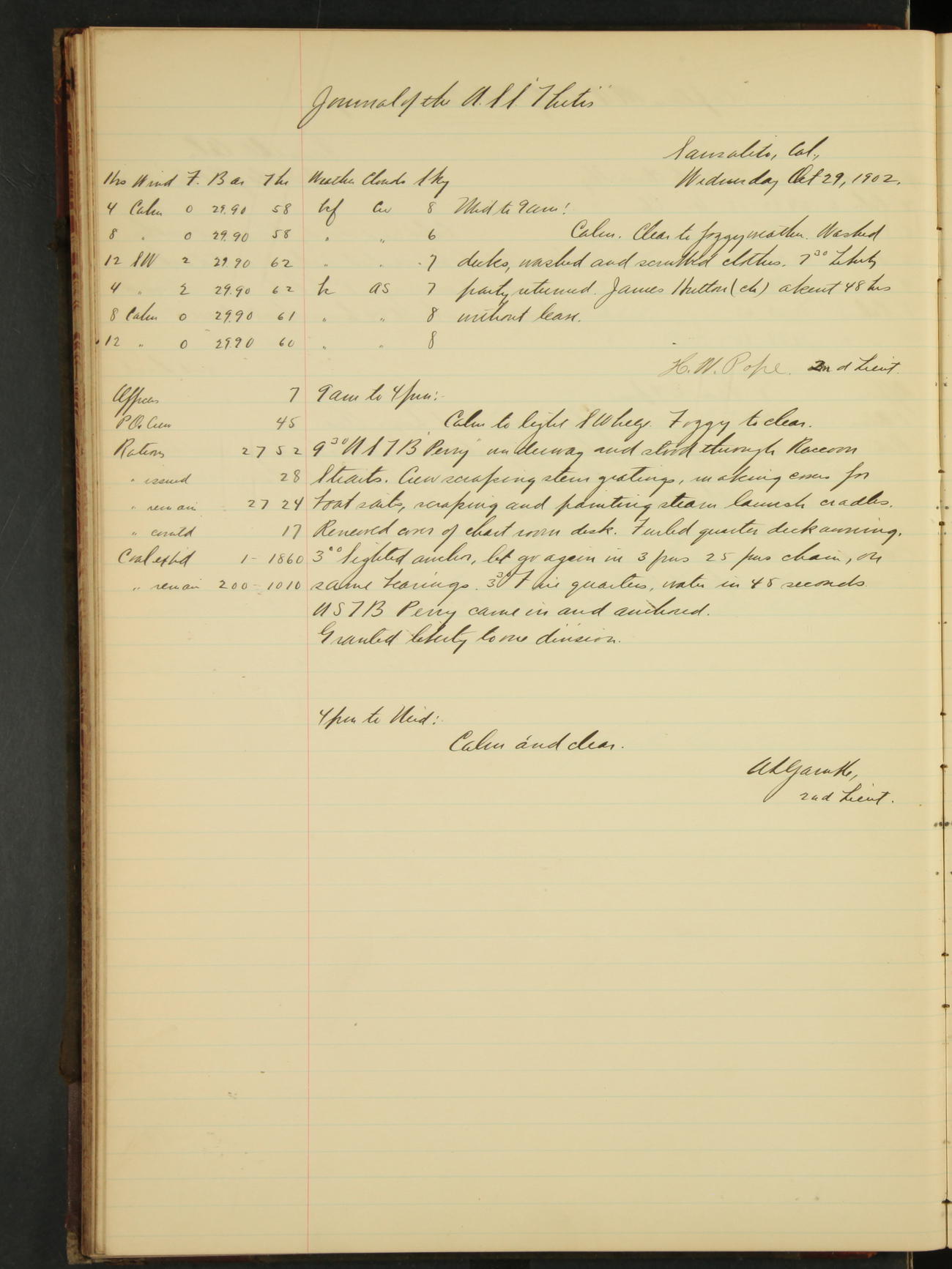 Chief Engineer J.A. Doyle and 1st Assistant Engineer Carl M. Green came on board to inspect cabin water closets.
