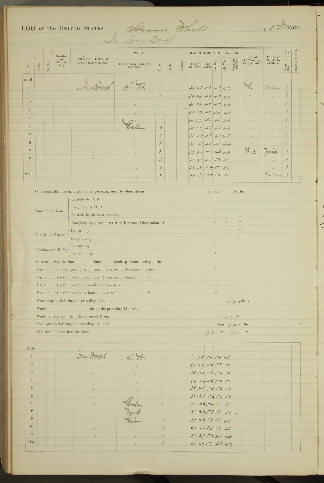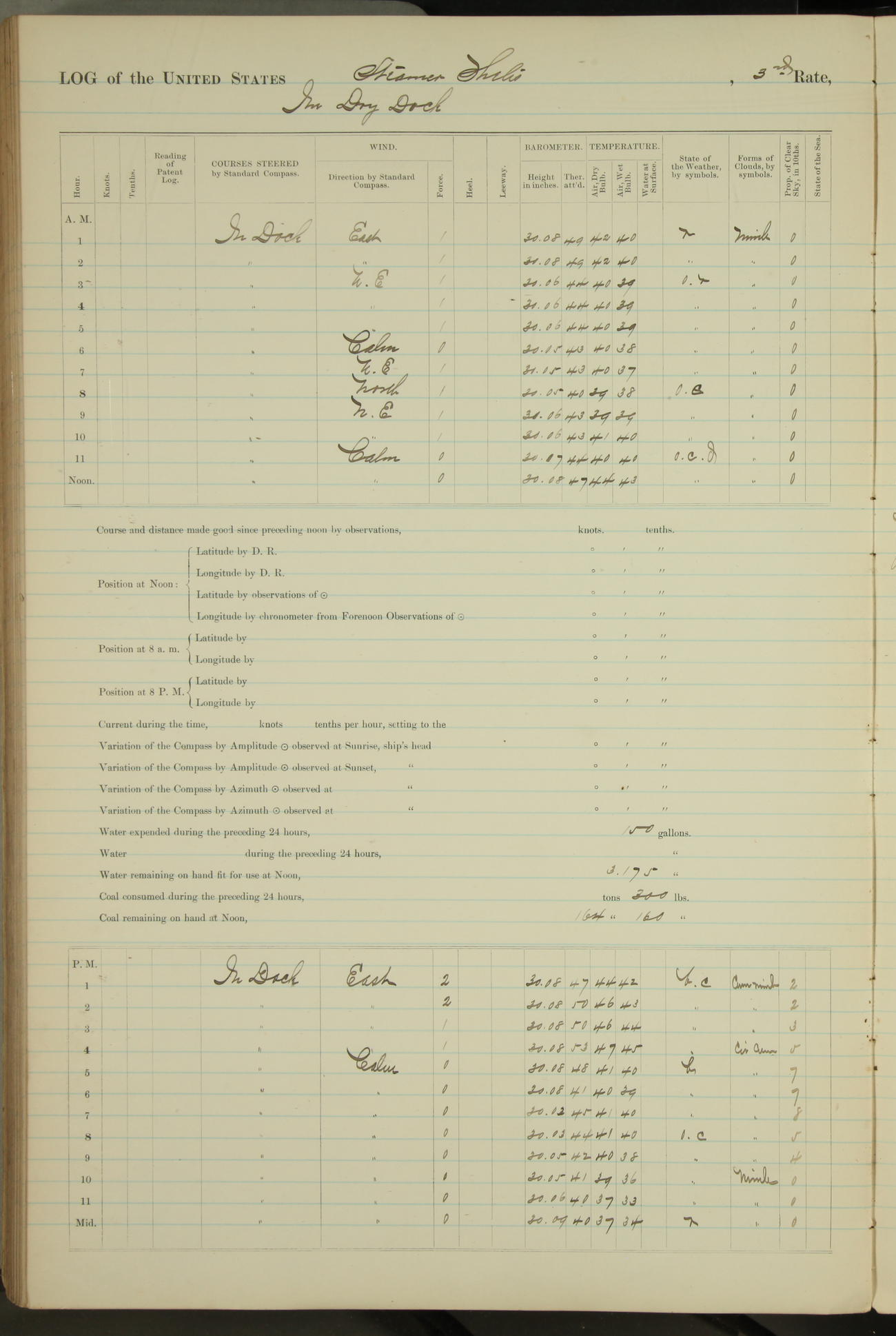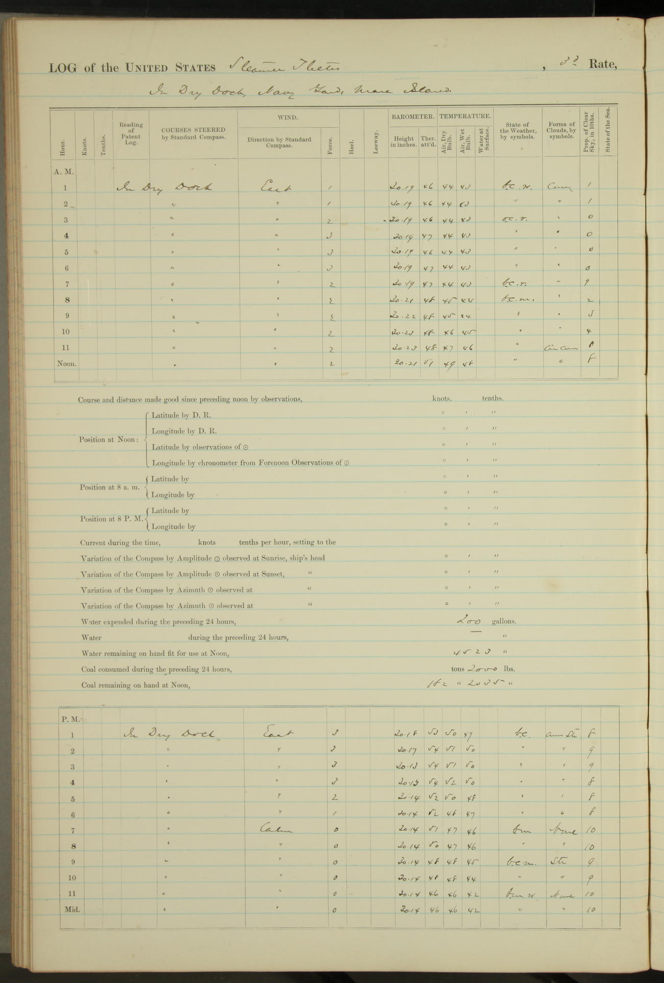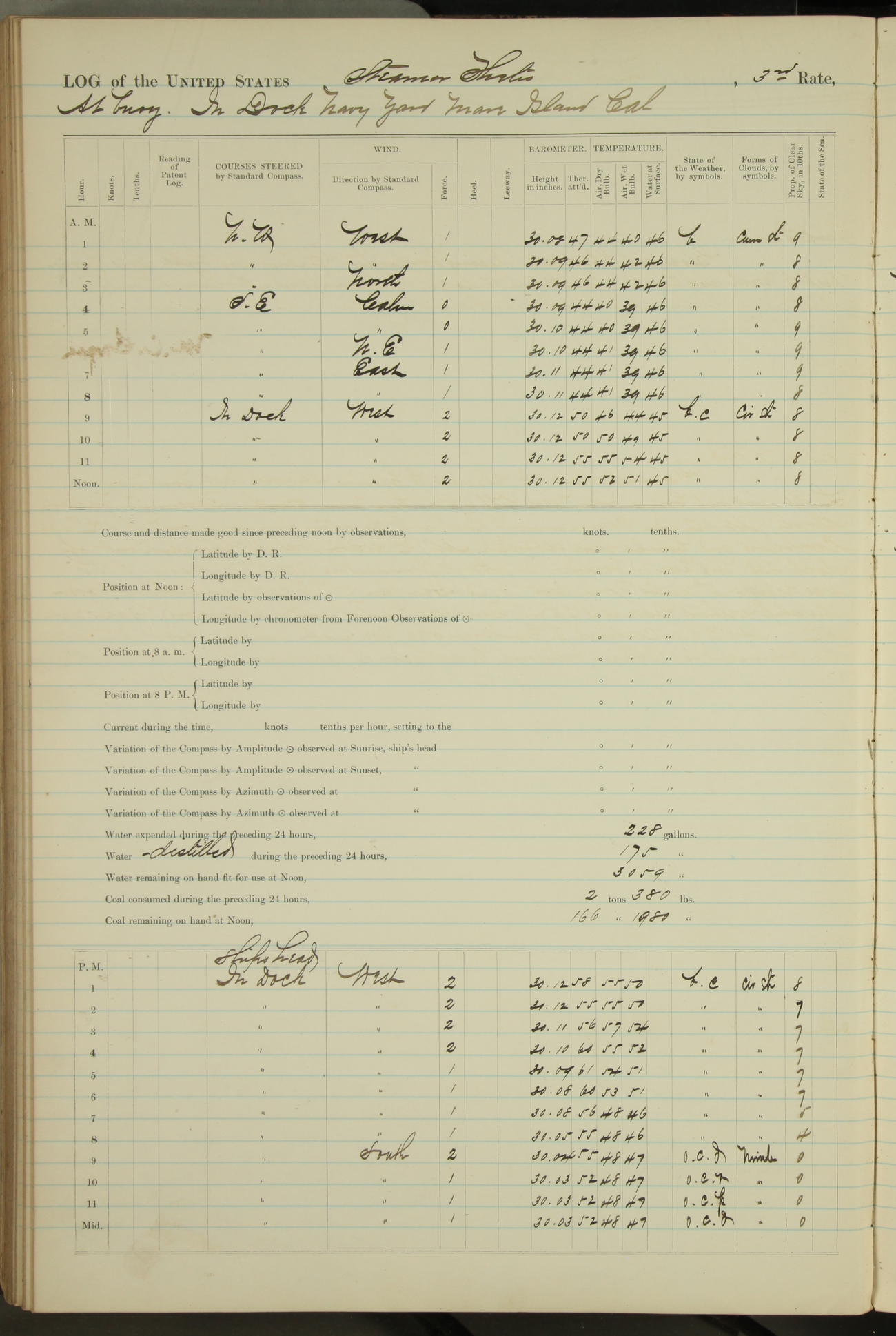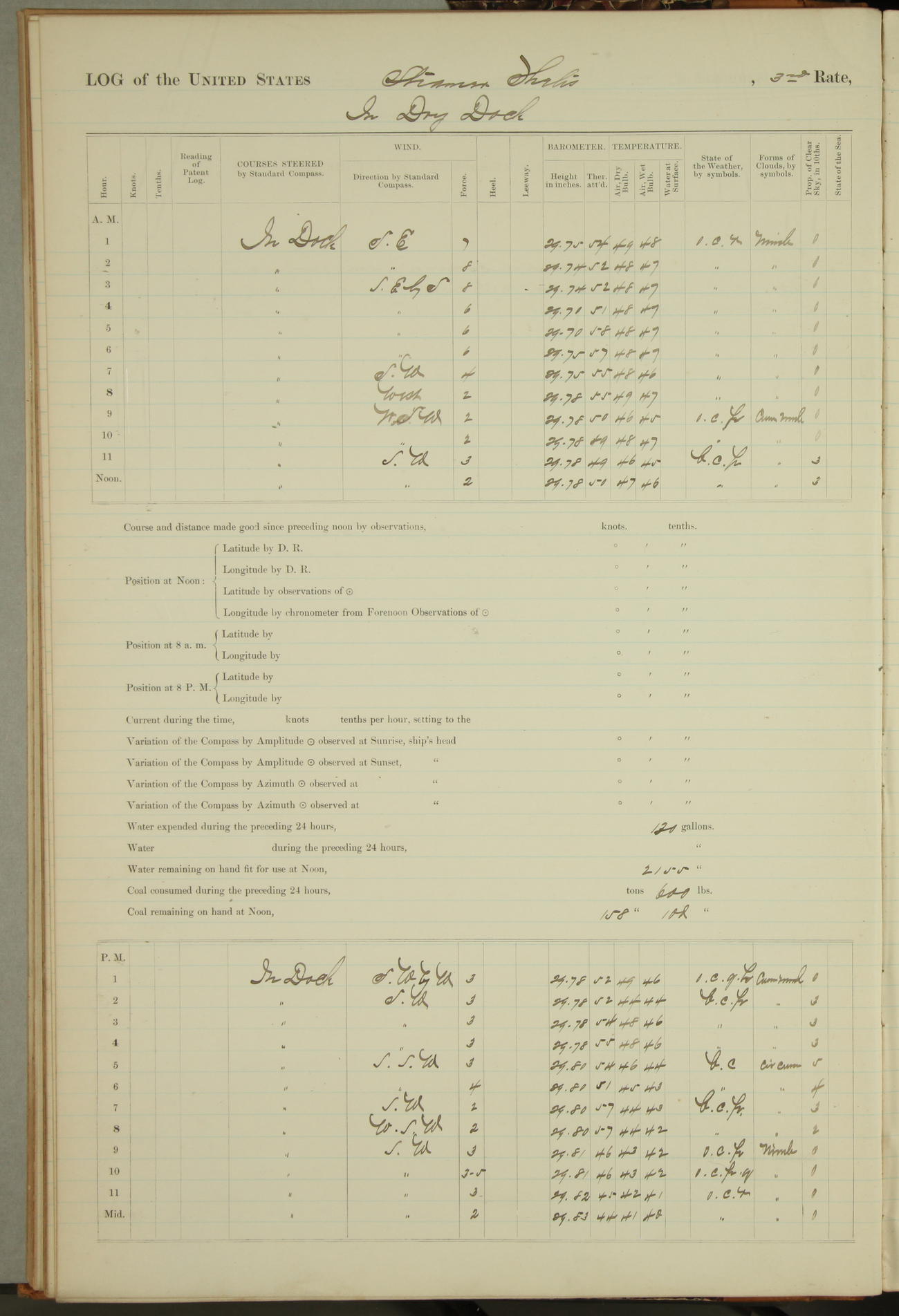 Shore people sinking dock until 10am, when found there something was wrong with section 3, so pumped out dock without ship getting out. Found that the stern of entrance gate had ~~~ in section 3, as abandoned attempt to get ship out of dock to-day. Started fires in dandy boiler, then hauled them. Transferred to US Naval Hospital A. Claus (C~) & A. Toat (Sea) by order of Commanding Officer J. Rattler (ICF) was rated oiler, J.V. Cronin (ICF) was rated 1st class fireman, & G.F. Gun (Oiler) was disrated to first class fireman.