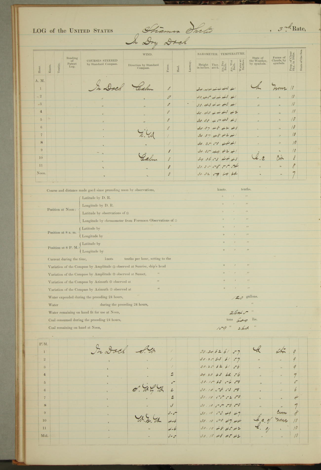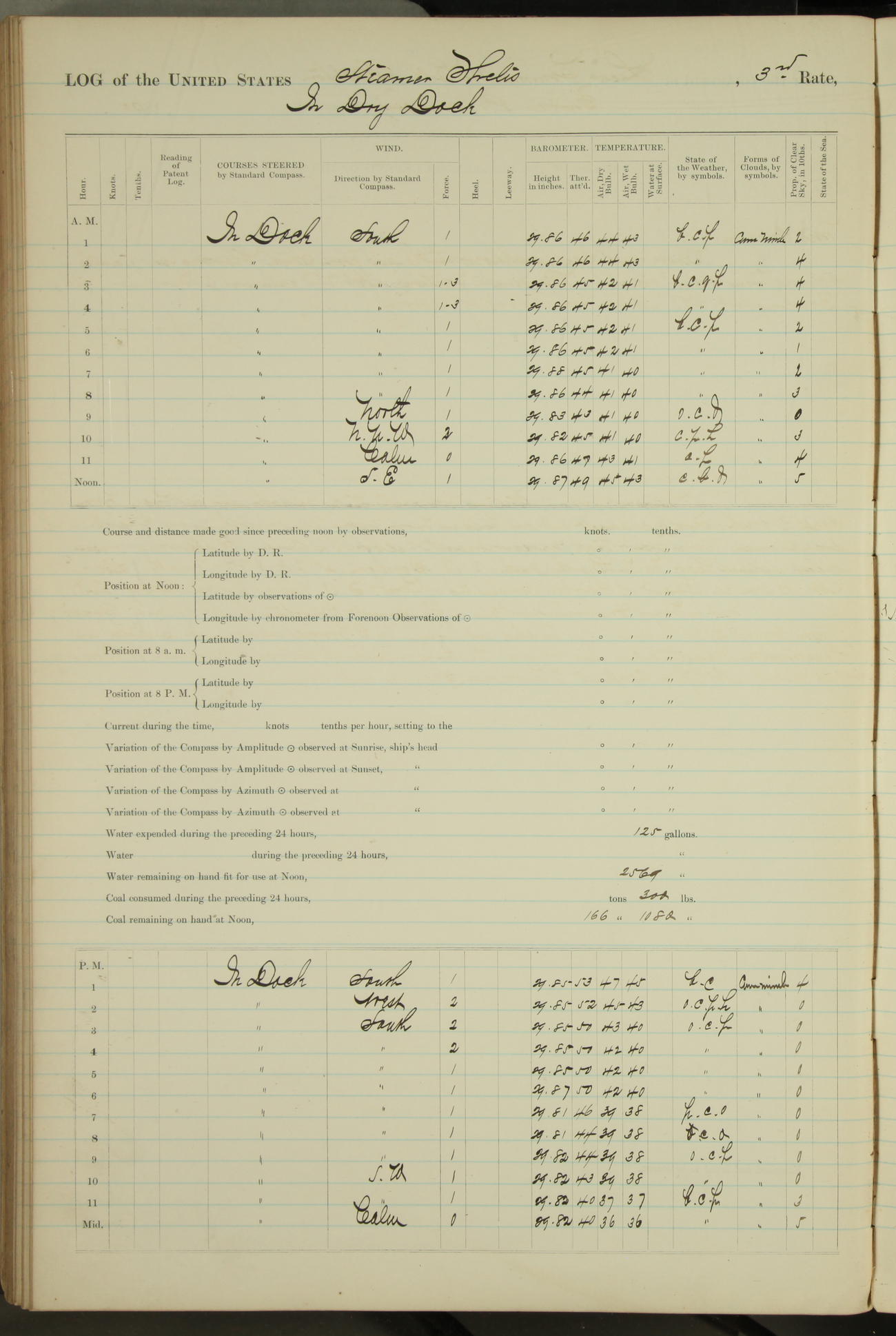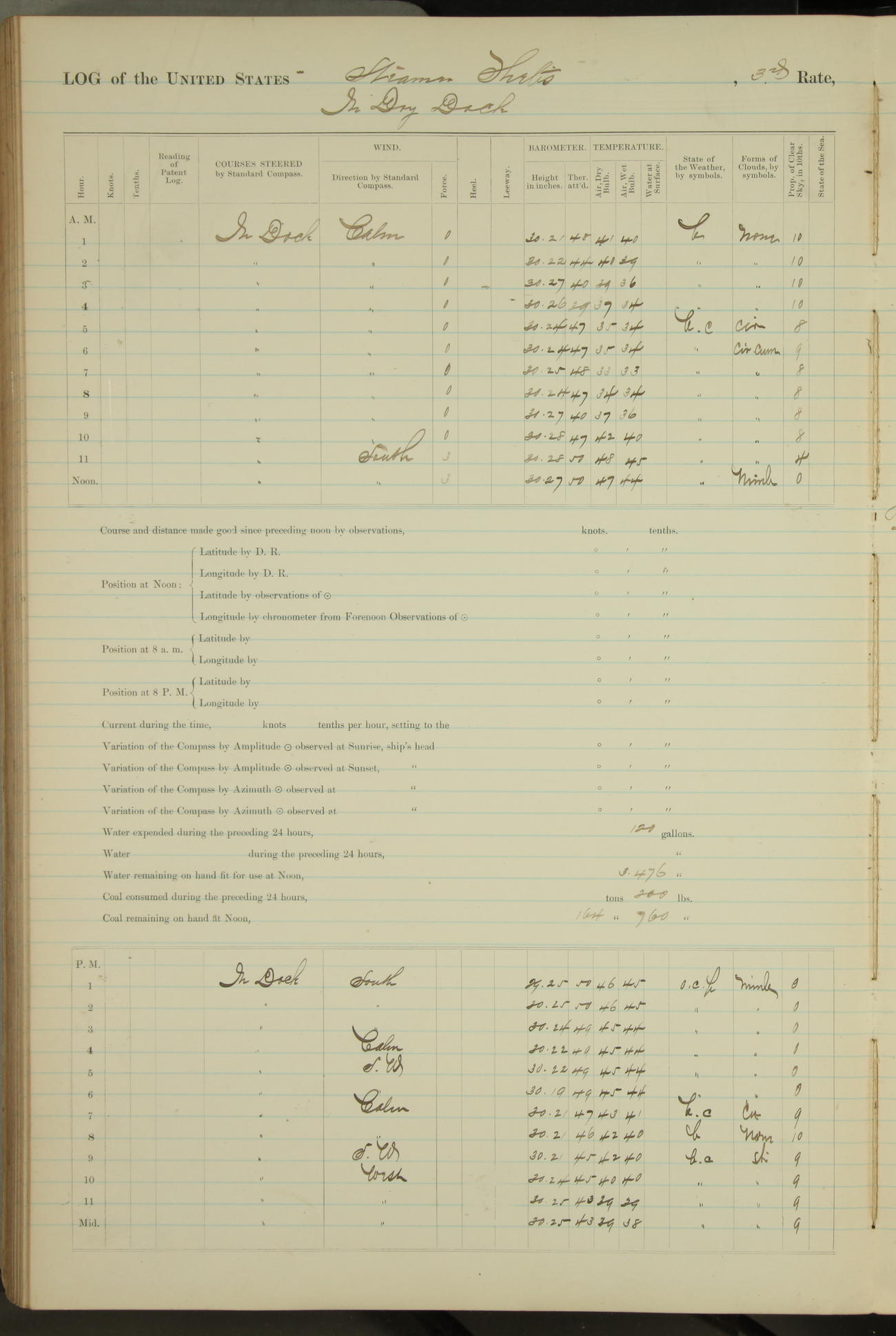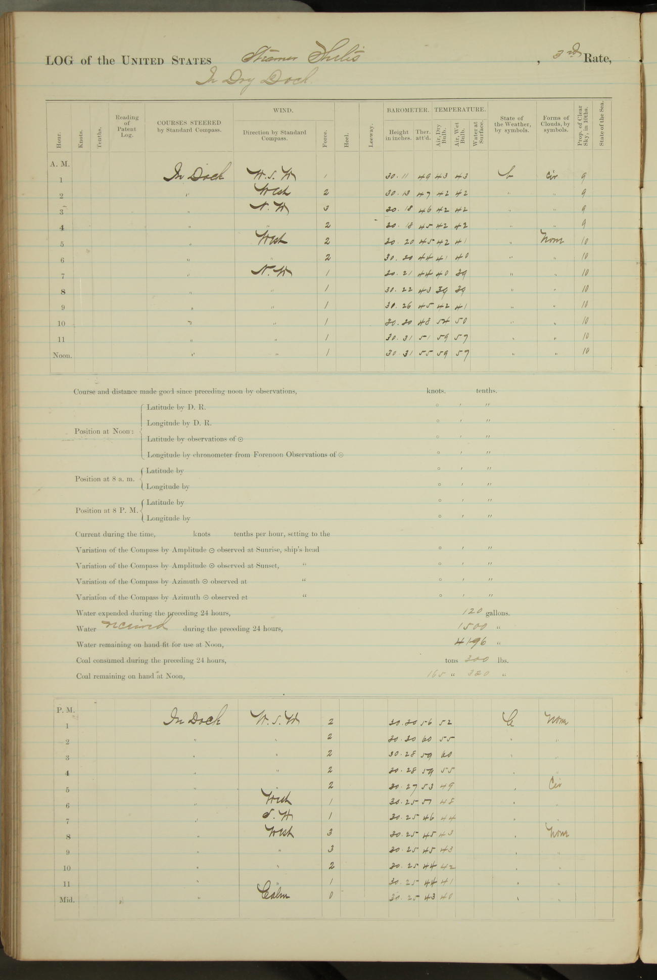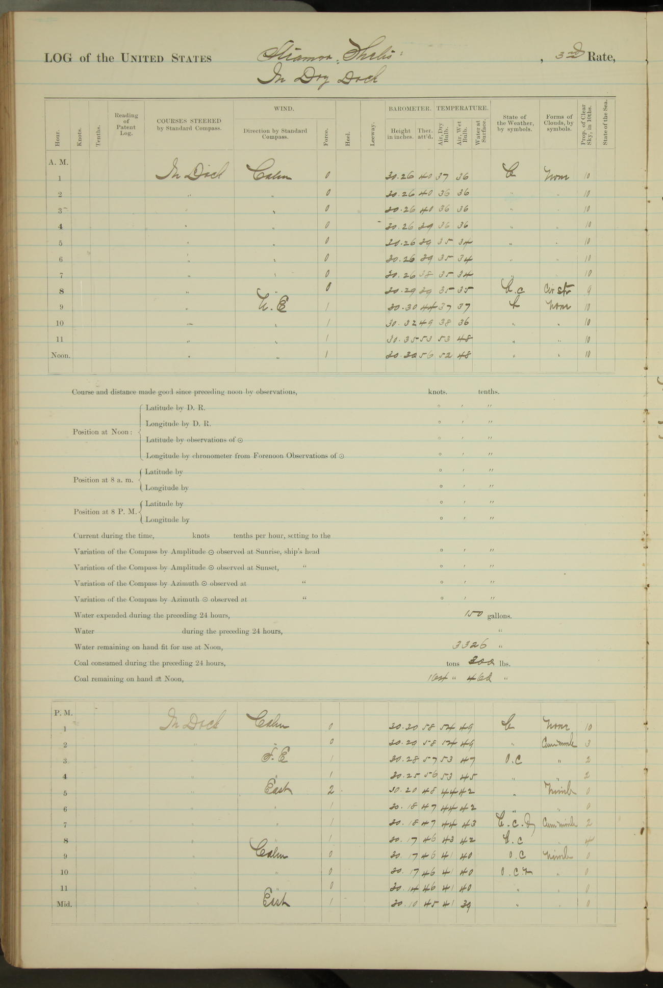 Shore people sinking dock until 10am, when found there something was wrong with section 3, so pumped out dock without ship getting out. Found that the stern of entrance gate had ~~~ in section 3, as abandoned attempt to get ship out of dock to-day. Started fires in dandy boiler, then hauled them. Transferred to US Naval Hospital A. Claus (C~) & A. Toat (Sea) by order of Commanding Officer J. Rattler (ICF) was rated oiler, J.V. Cronin (ICF) was rated 1st class fireman, & G.F. Gun (Oiler) was disrated to first class fireman.