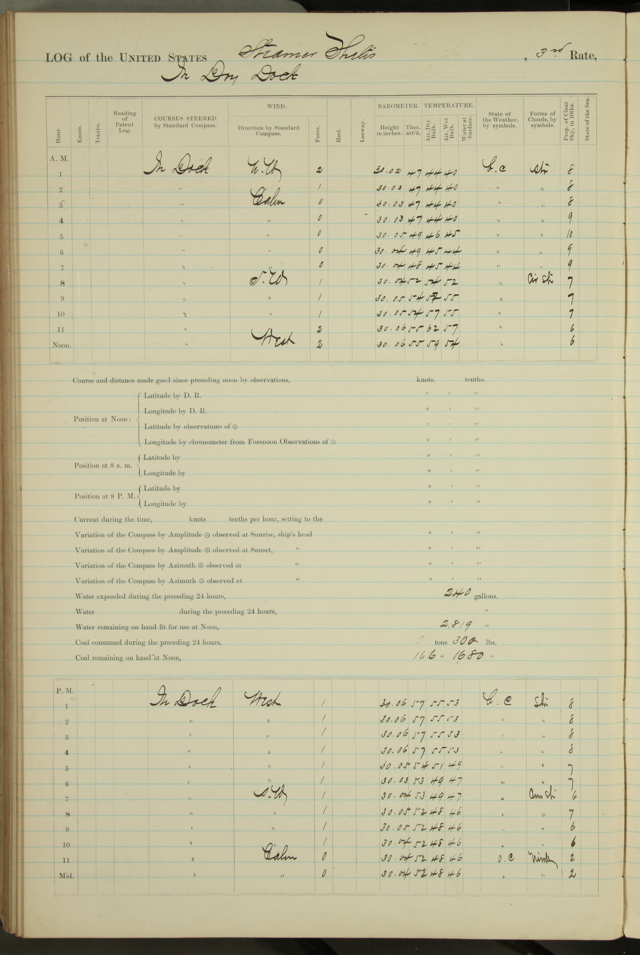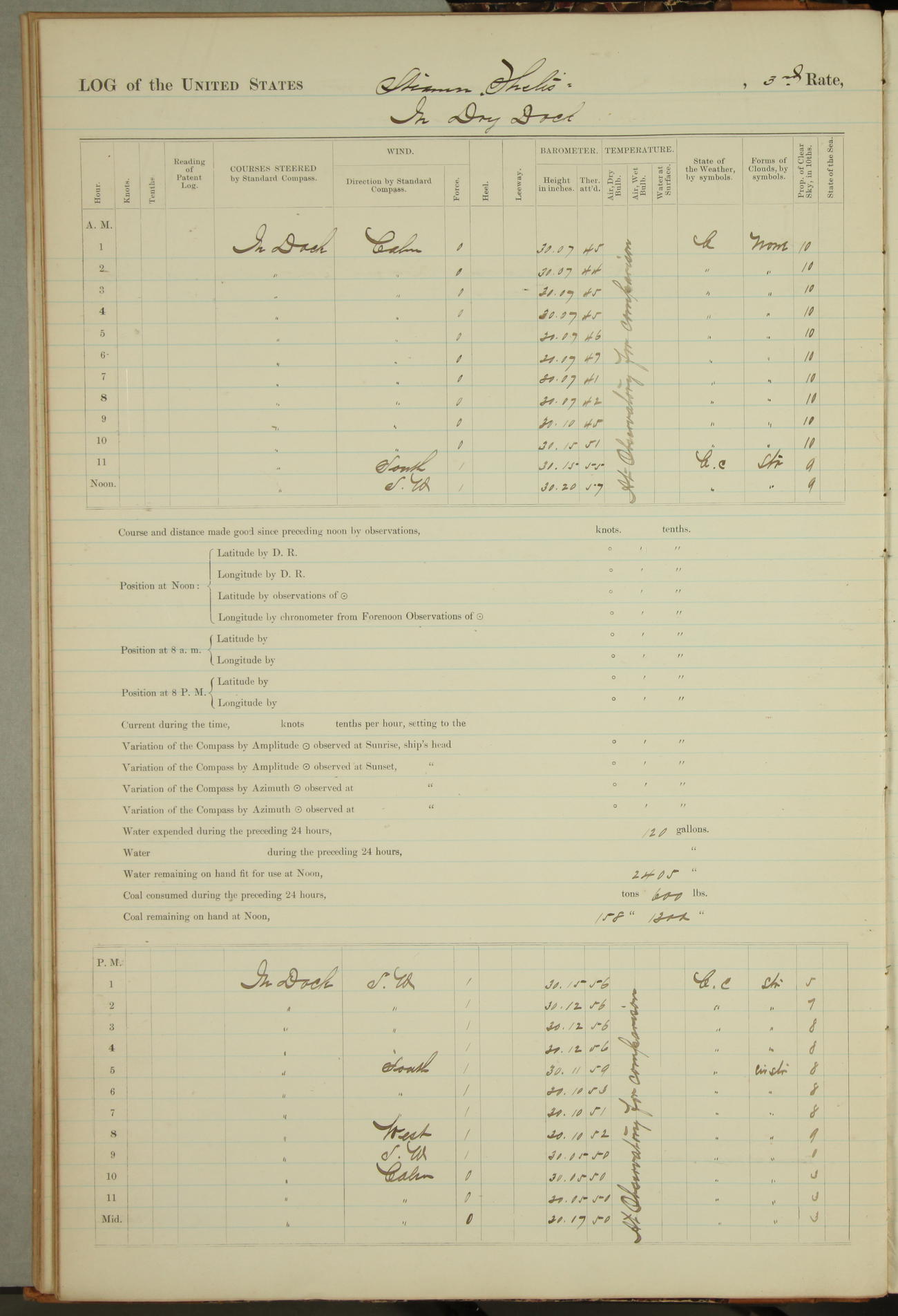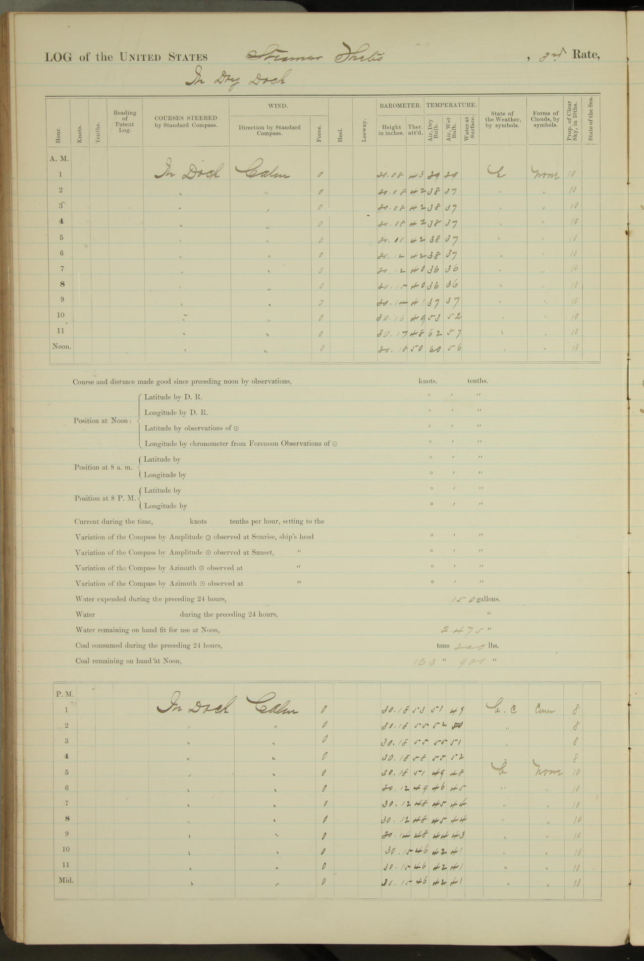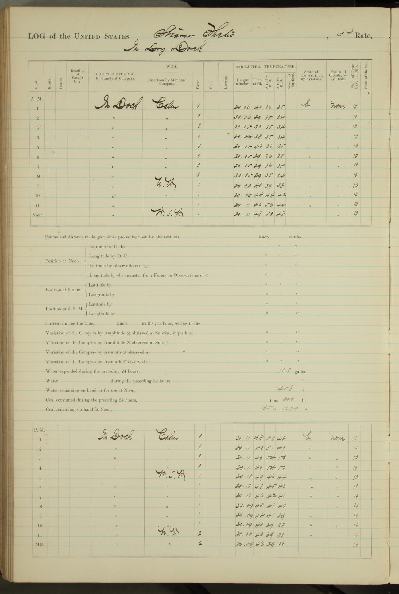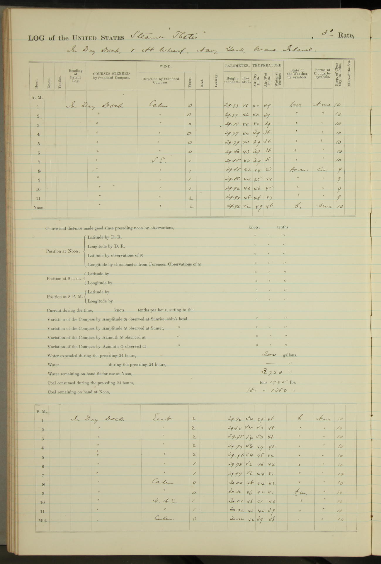 Shore people sinking dock until 10am, when found there something was wrong with section 3, so pumped out dock without ship getting out. Found that the stern of entrance gate had ~~~ in section 3, as abandoned attempt to get ship out of dock to-day. Started fires in dandy boiler, then hauled them. Transferred to US Naval Hospital A. Claus (C~) & A. Toat (Sea) by order of Commanding Officer J. Rattler (ICF) was rated oiler, J.V. Cronin (ICF) was rated 1st class fireman, & G.F. Gun (Oiler) was disrated to first class fireman.