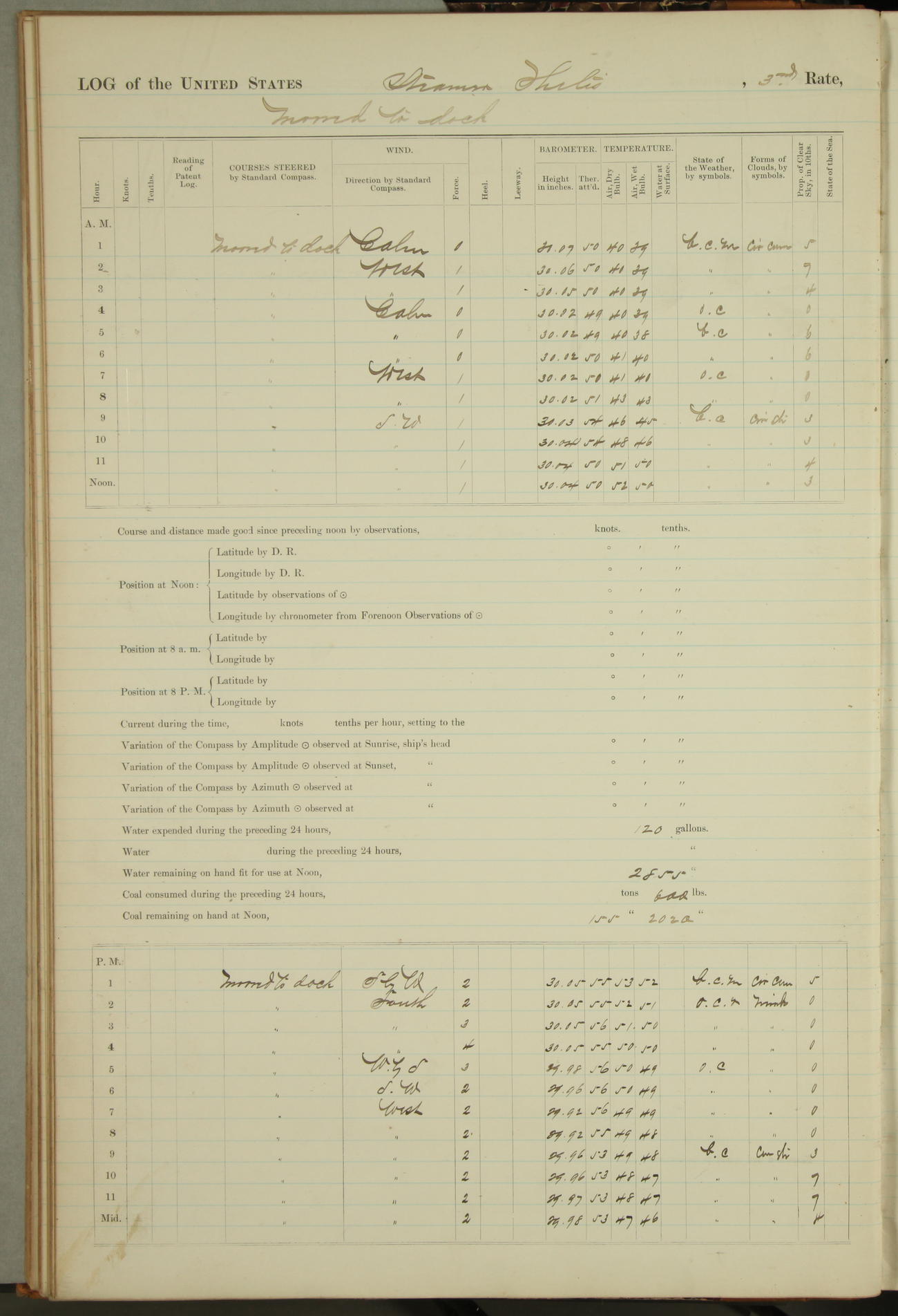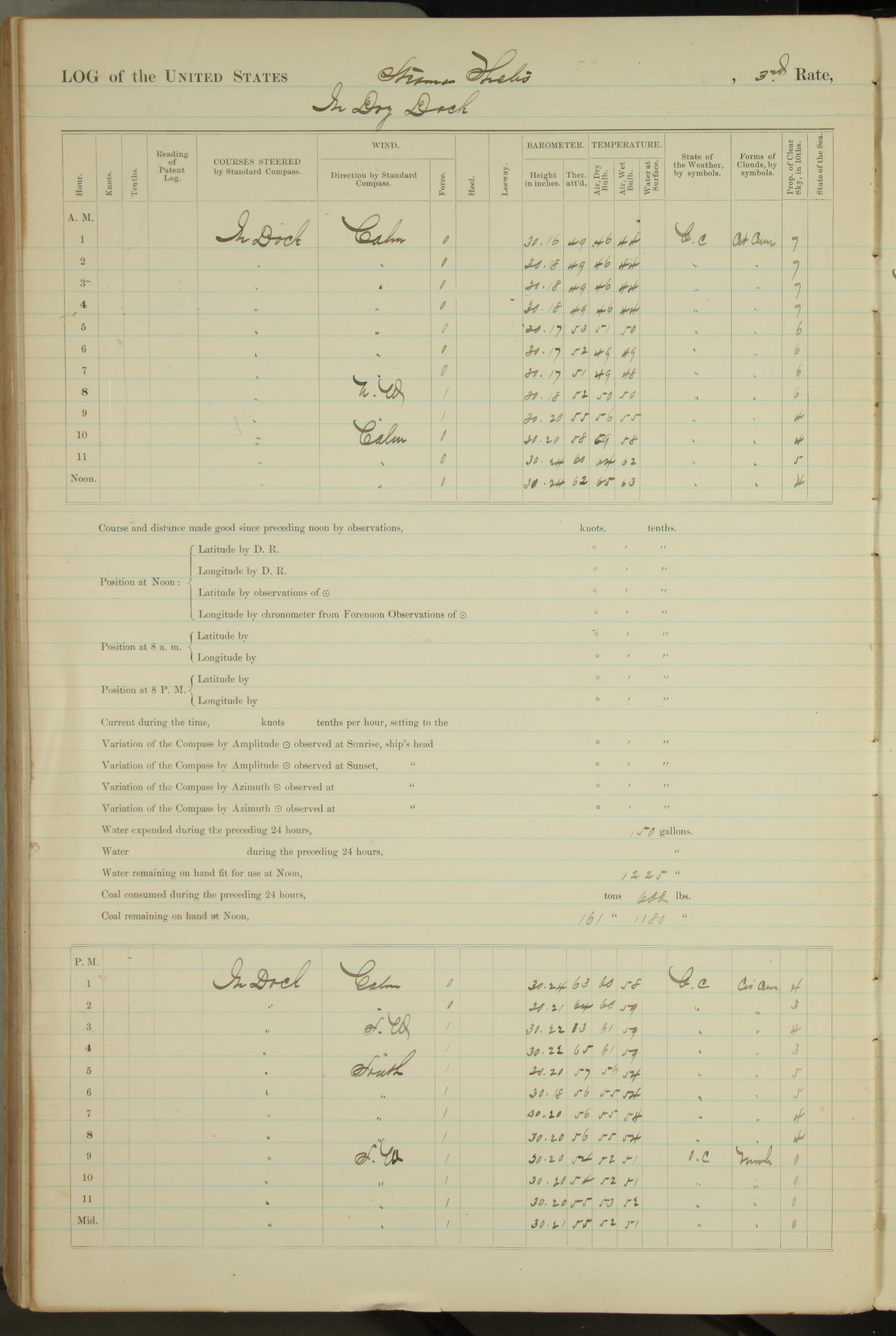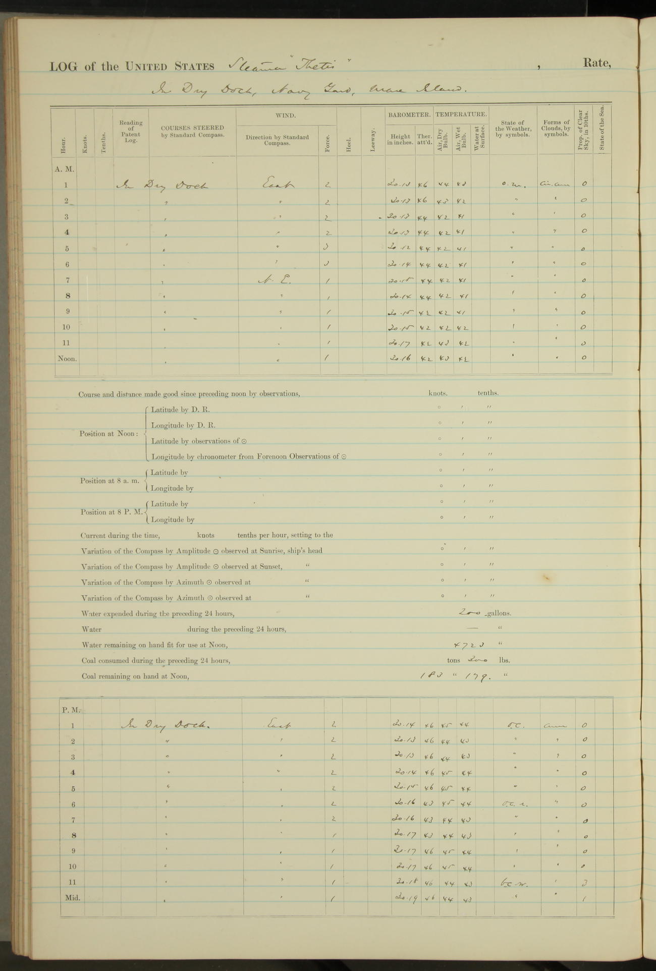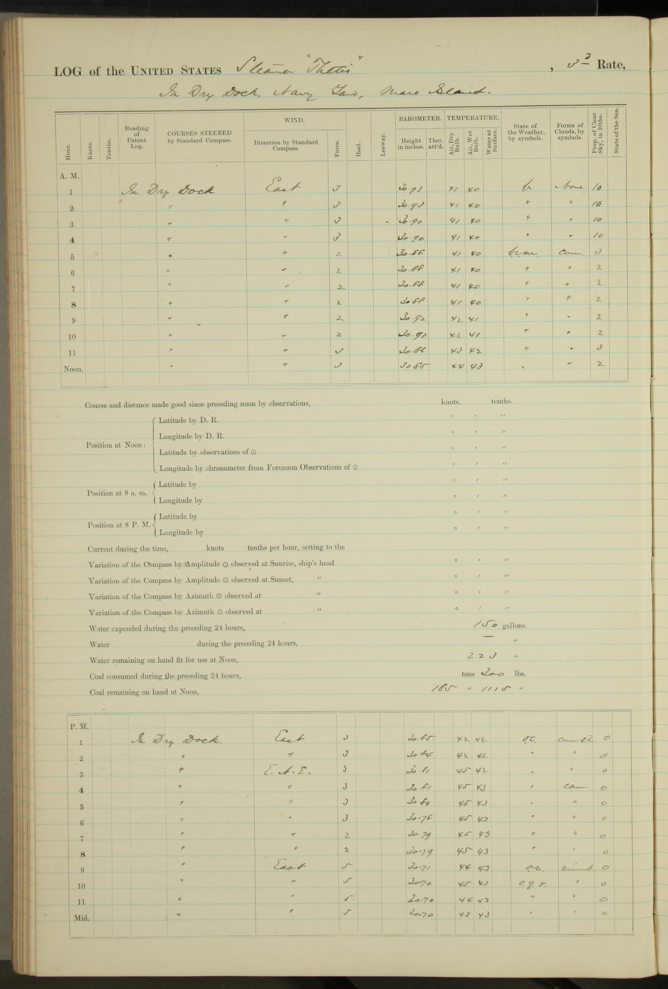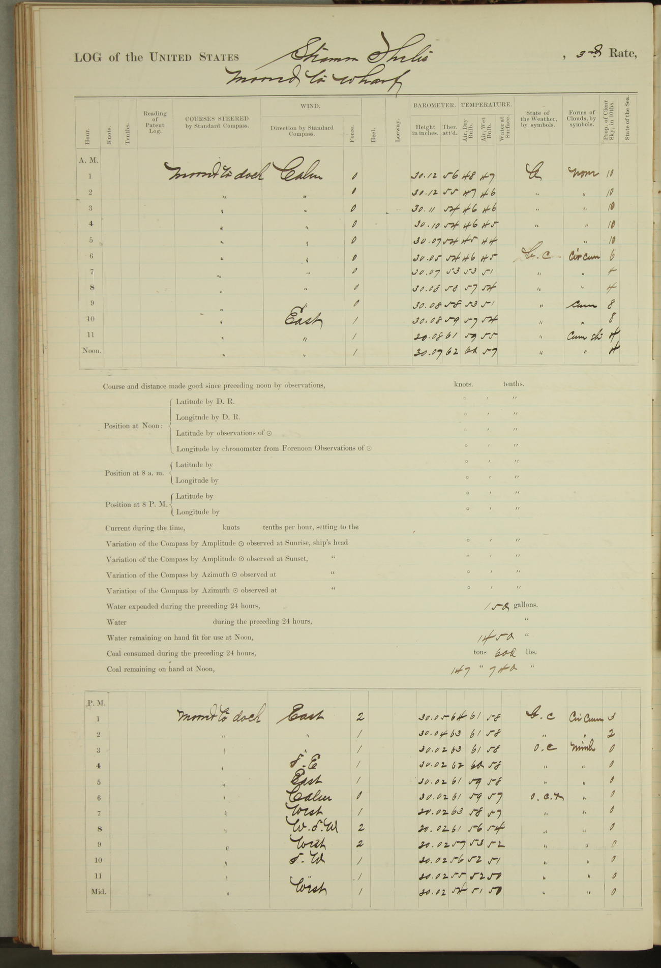Shore people sinking dock until 10am, when found there something was wrong with section 3, so pumped out dock without ship getting out. Found that the stern of entrance gate had ~~~ in section 3, as abandoned attempt to get ship out of dock to-day. Started fires in dandy boiler, then hauled them. Transferred to US Naval Hospital A. Claus (C~) & A. Toat (Sea) by order of Commanding Officer J. Rattler (ICF) was rated oiler, J.V. Cronin (ICF) was rated 1st class fireman, & G.F. Gun (Oiler) was disrated to first class fireman.