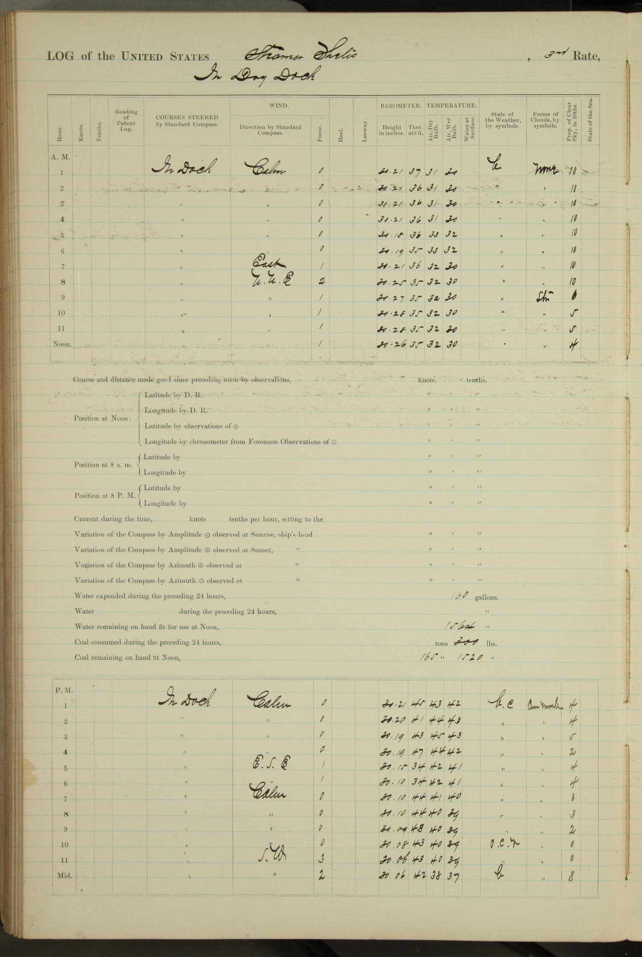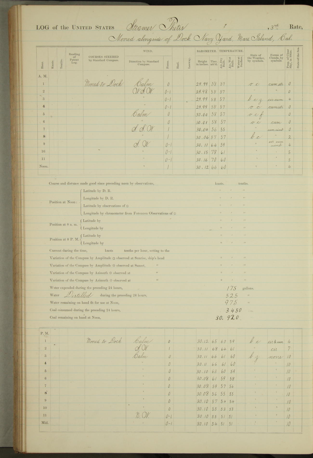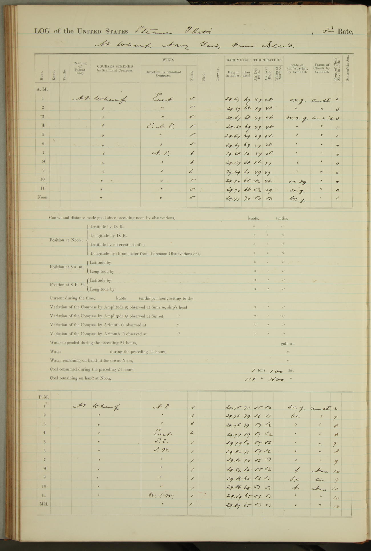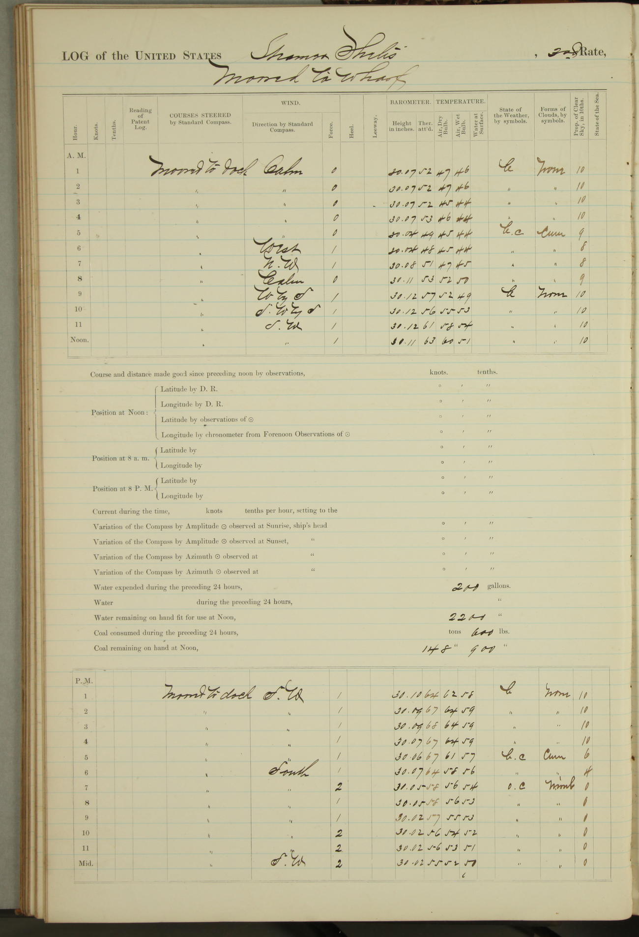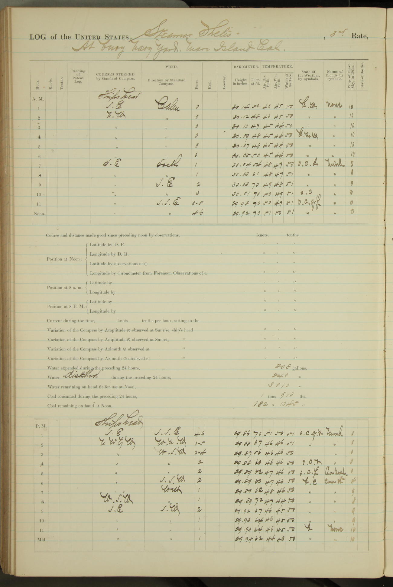 Shore people sinking dock until 10am, when found there something was wrong with section 3, so pumped out dock without ship getting out. Found that the stern of entrance gate had ~~~ in section 3, as abandoned attempt to get ship out of dock to-day. Started fires in dandy boiler, then hauled them. Transferred to US Naval Hospital A. Claus (C~) & A. Toat (Sea) by order of Commanding Officer J. Rattler (ICF) was rated oiler, J.V. Cronin (ICF) was rated 1st class fireman, & G.F. Gun (Oiler) was disrated to first class fireman.