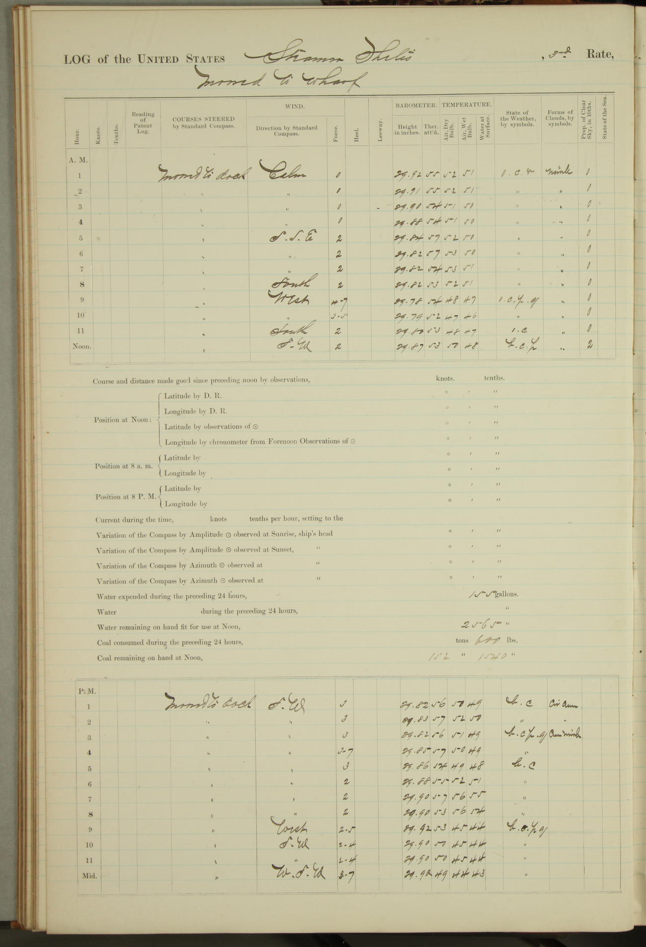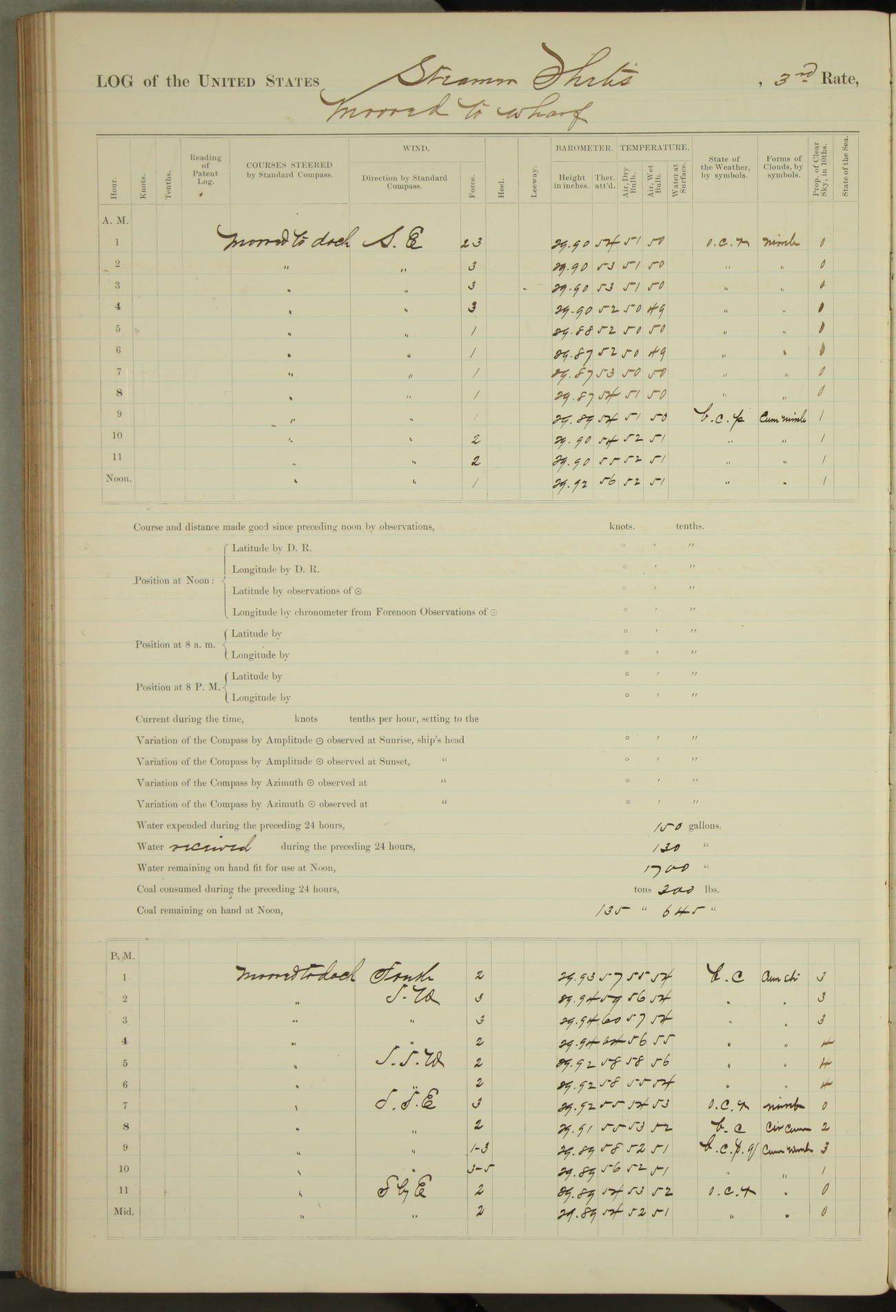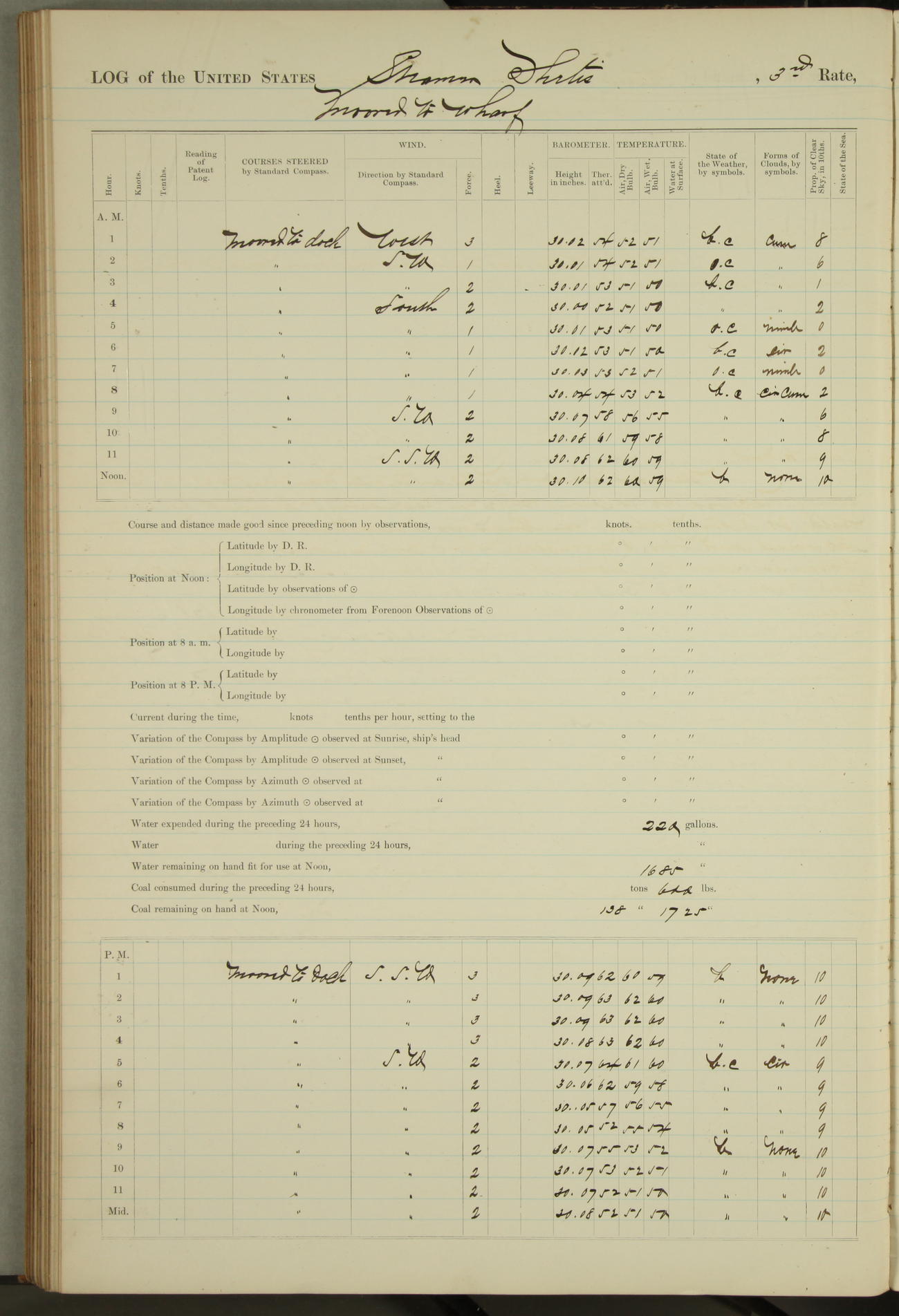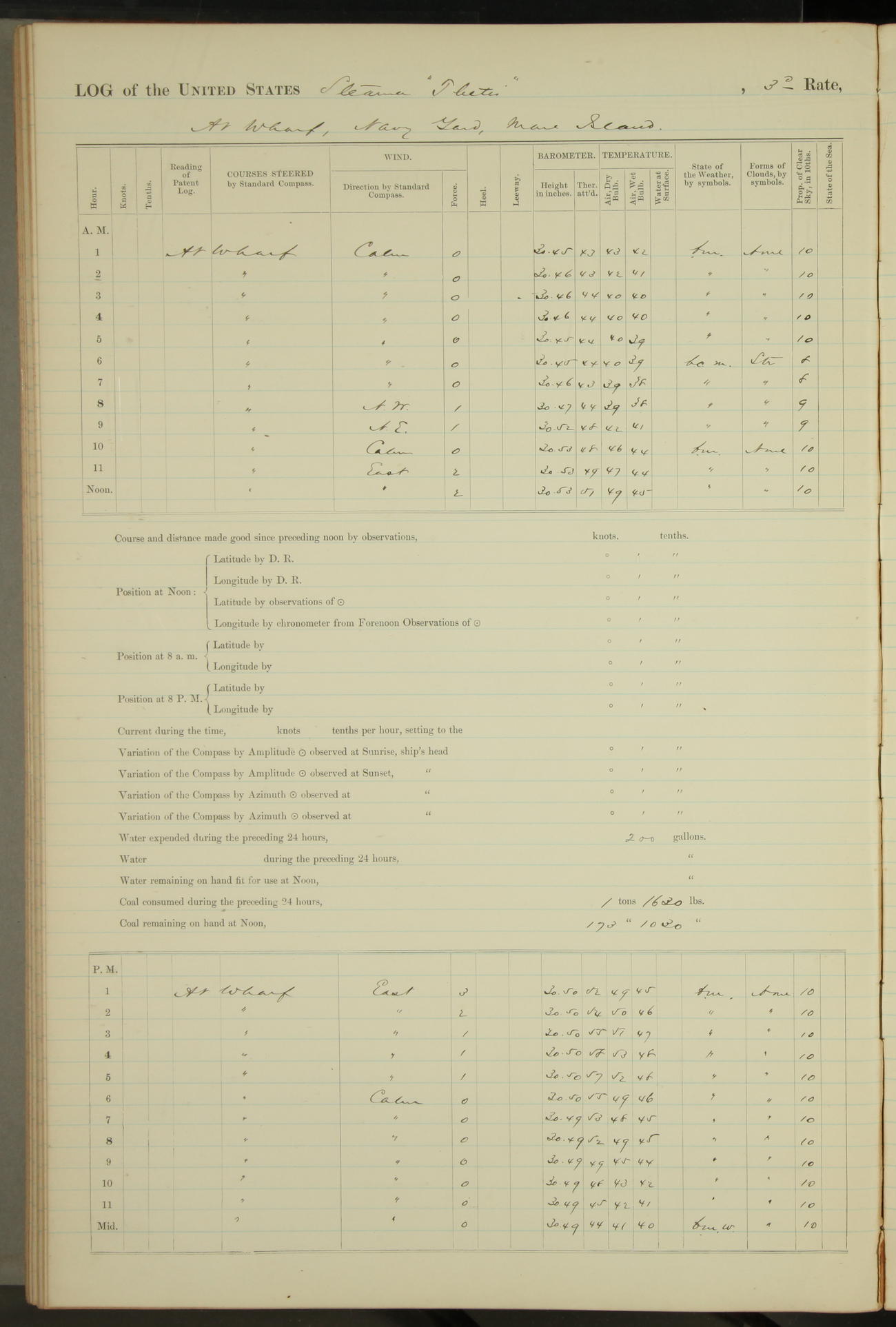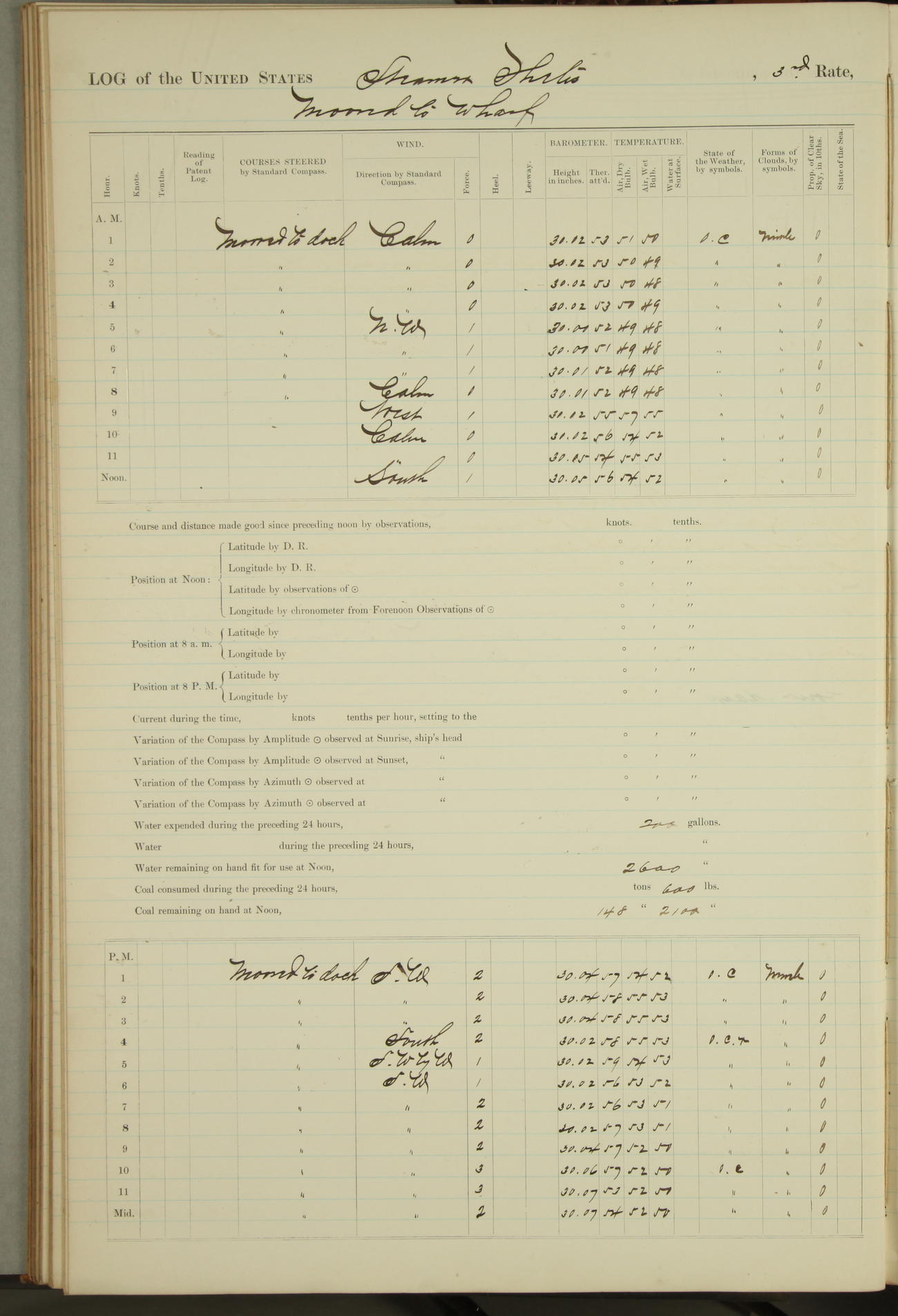 Shore people sinking dock until 10am, when found there something was wrong with section 3, so pumped out dock without ship getting out. Found that the stern of entrance gate had ~~~ in section 3, as abandoned attempt to get ship out of dock to-day. Started fires in dandy boiler, then hauled them. Transferred to US Naval Hospital A. Claus (C~) & A. Toat (Sea) by order of Commanding Officer J. Rattler (ICF) was rated oiler, J.V. Cronin (ICF) was rated 1st class fireman, & G.F. Gun (Oiler) was disrated to first class fireman.