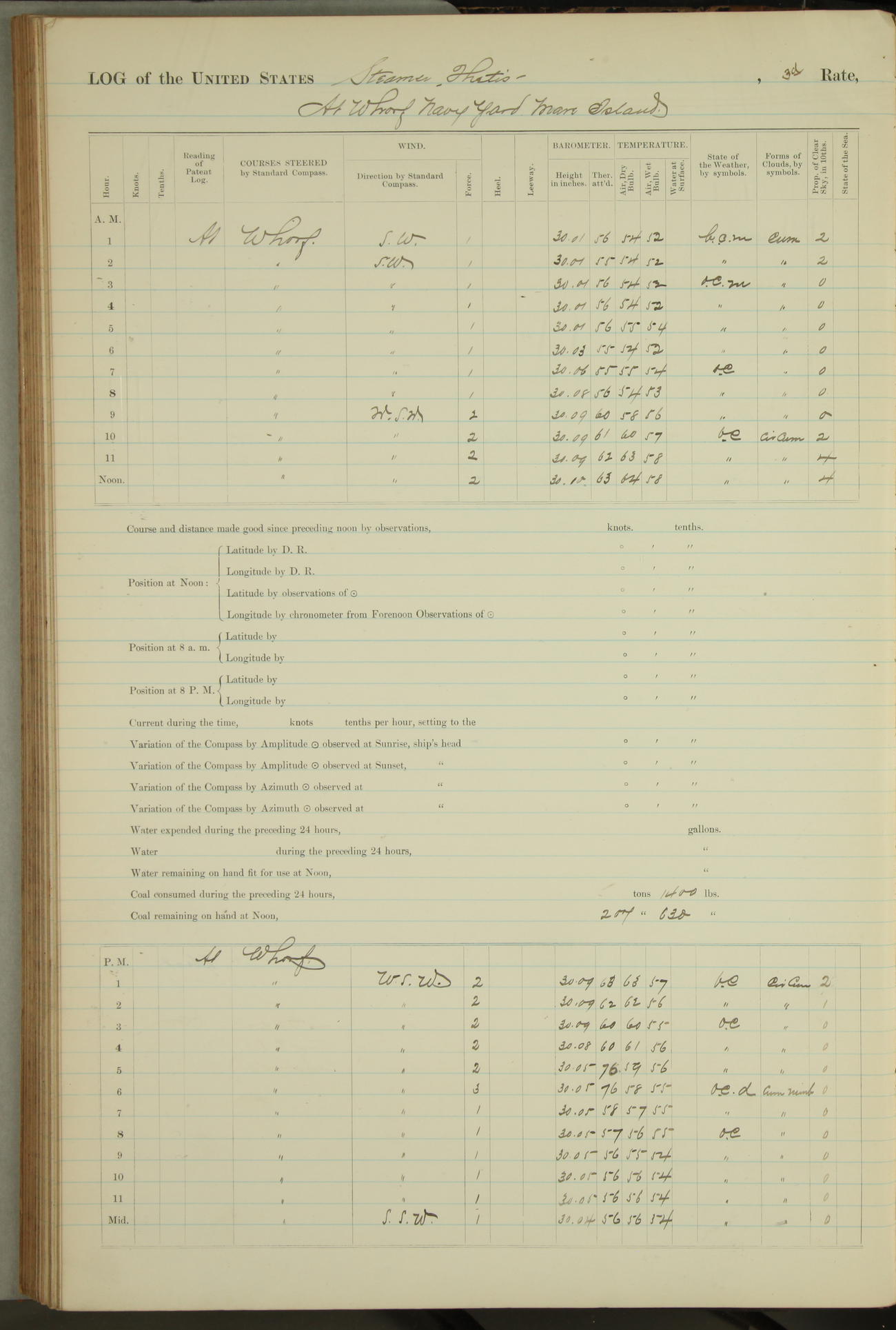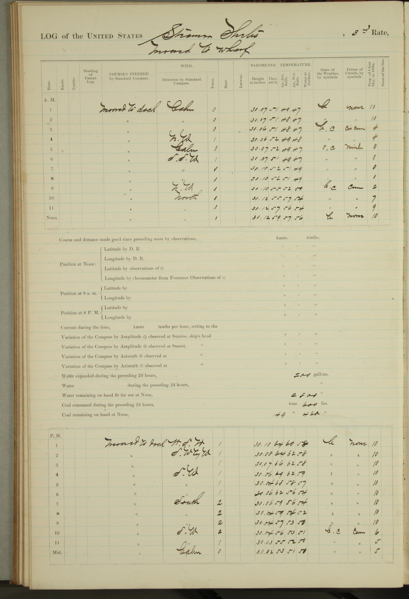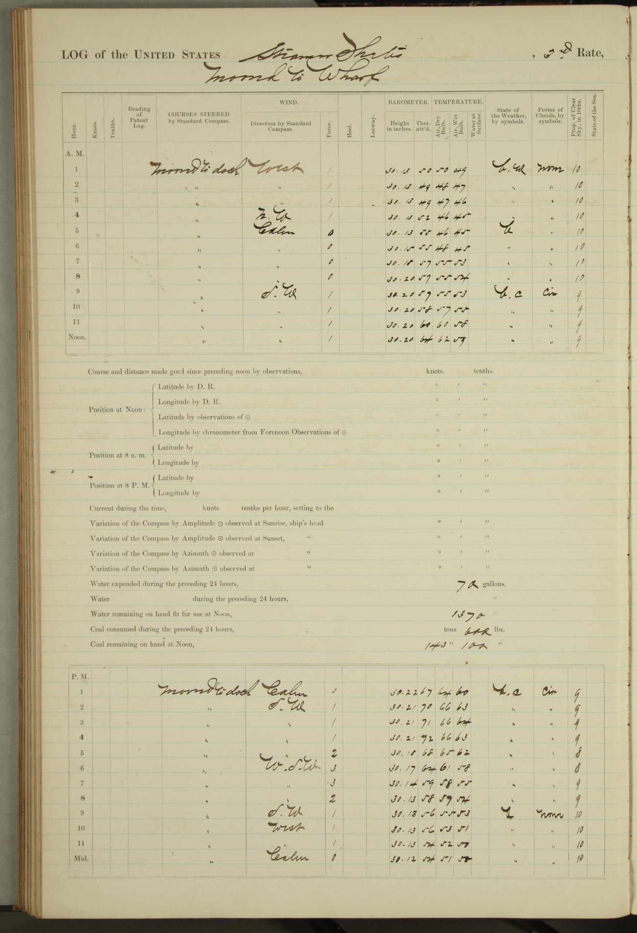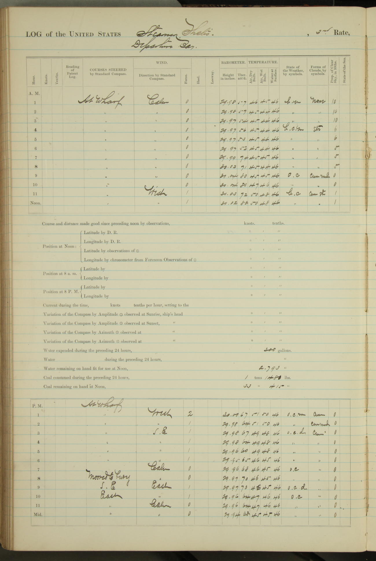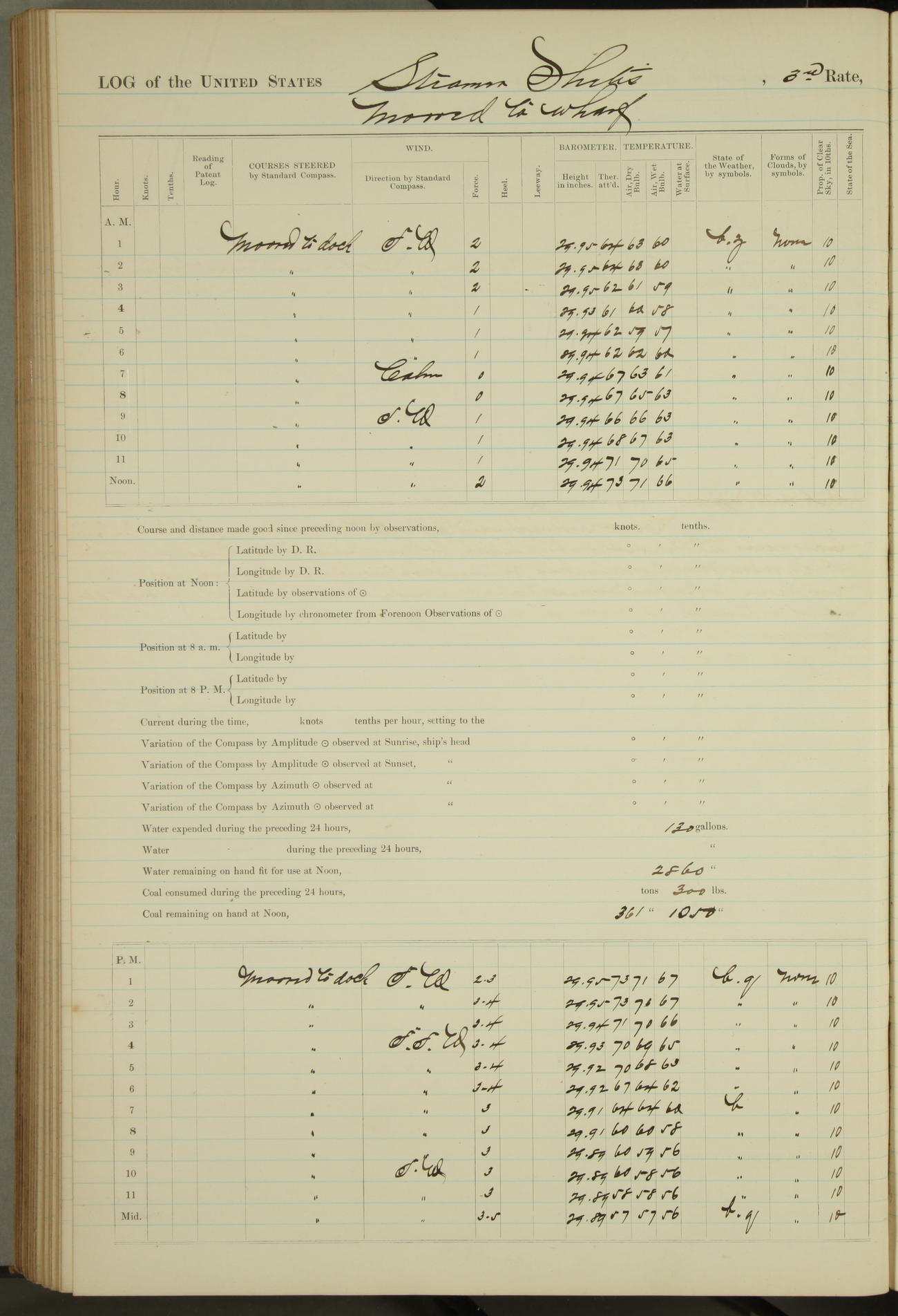 Shore people sinking dock until 10am, when found there something was wrong with section 3, so pumped out dock without ship getting out. Found that the stern of entrance gate had ~~~ in section 3, as abandoned attempt to get ship out of dock to-day. Started fires in dandy boiler, then hauled them. Transferred to US Naval Hospital A. Claus (C~) & A. Toat (Sea) by order of Commanding Officer J. Rattler (ICF) was rated oiler, J.V. Cronin (ICF) was rated 1st class fireman, & G.F. Gun (Oiler) was disrated to first class fireman.