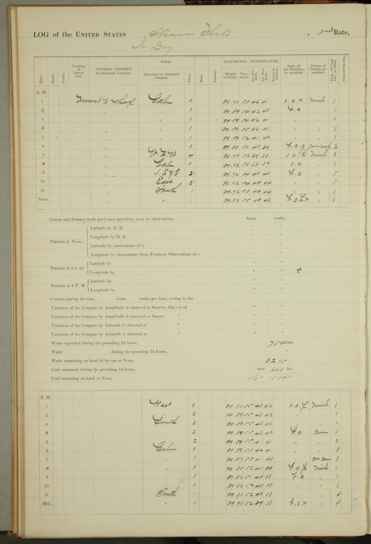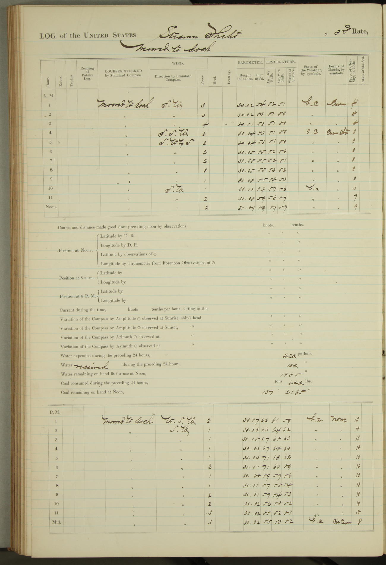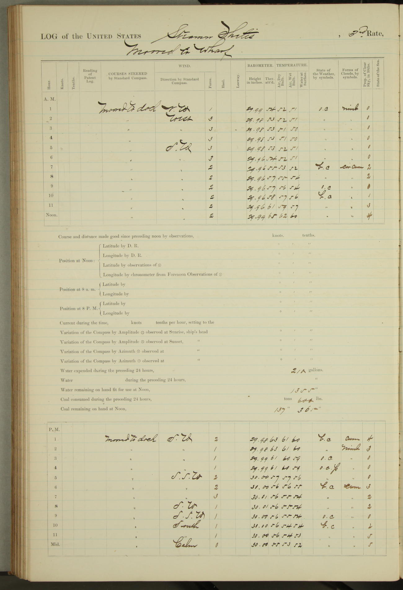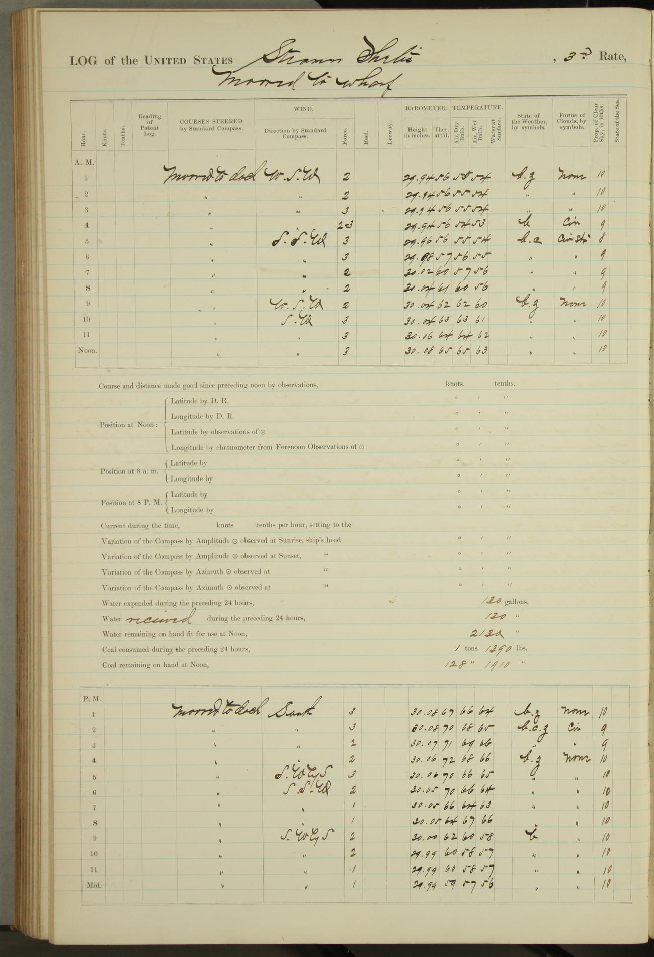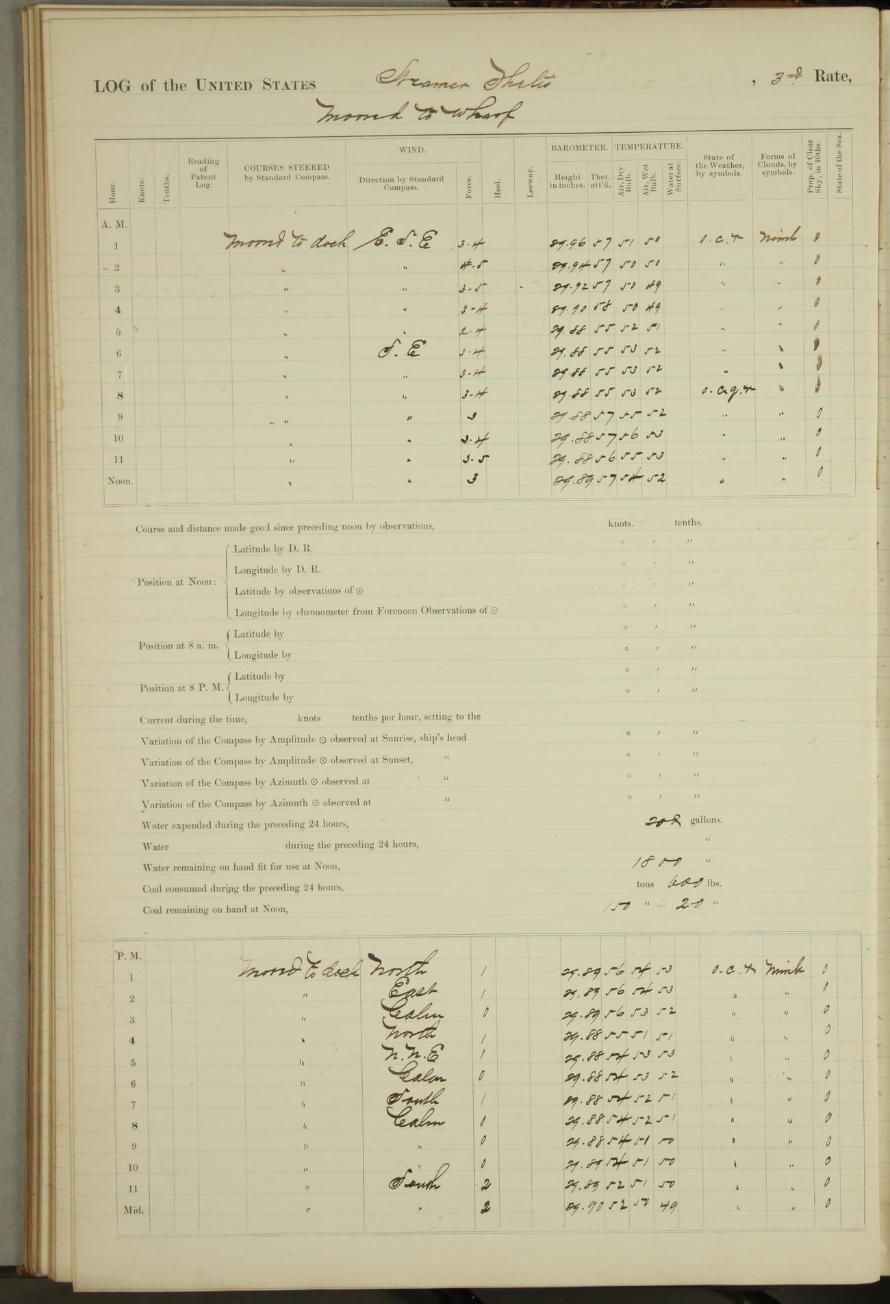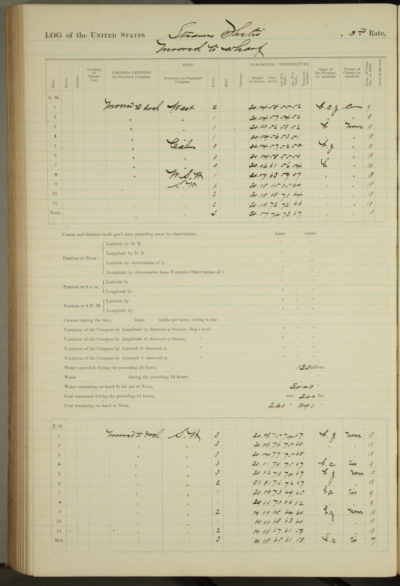 Shore people sinking dock until 10am, when found there something was wrong with section 3, so pumped out dock without ship getting out. Found that the stern of entrance gate had ~~~ in section 3, as abandoned attempt to get ship out of dock to-day. Started fires in dandy boiler, then hauled them. Transferred to US Naval Hospital A. Claus (C~) & A. Toat (Sea) by order of Commanding Officer J. Rattler (ICF) was rated oiler, J.V. Cronin (ICF) was rated 1st class fireman, & G.F. Gun (Oiler) was disrated to first class fireman.
