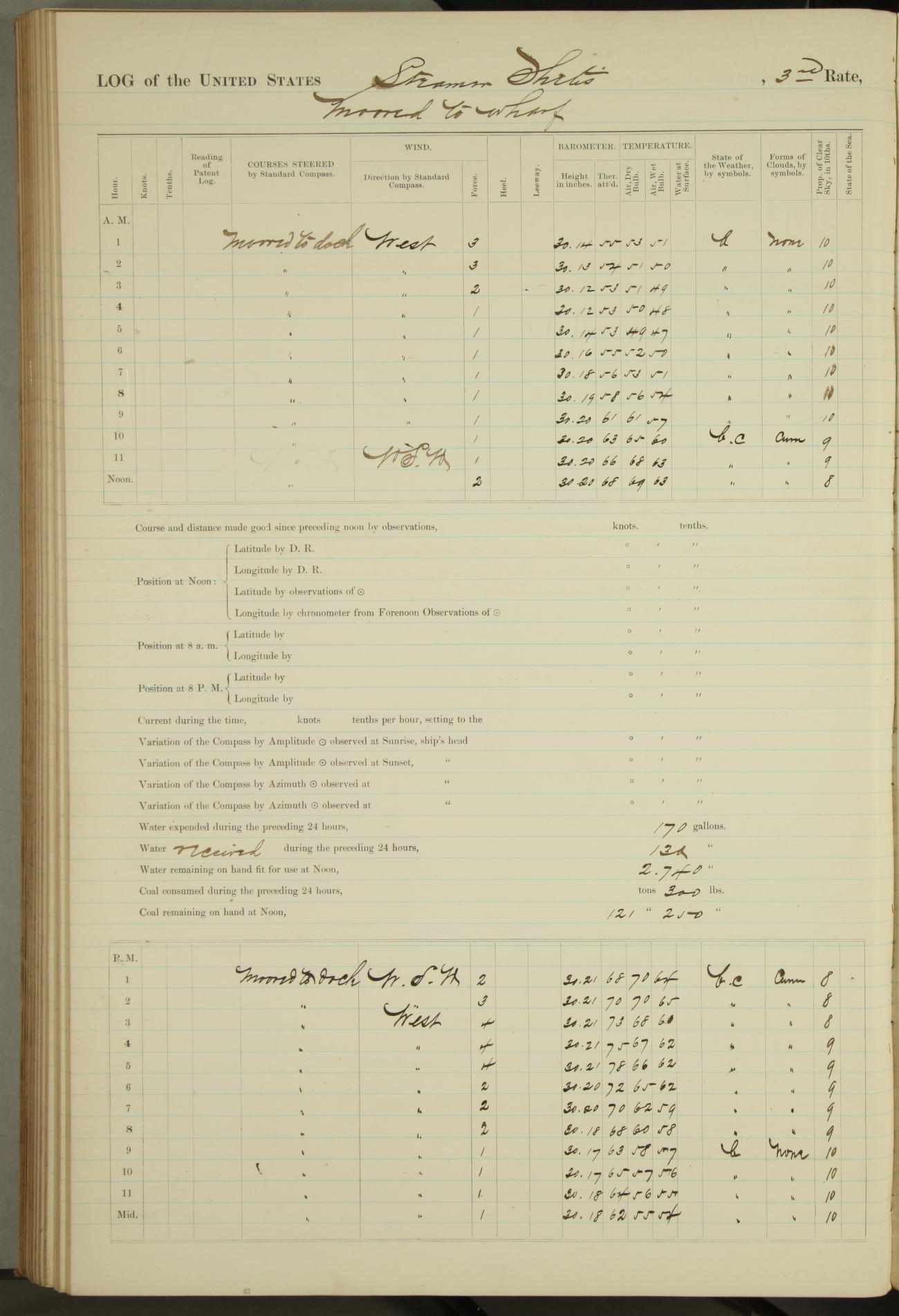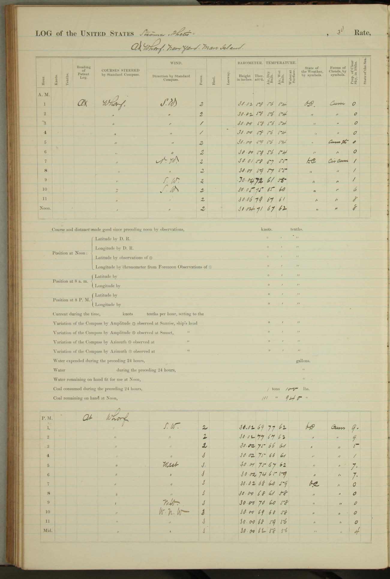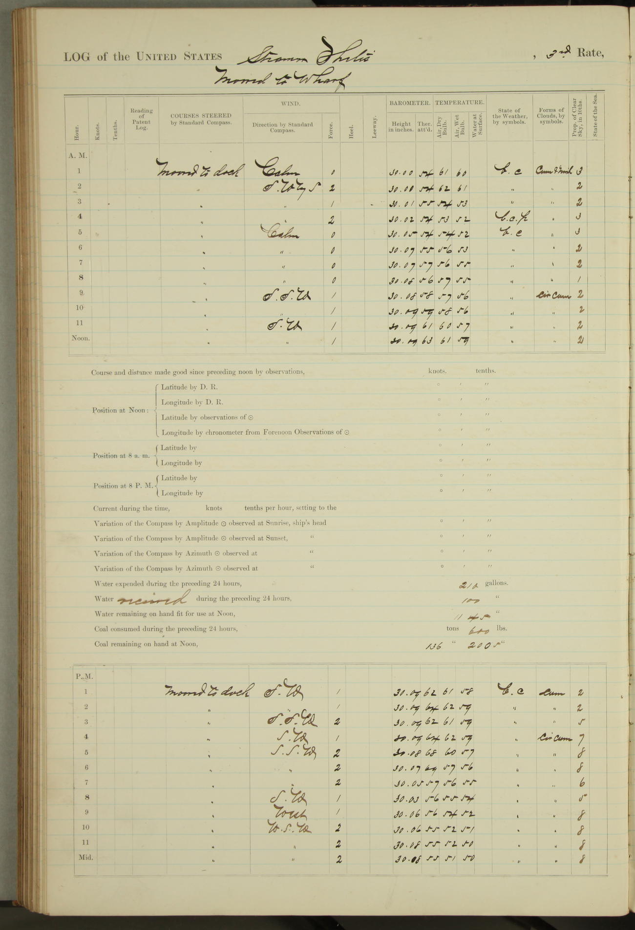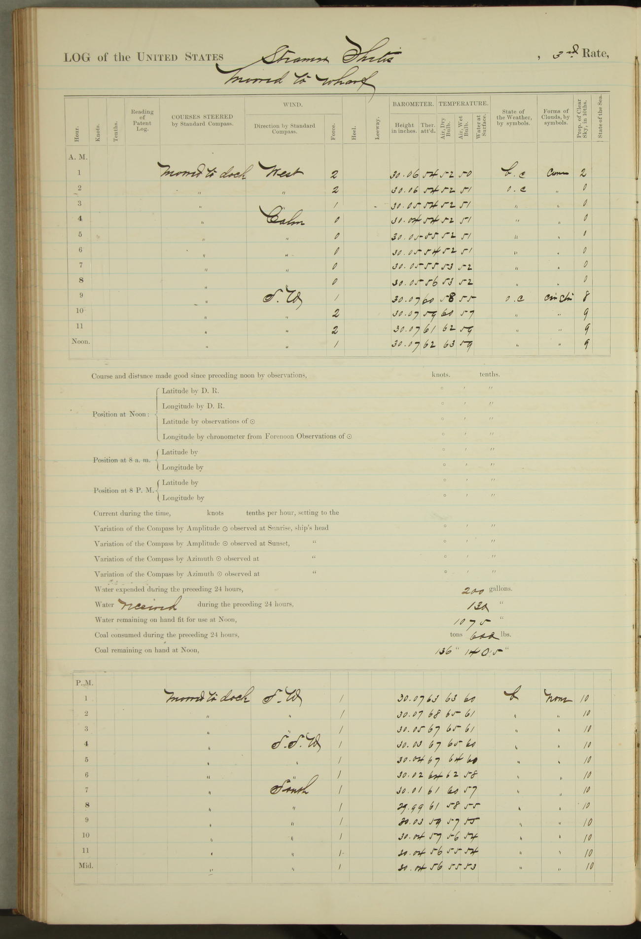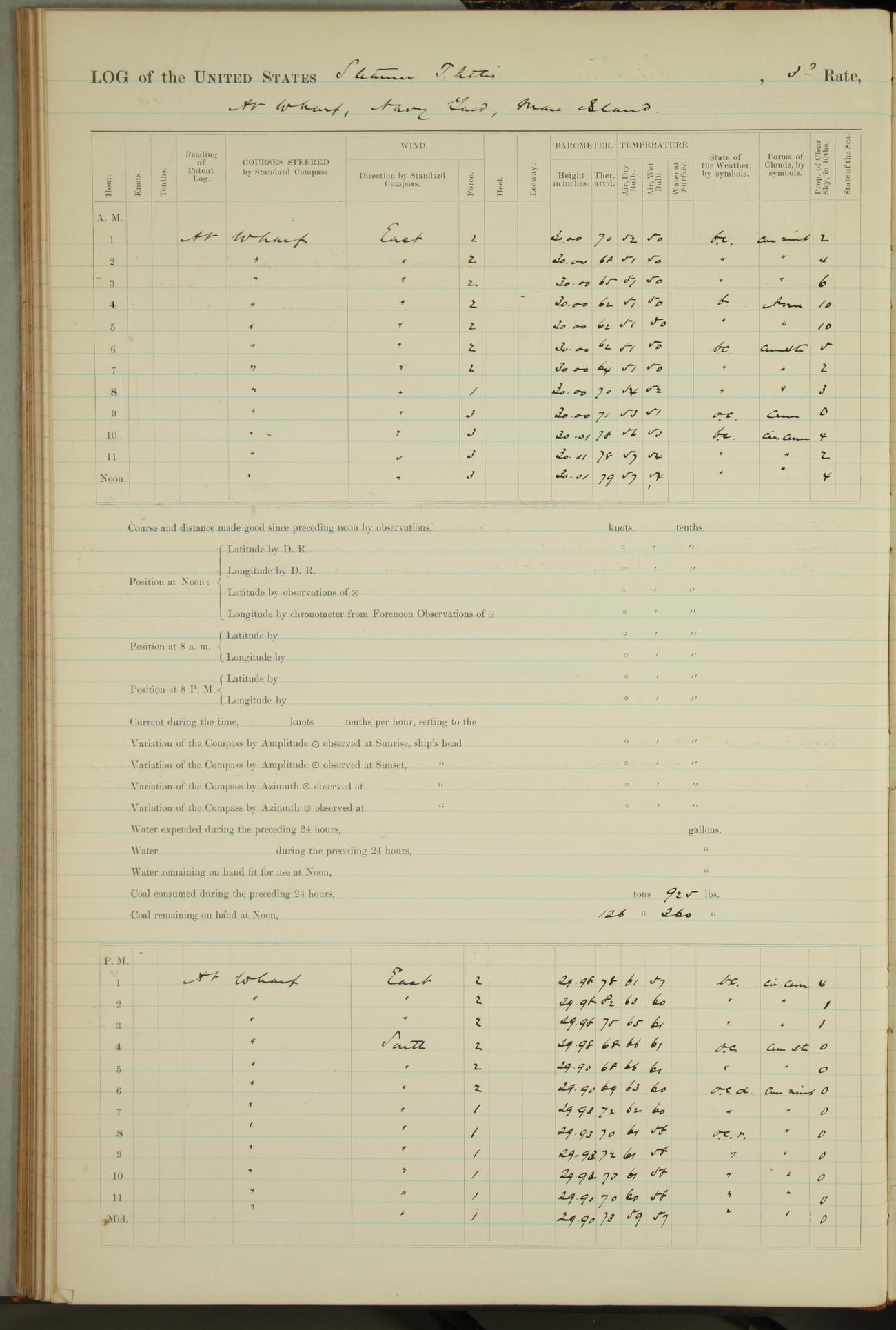 Shore people sinking dock until 10am, when found there something was wrong with section 3, so pumped out dock without ship getting out. Found that the stern of entrance gate had ~~~ in section 3, as abandoned attempt to get ship out of dock to-day. Started fires in dandy boiler, then hauled them. Transferred to US Naval Hospital A. Claus (C~) & A. Toat (Sea) by order of Commanding Officer J. Rattler (ICF) was rated oiler, J.V. Cronin (ICF) was rated 1st class fireman, & G.F. Gun (Oiler) was disrated to first class fireman.