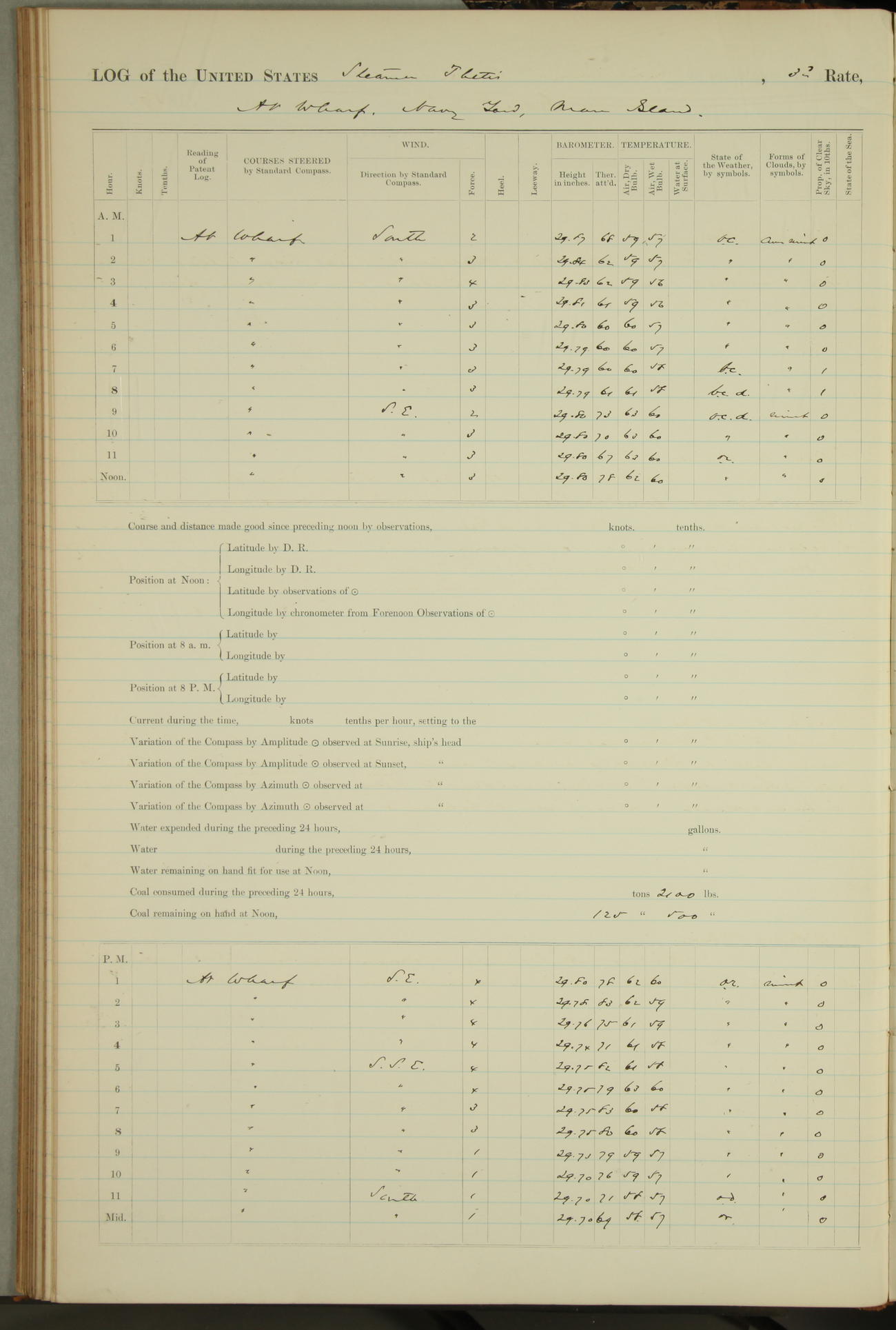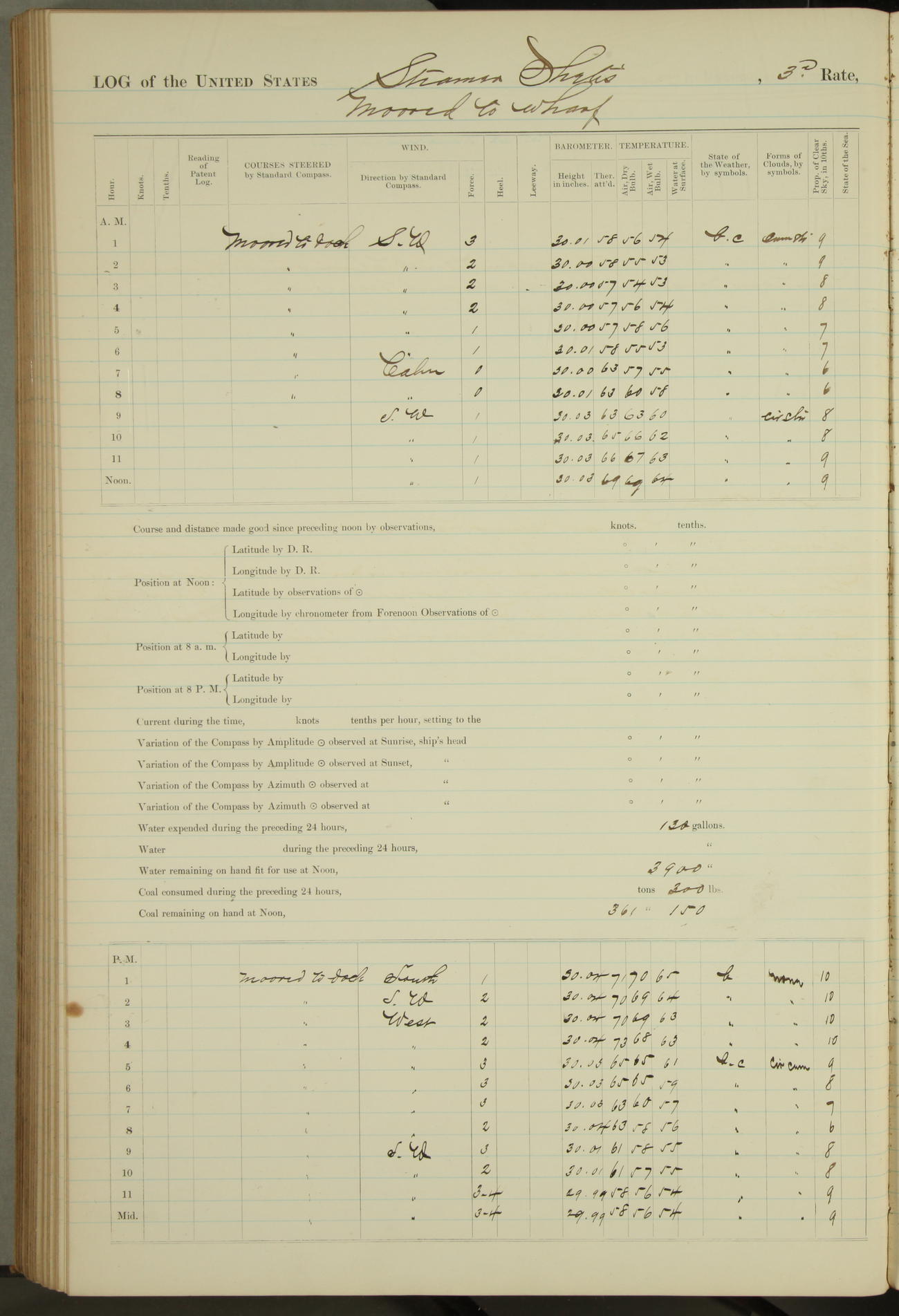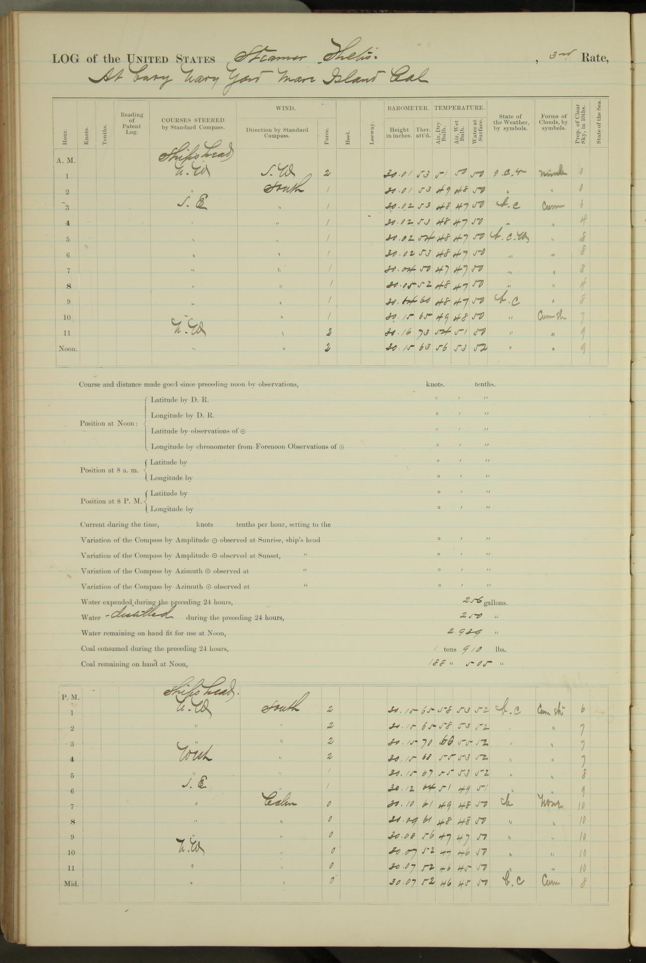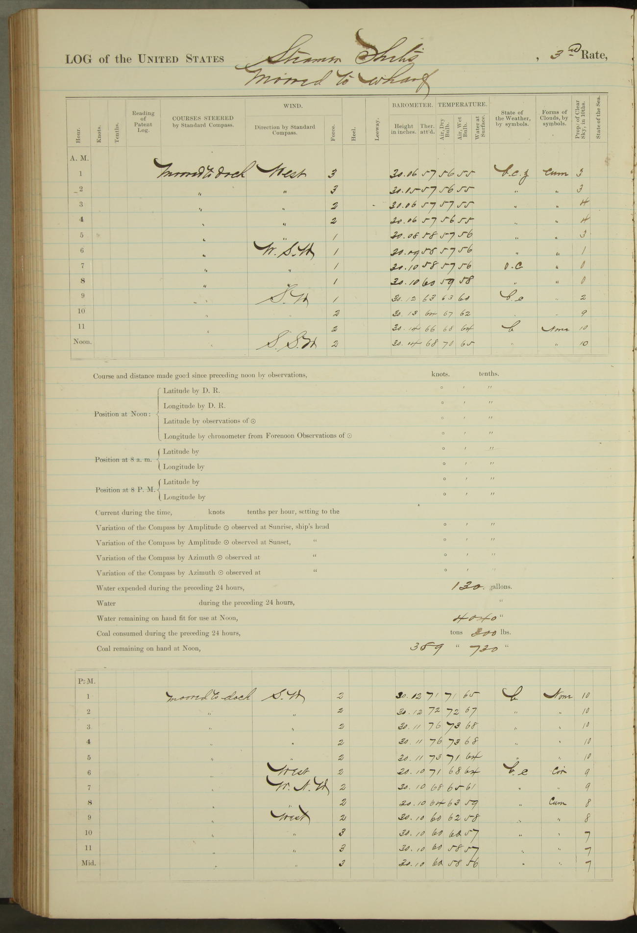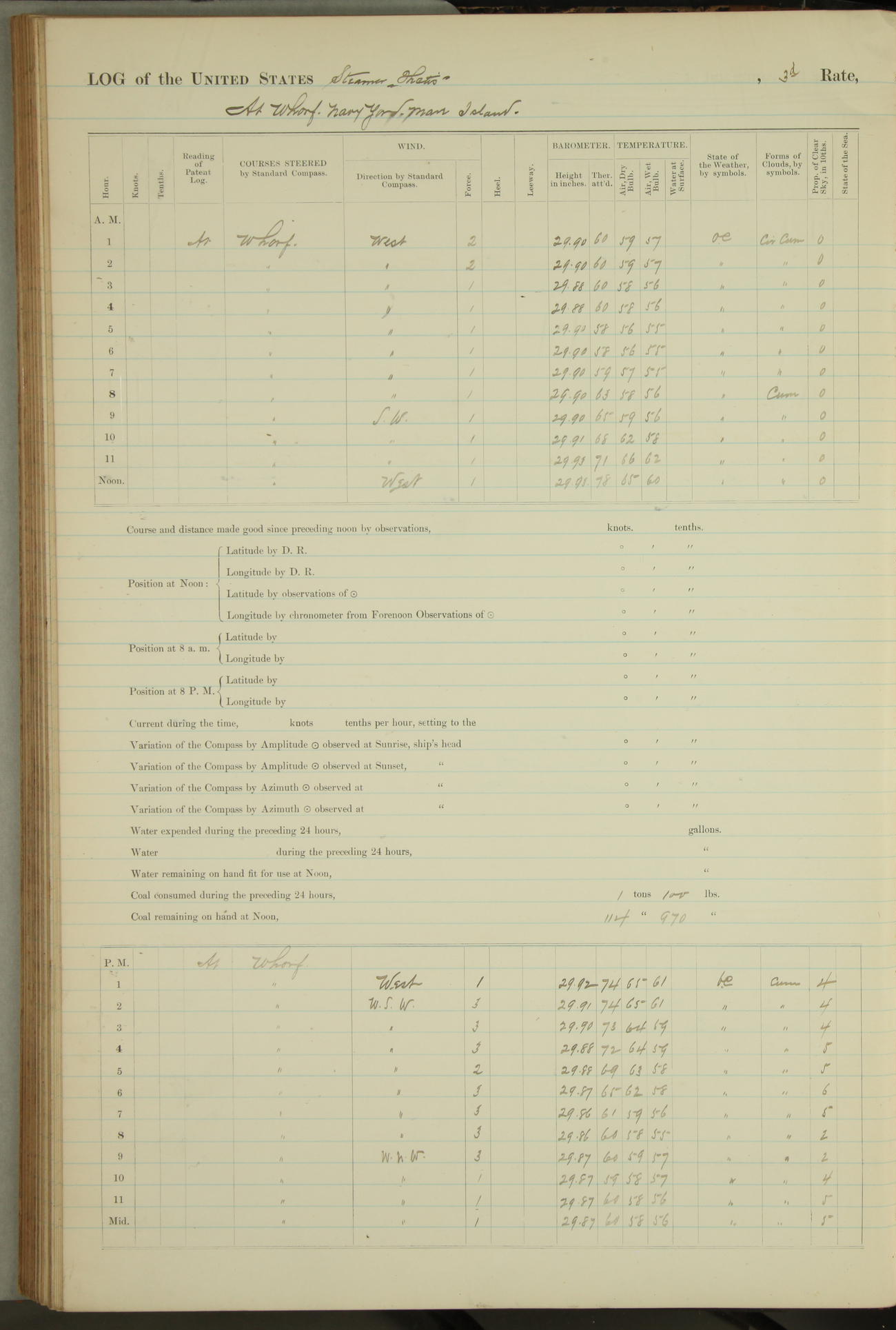 Shore people sinking dock until 10am, when found there something was wrong with section 3, so pumped out dock without ship getting out. Found that the stern of entrance gate had ~~~ in section 3, as abandoned attempt to get ship out of dock to-day. Started fires in dandy boiler, then hauled them. Transferred to US Naval Hospital A. Claus (C~) & A. Toat (Sea) by order of Commanding Officer J. Rattler (ICF) was rated oiler, J.V. Cronin (ICF) was rated 1st class fireman, & G.F. Gun (Oiler) was disrated to first class fireman.