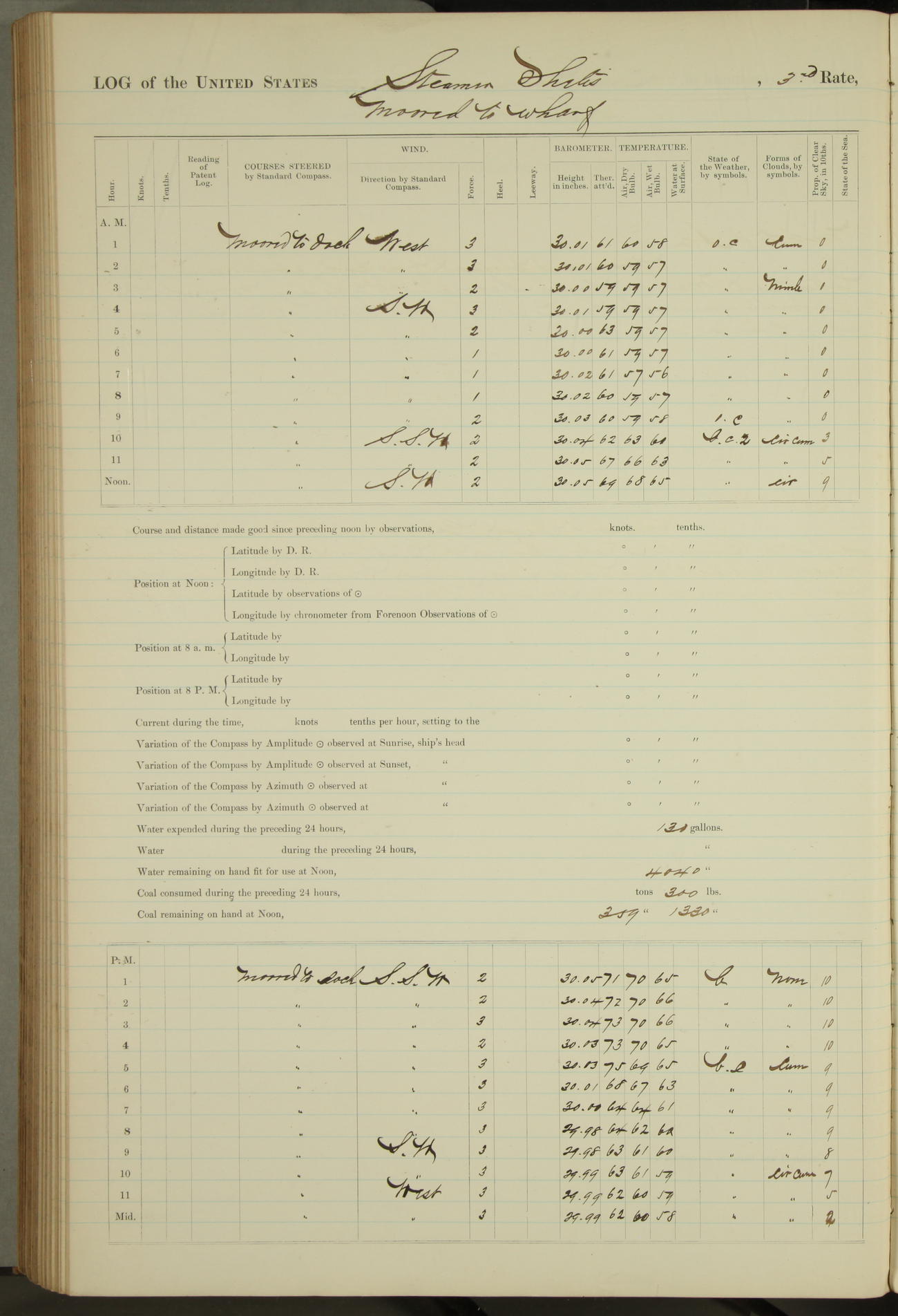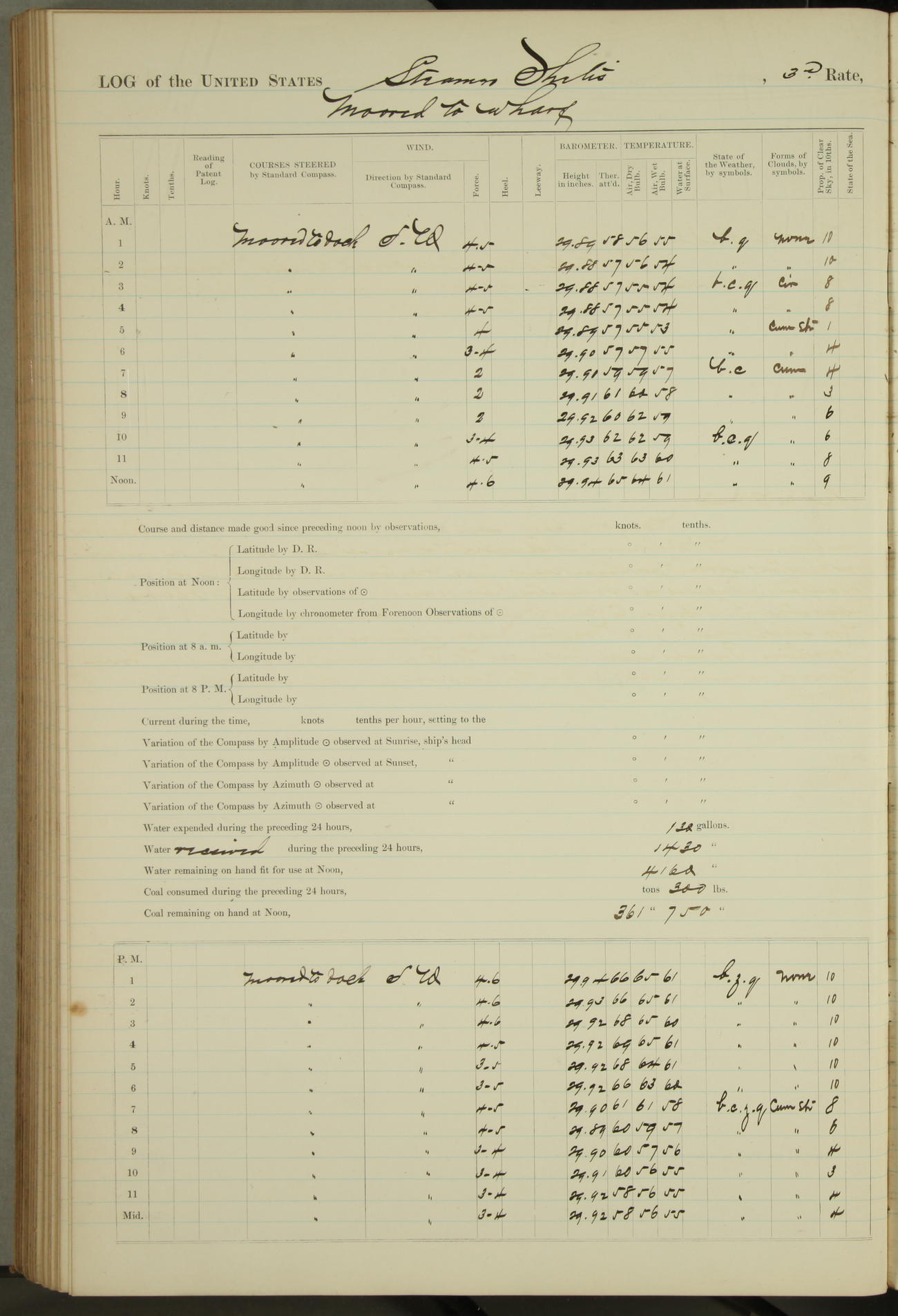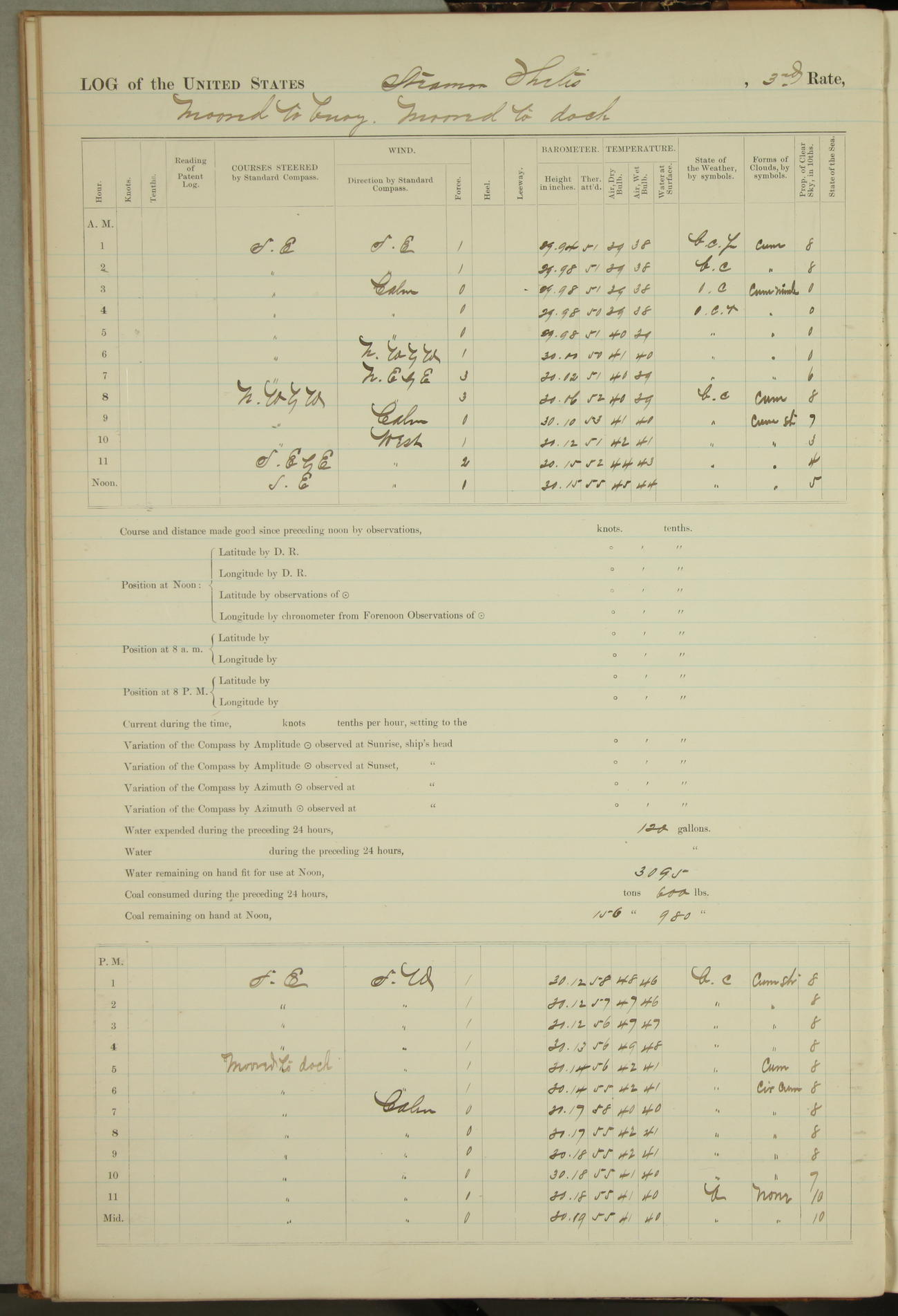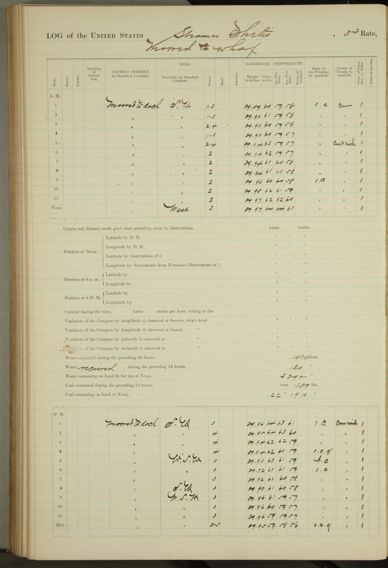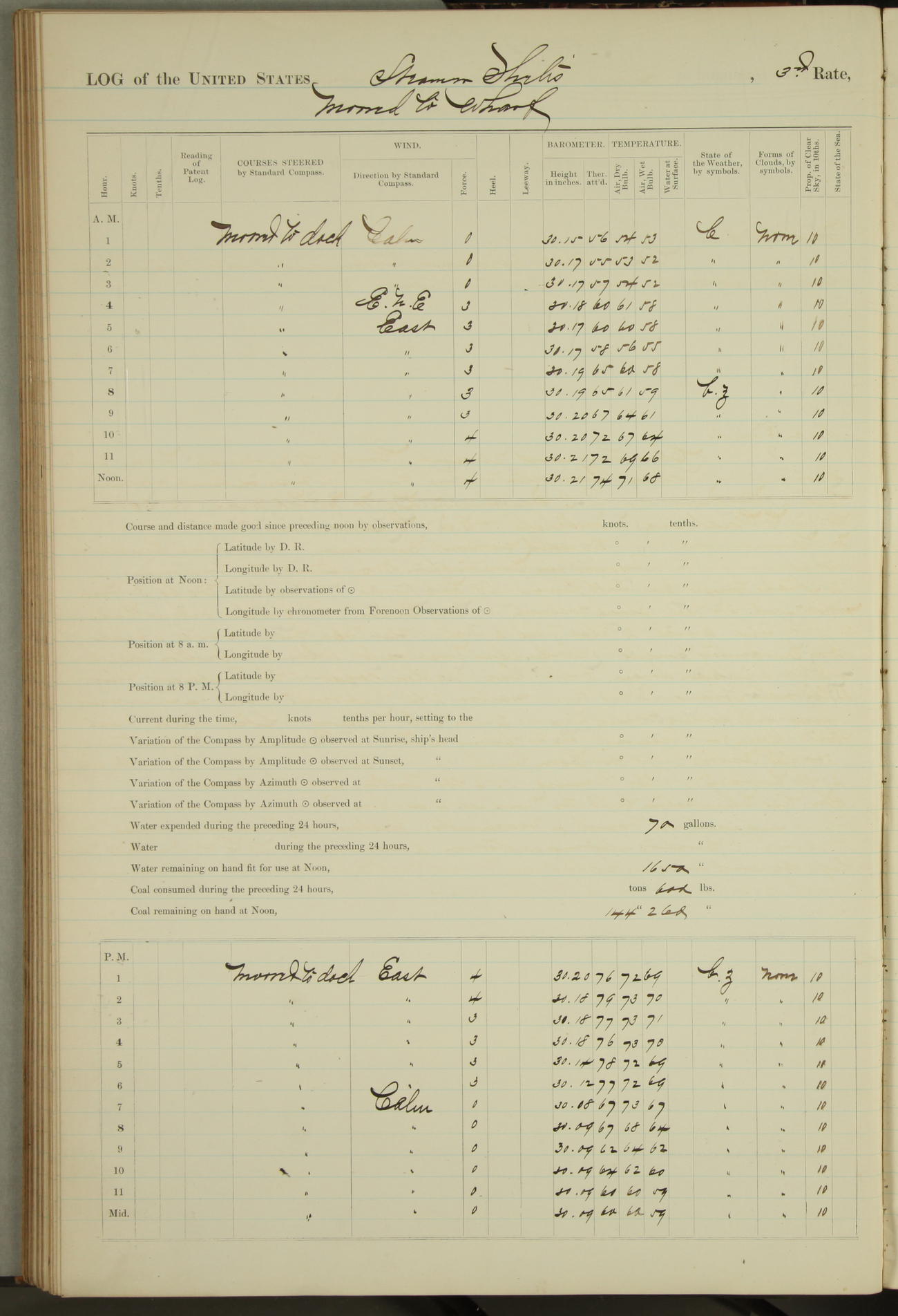 Shore people sinking dock until 10am, when found there something was wrong with section 3, so pumped out dock without ship getting out. Found that the stern of entrance gate had ~~~ in section 3, as abandoned attempt to get ship out of dock to-day. Started fires in dandy boiler, then hauled them. Transferred to US Naval Hospital A. Claus (C~) & A. Toat (Sea) by order of Commanding Officer J. Rattler (ICF) was rated oiler, J.V. Cronin (ICF) was rated 1st class fireman, & G.F. Gun (Oiler) was disrated to first class fireman.