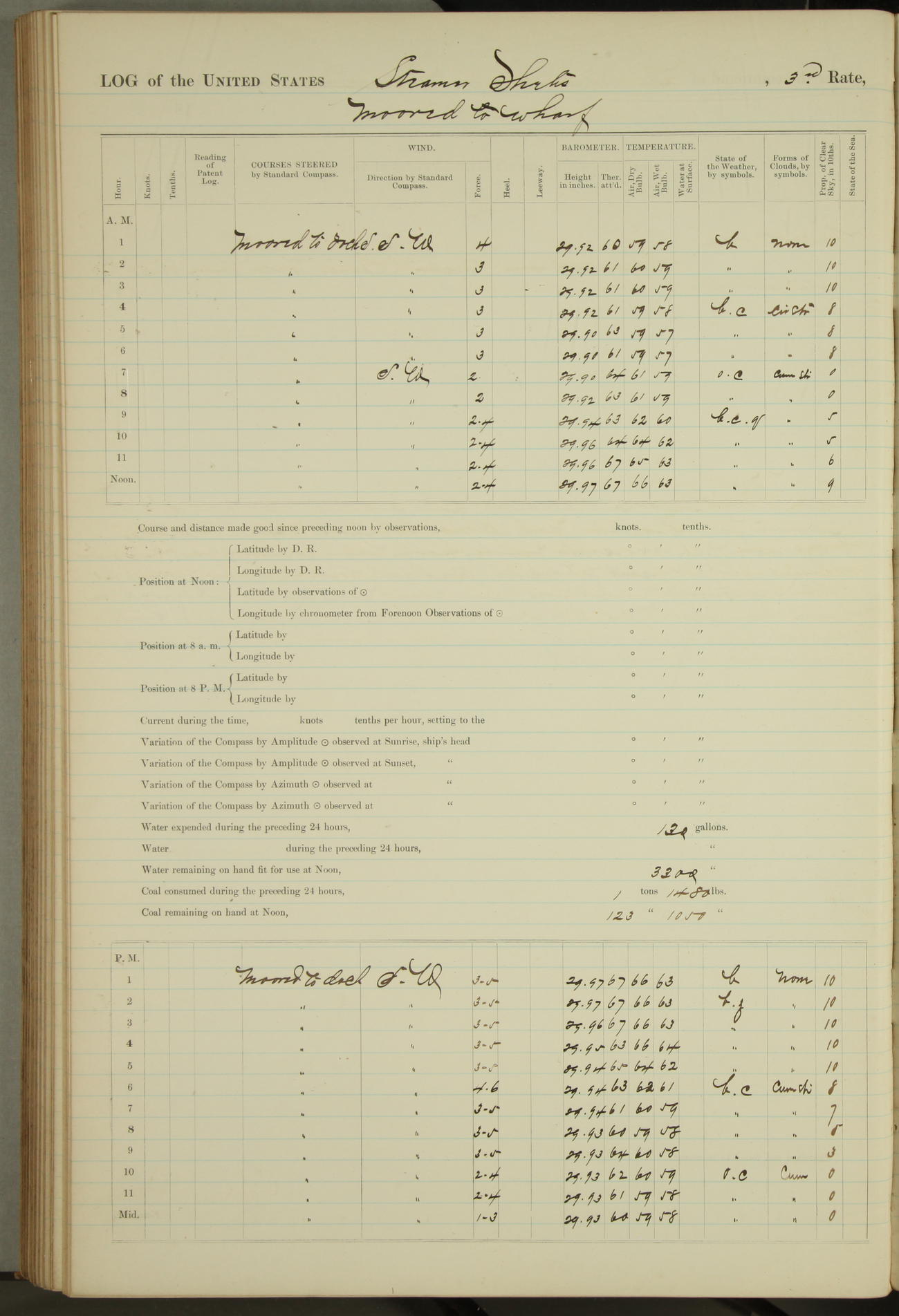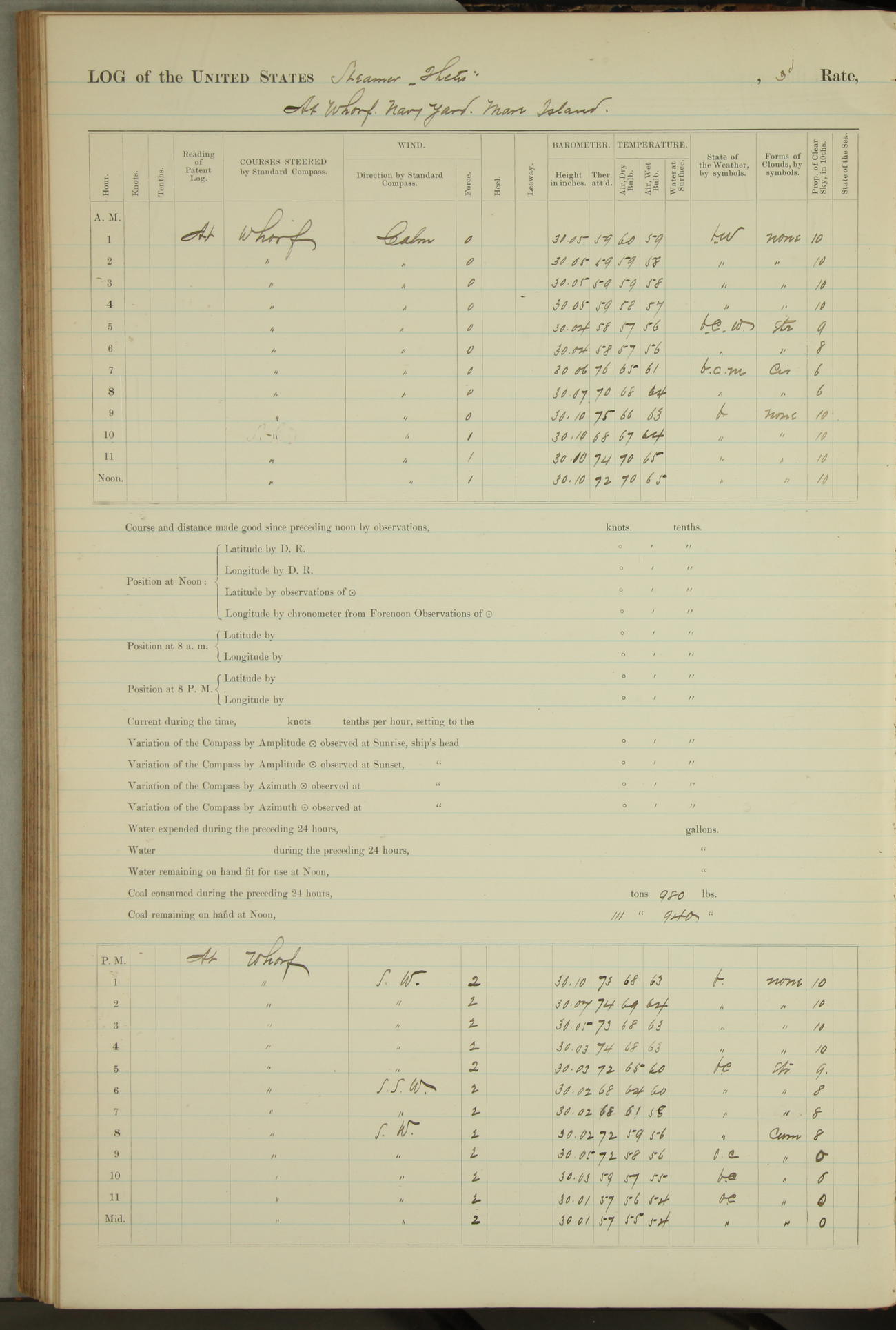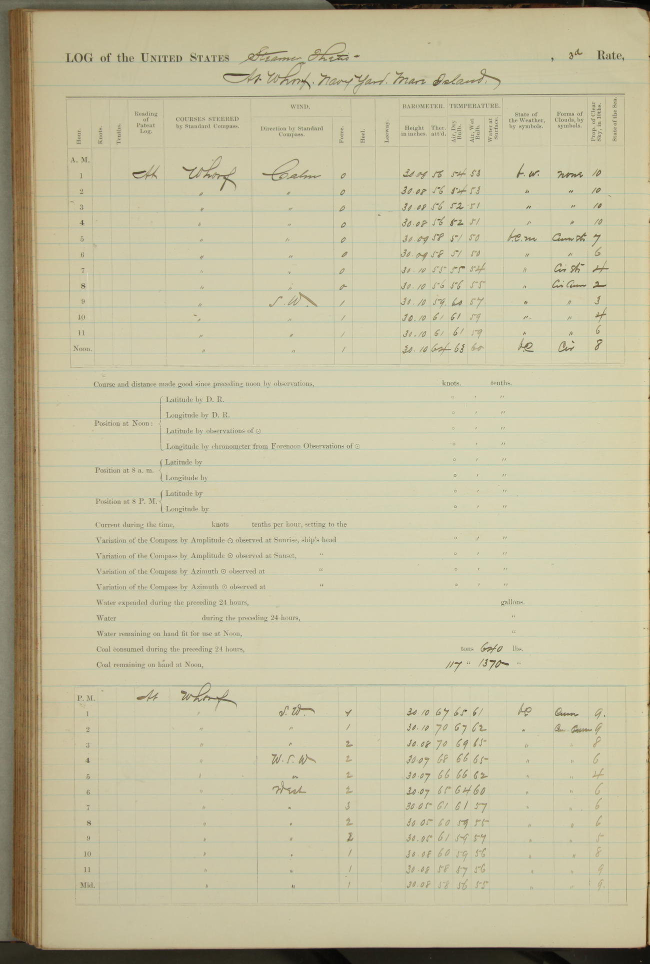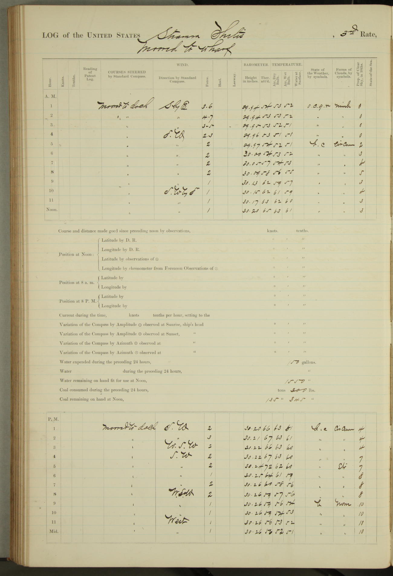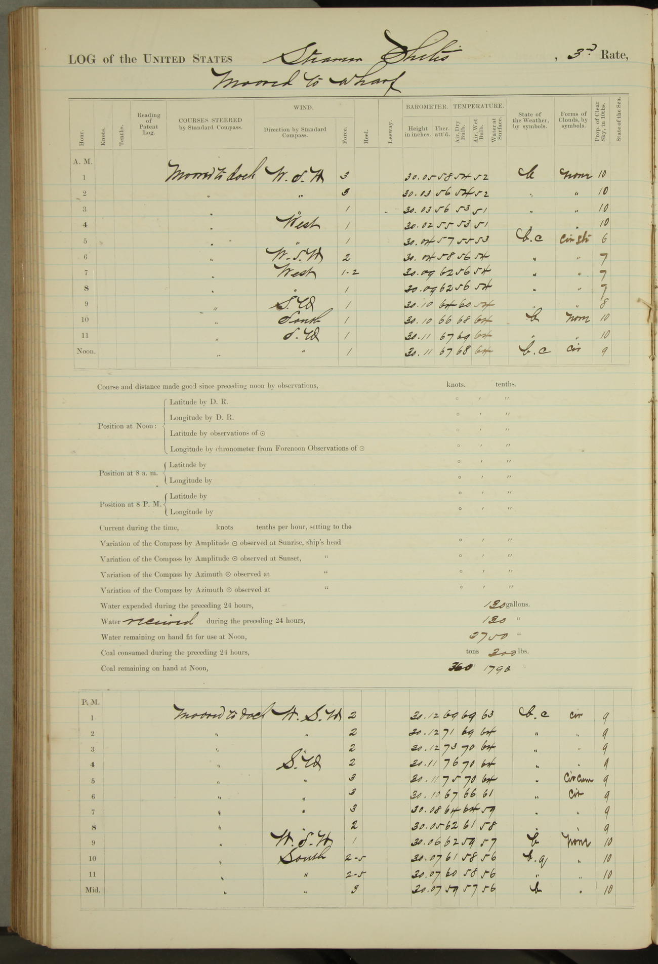 Shore people sinking dock until 10am, when found there something was wrong with section 3, so pumped out dock without ship getting out. Found that the stern of entrance gate had ~~~ in section 3, as abandoned attempt to get ship out of dock to-day. Started fires in dandy boiler, then hauled them. Transferred to US Naval Hospital A. Claus (C~) & A. Toat (Sea) by order of Commanding Officer J. Rattler (ICF) was rated oiler, J.V. Cronin (ICF) was rated 1st class fireman, & G.F. Gun (Oiler) was disrated to first class fireman.