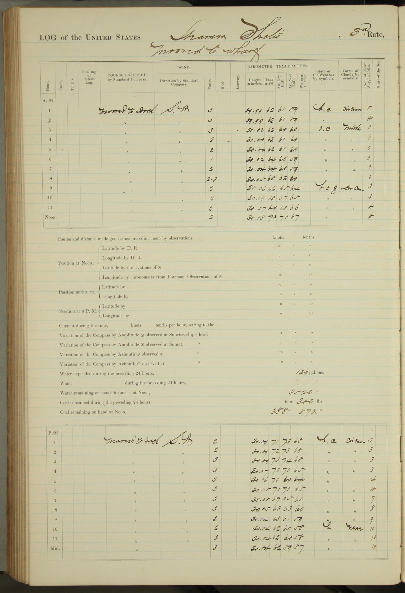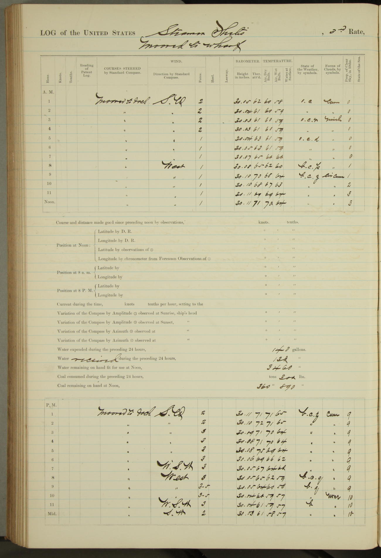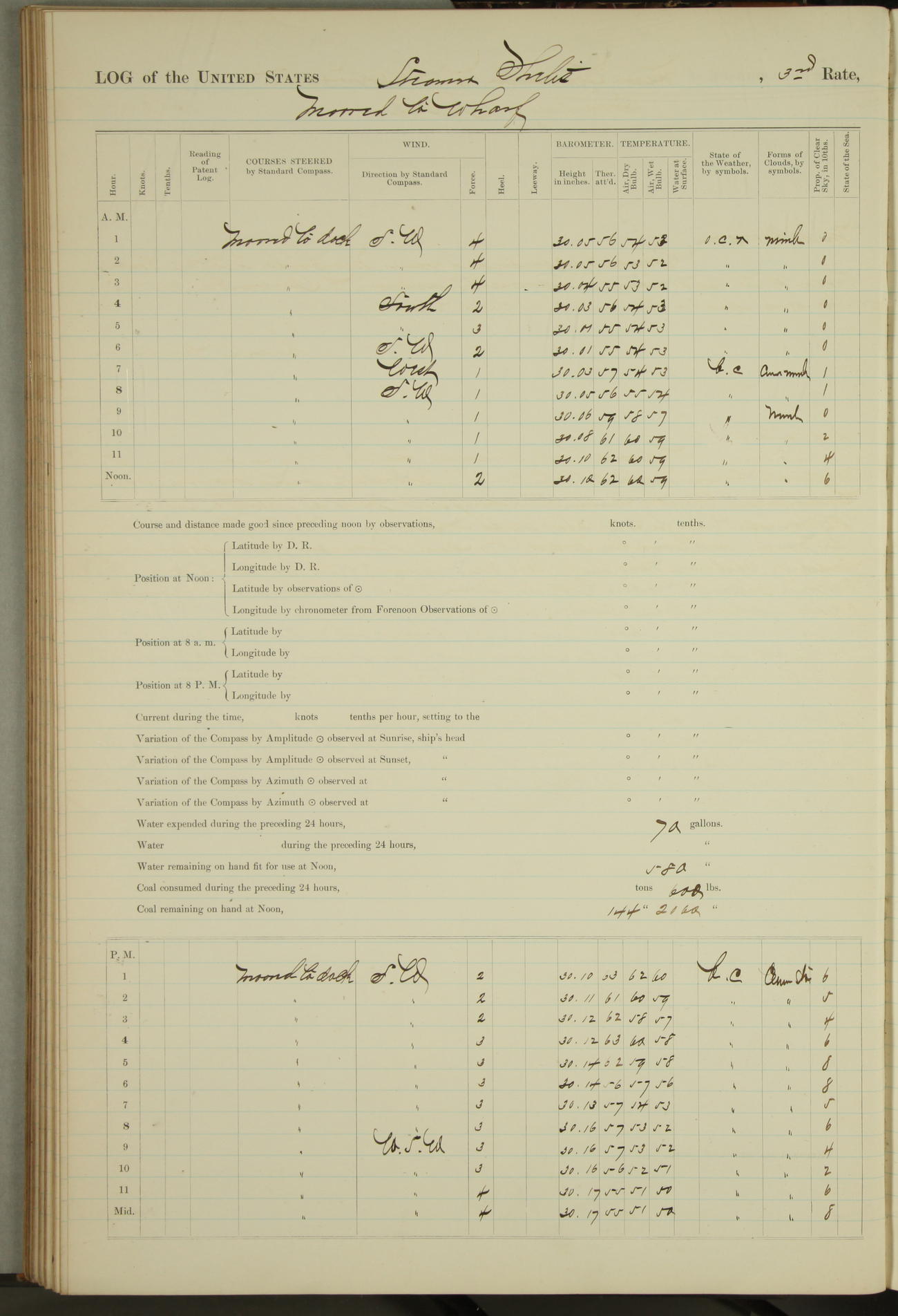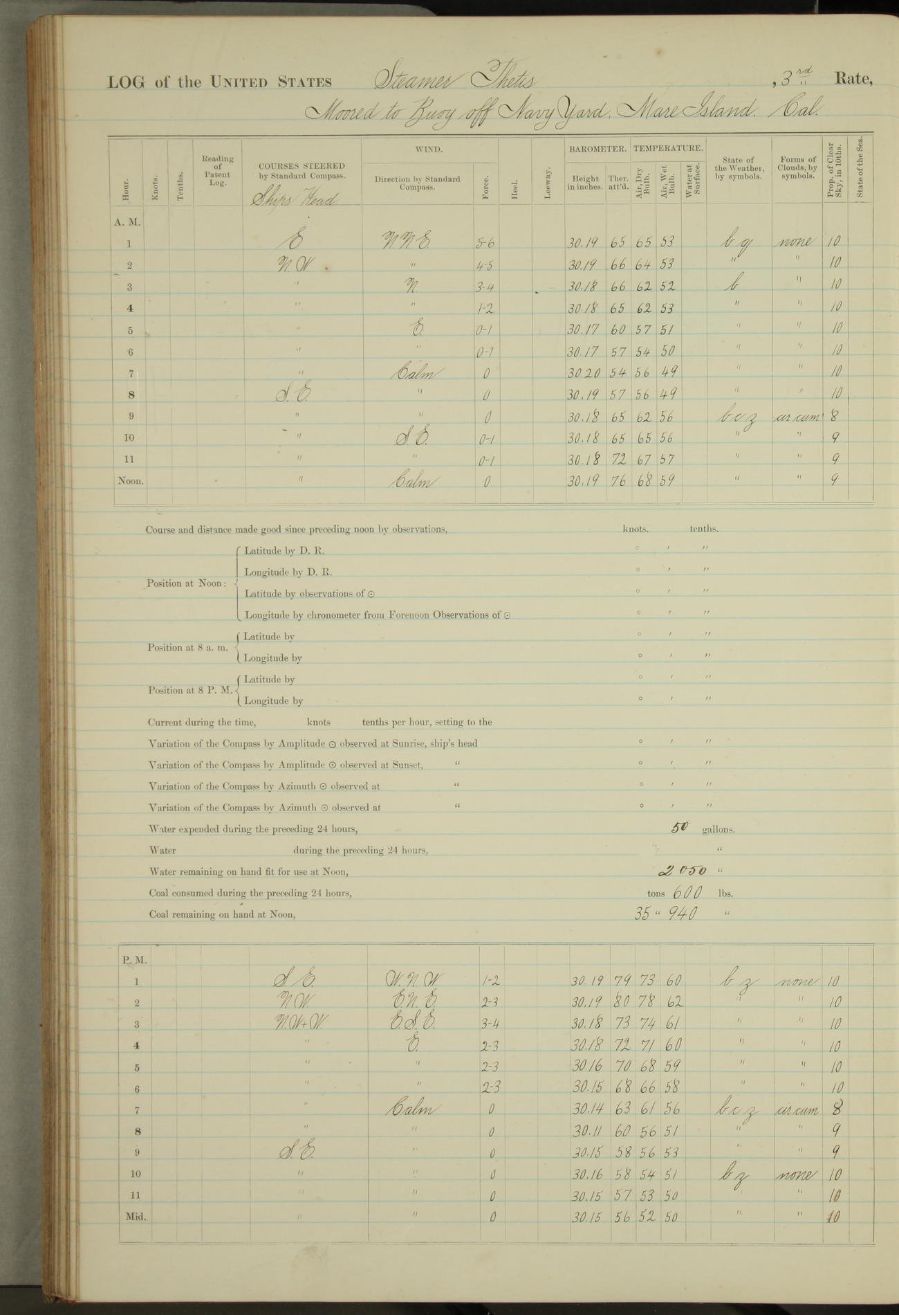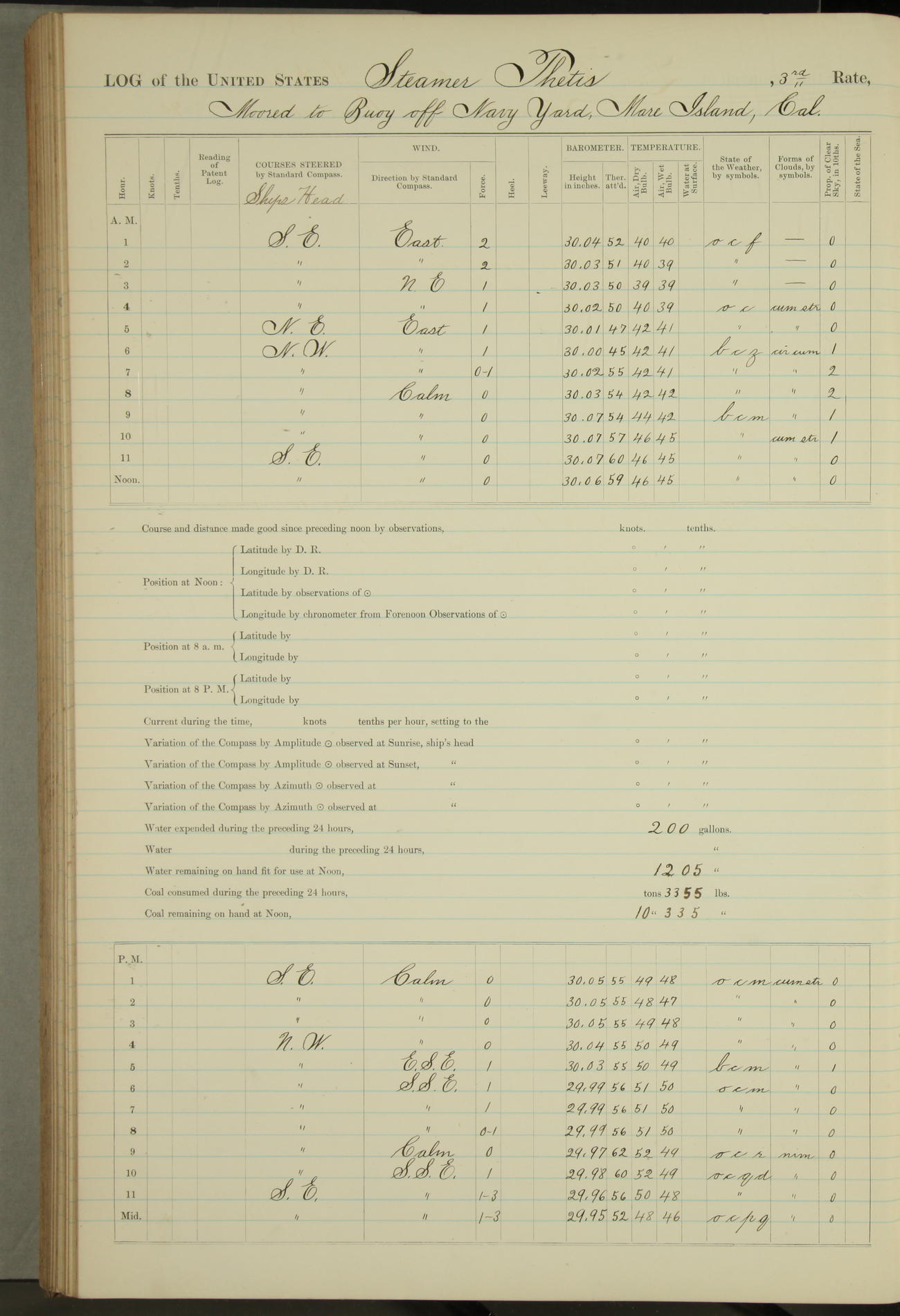 Shore people sinking dock until 10am, when found there something was wrong with section 3, so pumped out dock without ship getting out. Found that the stern of entrance gate had ~~~ in section 3, as abandoned attempt to get ship out of dock to-day. Started fires in dandy boiler, then hauled them. Transferred to US Naval Hospital A. Claus (C~) & A. Toat (Sea) by order of Commanding Officer J. Rattler (ICF) was rated oiler, J.V. Cronin (ICF) was rated 1st class fireman, & G.F. Gun (Oiler) was disrated to first class fireman.