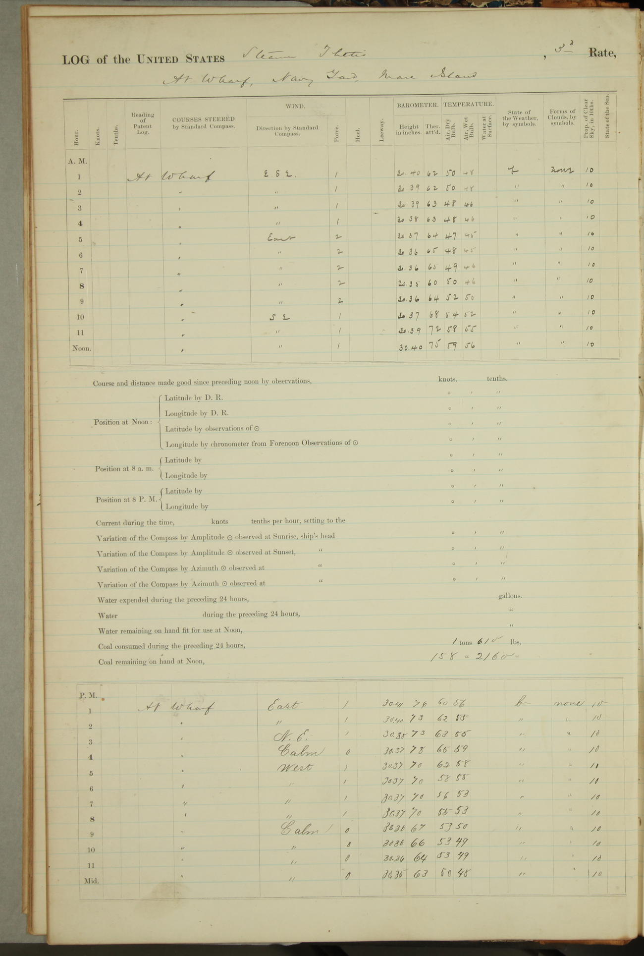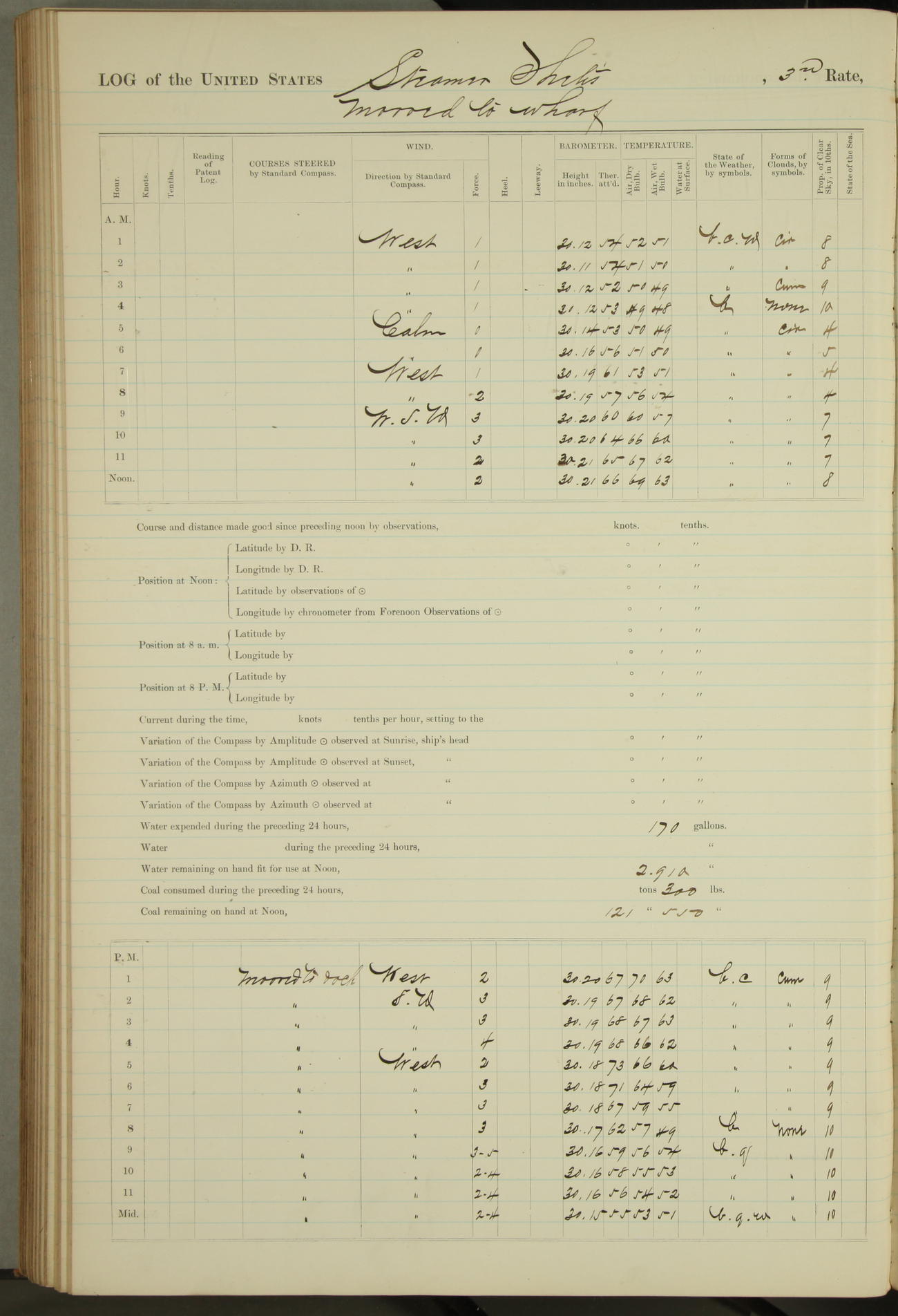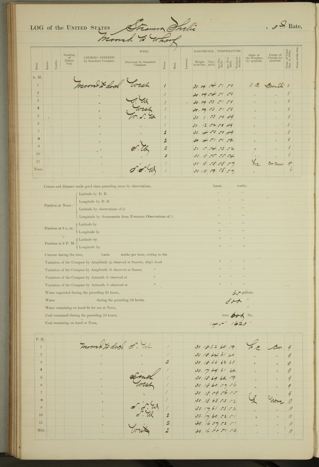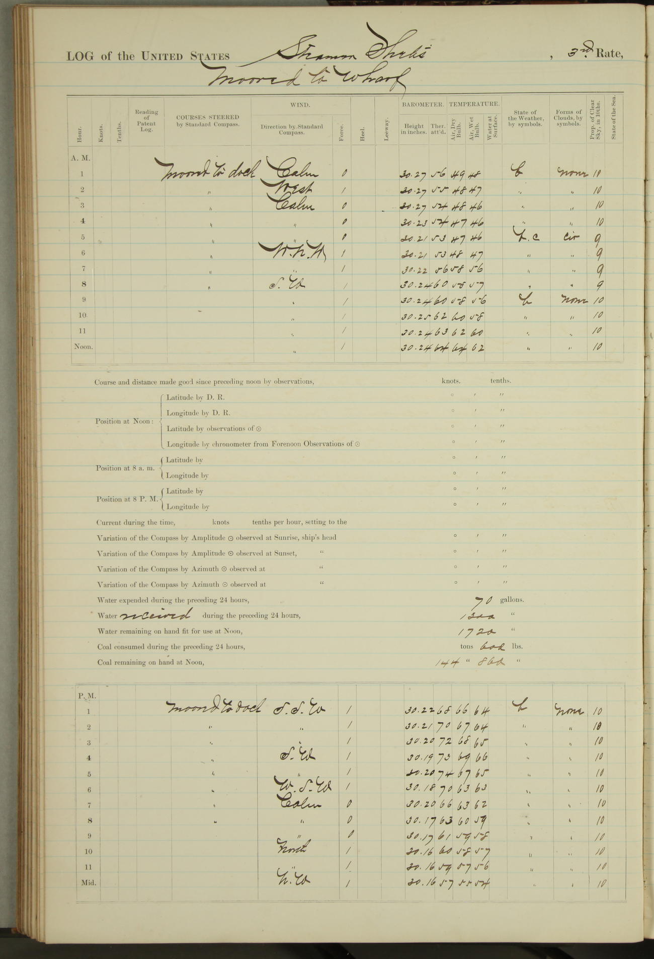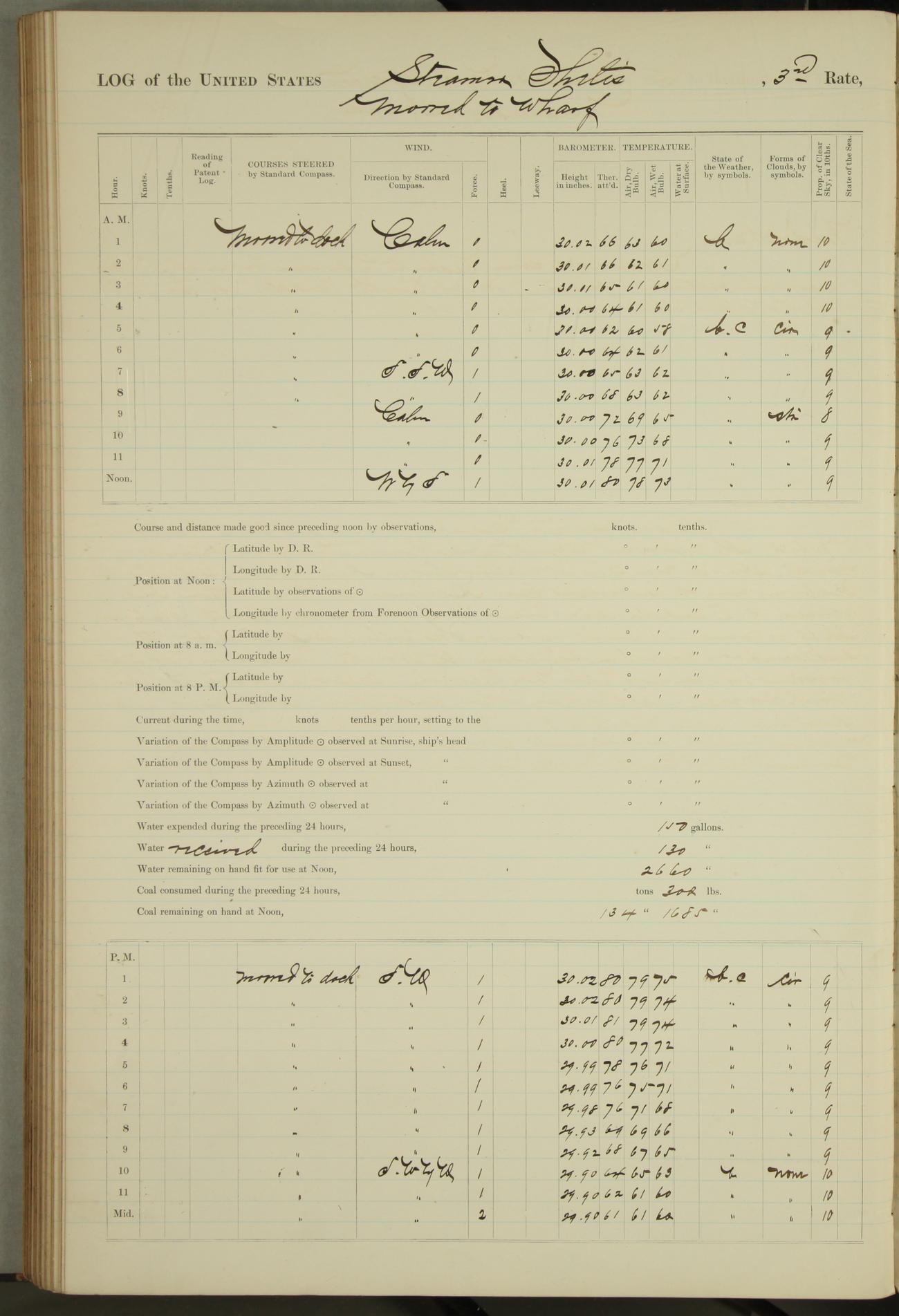 Shore people sinking dock until 10am, when found there something was wrong with section 3, so pumped out dock without ship getting out. Found that the stern of entrance gate had ~~~ in section 3, as abandoned attempt to get ship out of dock to-day. Started fires in dandy boiler, then hauled them. Transferred to US Naval Hospital A. Claus (C~) & A. Toat (Sea) by order of Commanding Officer J. Rattler (ICF) was rated oiler, J.V. Cronin (ICF) was rated 1st class fireman, & G.F. Gun (Oiler) was disrated to first class fireman.