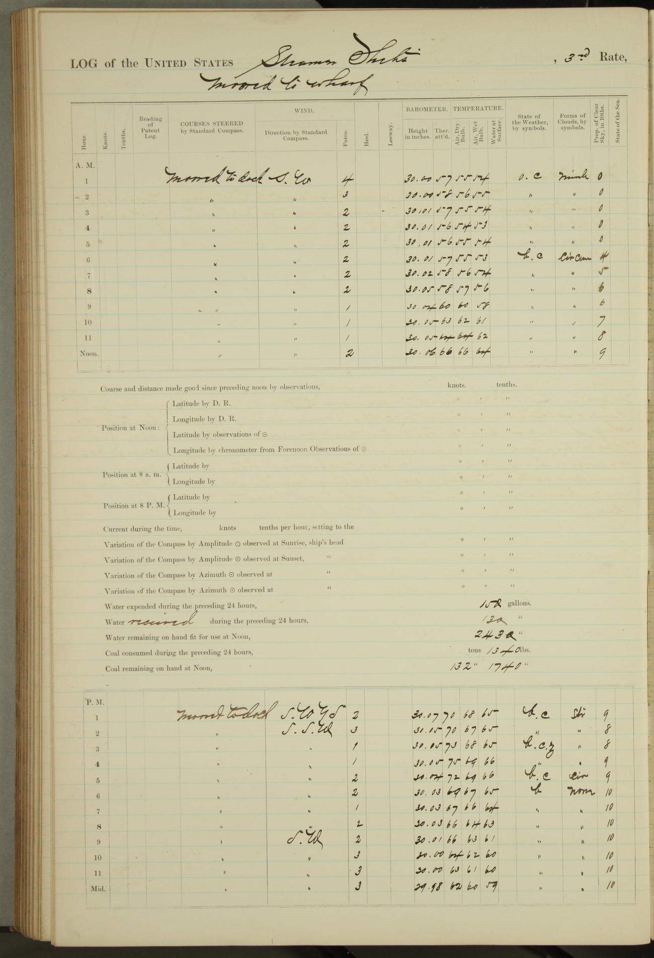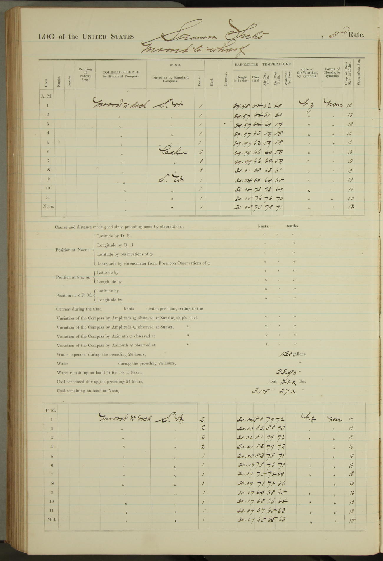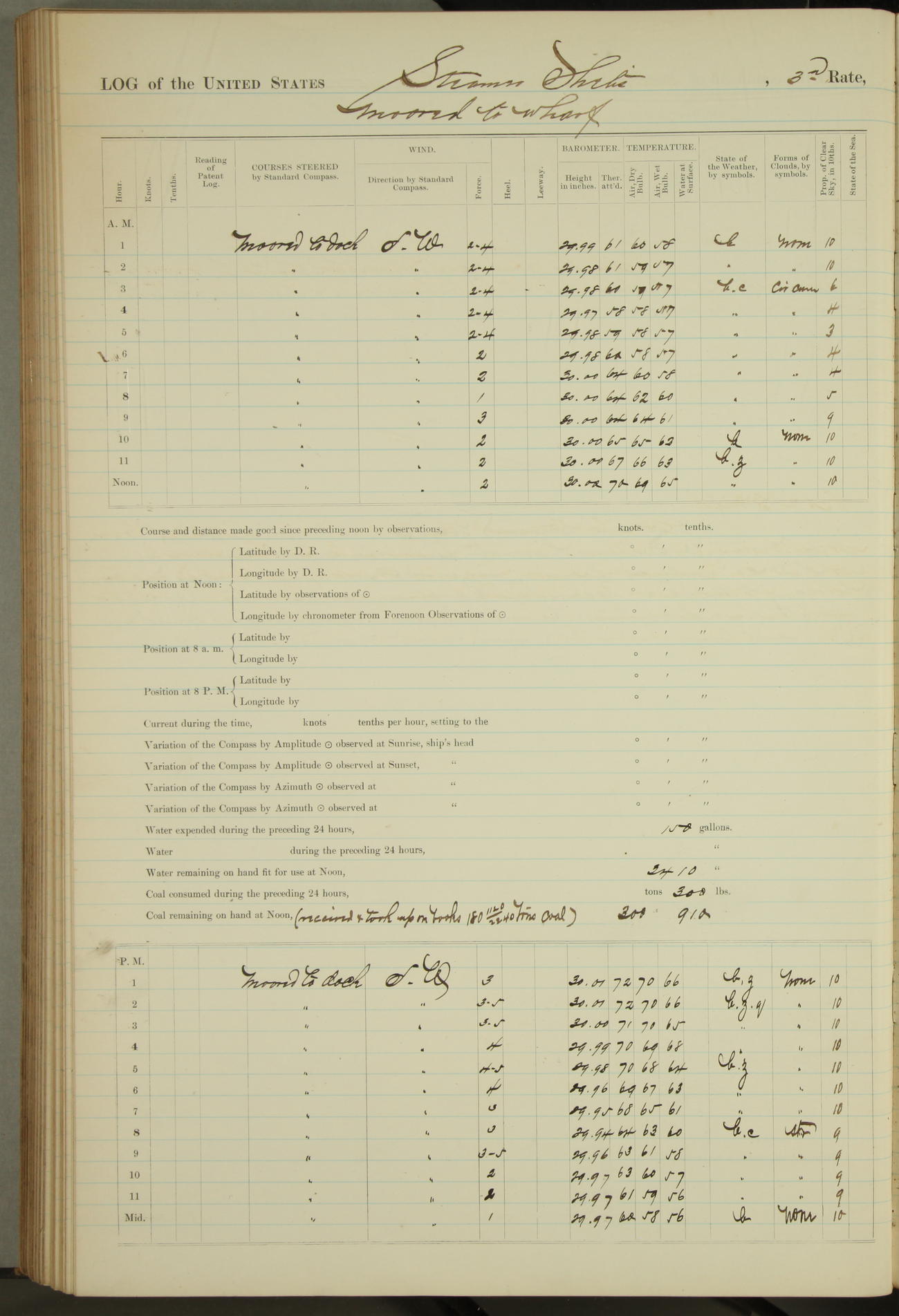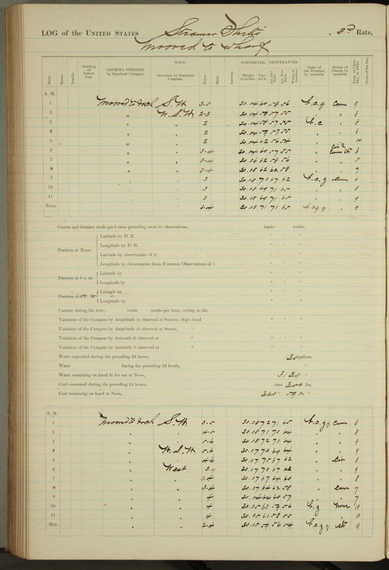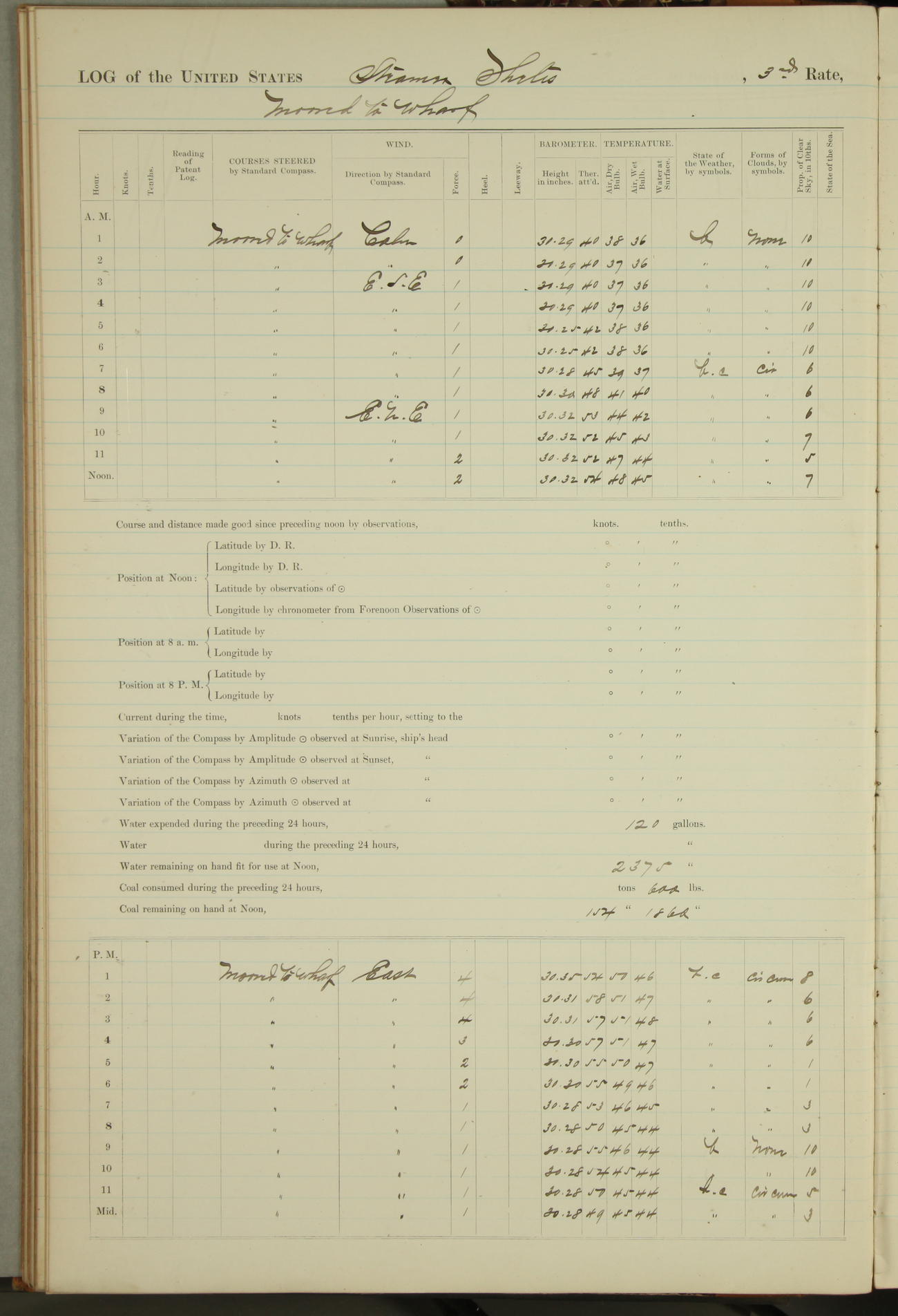 Shore people sinking dock until 10am, when found there something was wrong with section 3, so pumped out dock without ship getting out. Found that the stern of entrance gate had ~~~ in section 3, as abandoned attempt to get ship out of dock to-day. Started fires in dandy boiler, then hauled them. Transferred to US Naval Hospital A. Claus (C~) & A. Toat (Sea) by order of Commanding Officer J. Rattler (ICF) was rated oiler, J.V. Cronin (ICF) was rated 1st class fireman, & G.F. Gun (Oiler) was disrated to first class fireman.