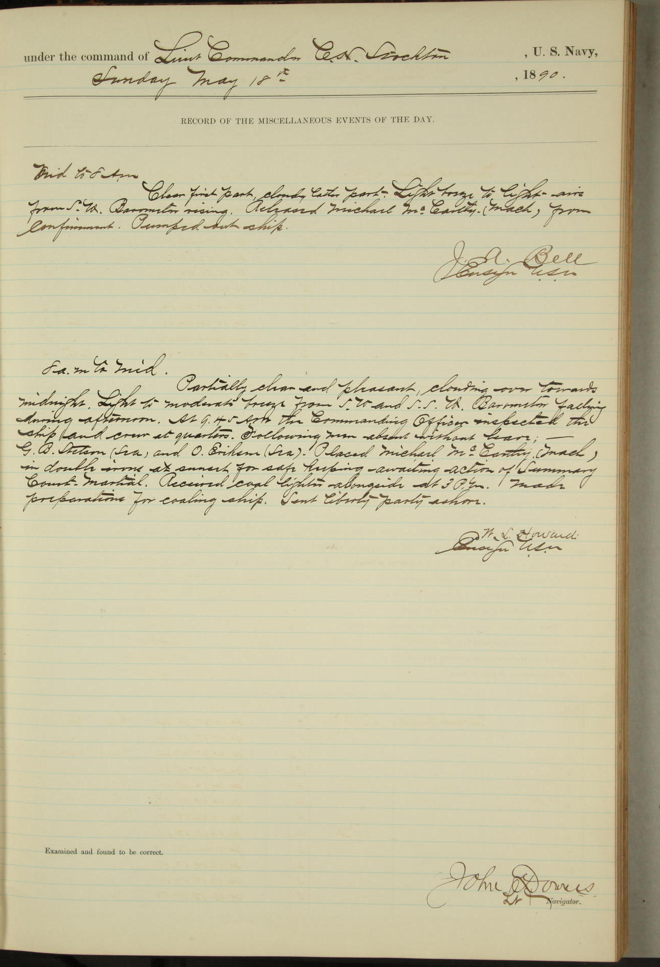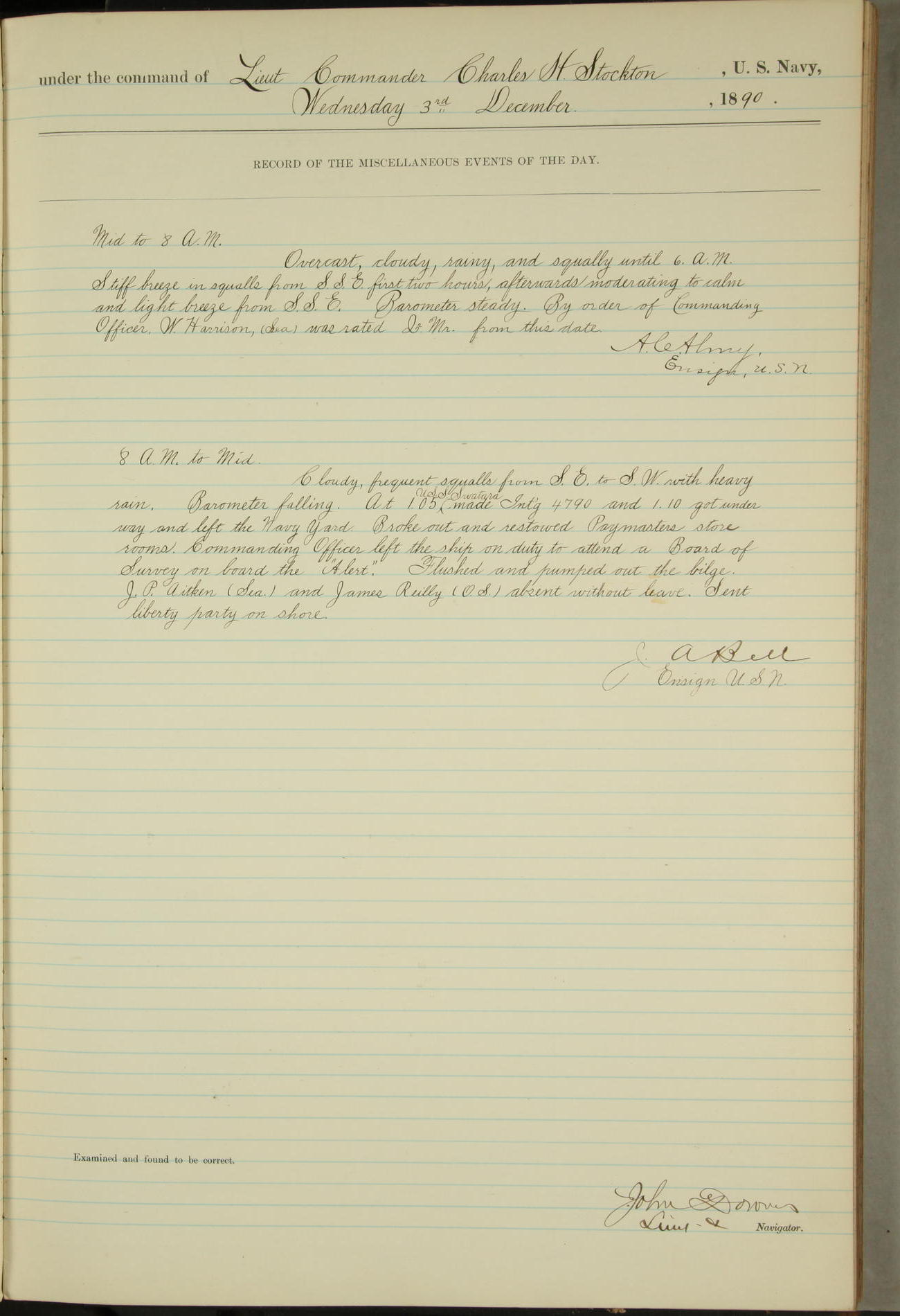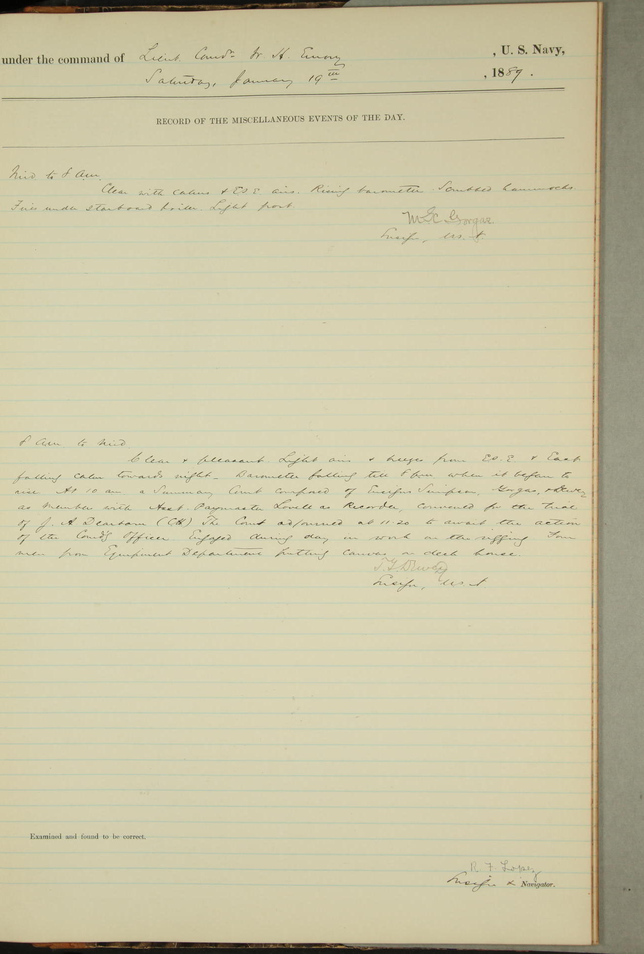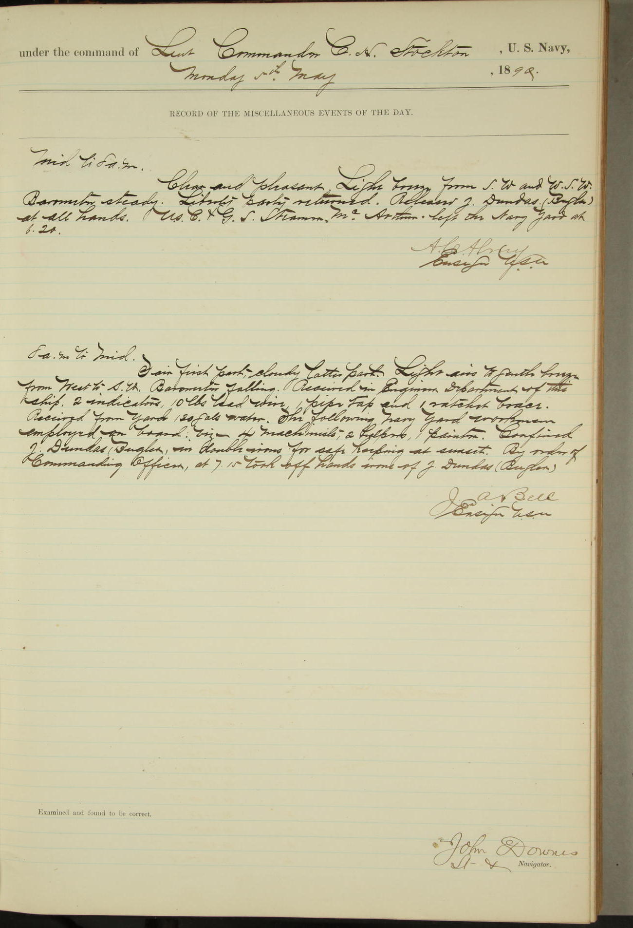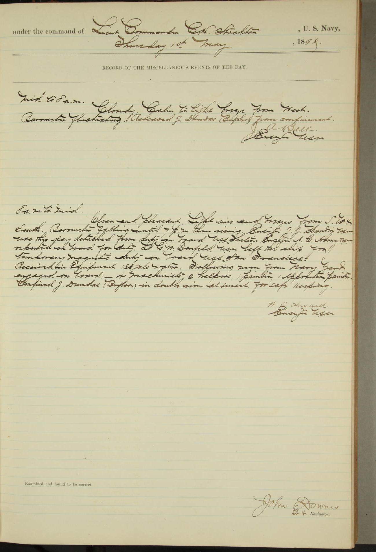 JA Dearborn - At 10am a Summary Court composed of Ensigns Simpson, Gorgas & Dewey as members with Asst Paymaster Lovell as Recorder convened for the tial of JA Dearborn (CH). The court adjourned at 11.20 to await the action of the Comd'g Officer.