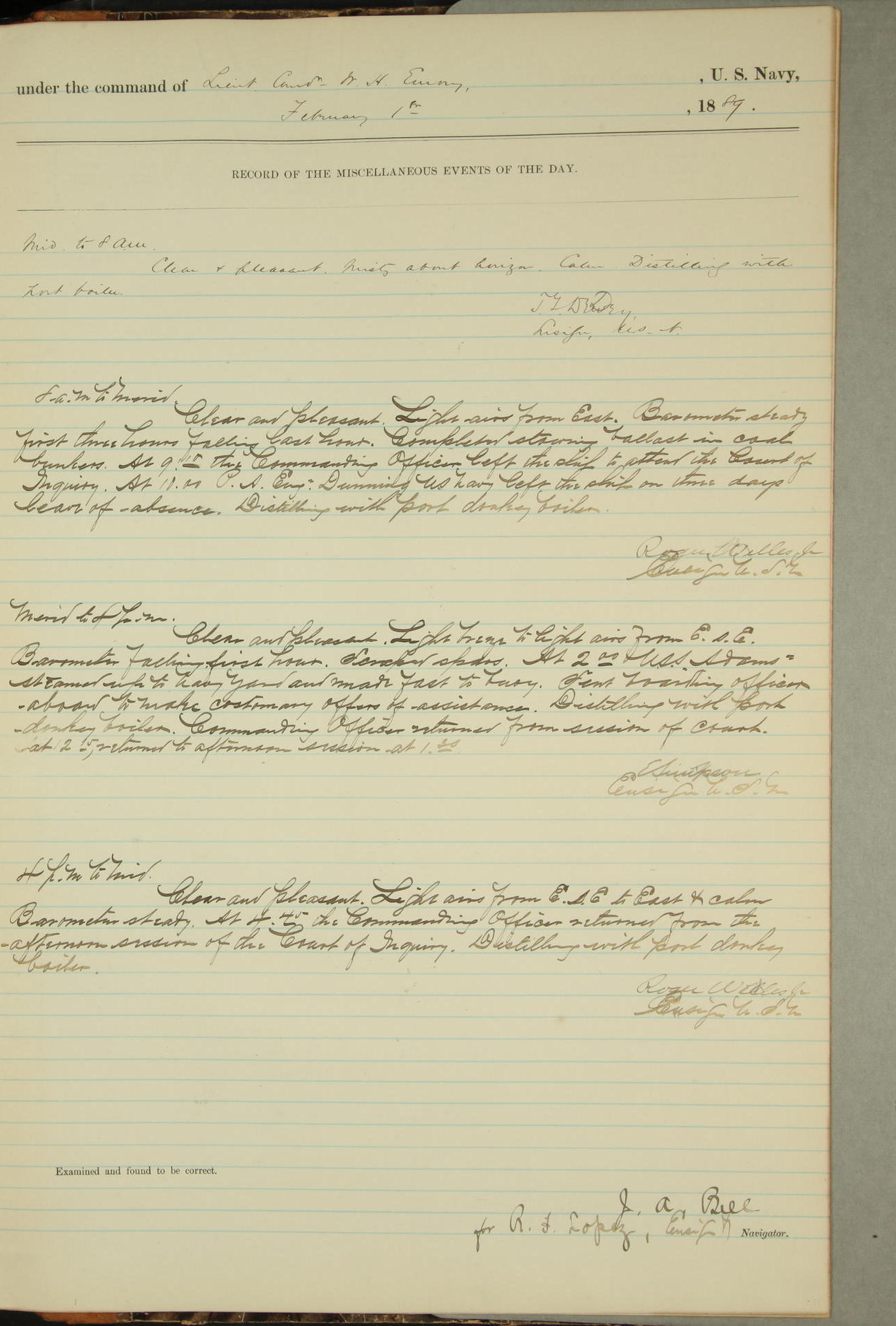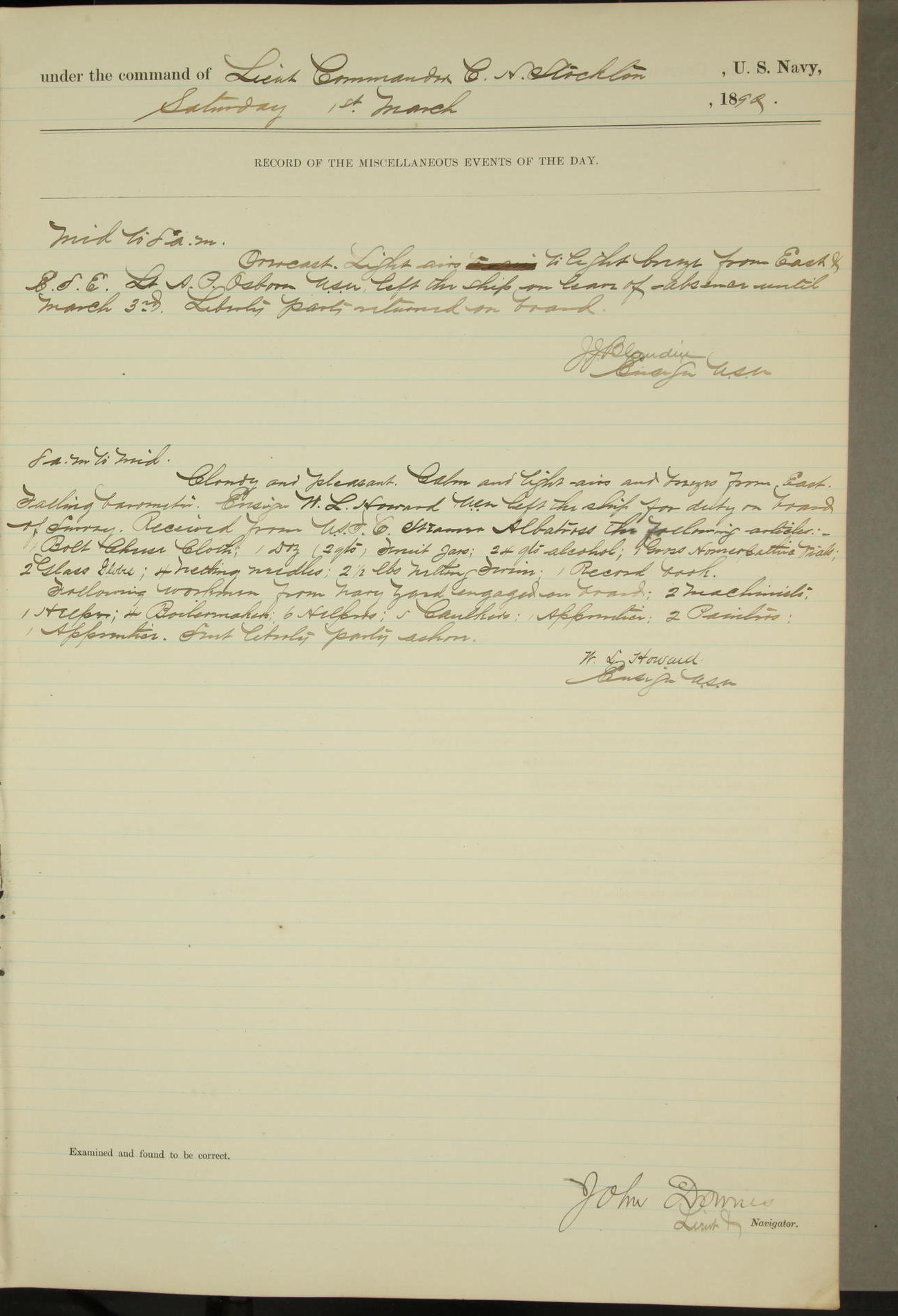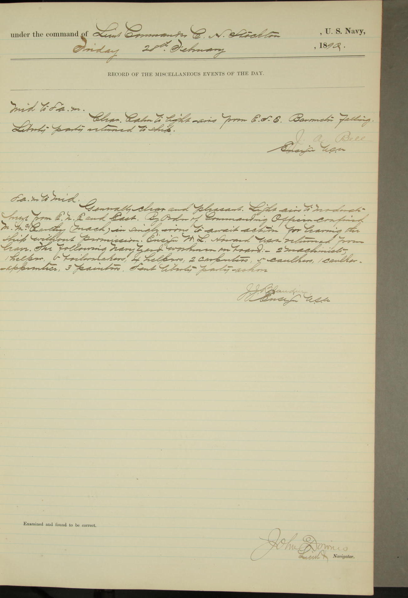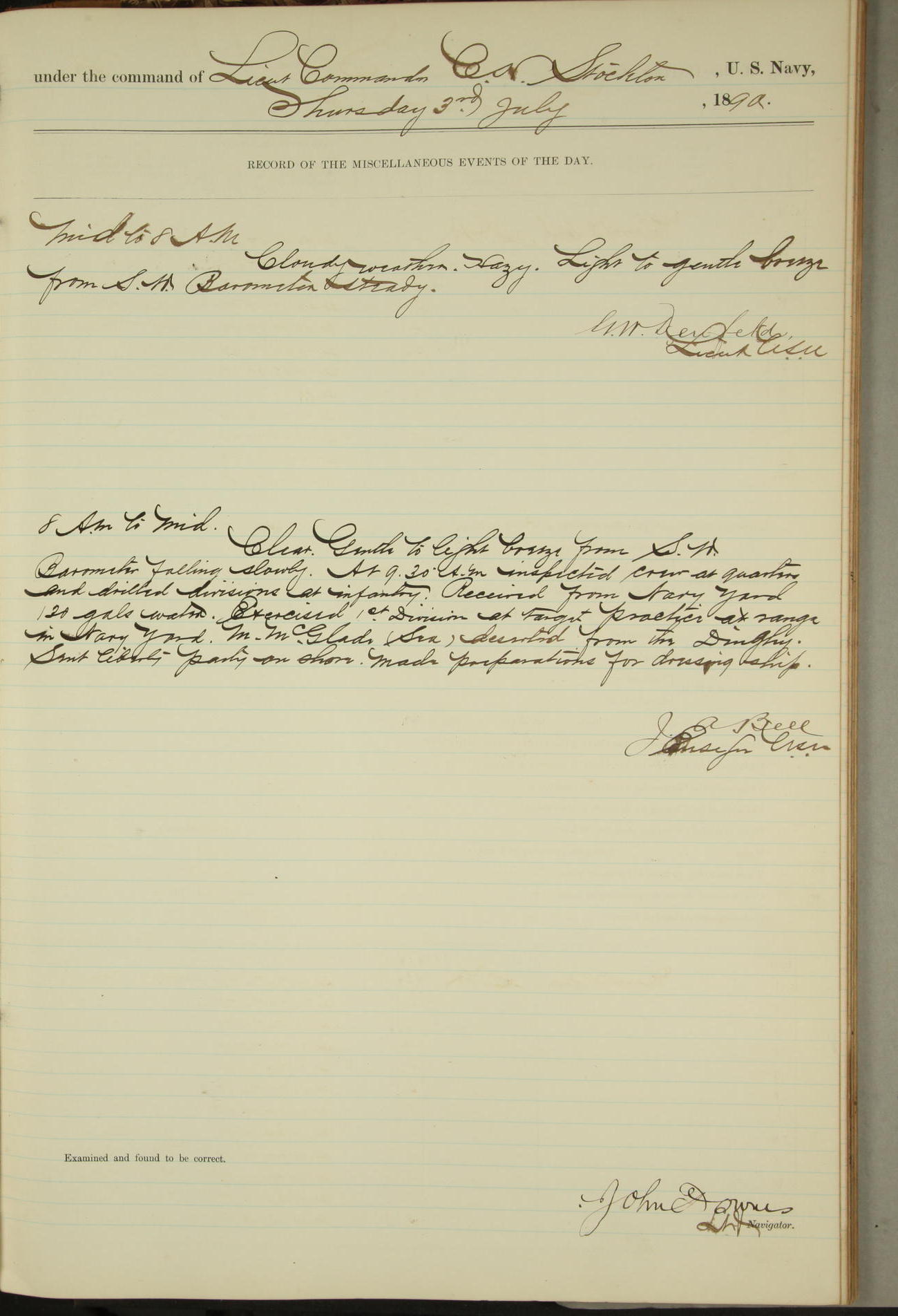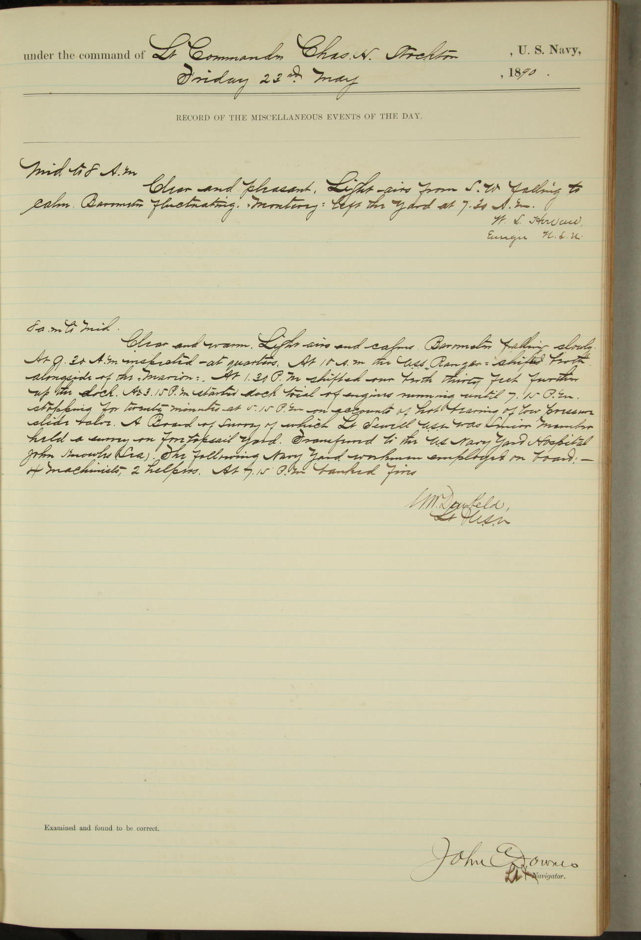 JA Dearborn - At 10am a Summary Court composed of Ensigns Simpson, Gorgas & Dewey as members with Asst Paymaster Lovell as Recorder convened for the tial of JA Dearborn (CH). The court adjourned at 11.20 to await the action of the Comd'g Officer.