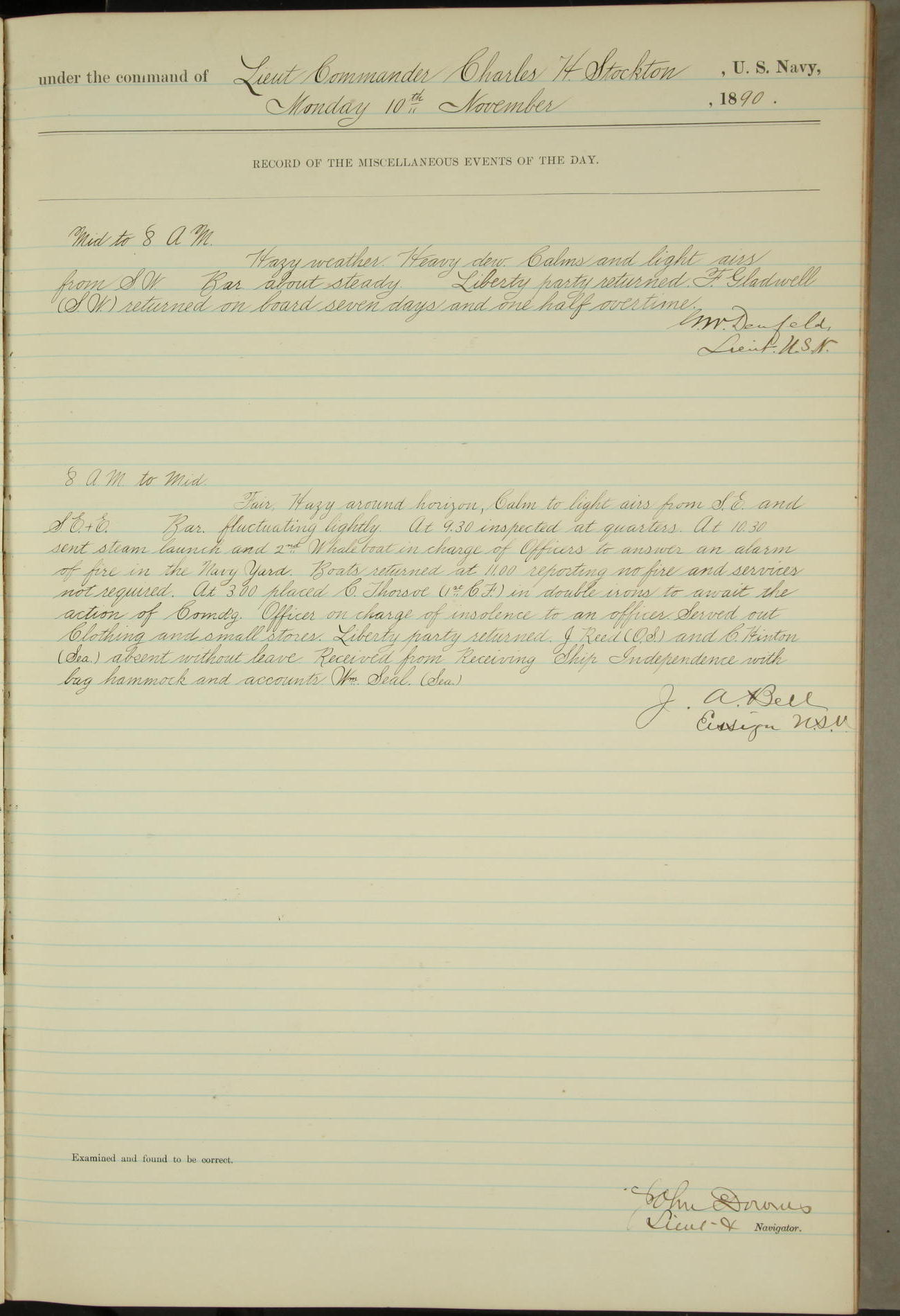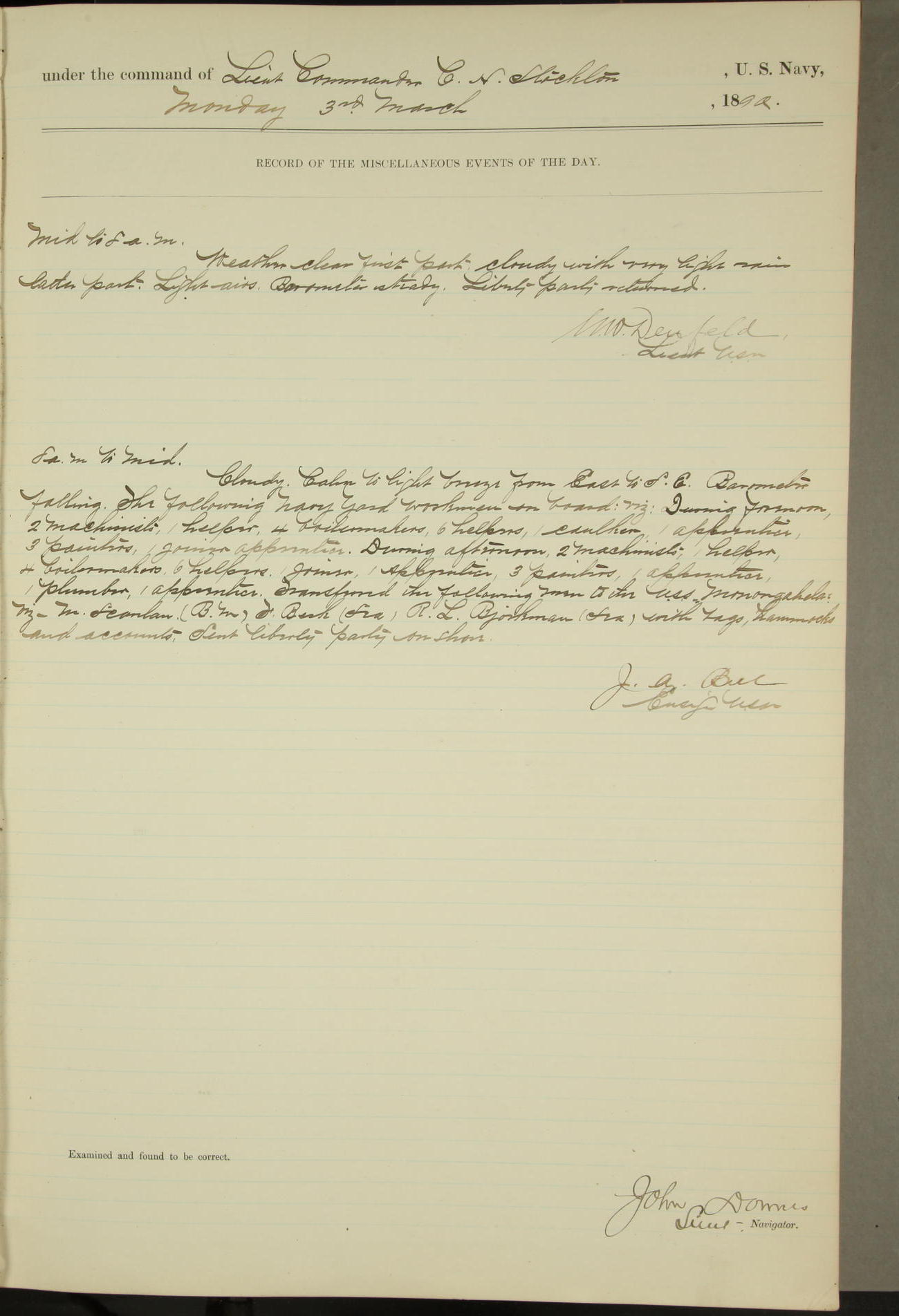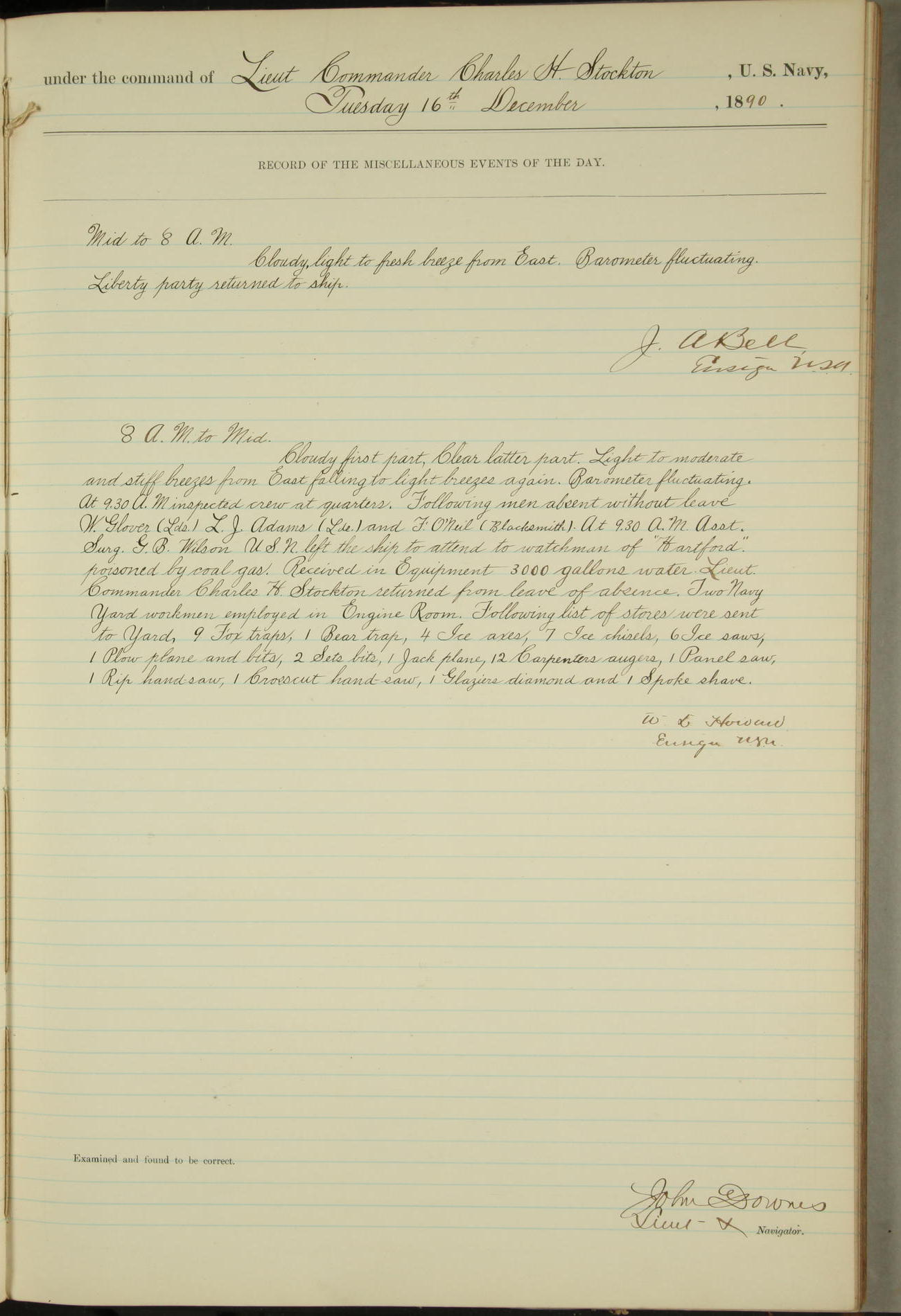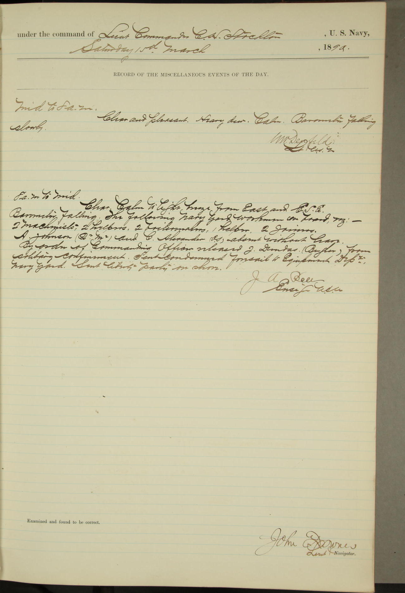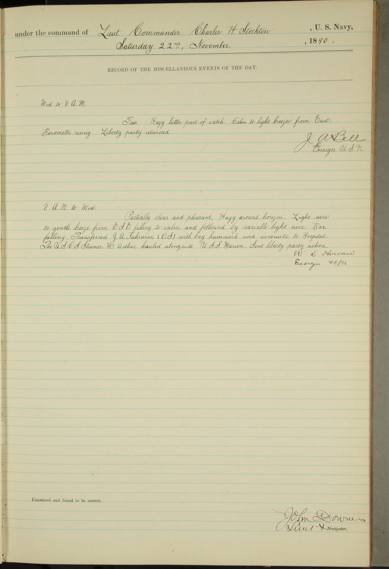 JA Dearborn - At 10am a Summary Court composed of Ensigns Simpson, Gorgas & Dewey as members with Asst Paymaster Lovell as Recorder convened for the tial of JA Dearborn (CH). The court adjourned at 11.20 to await the action of the Comd'g Officer.