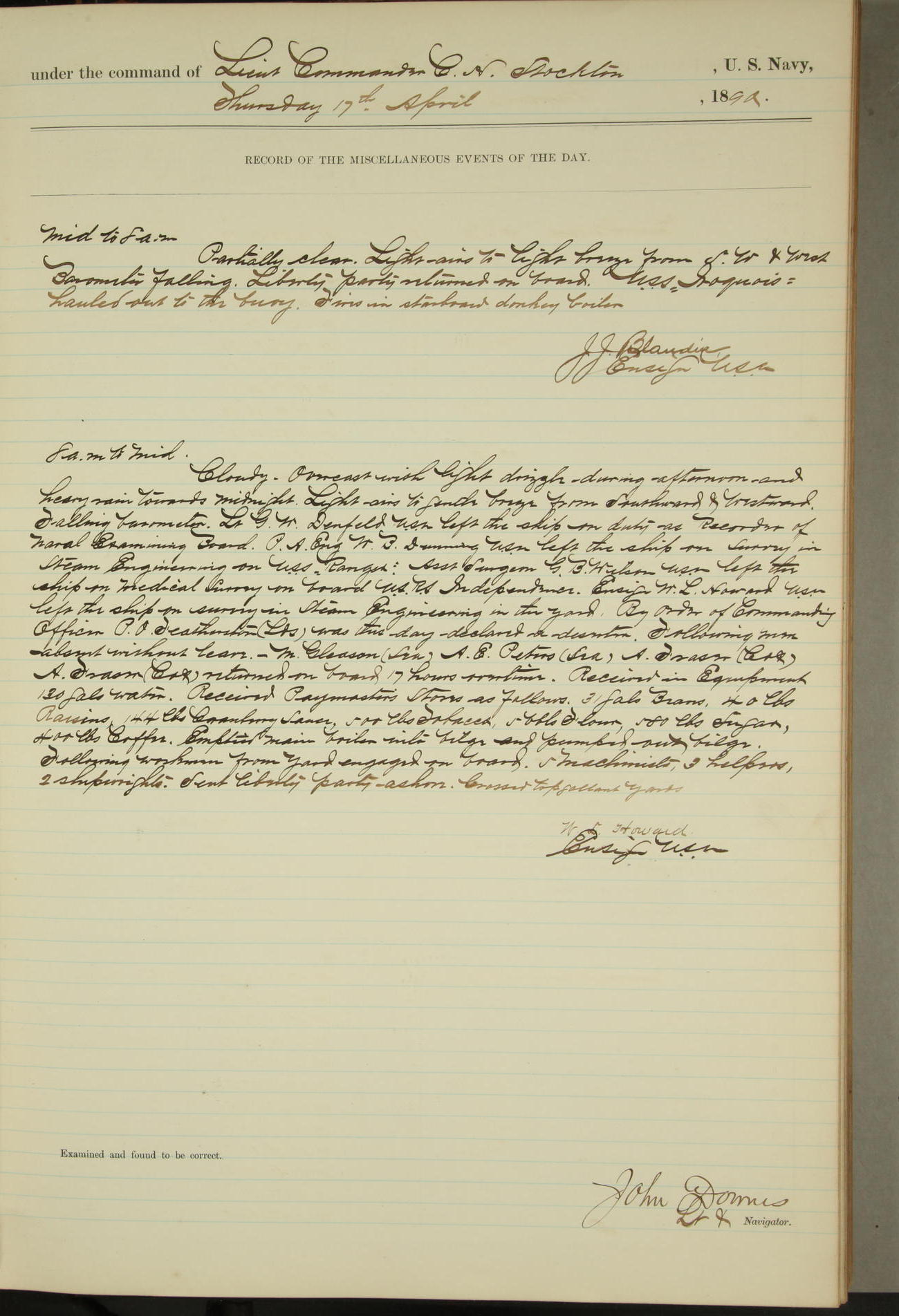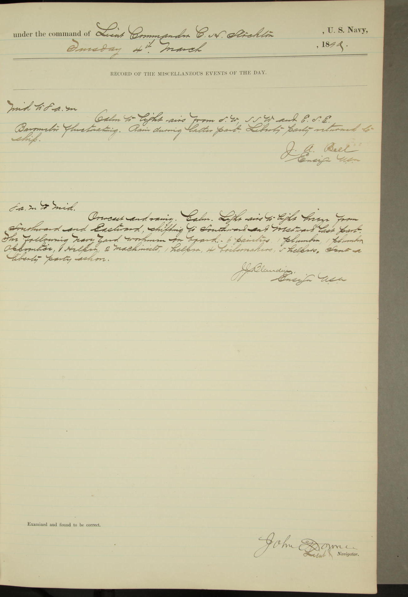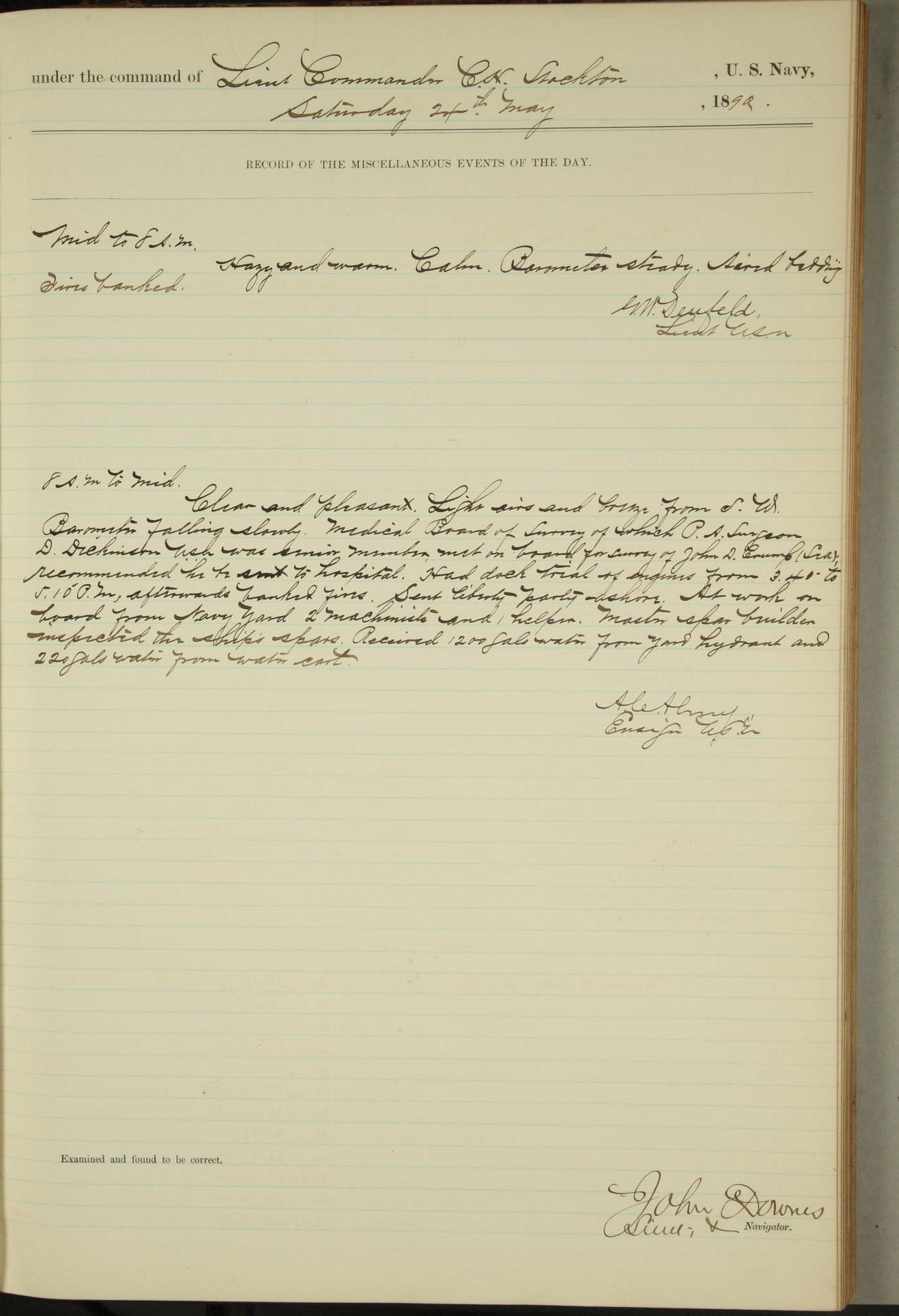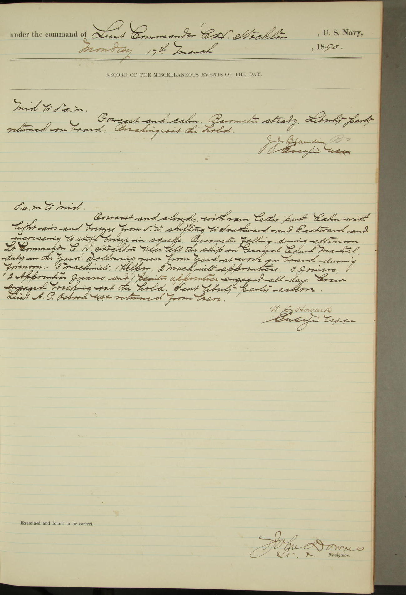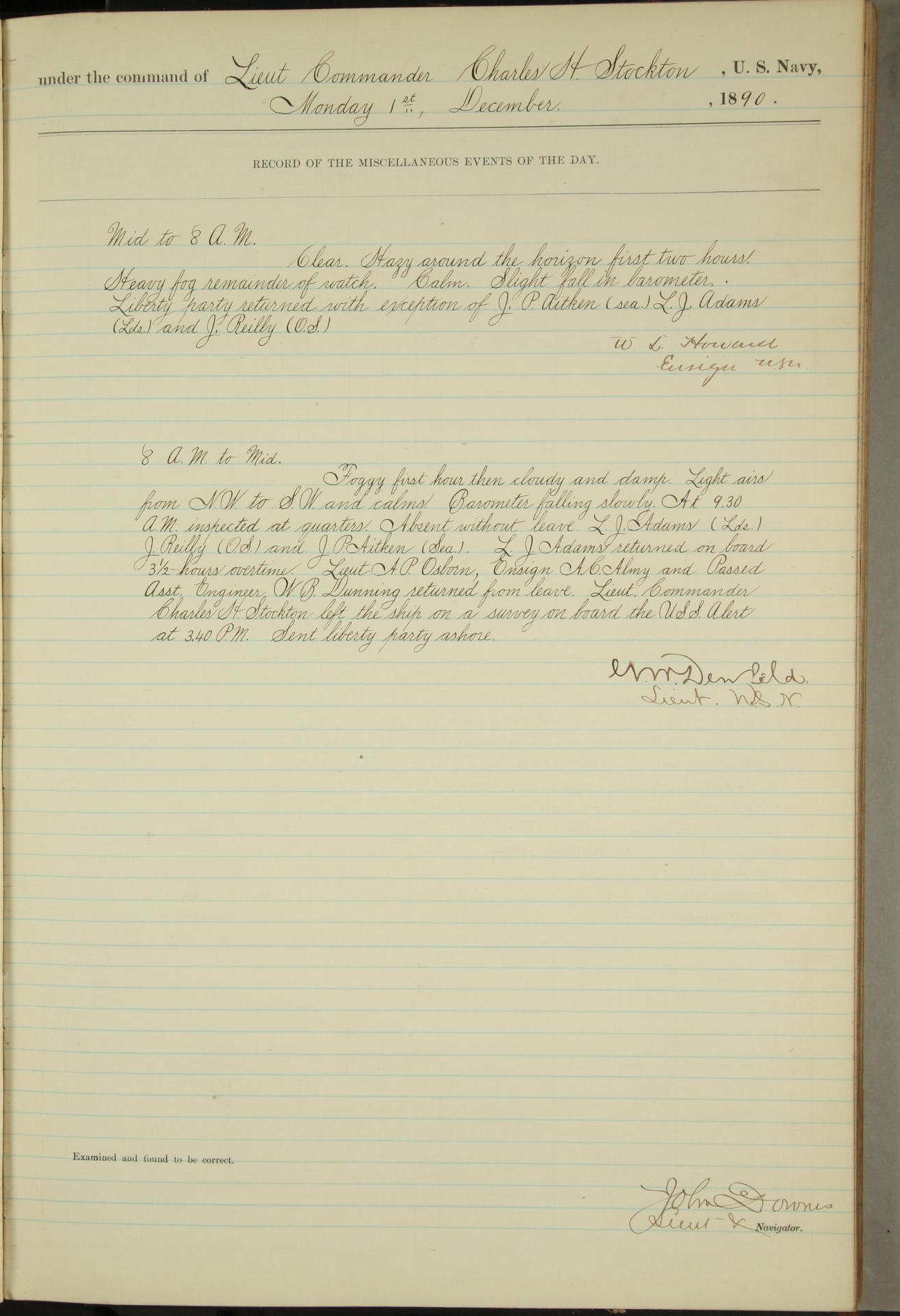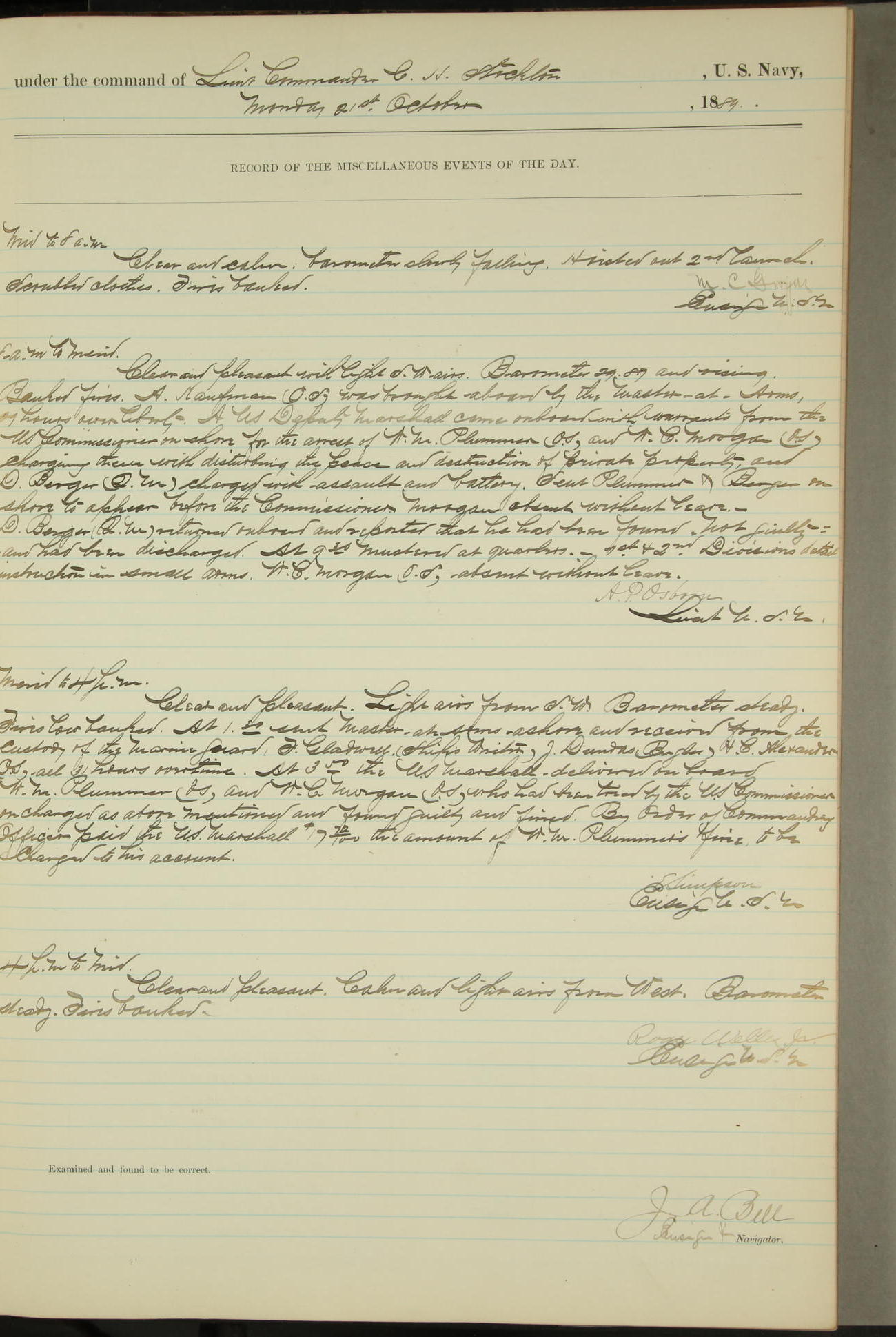 JA Dearborn - At 10am a Summary Court composed of Ensigns Simpson, Gorgas & Dewey as members with Asst Paymaster Lovell as Recorder convened for the tial of JA Dearborn (CH). The court adjourned at 11.20 to await the action of the Comd'g Officer.