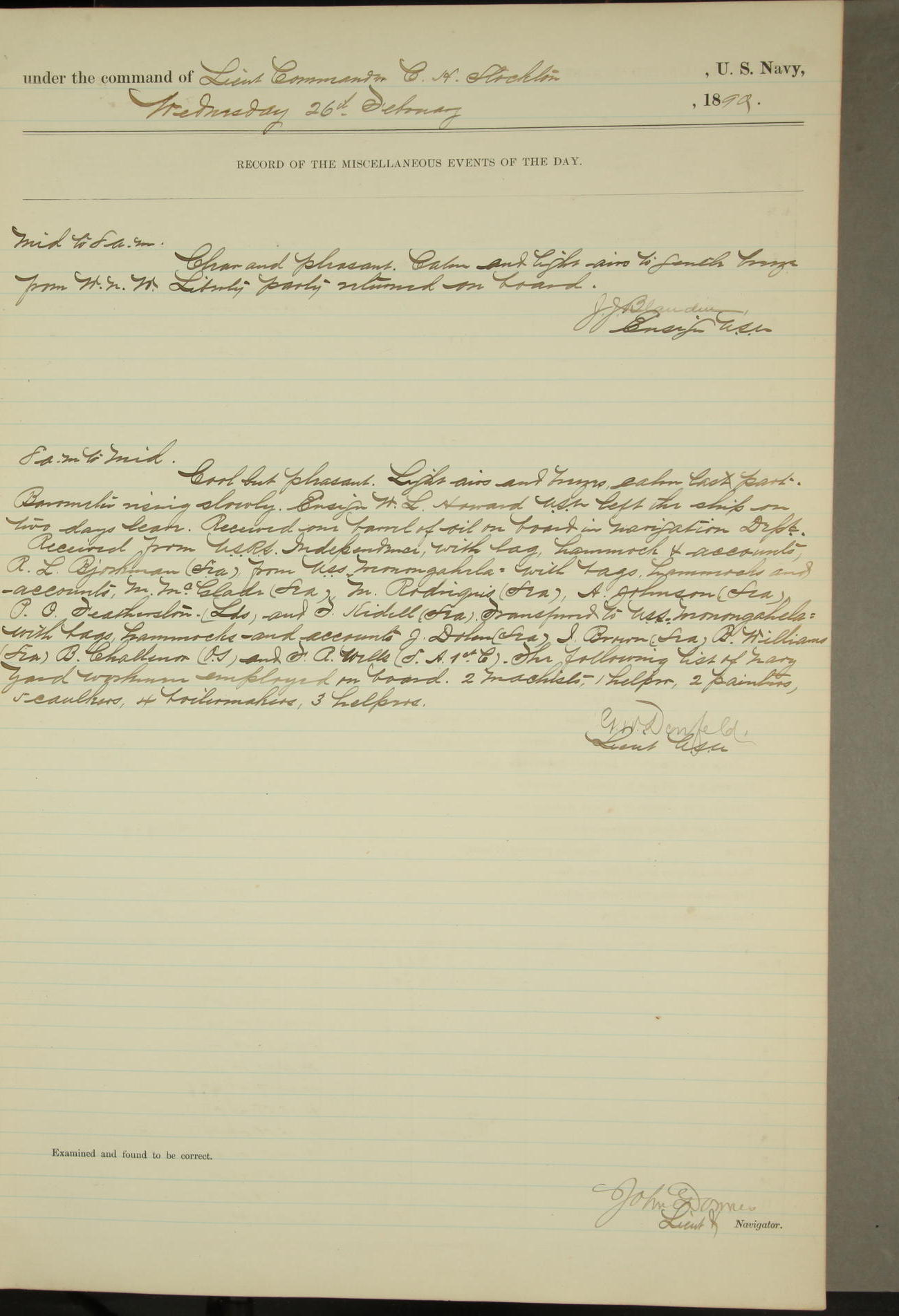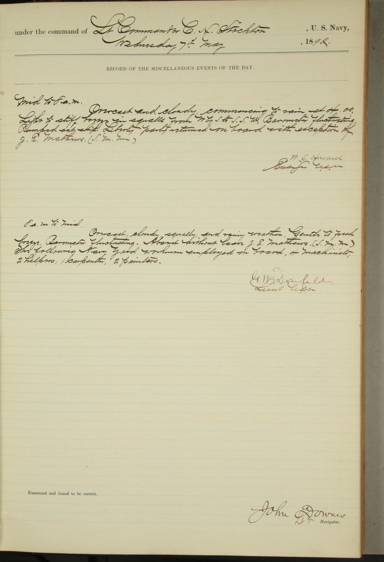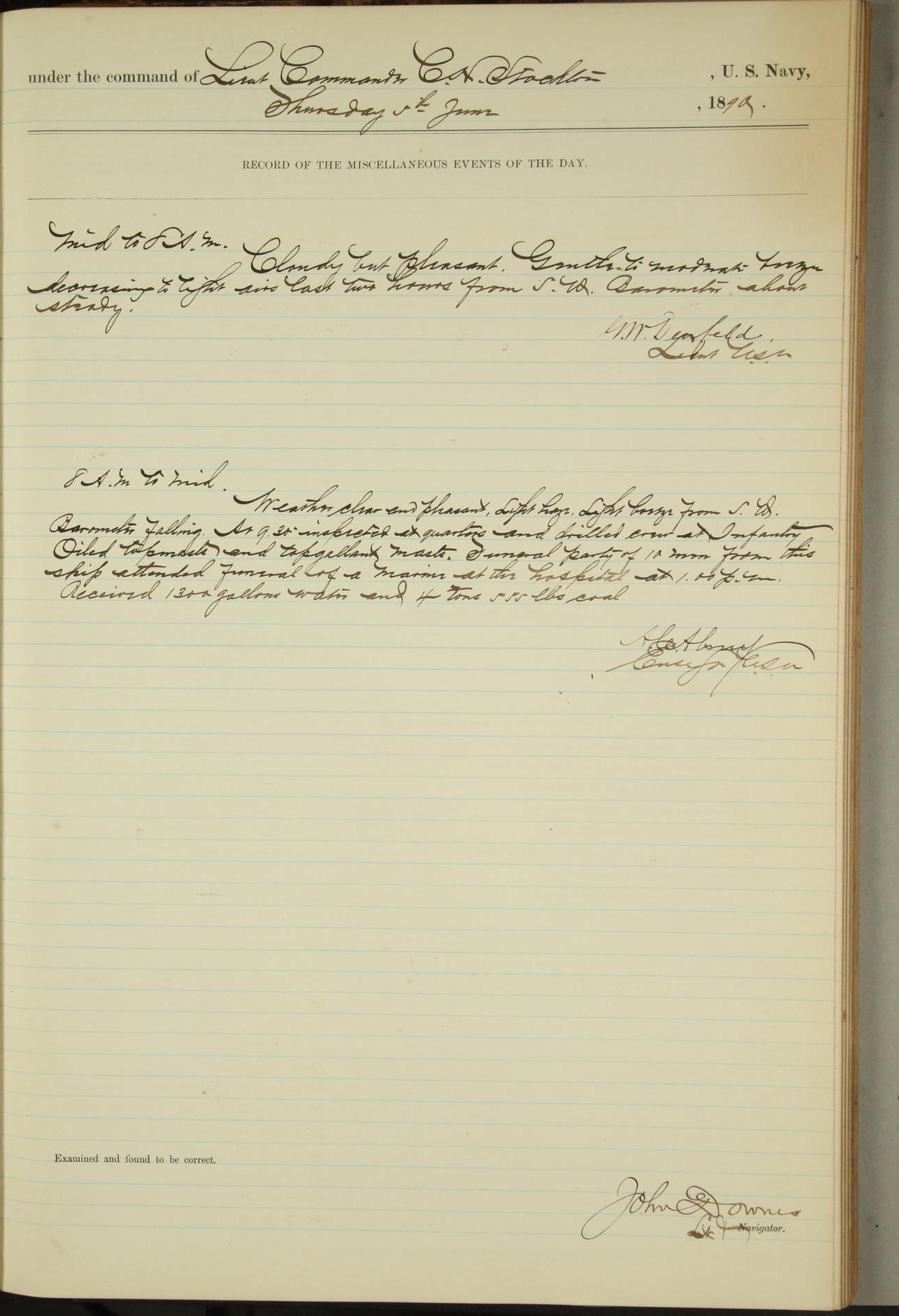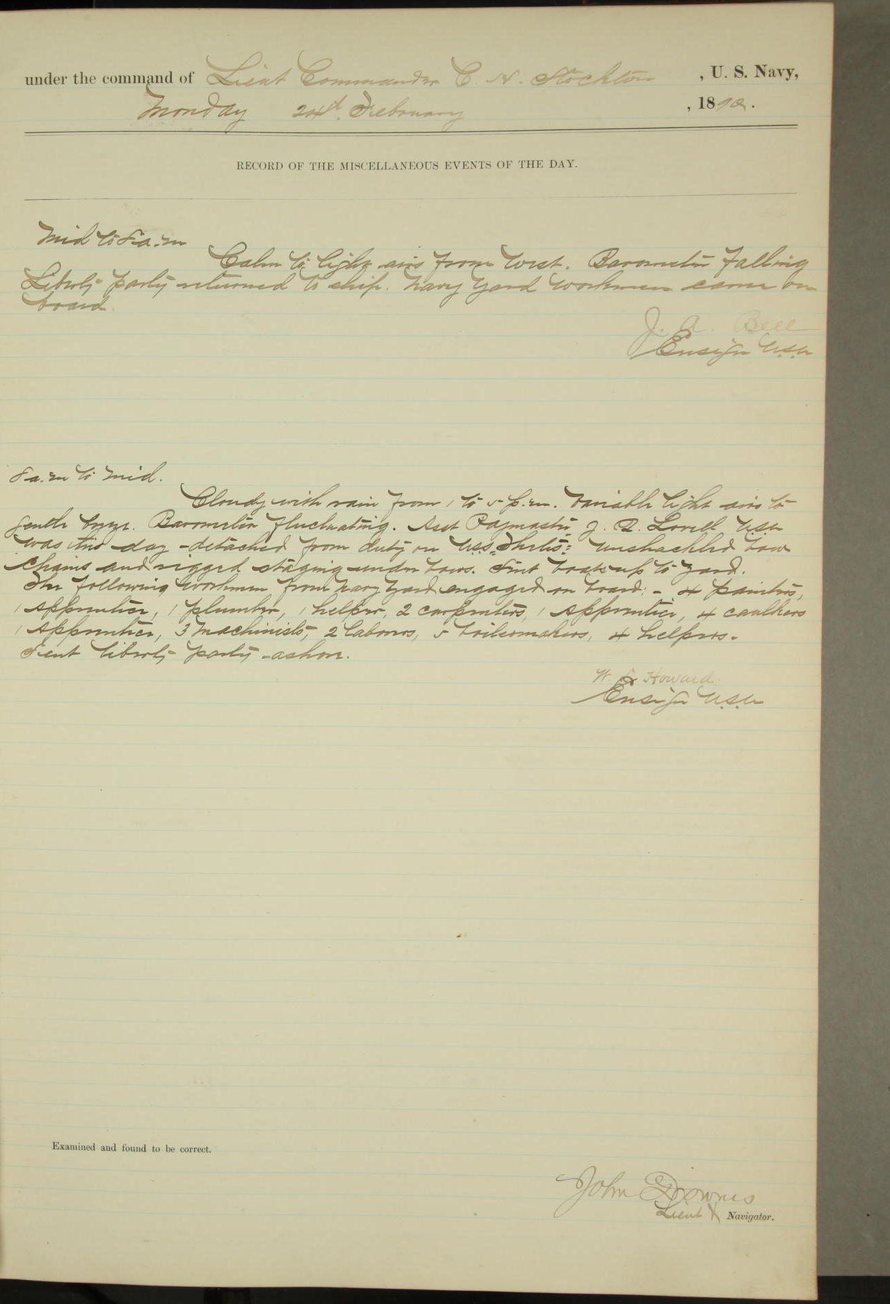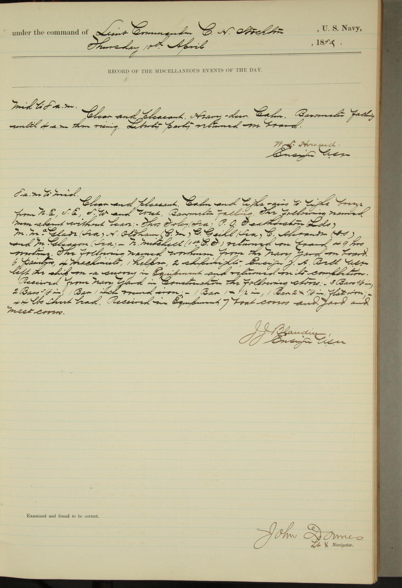 JA Dearborn - At 10am a Summary Court composed of Ensigns Simpson, Gorgas & Dewey as members with Asst Paymaster Lovell as Recorder convened for the tial of JA Dearborn (CH). The court adjourned at 11.20 to await the action of the Comd'g Officer.