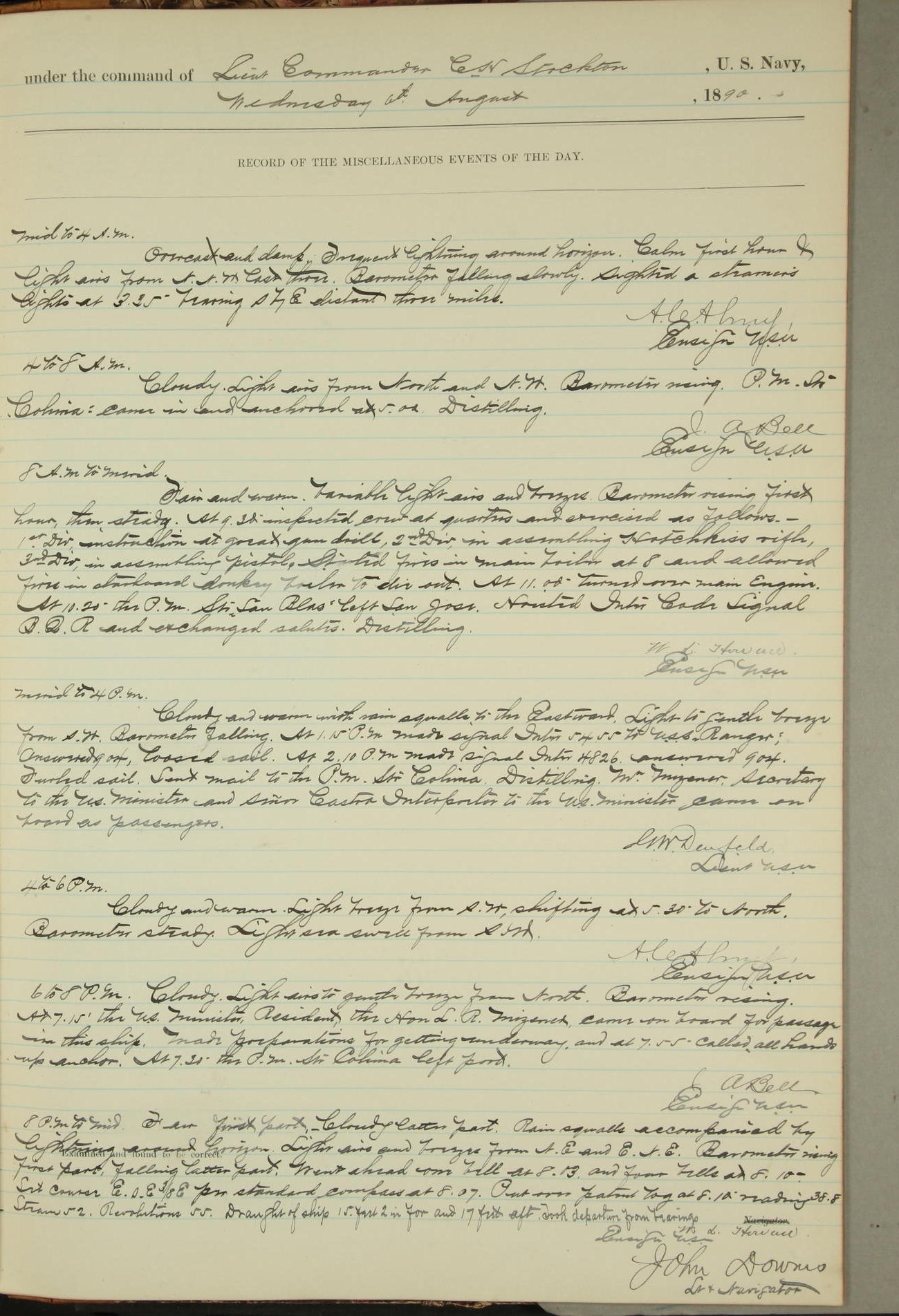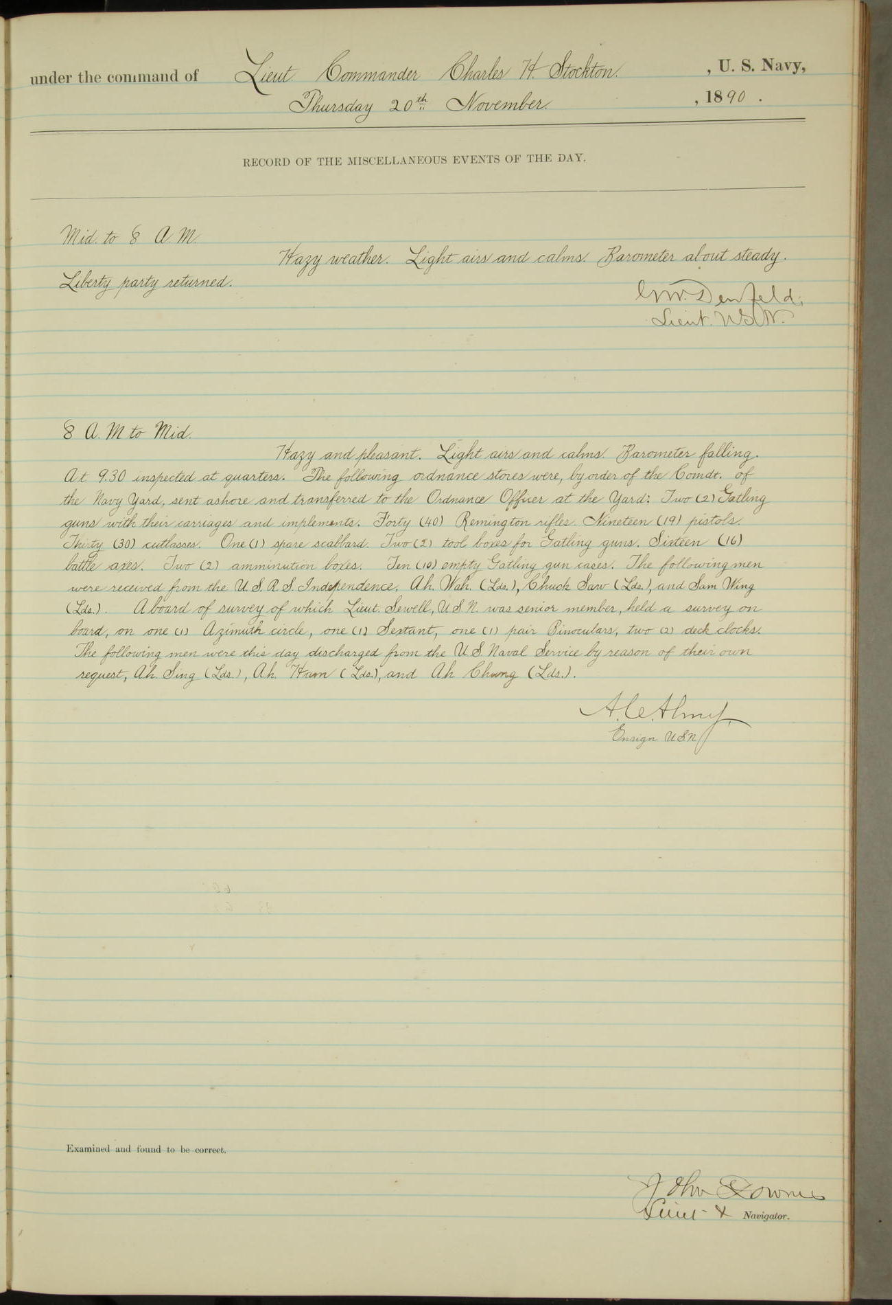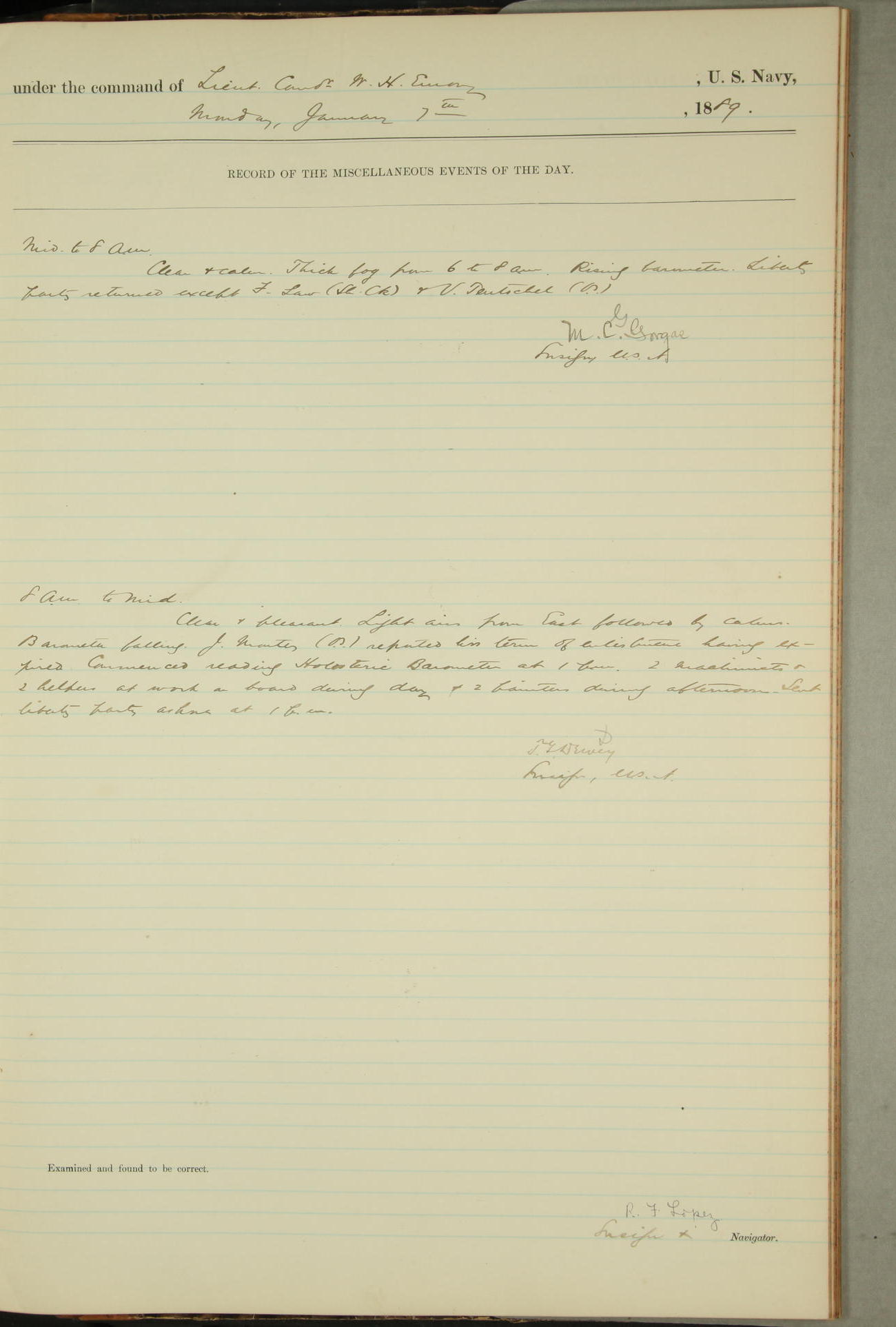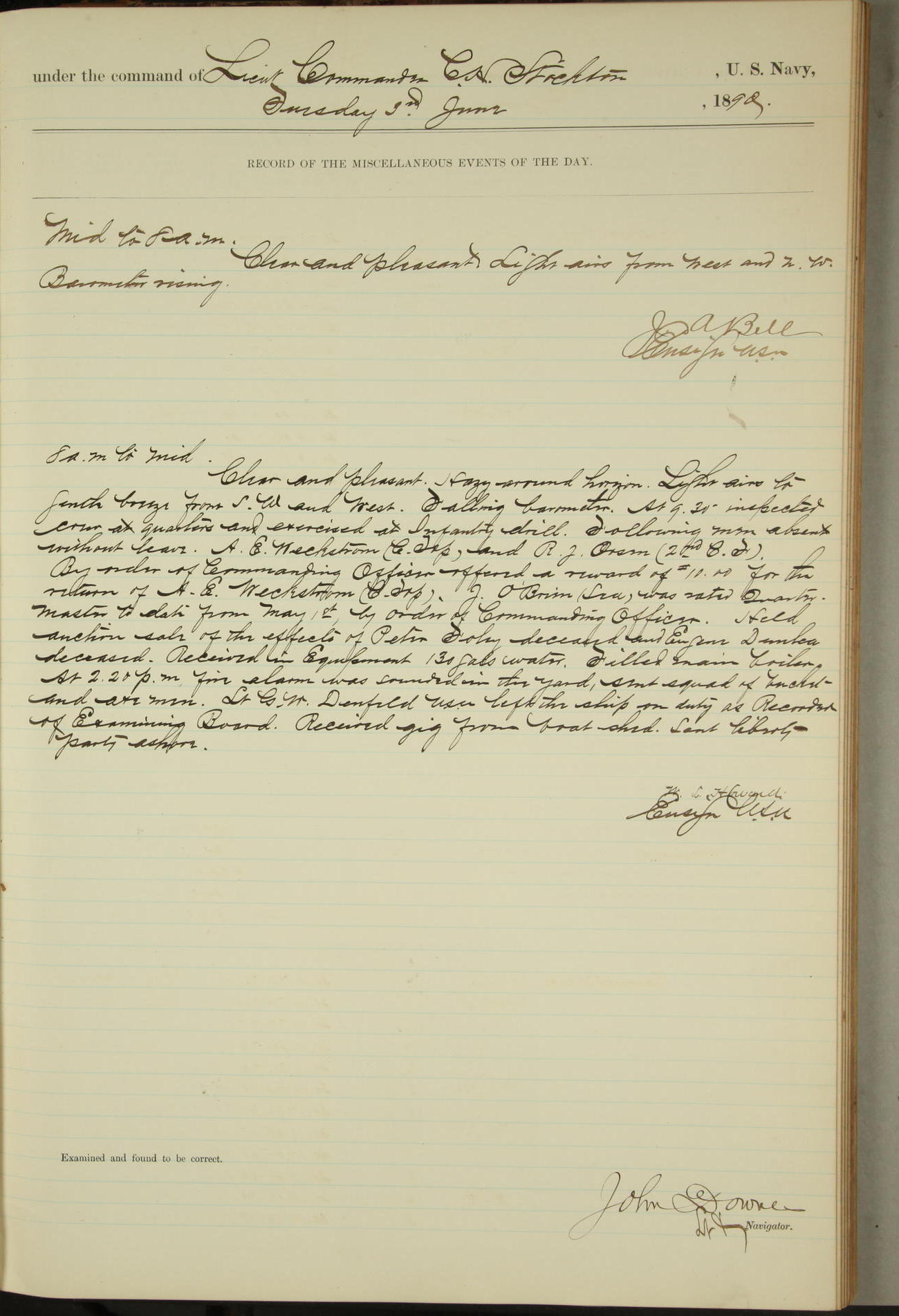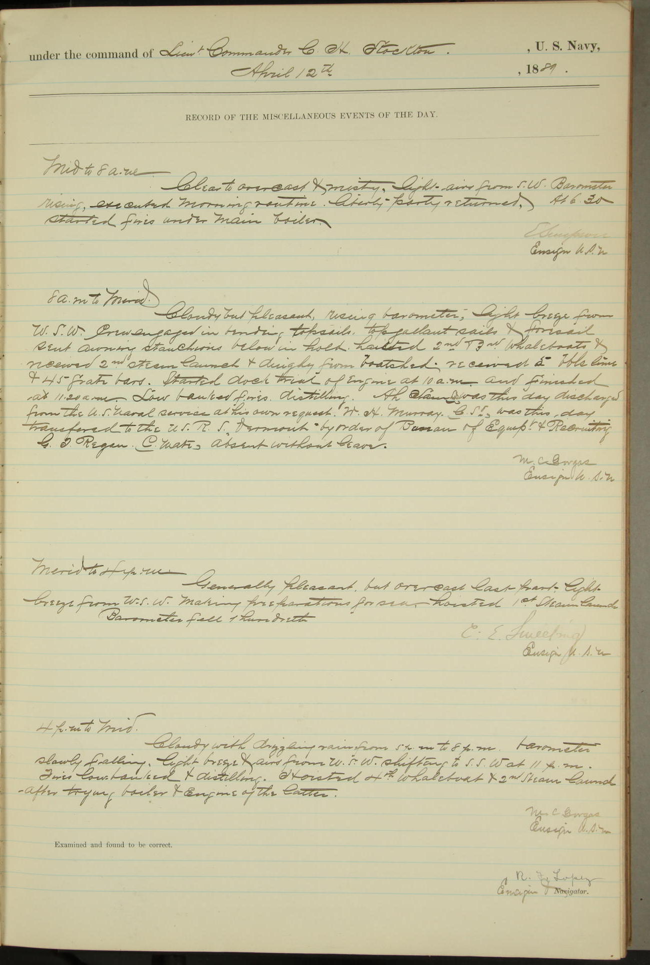 JA Dearborn - At 10am a Summary Court composed of Ensigns Simpson, Gorgas & Dewey as members with Asst Paymaster Lovell as Recorder convened for the tial of JA Dearborn (CH). The court adjourned at 11.20 to await the action of the Comd'g Officer.