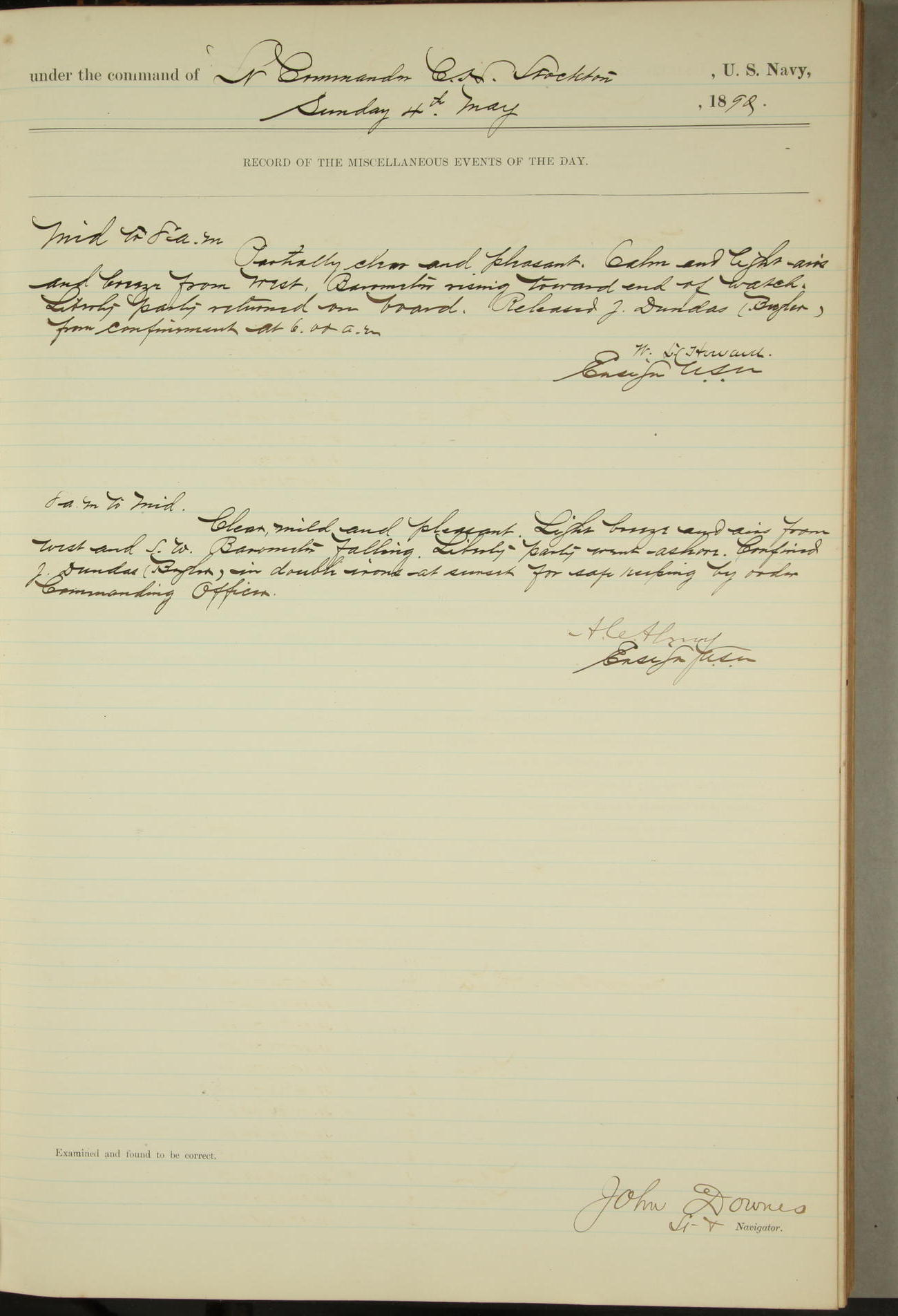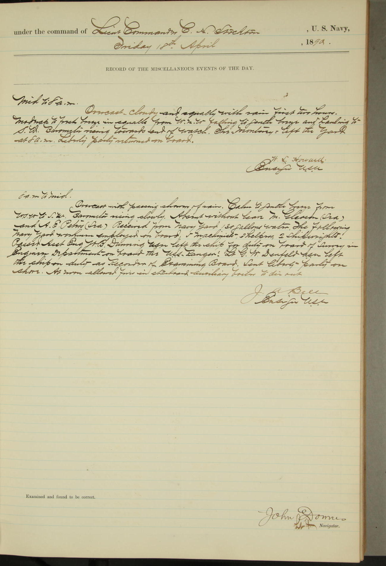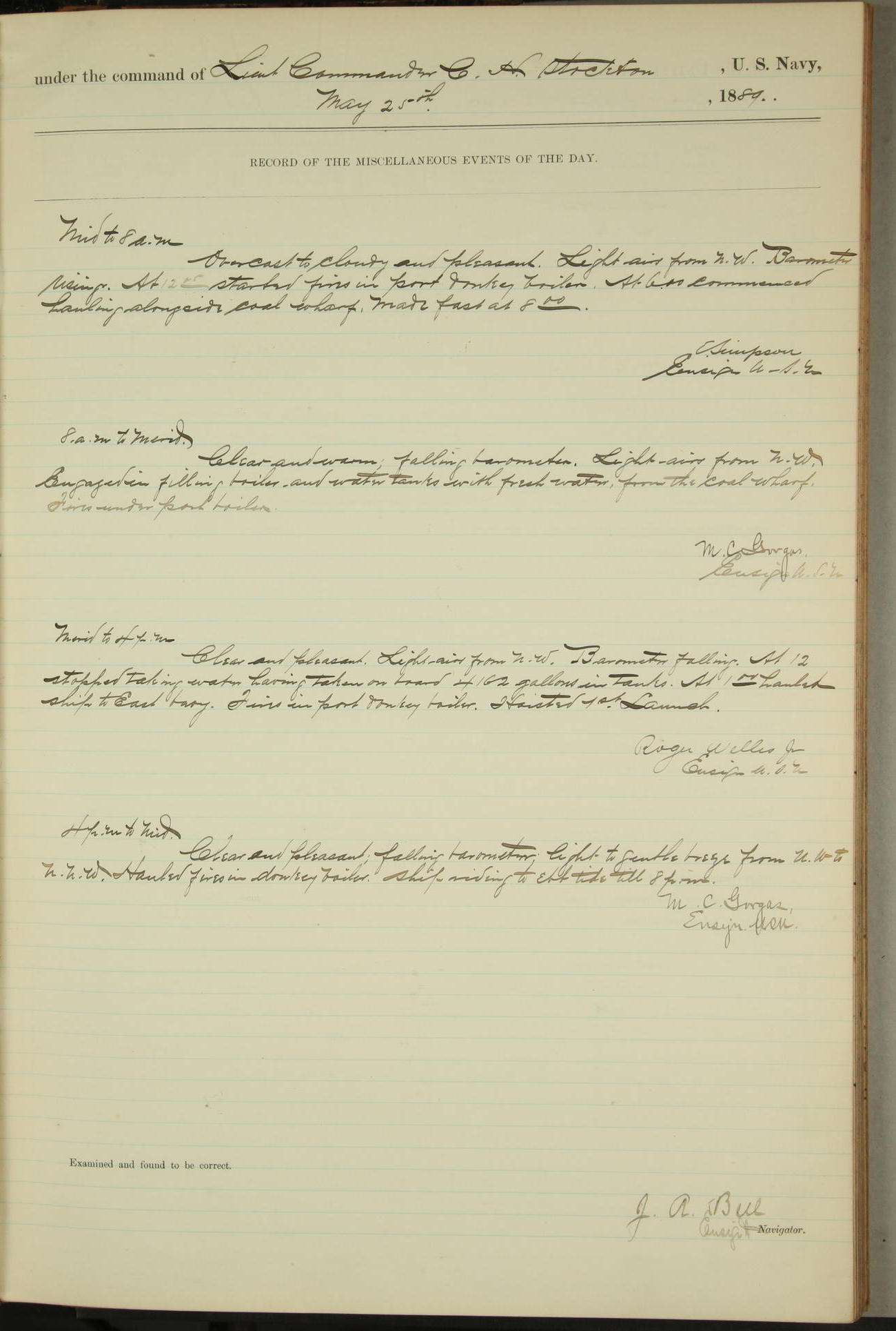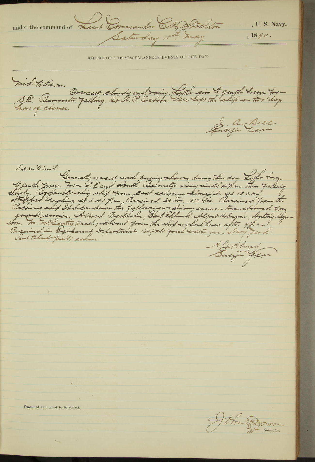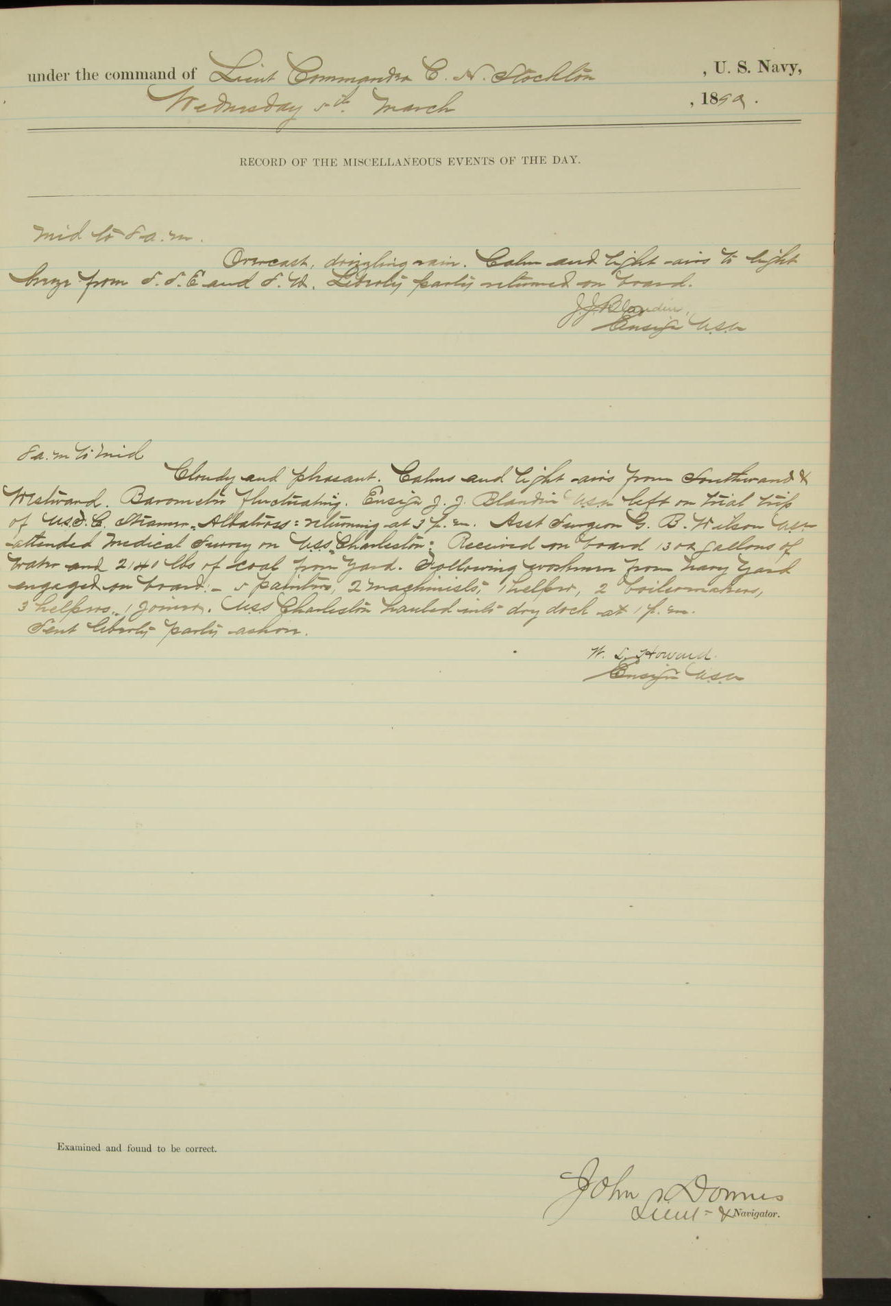 JA Dearborn - At 10am a Summary Court composed of Ensigns Simpson, Gorgas & Dewey as members with Asst Paymaster Lovell as Recorder convened for the tial of JA Dearborn (CH). The court adjourned at 11.20 to await the action of the Comd'g Officer.