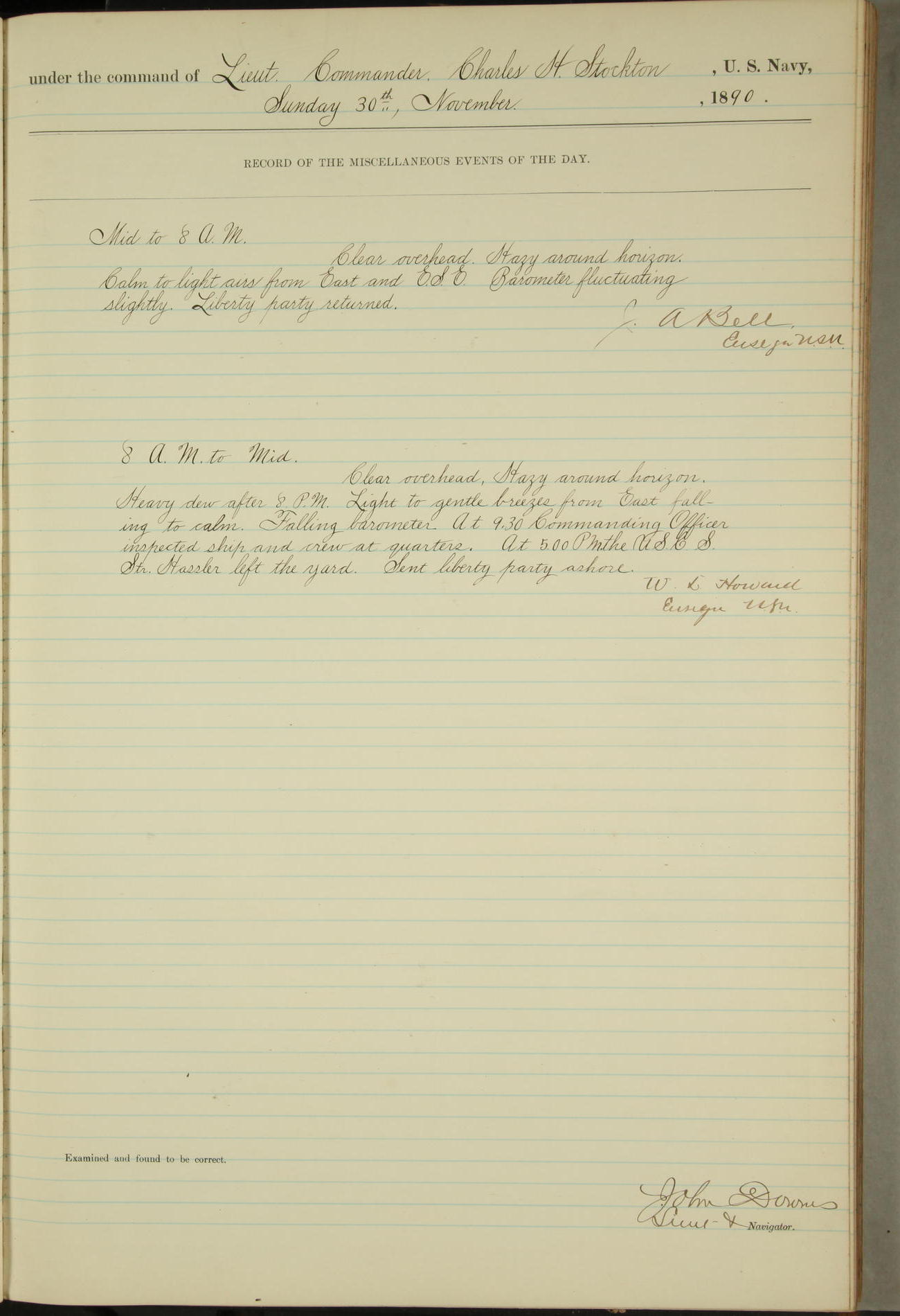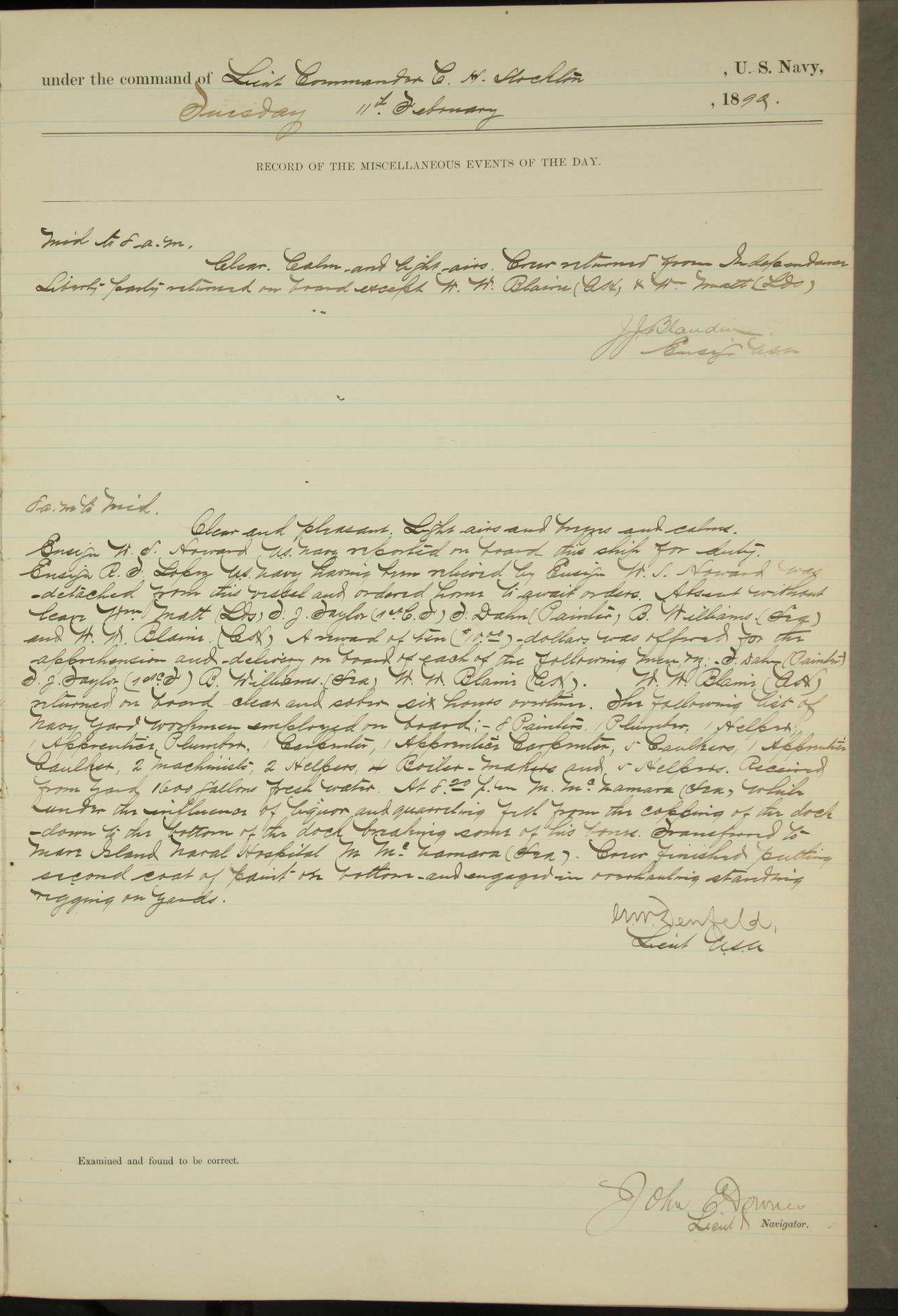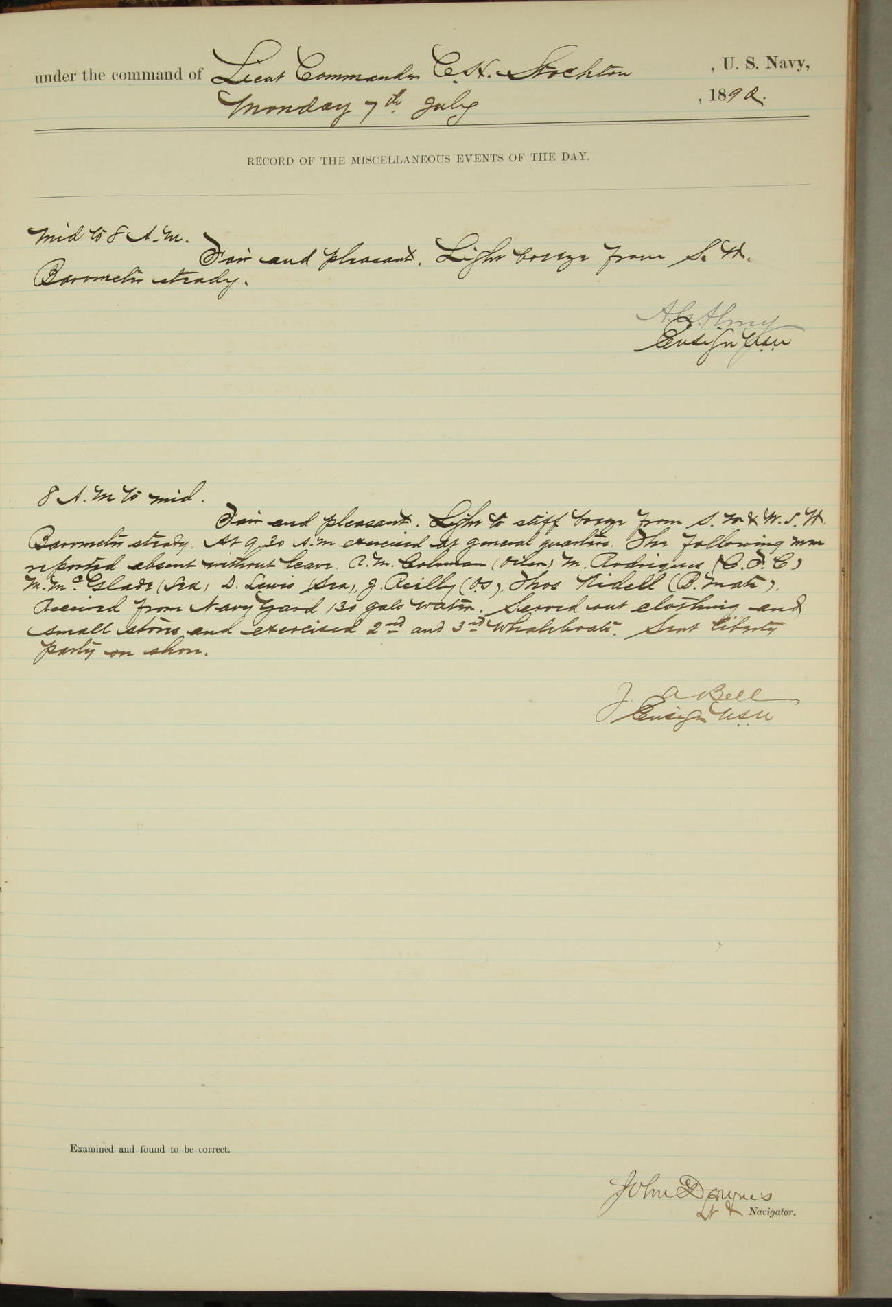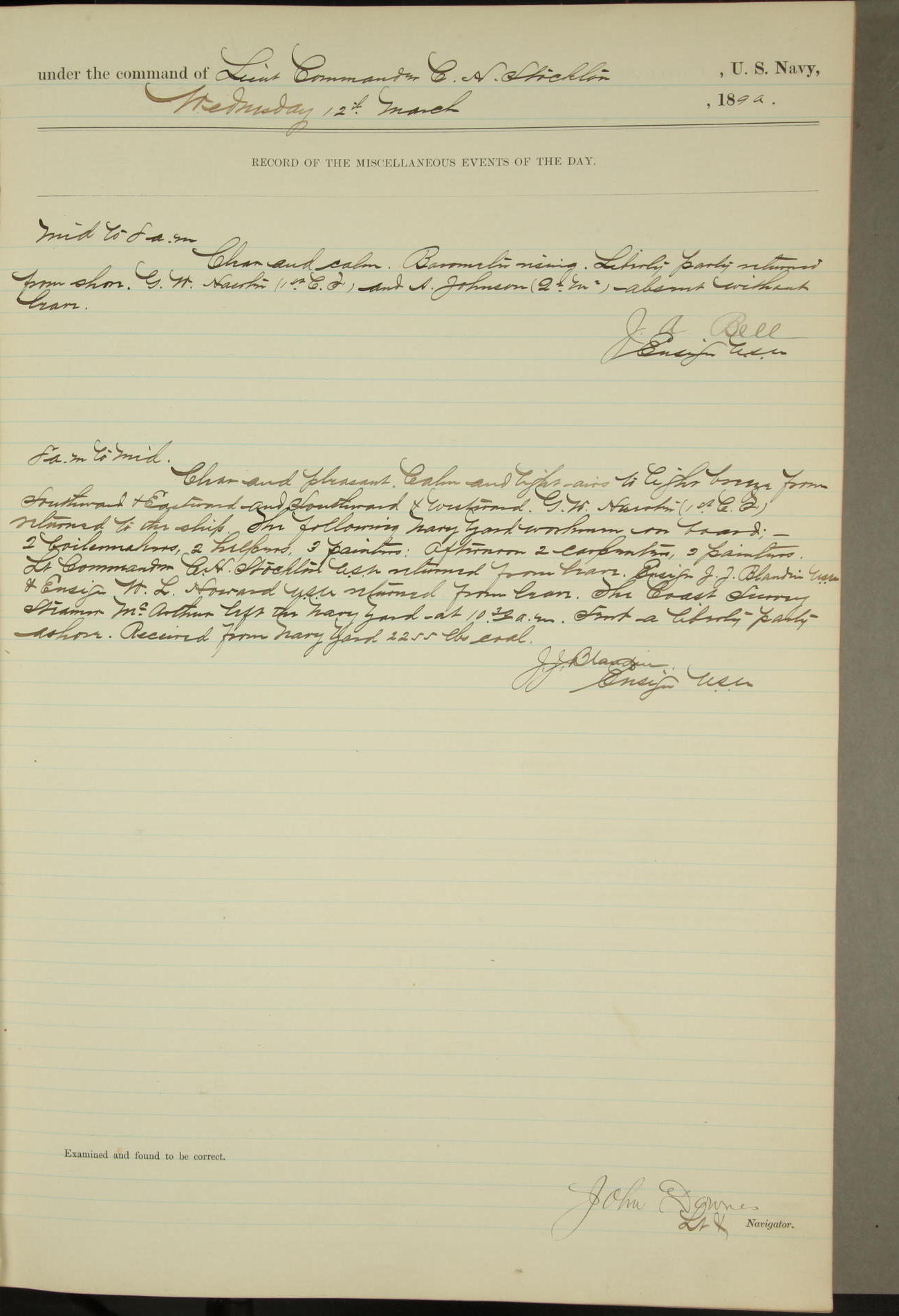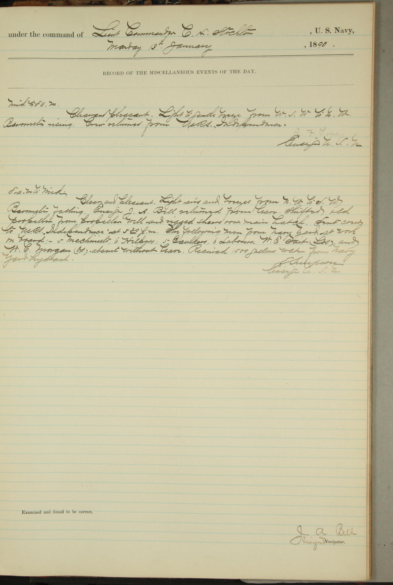 JA Dearborn - At 10am a Summary Court composed of Ensigns Simpson, Gorgas & Dewey as members with Asst Paymaster Lovell as Recorder convened for the tial of JA Dearborn (CH). The court adjourned at 11.20 to await the action of the Comd'g Officer.