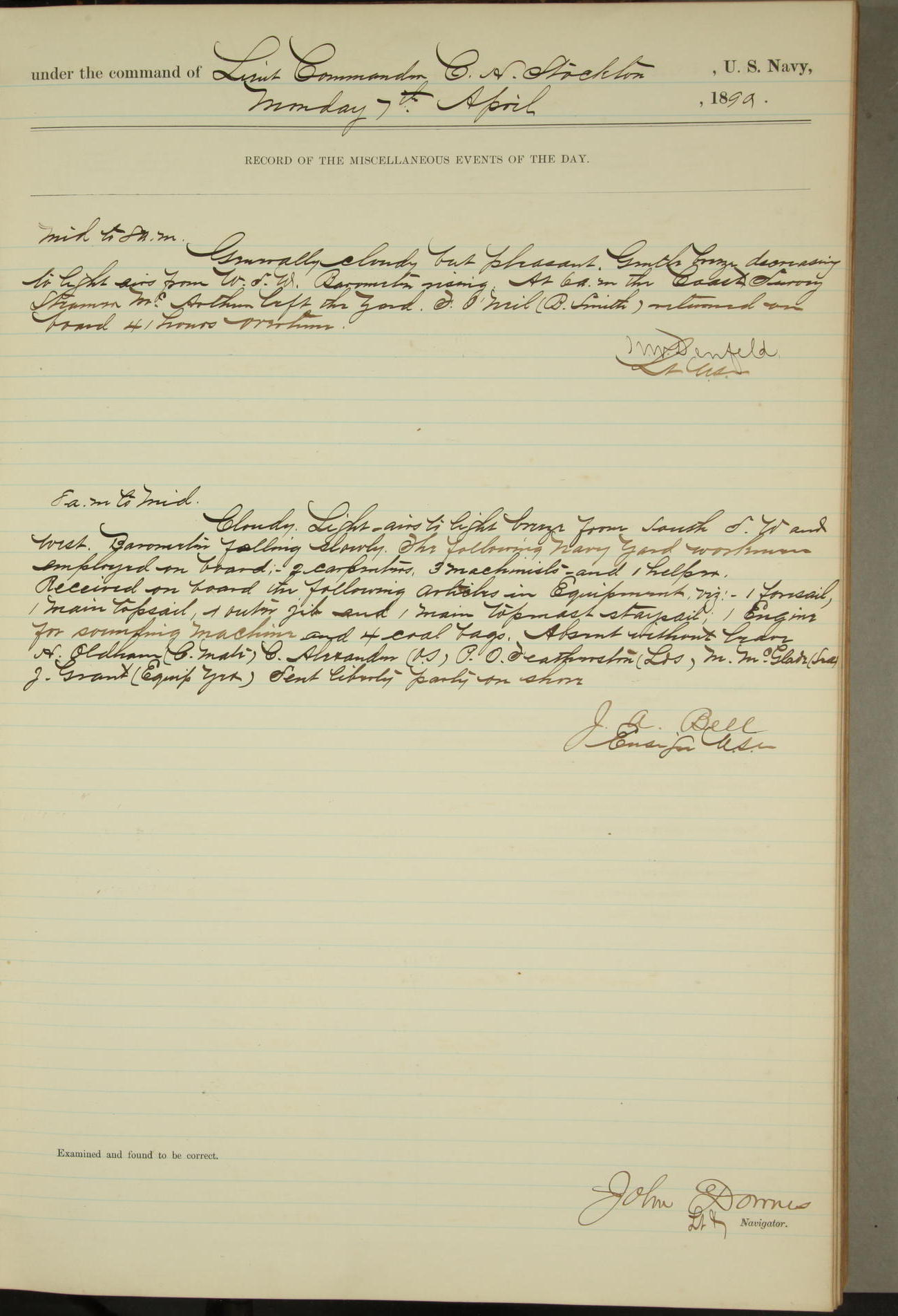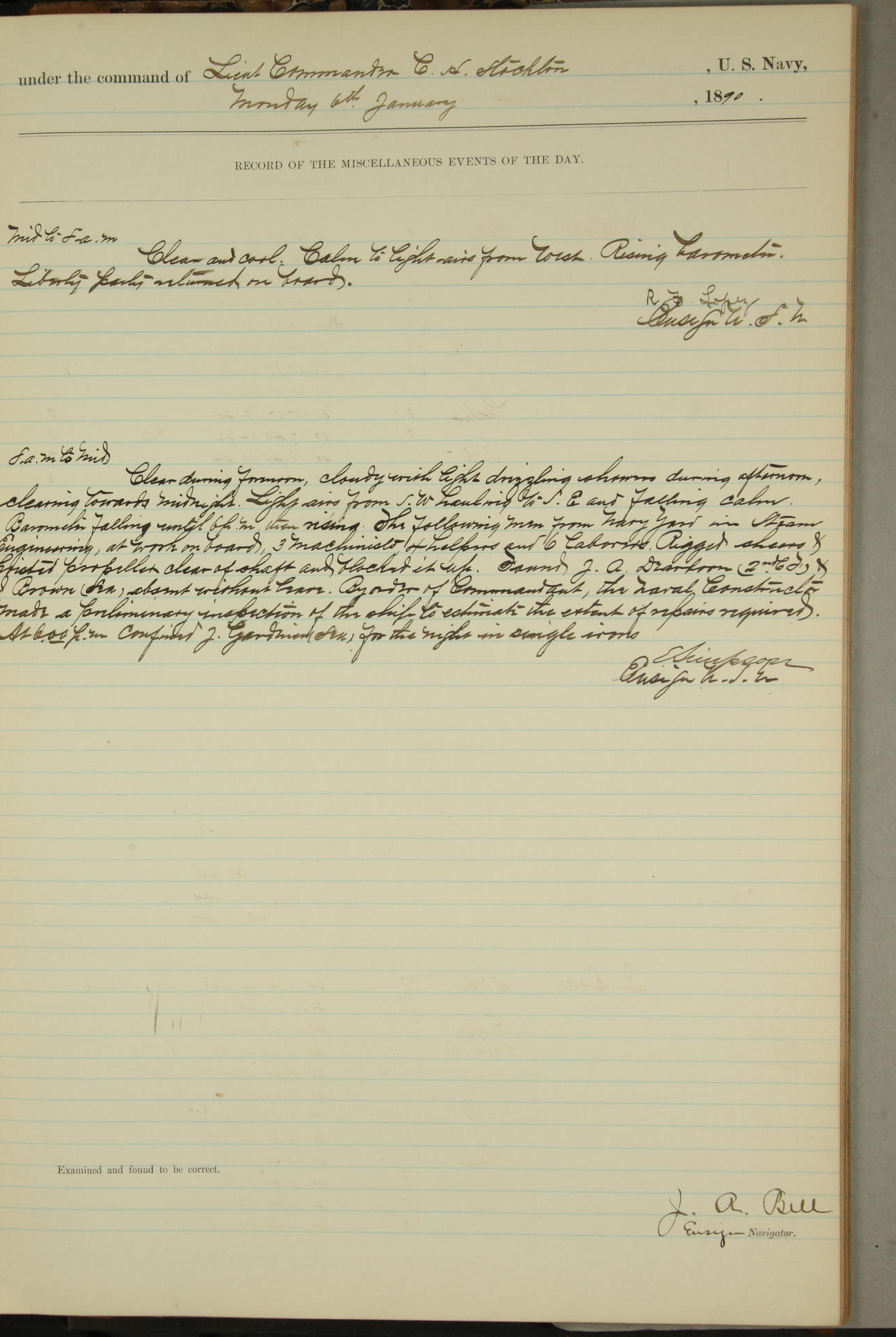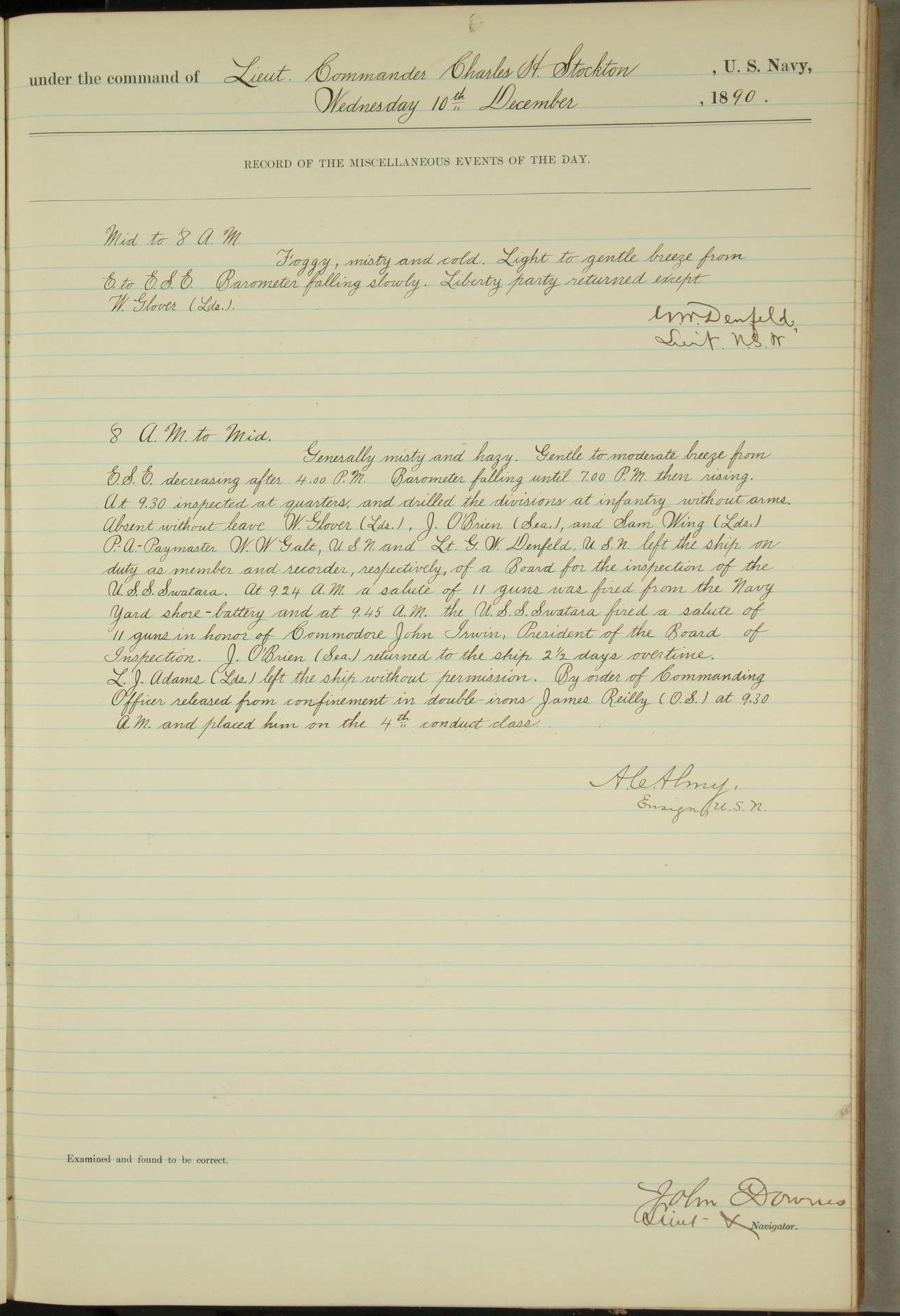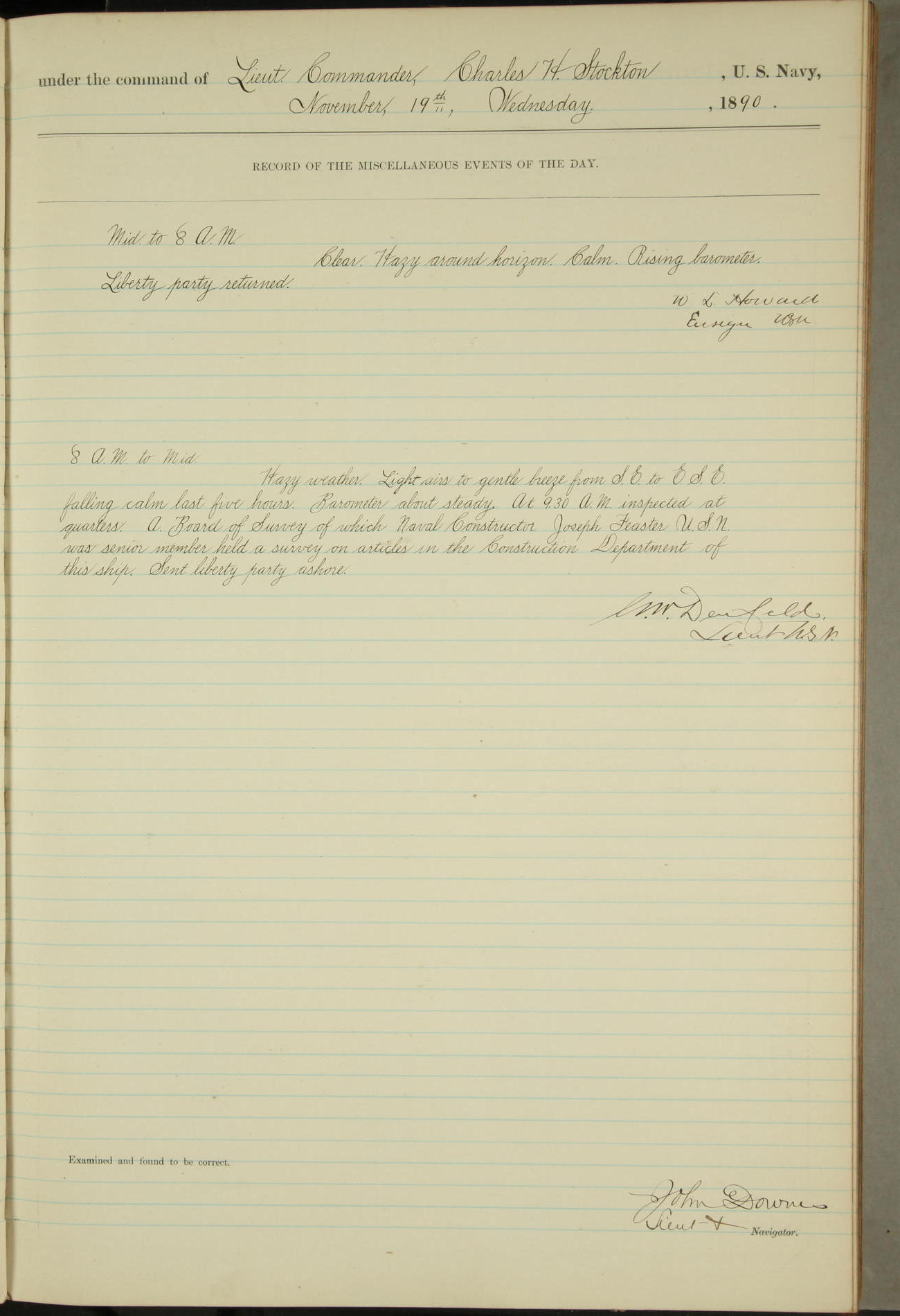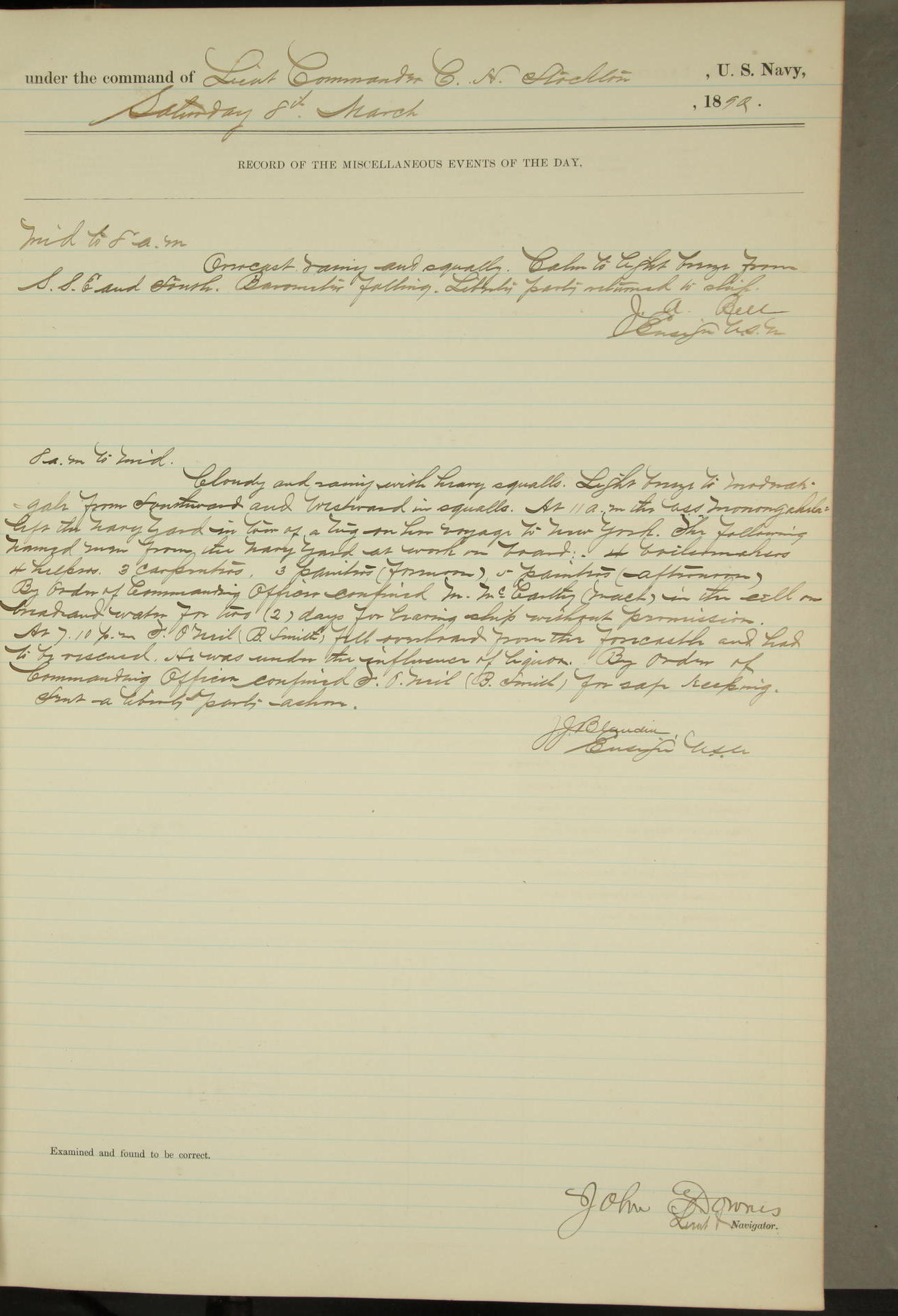 JA Dearborn - At 10am a Summary Court composed of Ensigns Simpson, Gorgas & Dewey as members with Asst Paymaster Lovell as Recorder convened for the tial of JA Dearborn (CH). The court adjourned at 11.20 to await the action of the Comd'g Officer.