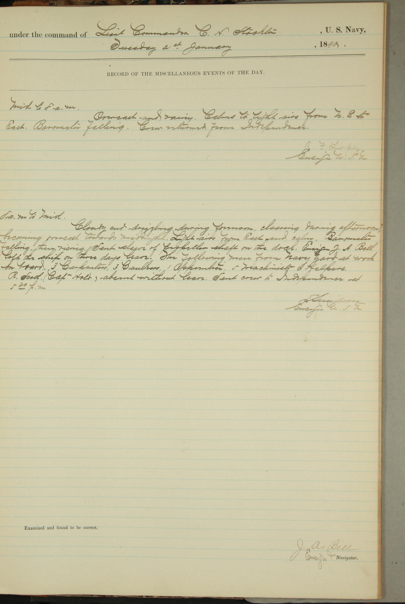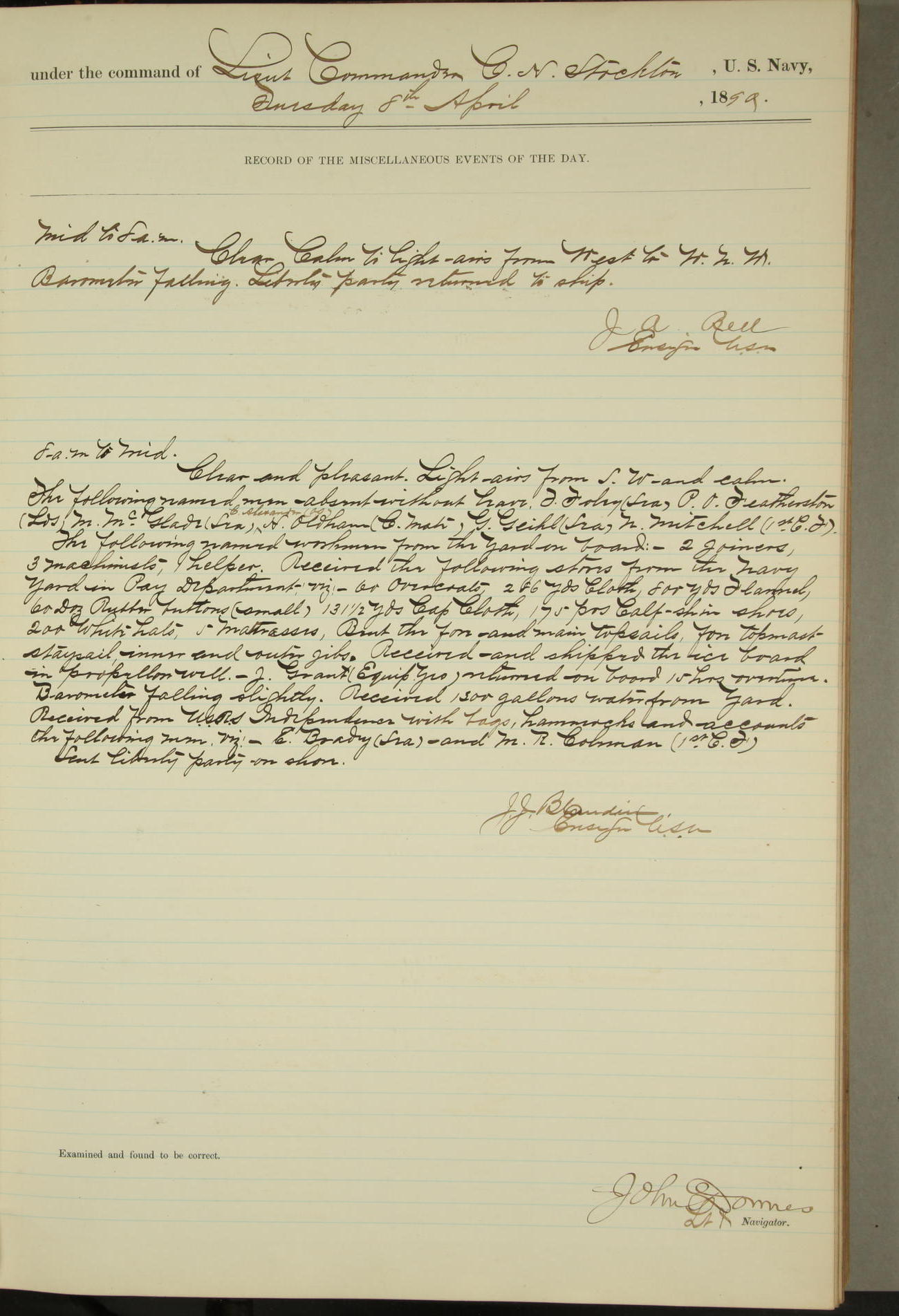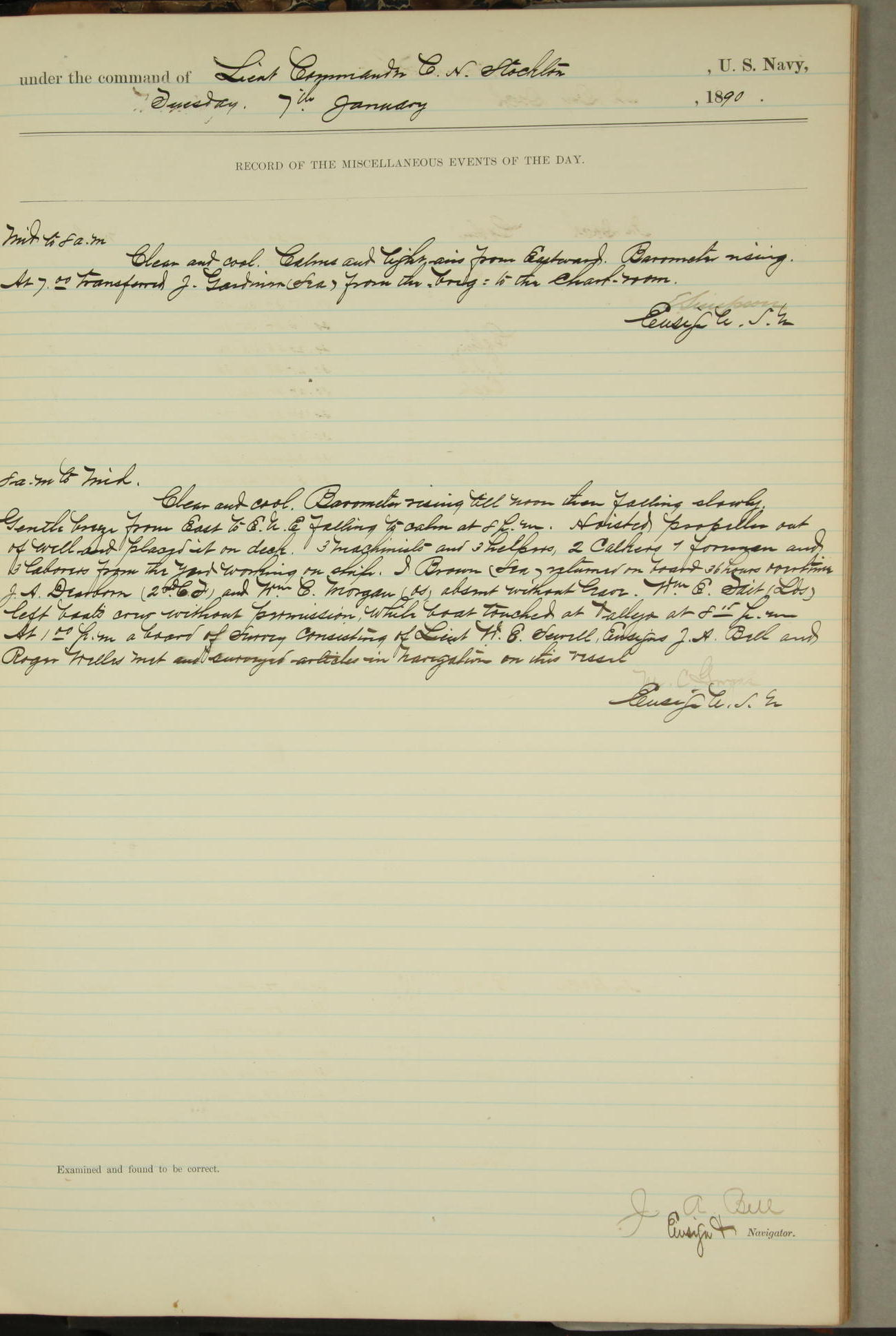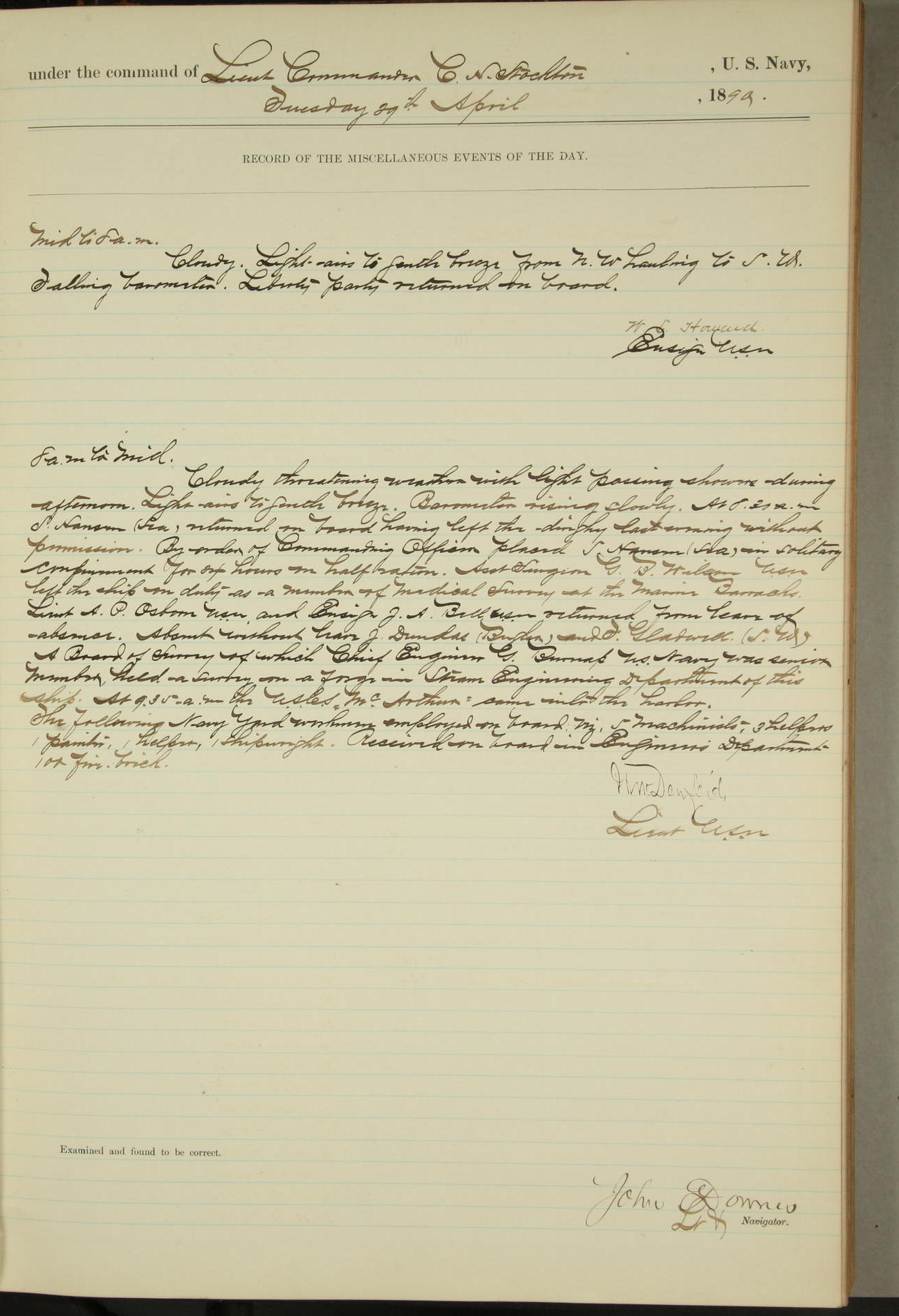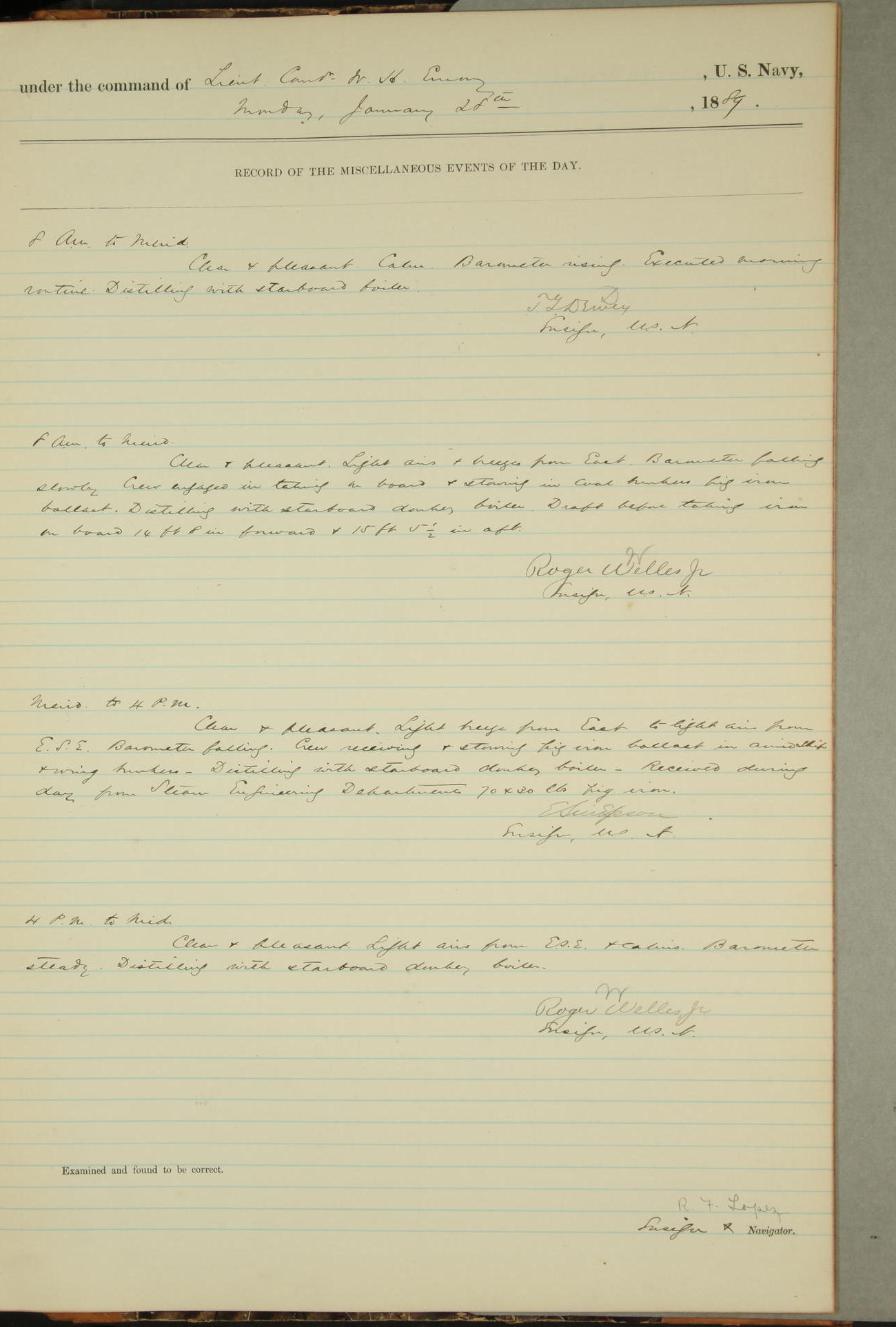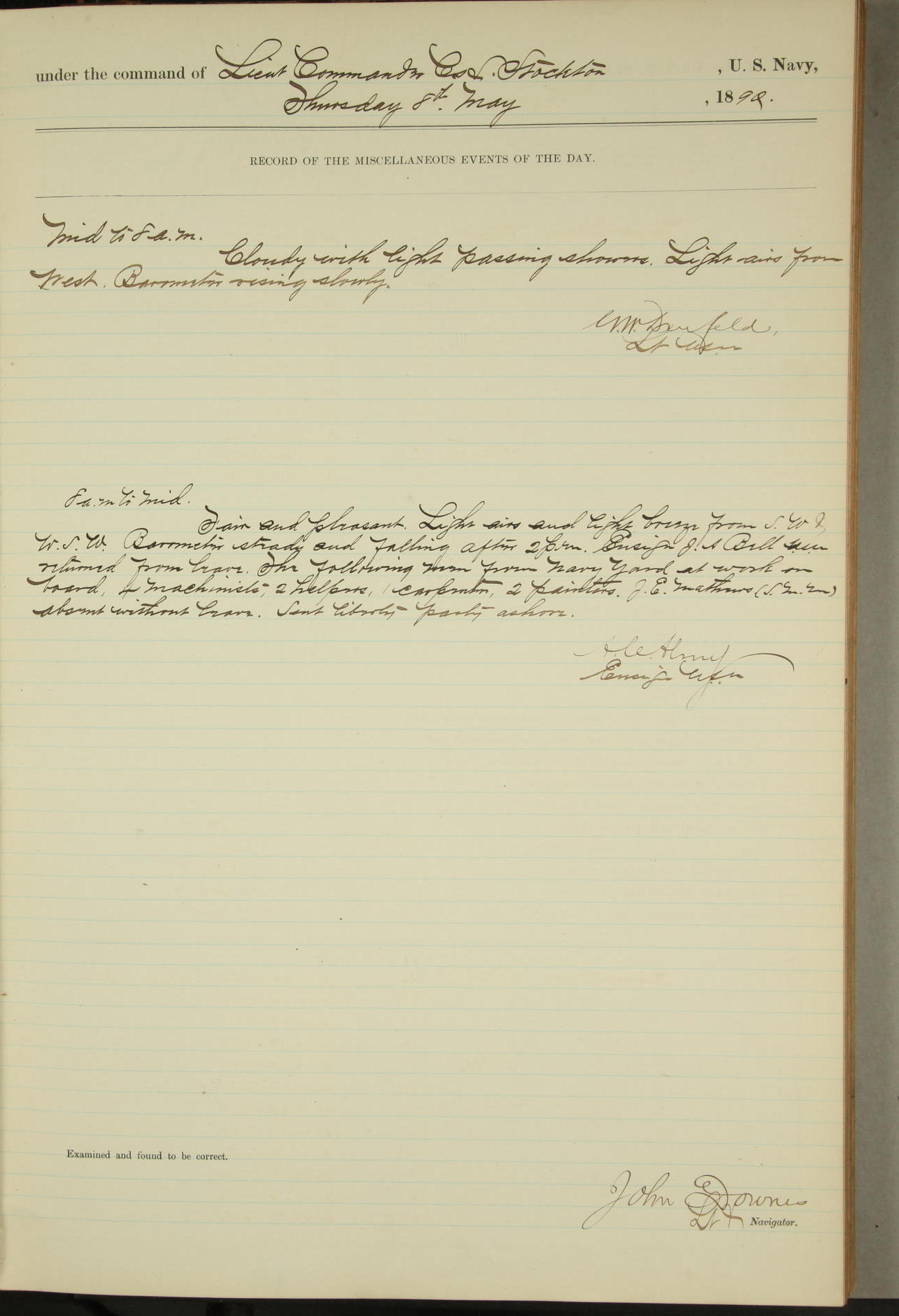 JA Dearborn - At 10am a Summary Court composed of Ensigns Simpson, Gorgas & Dewey as members with Asst Paymaster Lovell as Recorder convened for the tial of JA Dearborn (CH). The court adjourned at 11.20 to await the action of the Comd'g Officer.