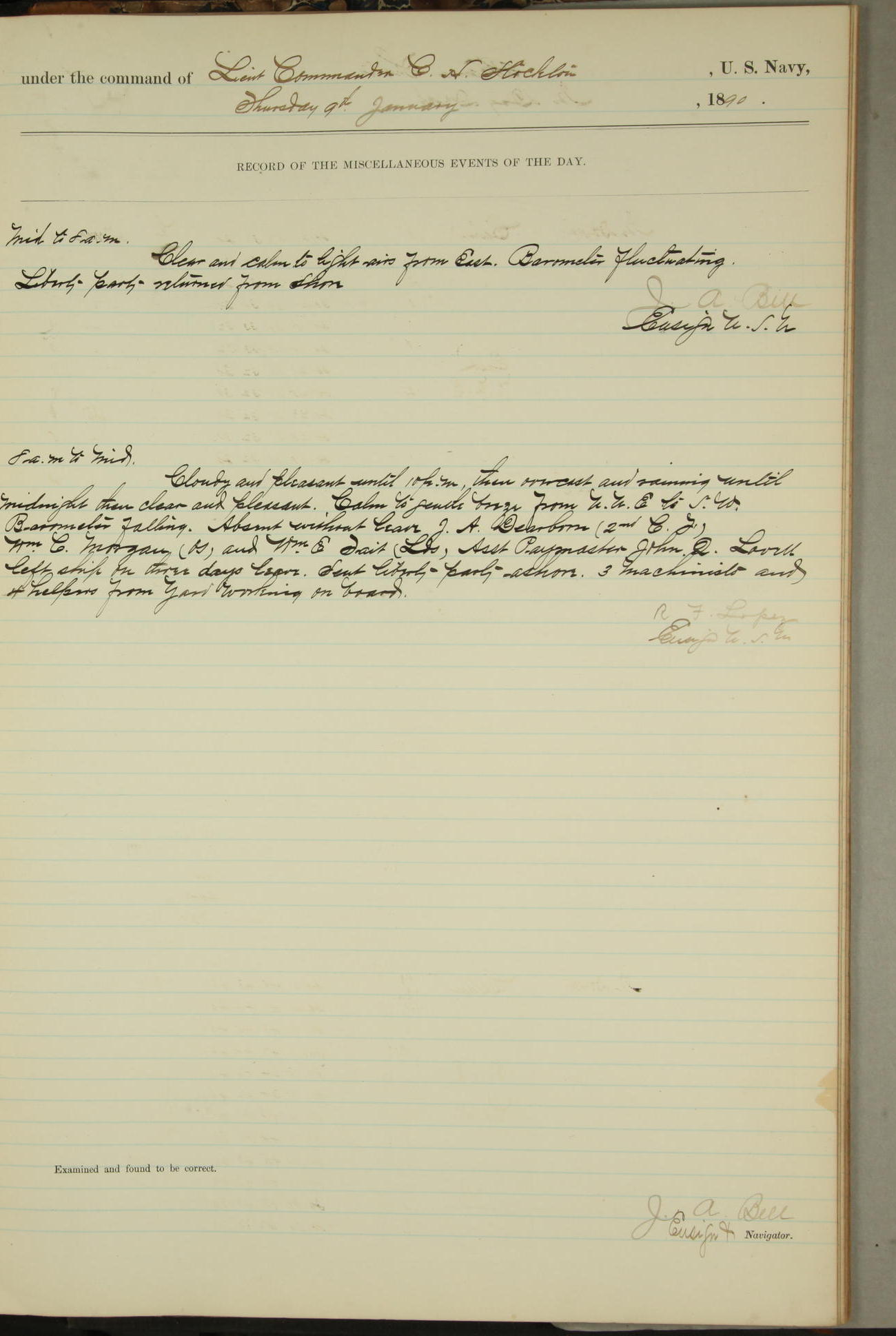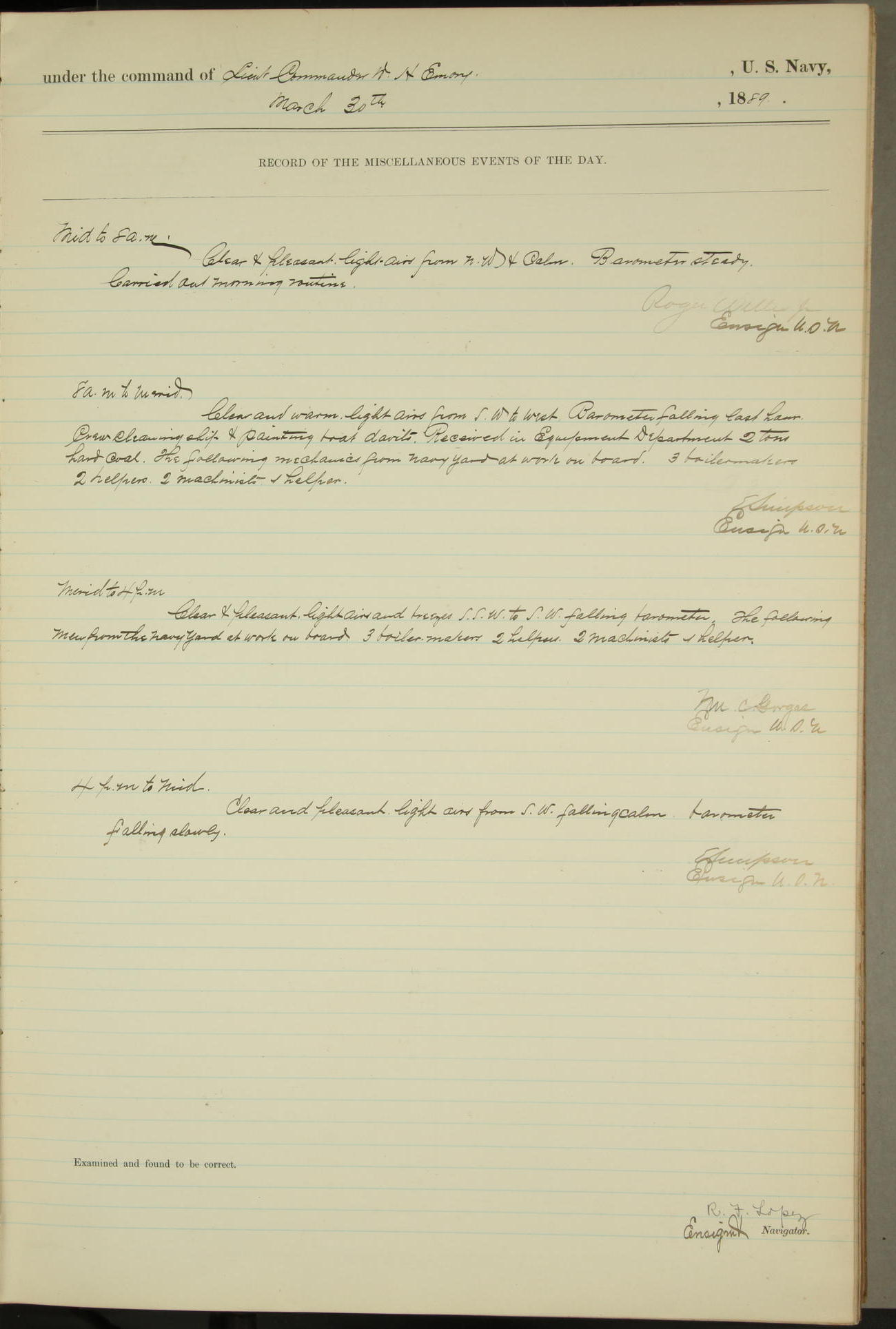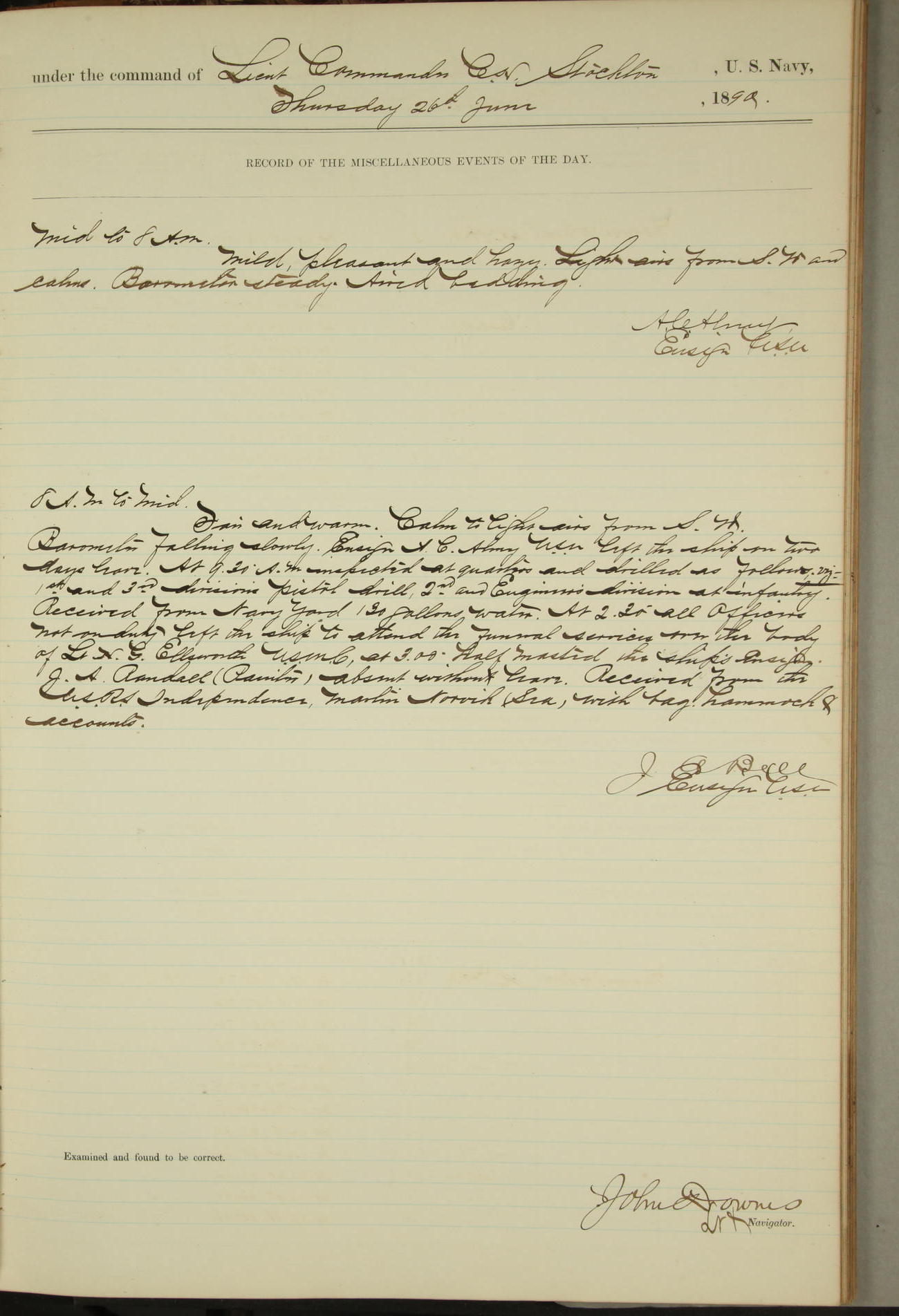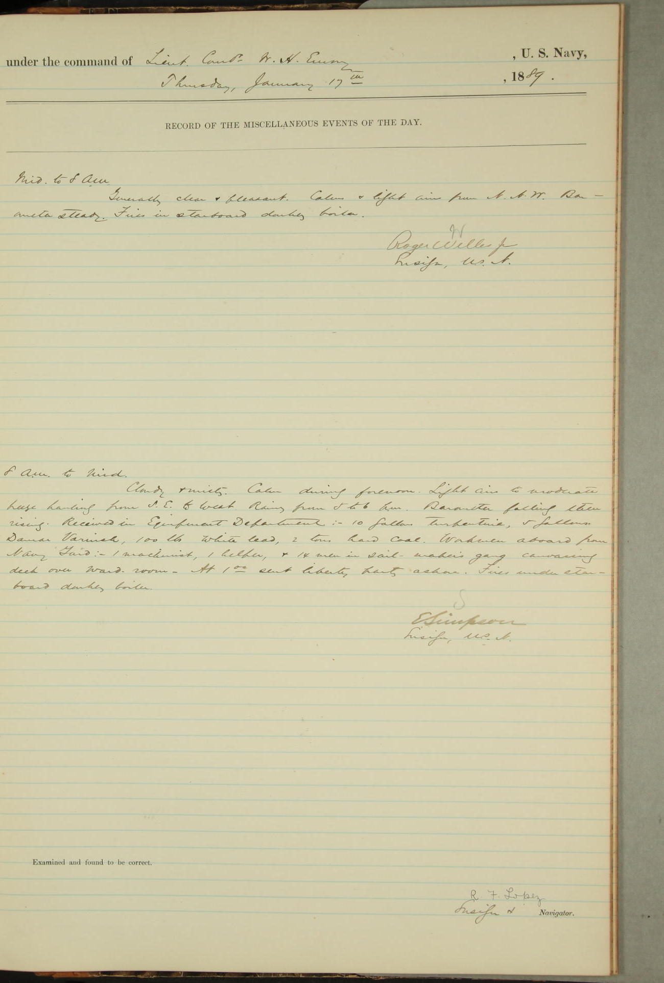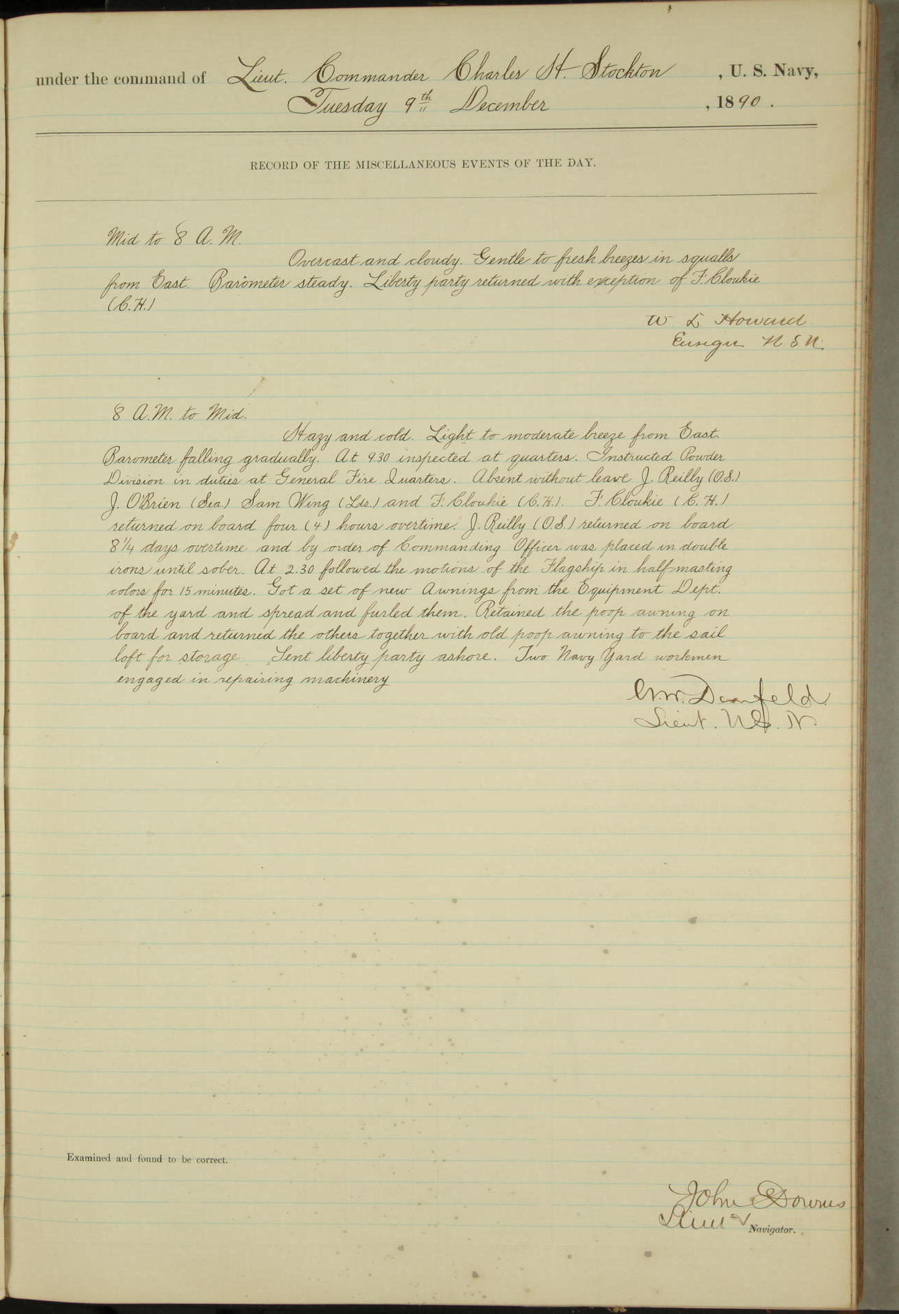 JA Dearborn - At 10am a Summary Court composed of Ensigns Simpson, Gorgas & Dewey as members with Asst Paymaster Lovell as Recorder convened for the tial of JA Dearborn (CH). The court adjourned at 11.20 to await the action of the Comd'g Officer.