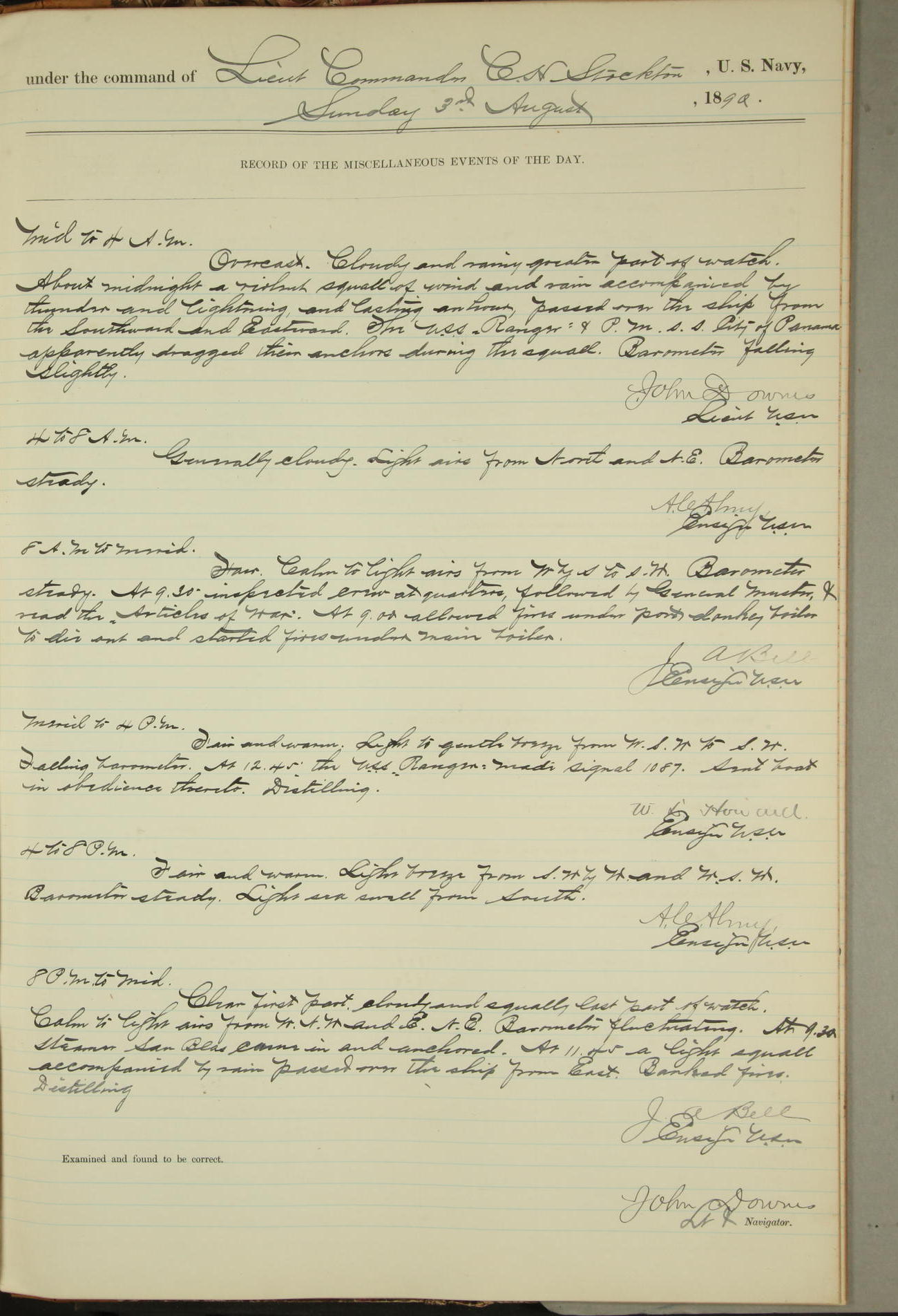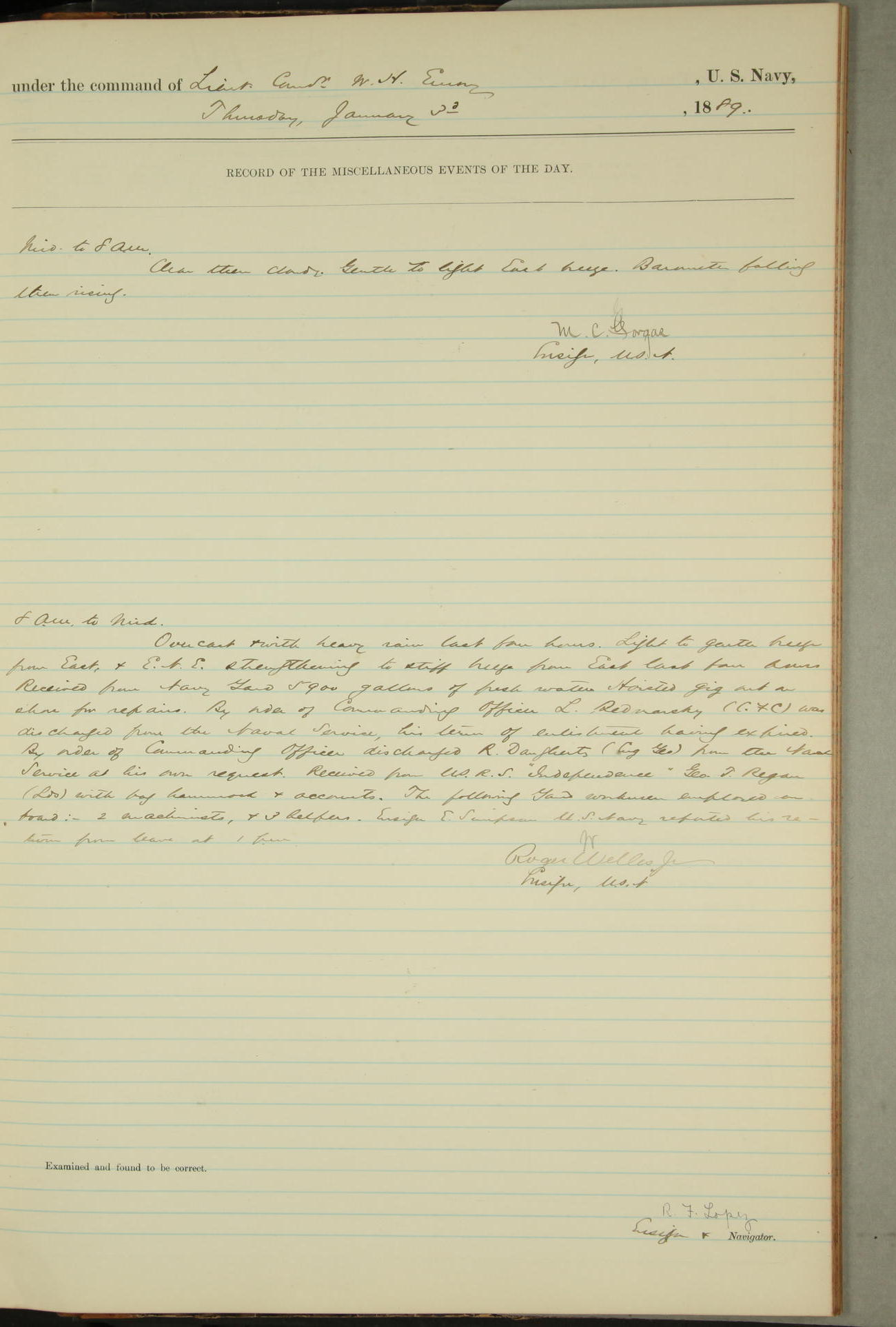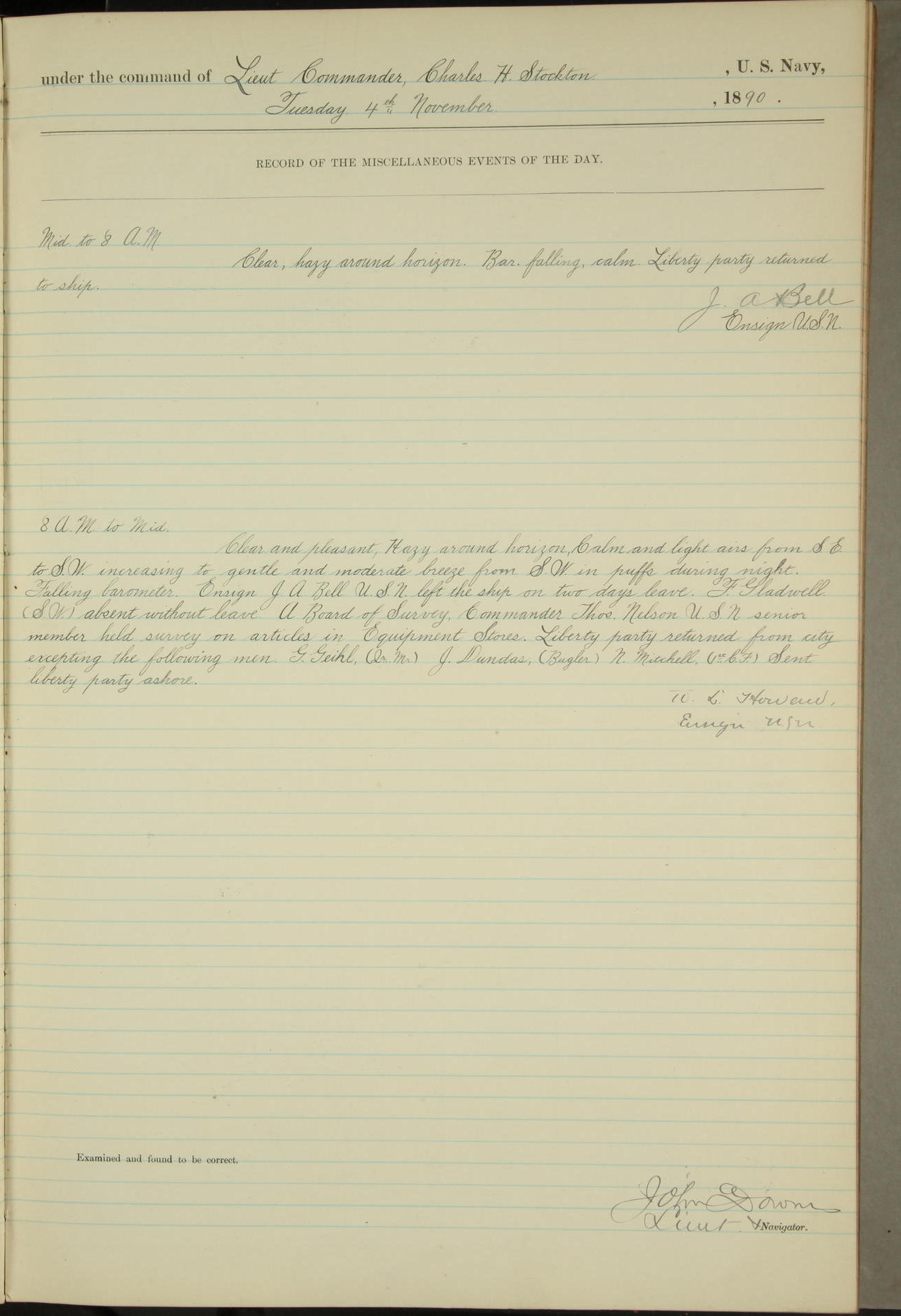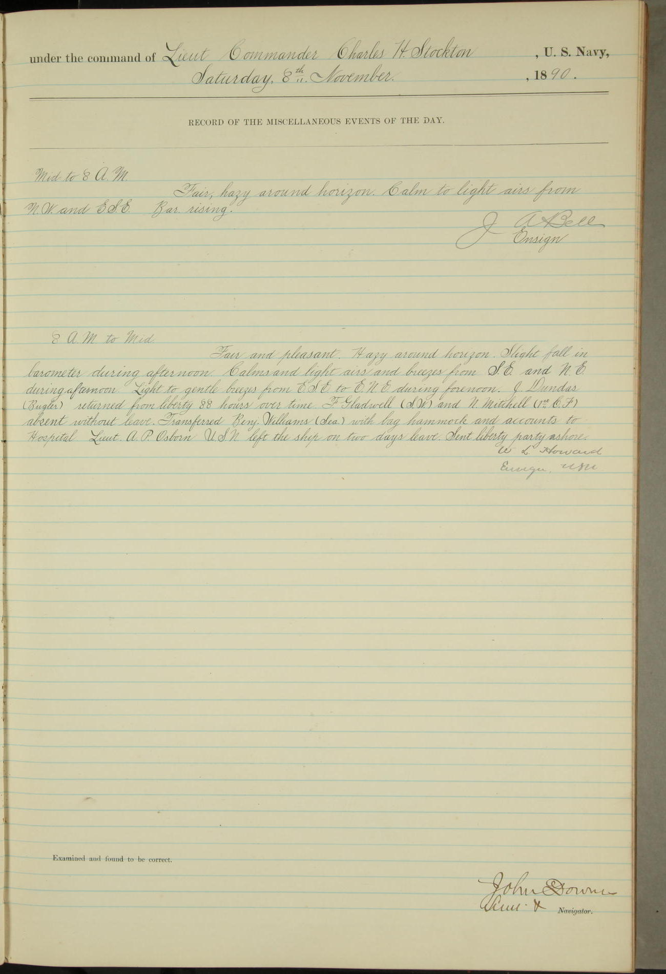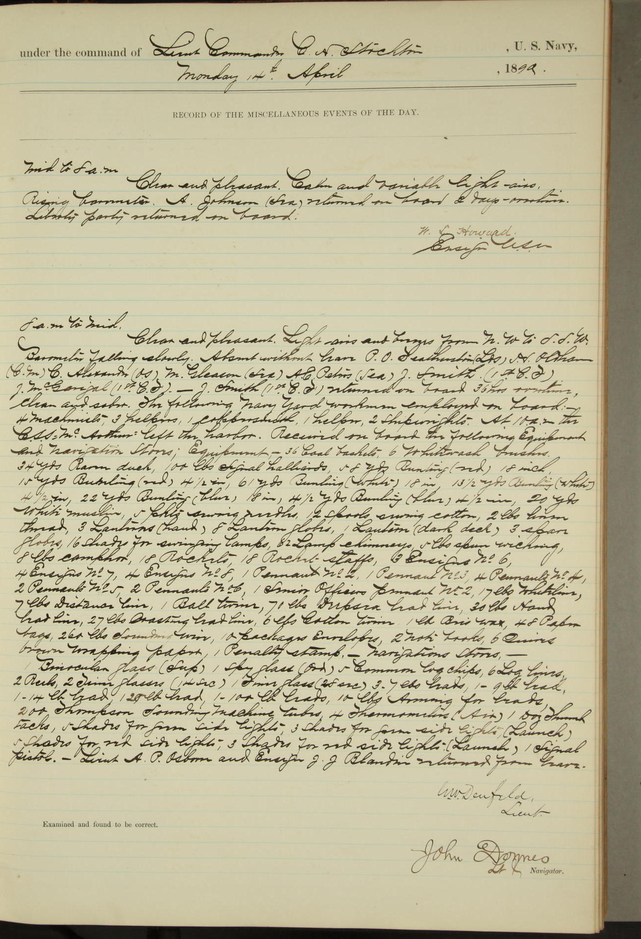 JA Dearborn - At 10am a Summary Court composed of Ensigns Simpson, Gorgas & Dewey as members with Asst Paymaster Lovell as Recorder convened for the tial of JA Dearborn (CH). The court adjourned at 11.20 to await the action of the Comd'g Officer.