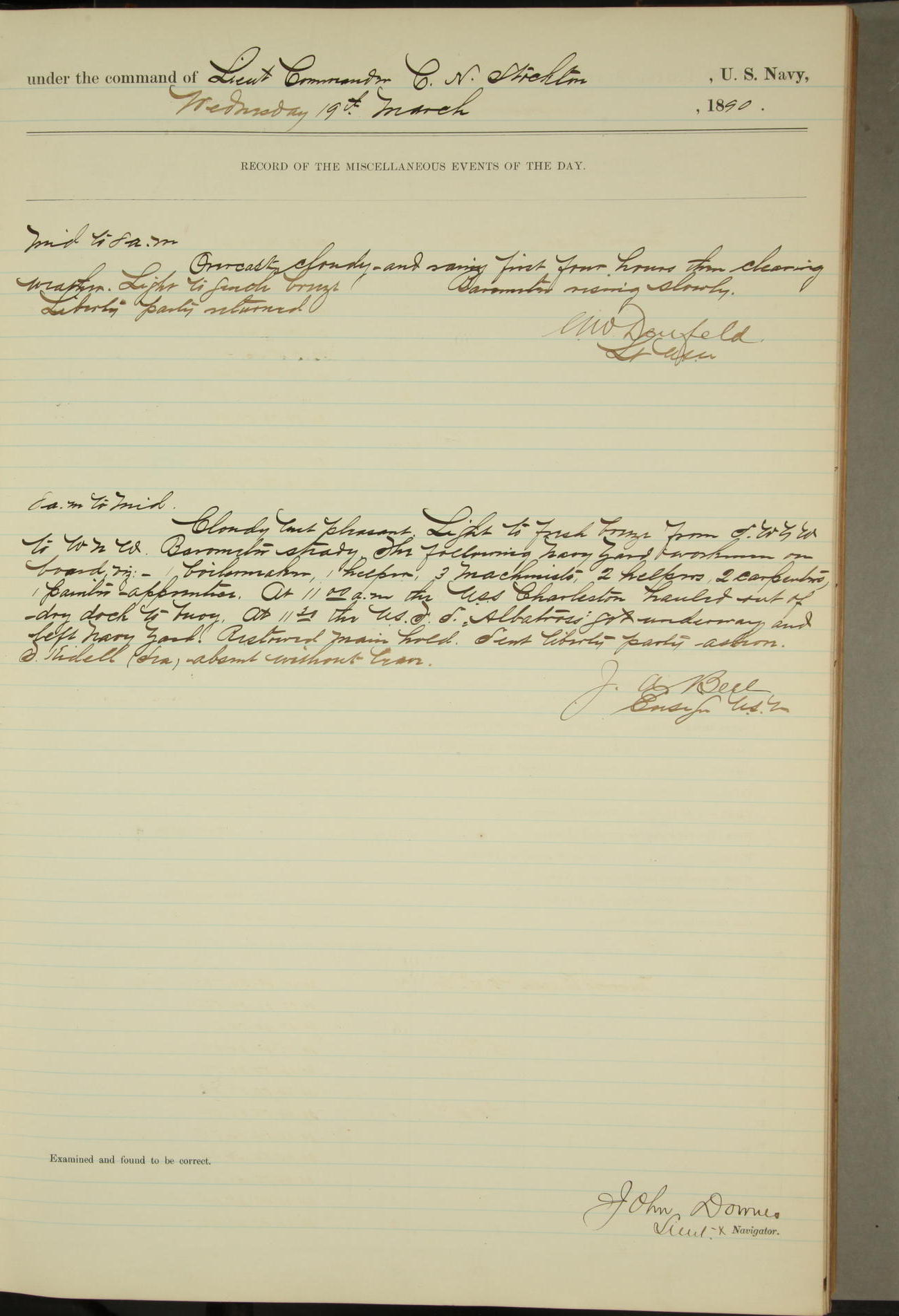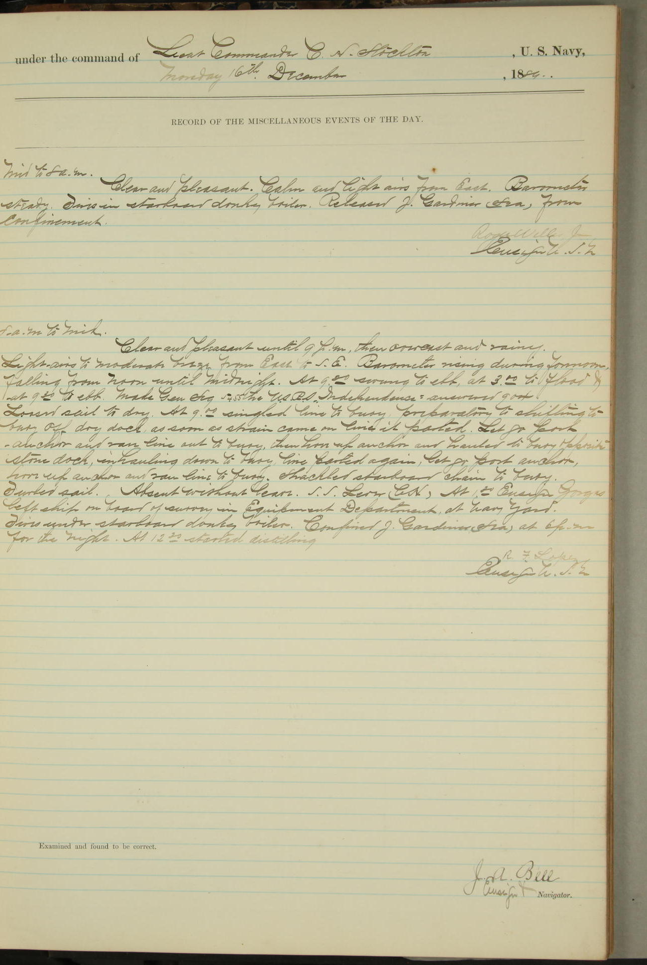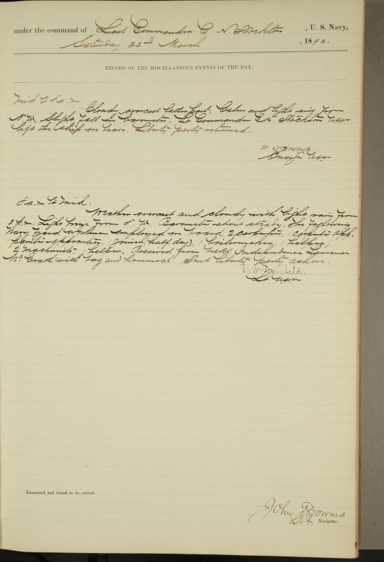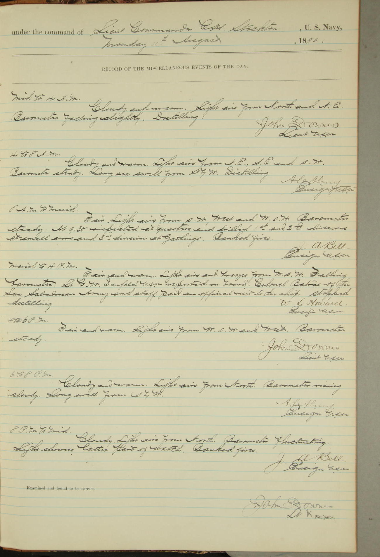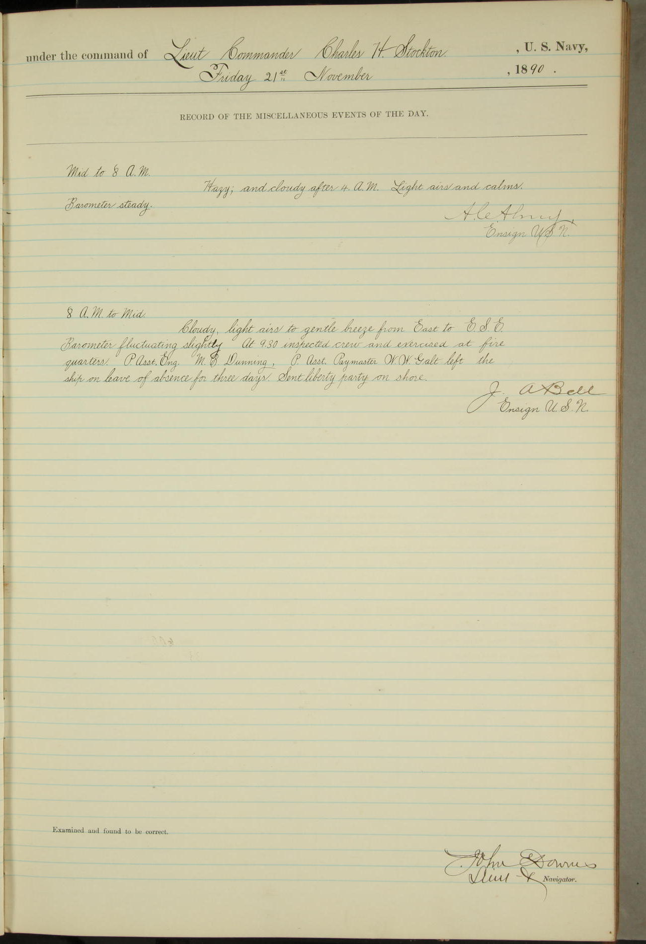 JA Dearborn - At 10am a Summary Court composed of Ensigns Simpson, Gorgas & Dewey as members with Asst Paymaster Lovell as Recorder convened for the tial of JA Dearborn (CH). The court adjourned at 11.20 to await the action of the Comd'g Officer.
