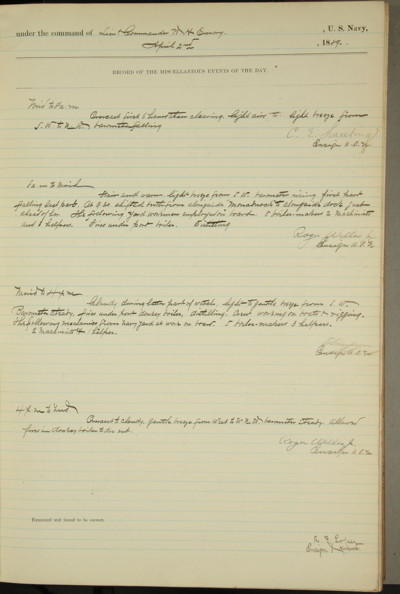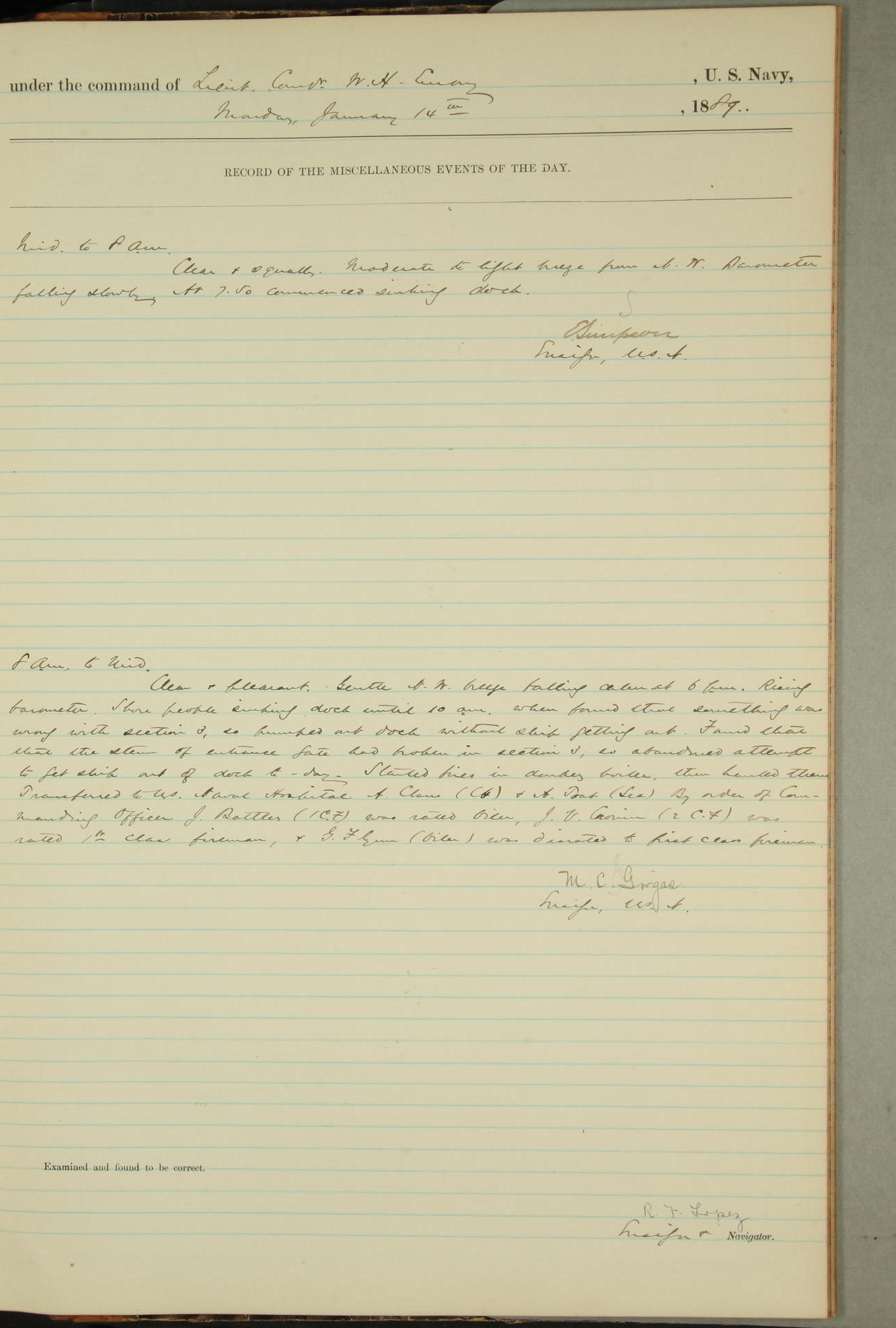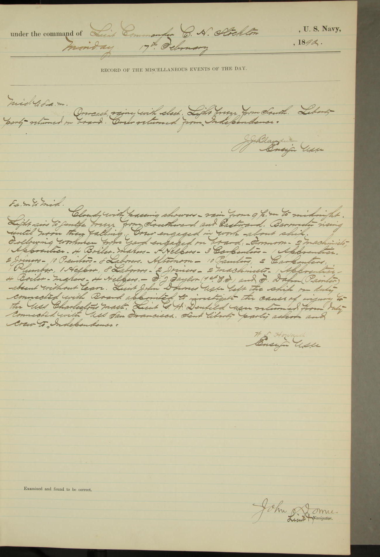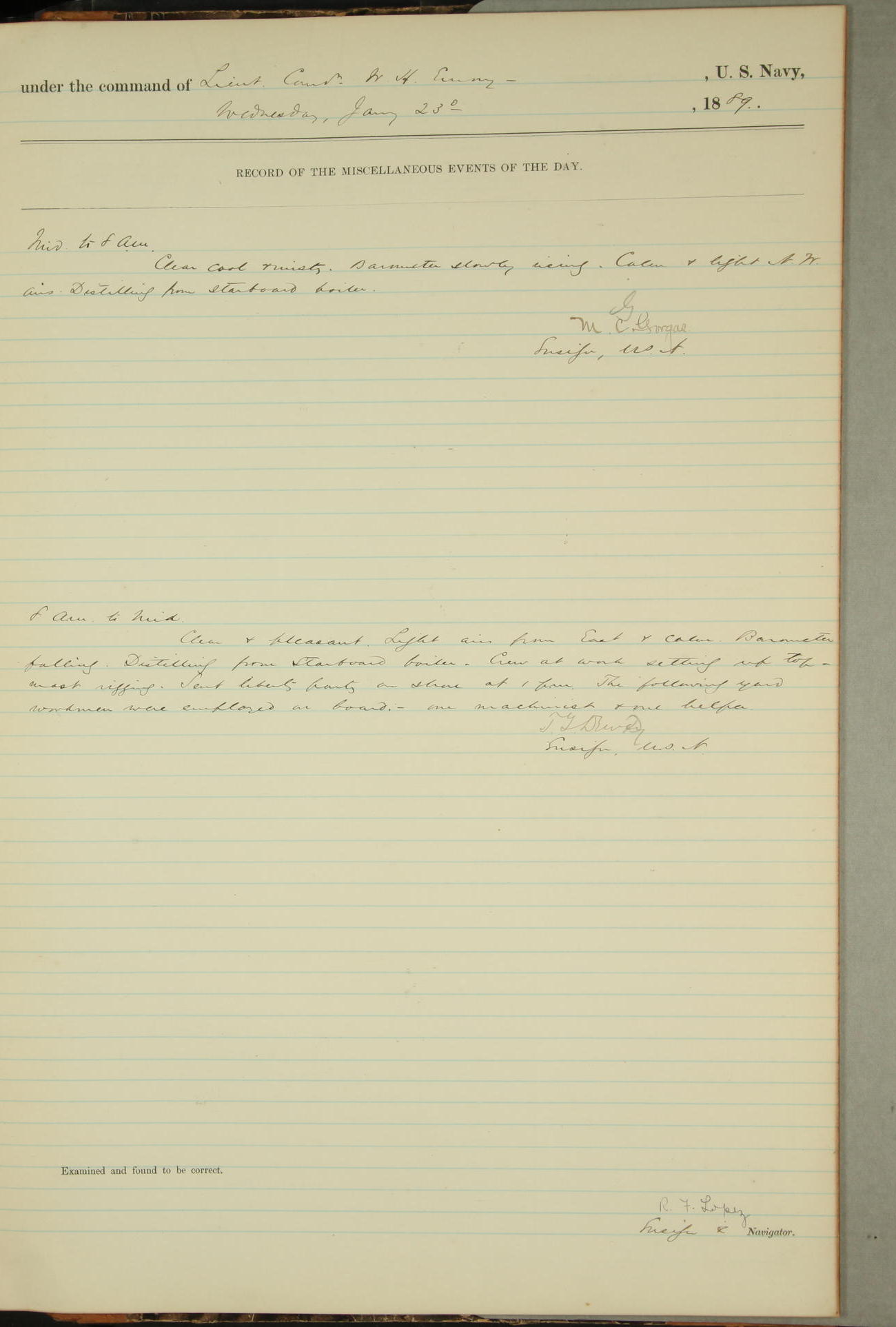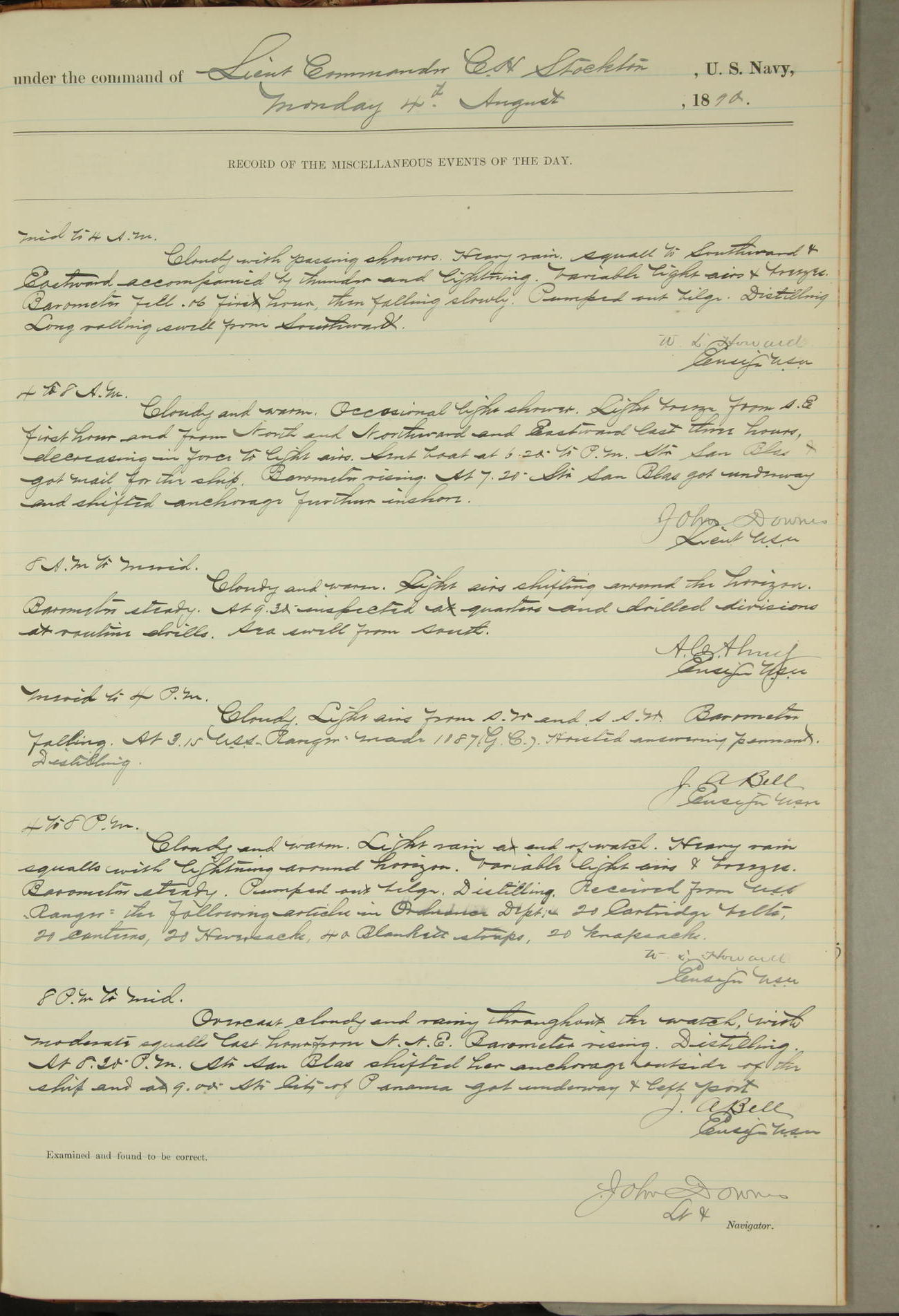 JA Dearborn - At 10am a Summary Court composed of Ensigns Simpson, Gorgas & Dewey as members with Asst Paymaster Lovell as Recorder convened for the tial of JA Dearborn (CH). The court adjourned at 11.20 to await the action of the Comd'g Officer.