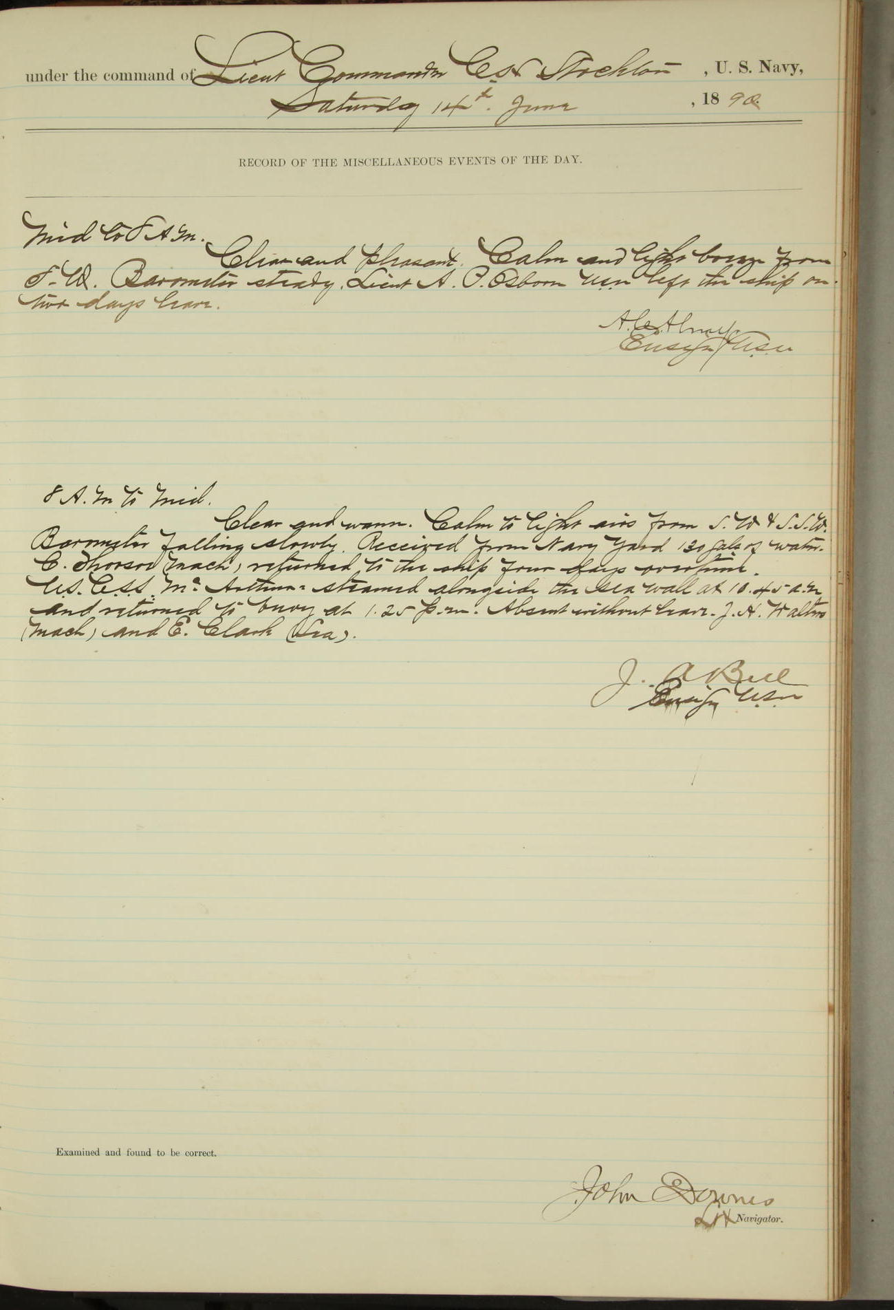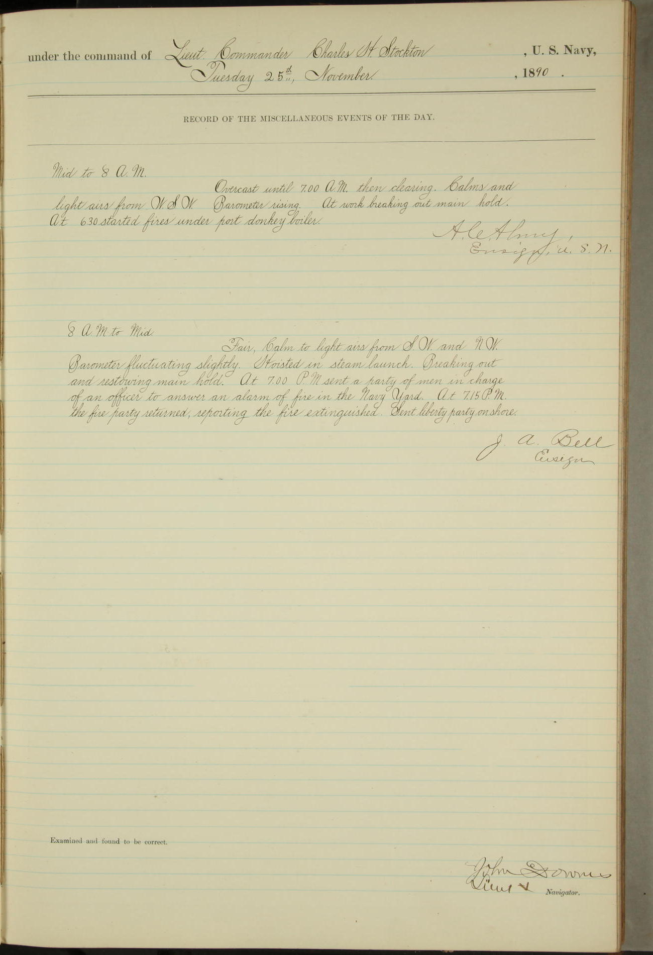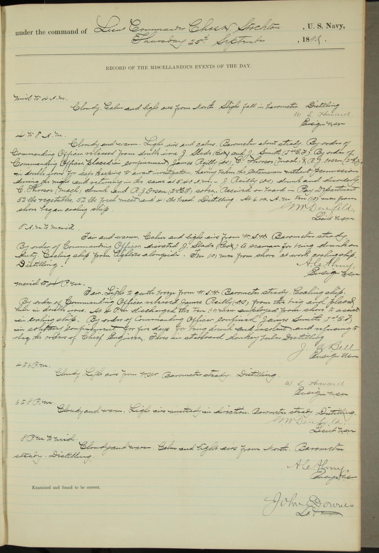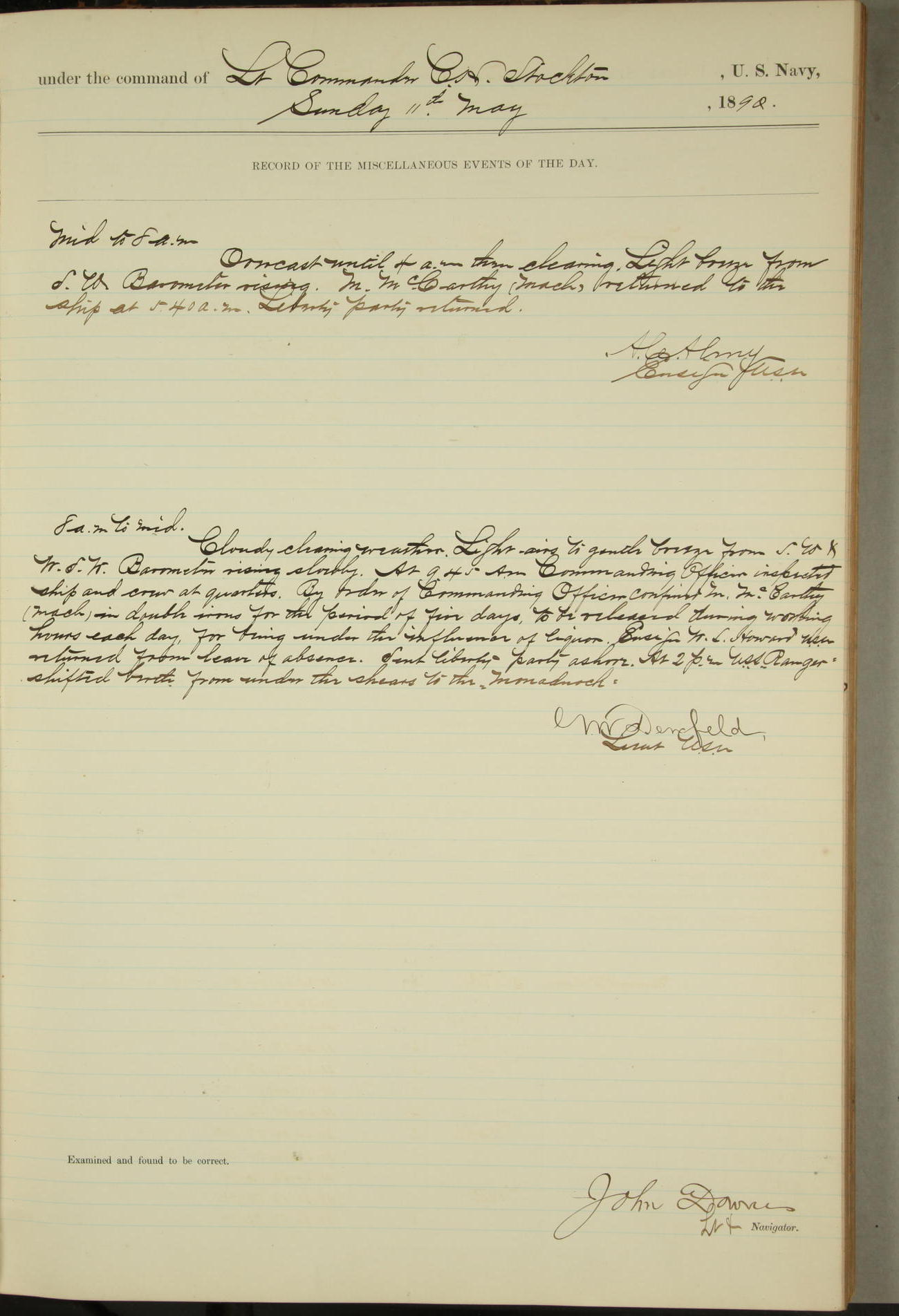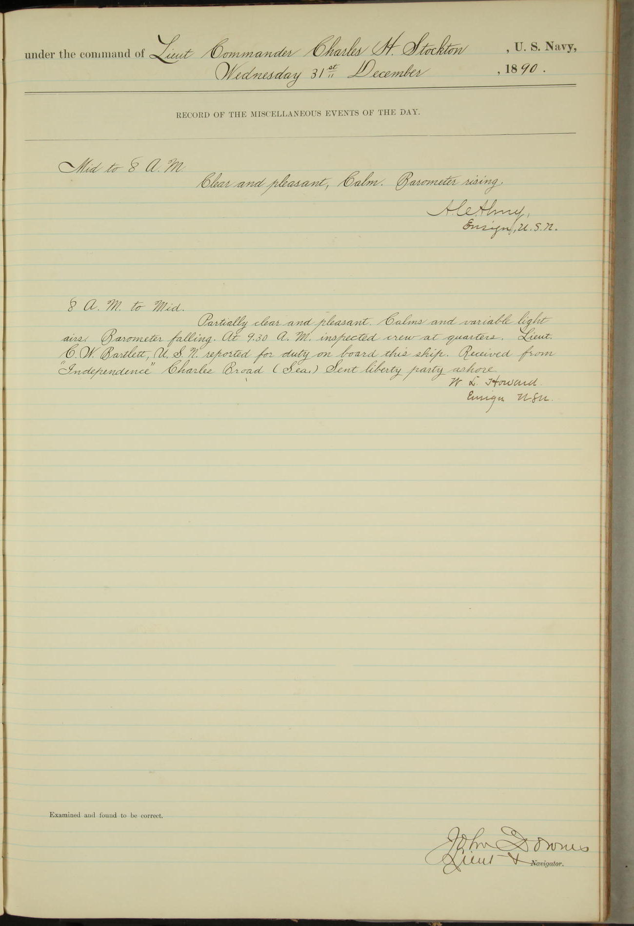 JA Dearborn - At 10am a Summary Court composed of Ensigns Simpson, Gorgas & Dewey as members with Asst Paymaster Lovell as Recorder convened for the tial of JA Dearborn (CH). The court adjourned at 11.20 to await the action of the Comd'g Officer.