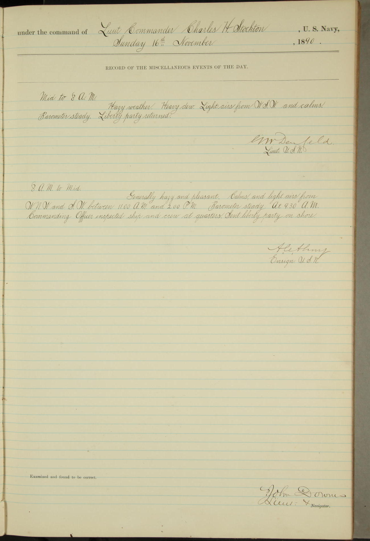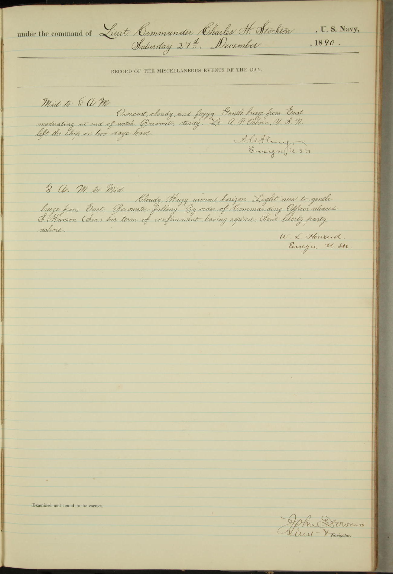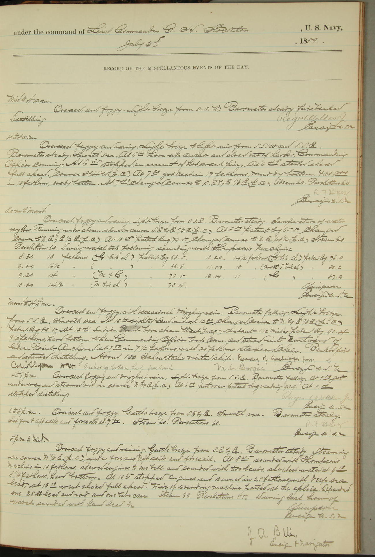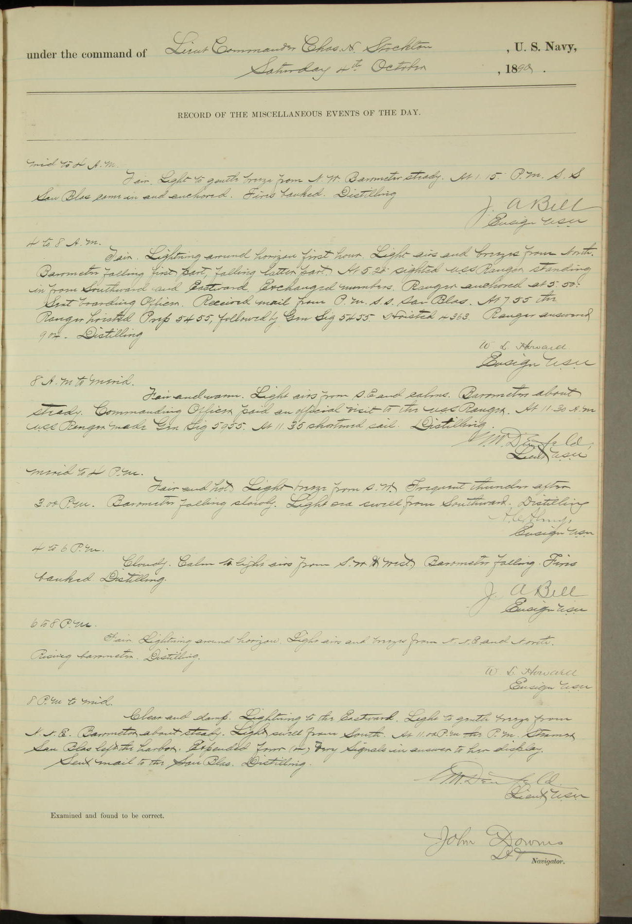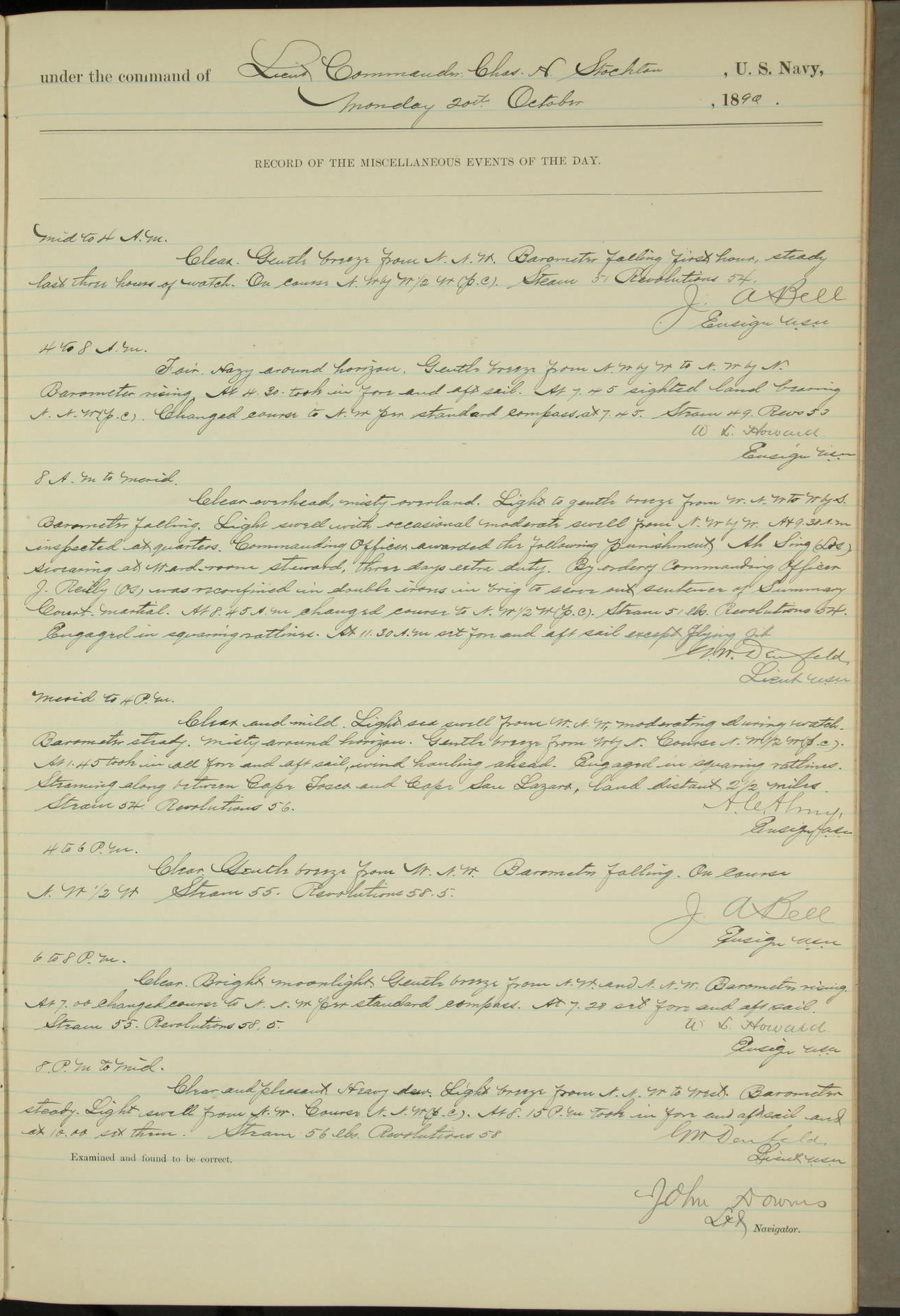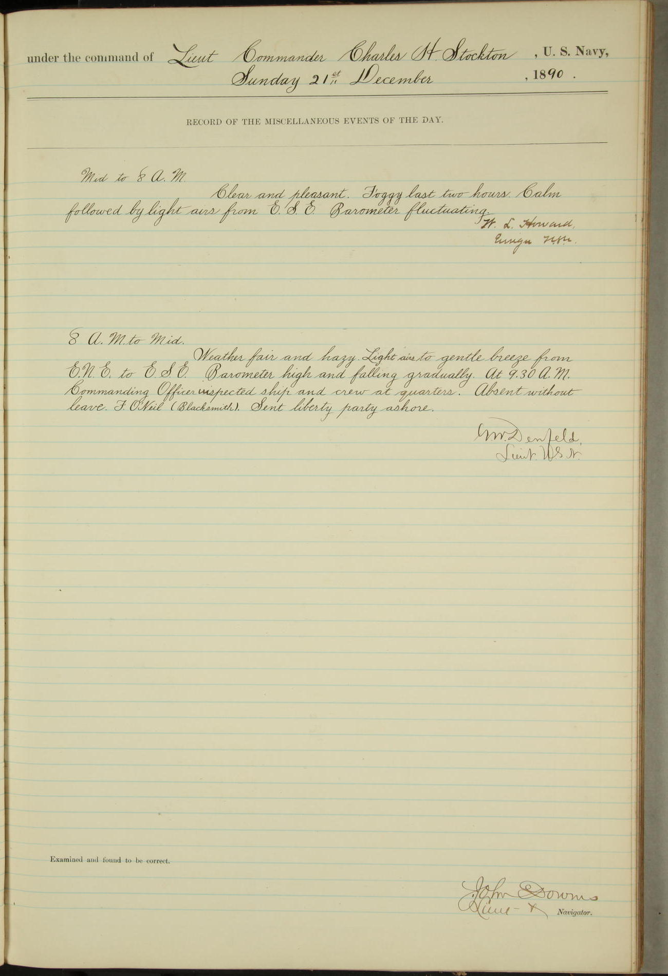 JA Dearborn - At 10am a Summary Court composed of Ensigns Simpson, Gorgas & Dewey as members with Asst Paymaster Lovell as Recorder convened for the tial of JA Dearborn (CH). The court adjourned at 11.20 to await the action of the Comd'g Officer.