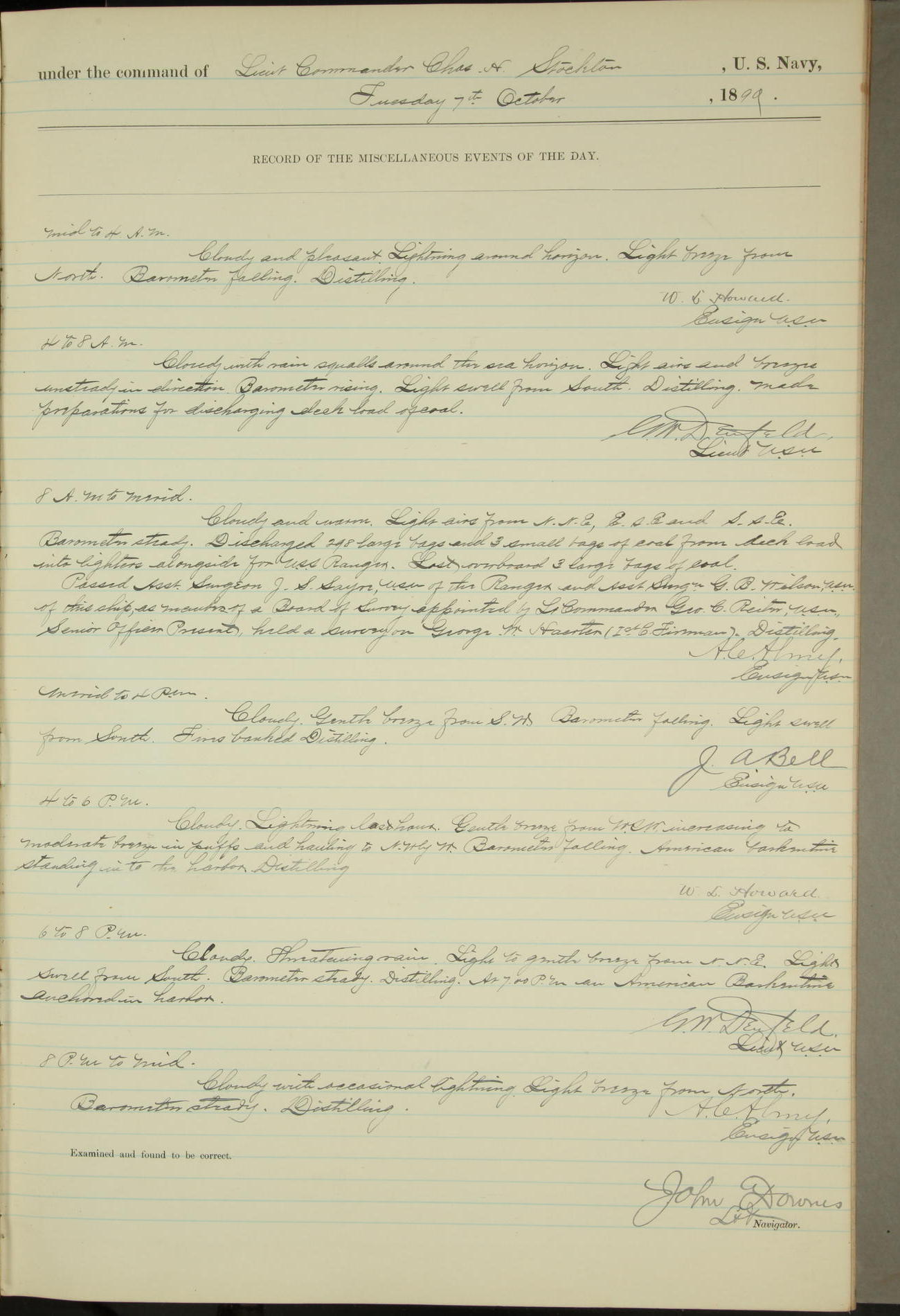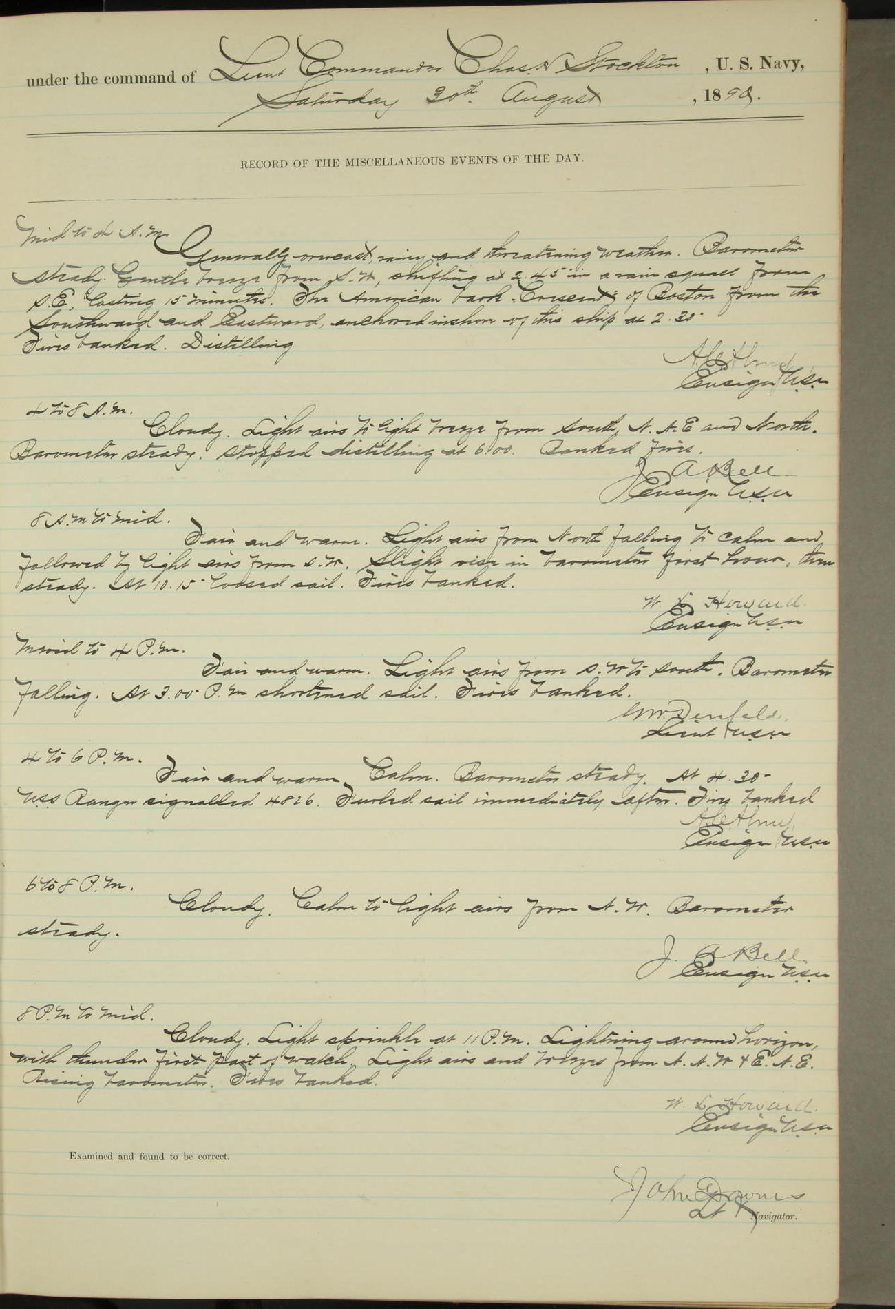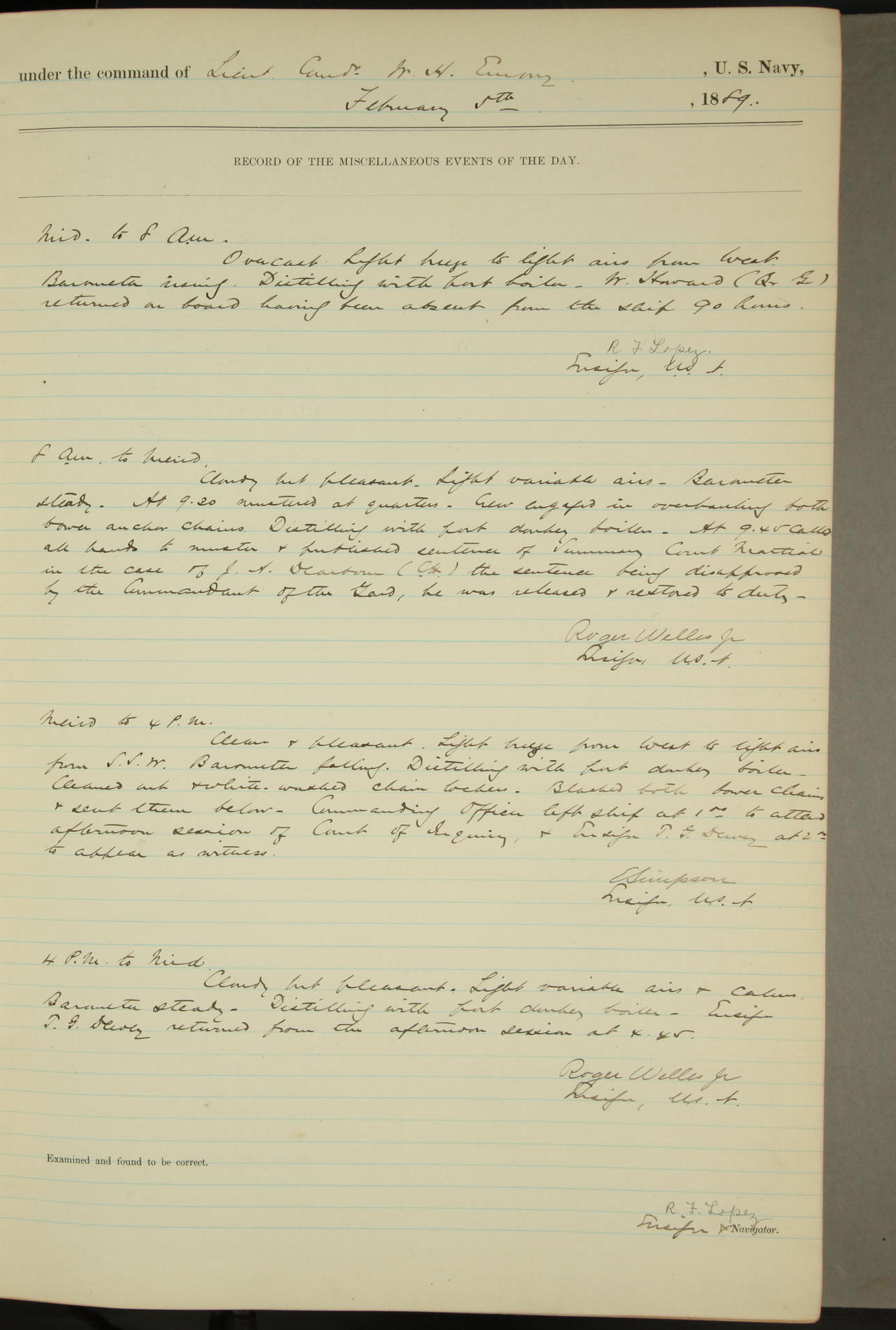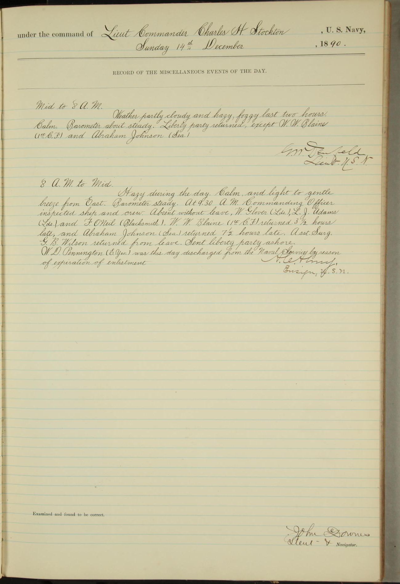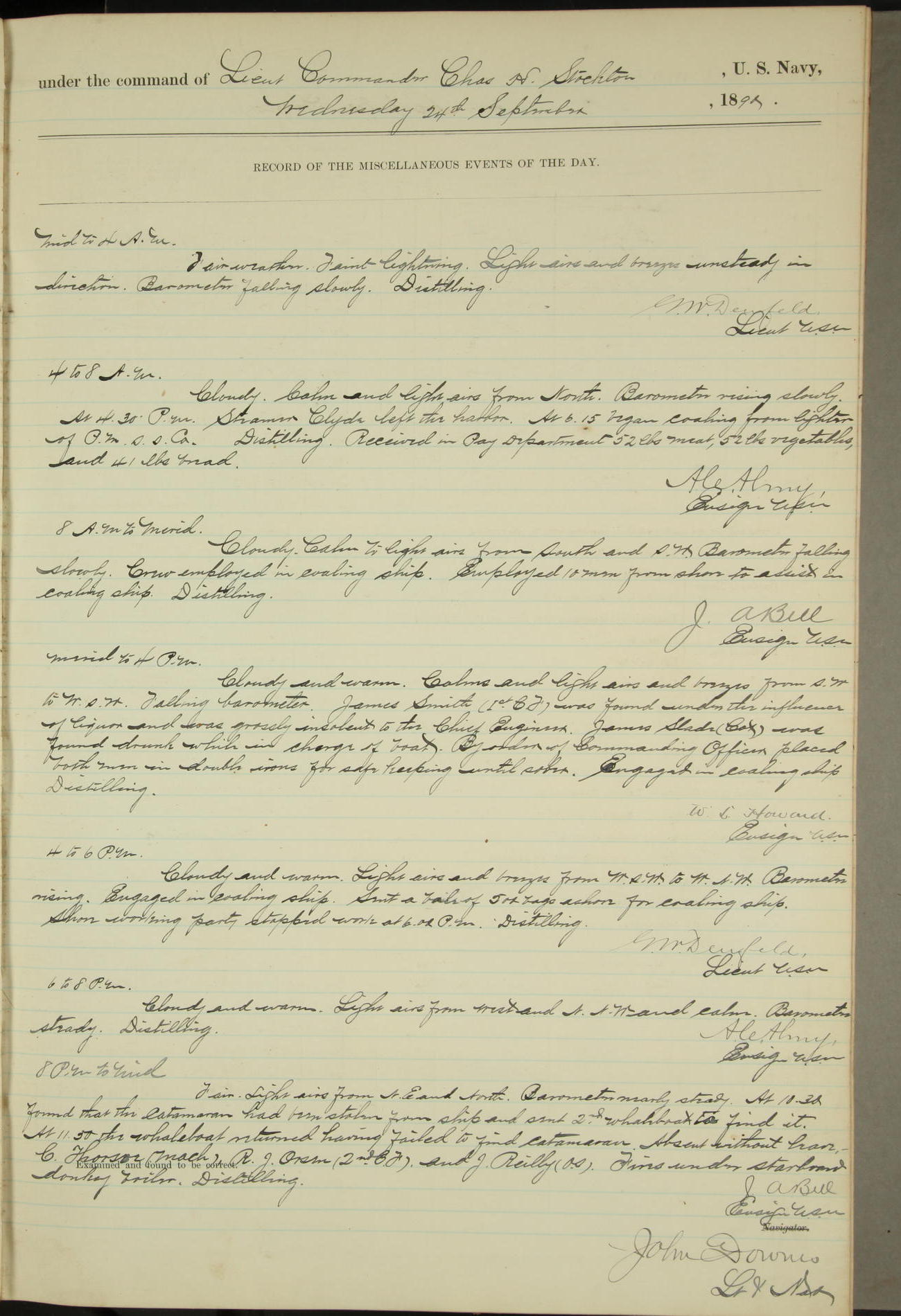 JA Dearborn - At 10am a Summary Court composed of Ensigns Simpson, Gorgas & Dewey as members with Asst Paymaster Lovell as Recorder convened for the tial of JA Dearborn (CH). The court adjourned at 11.20 to await the action of the Comd'g Officer.