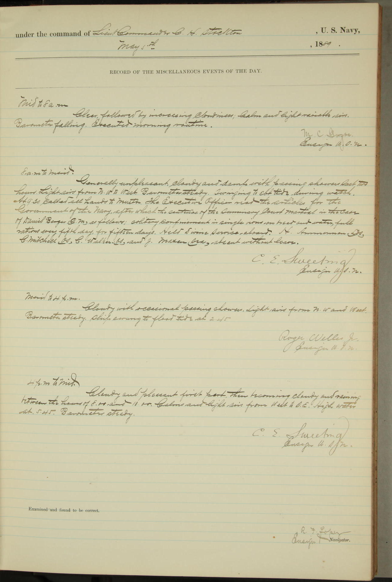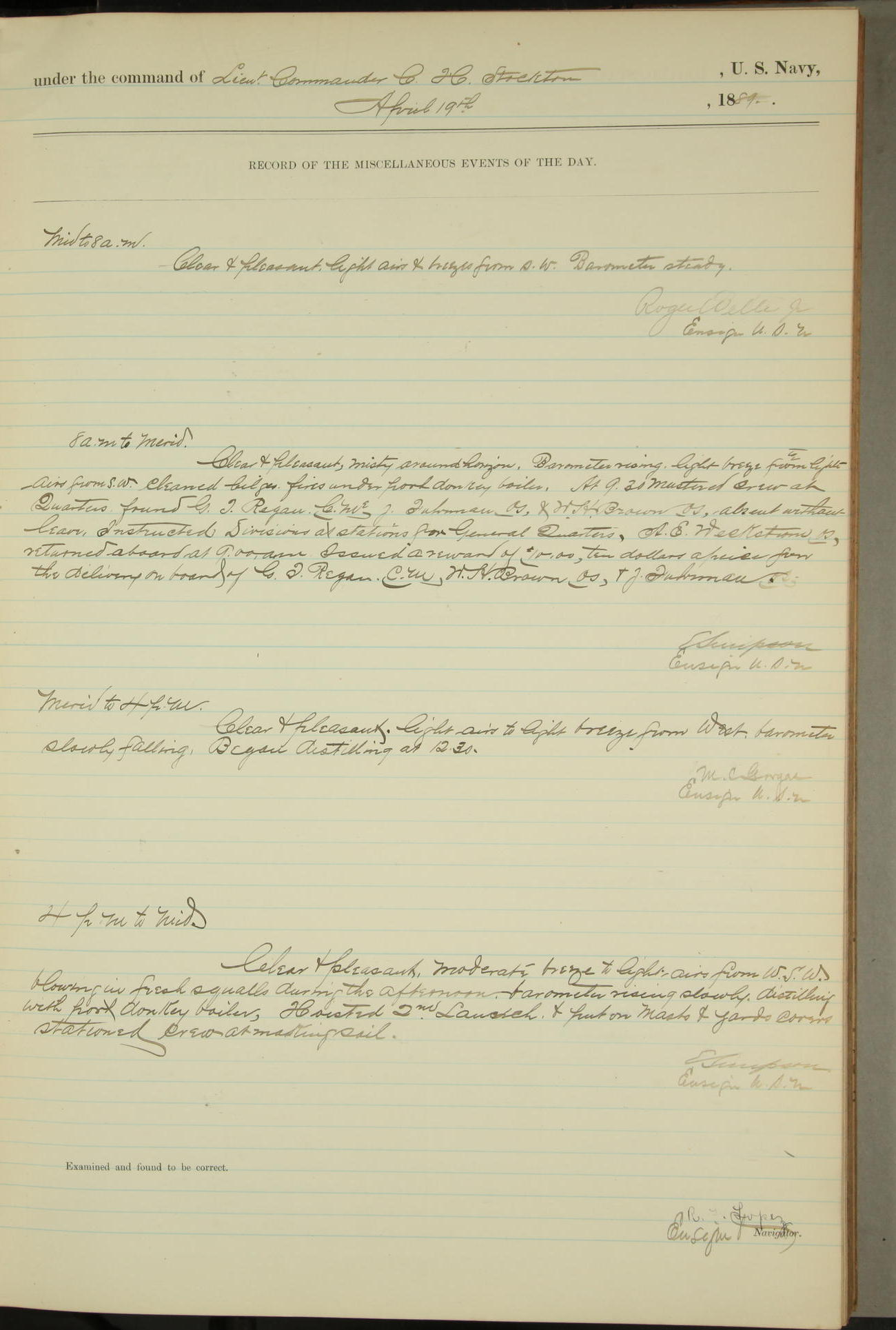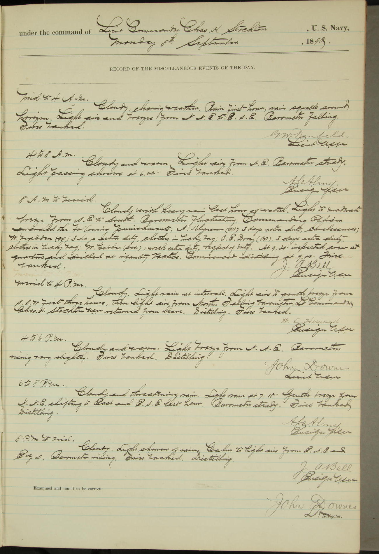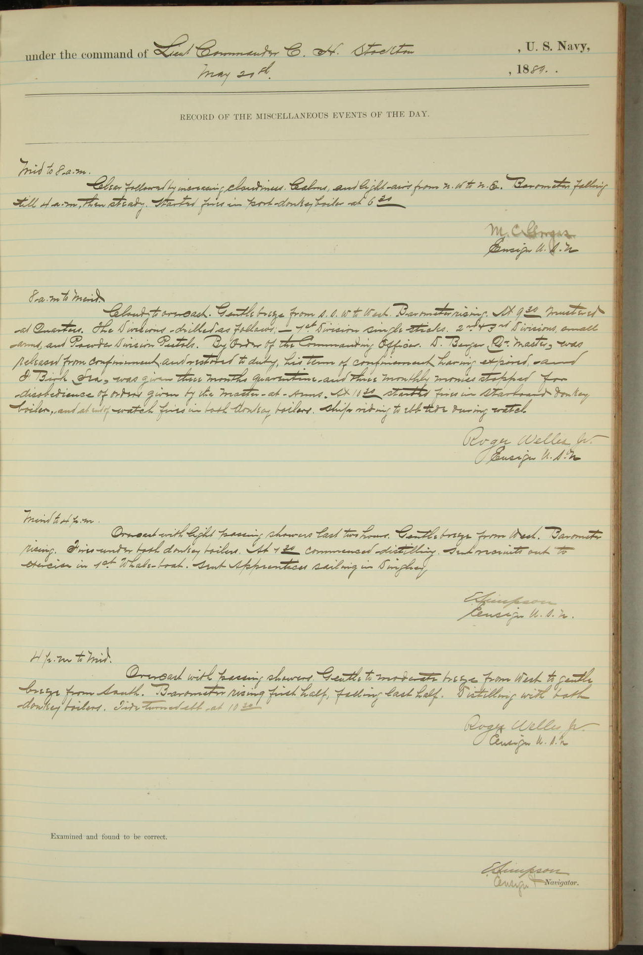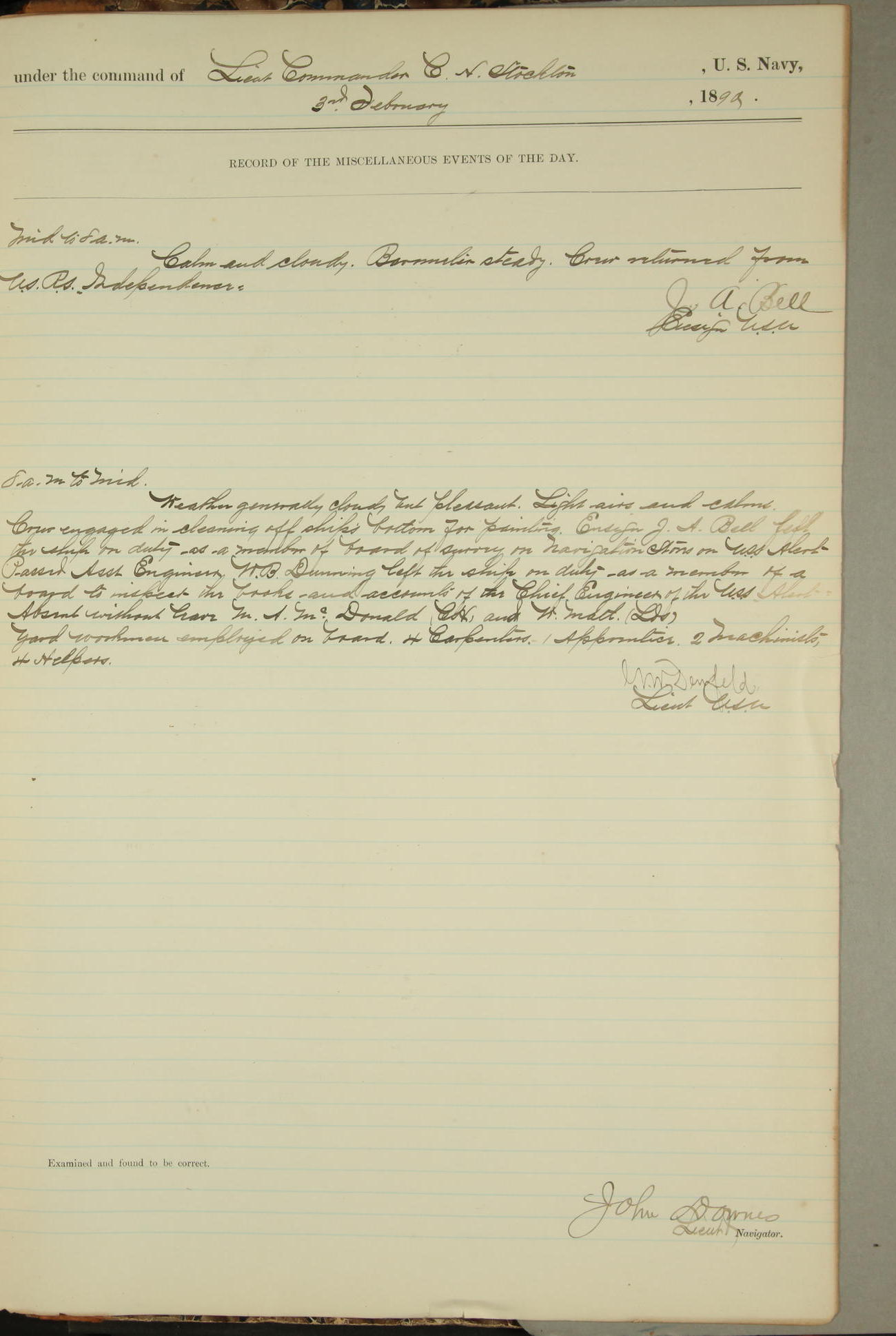 JA Dearborn - At 10am a Summary Court composed of Ensigns Simpson, Gorgas & Dewey as members with Asst Paymaster Lovell as Recorder convened for the tial of JA Dearborn (CH). The court adjourned at 11.20 to await the action of the Comd'g Officer.