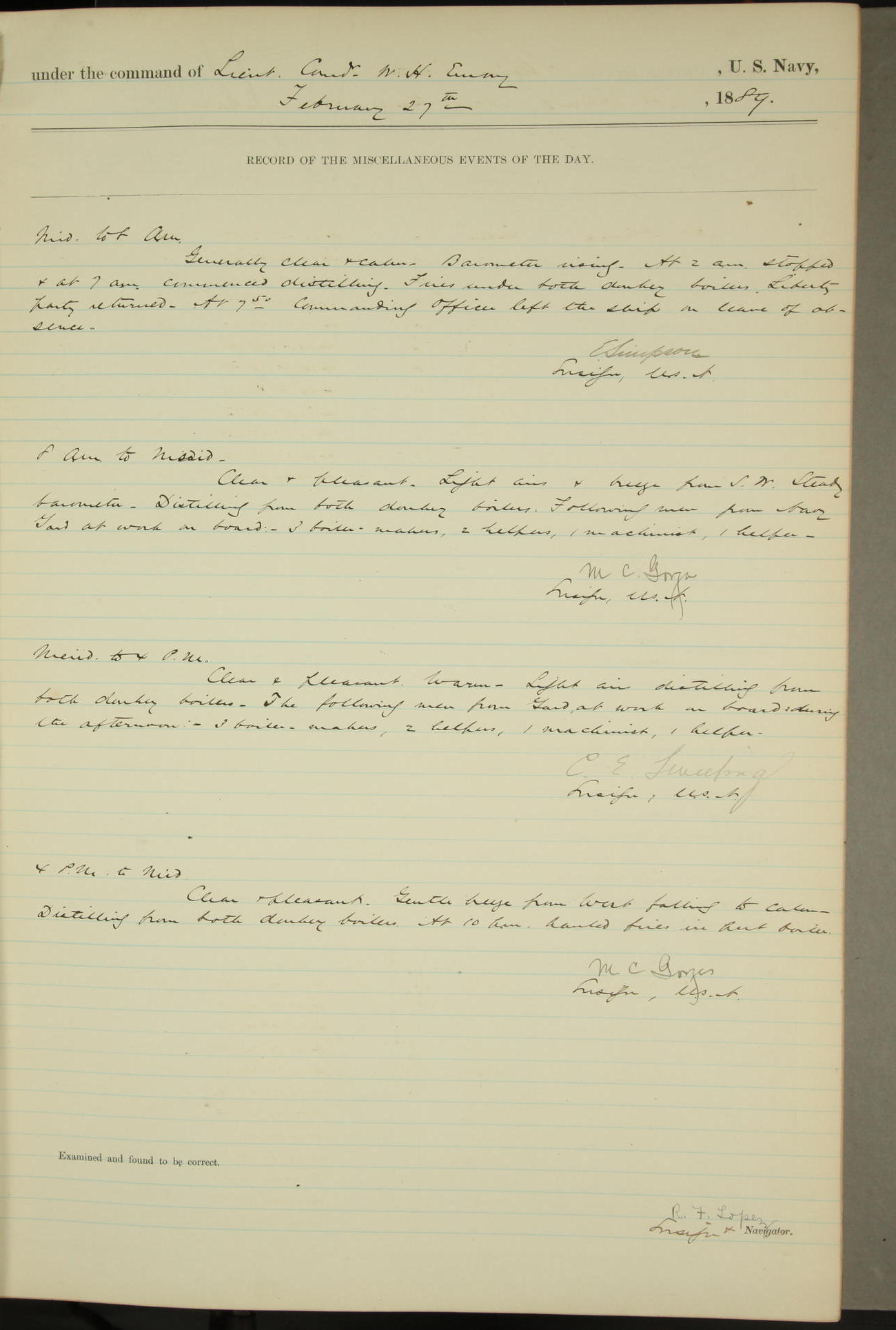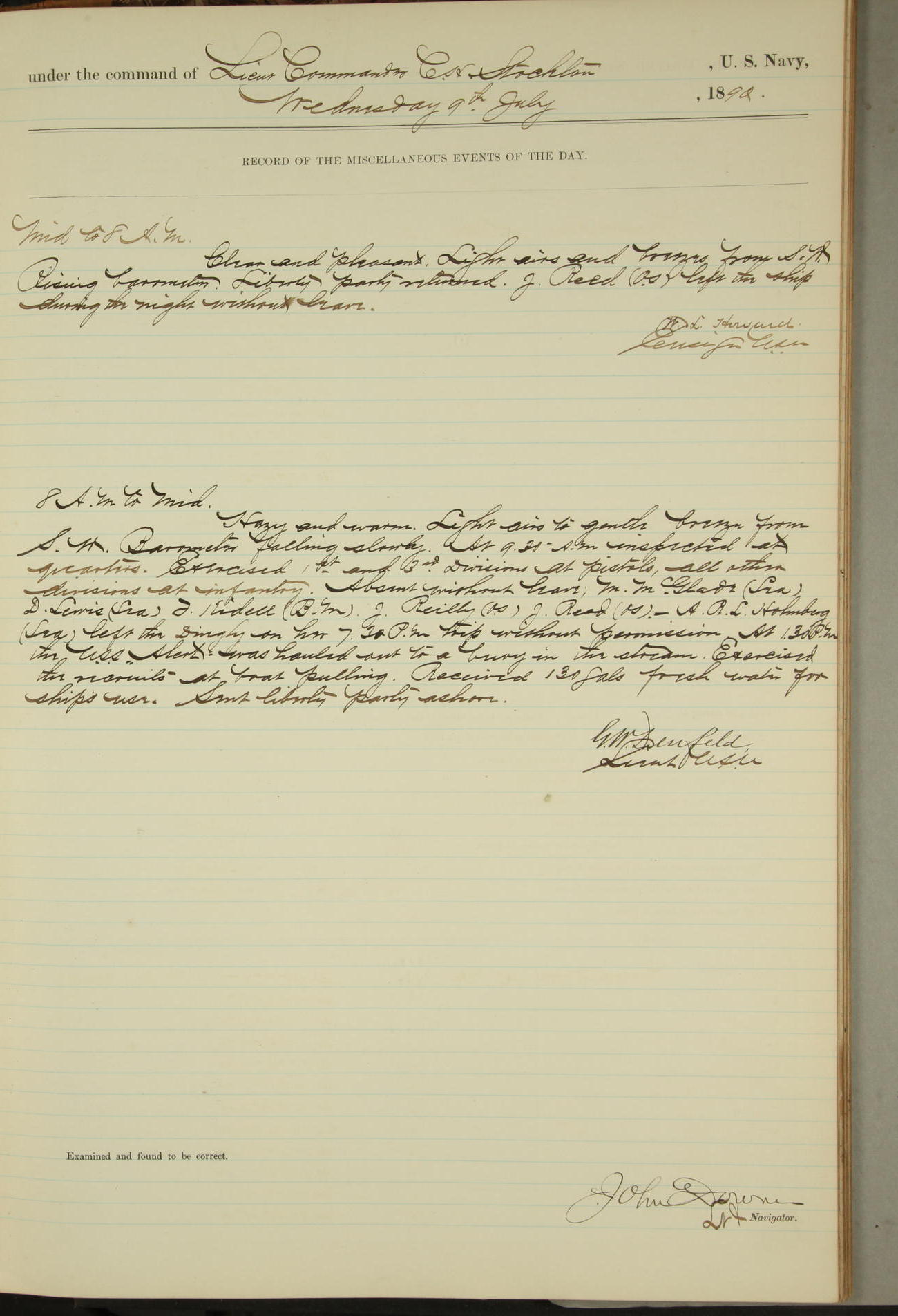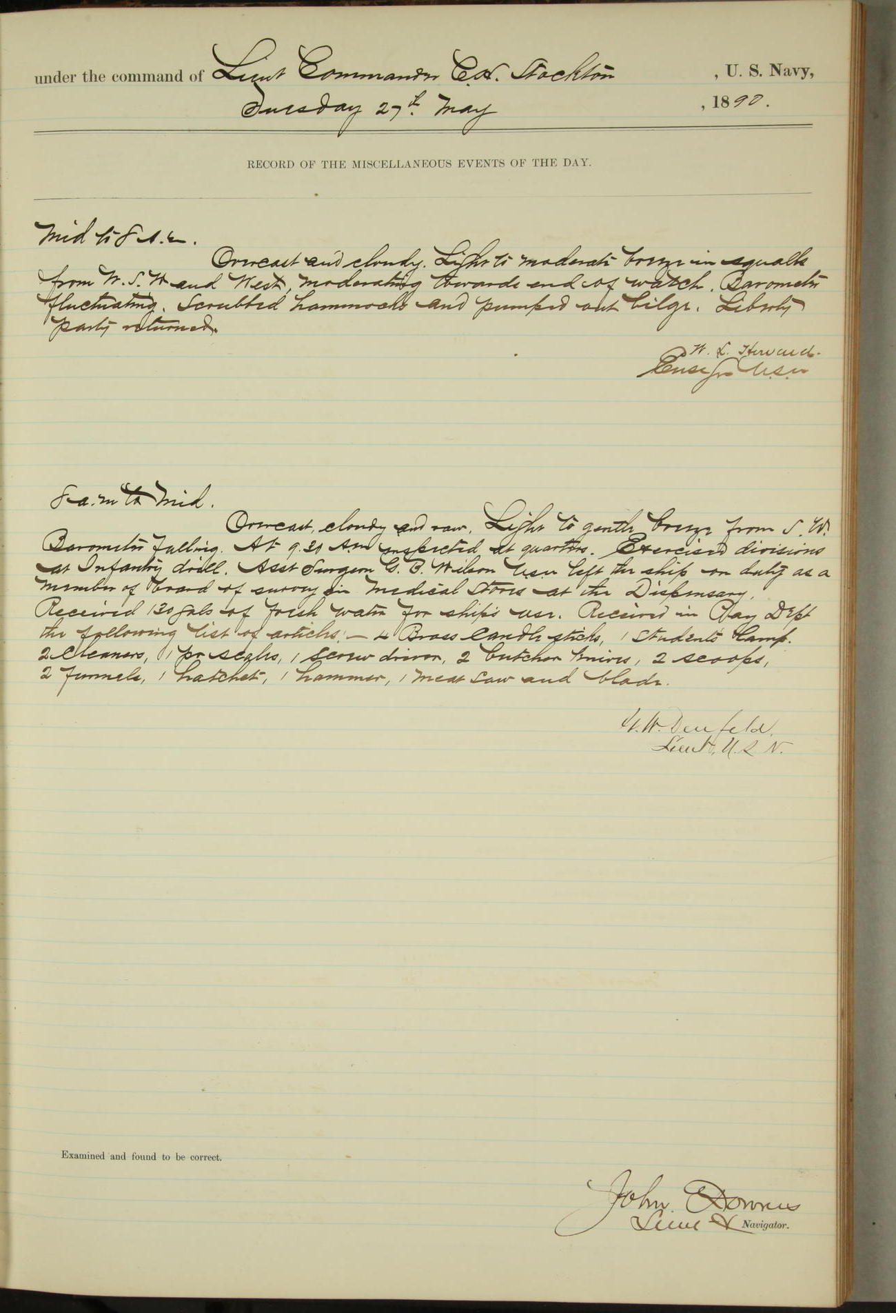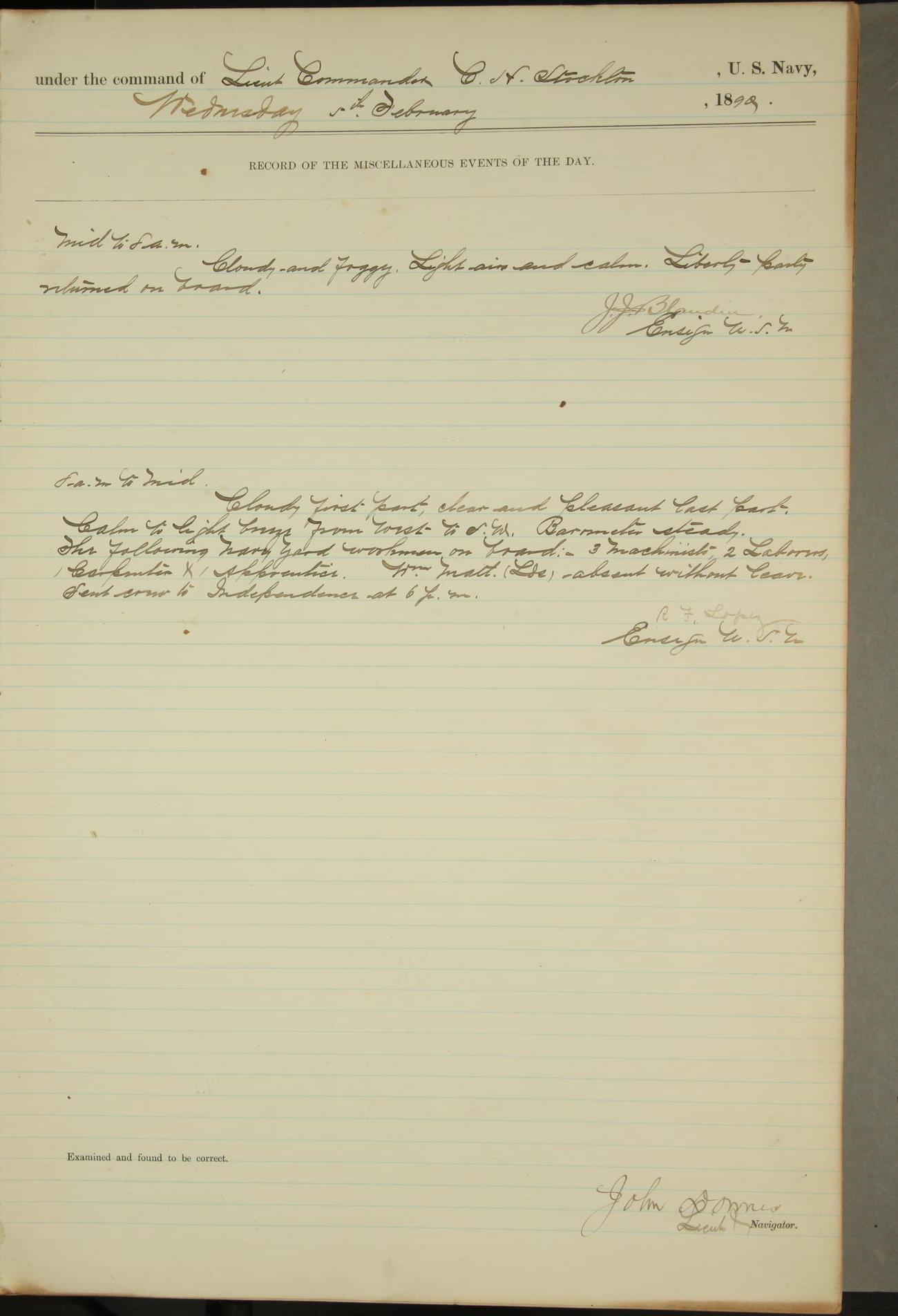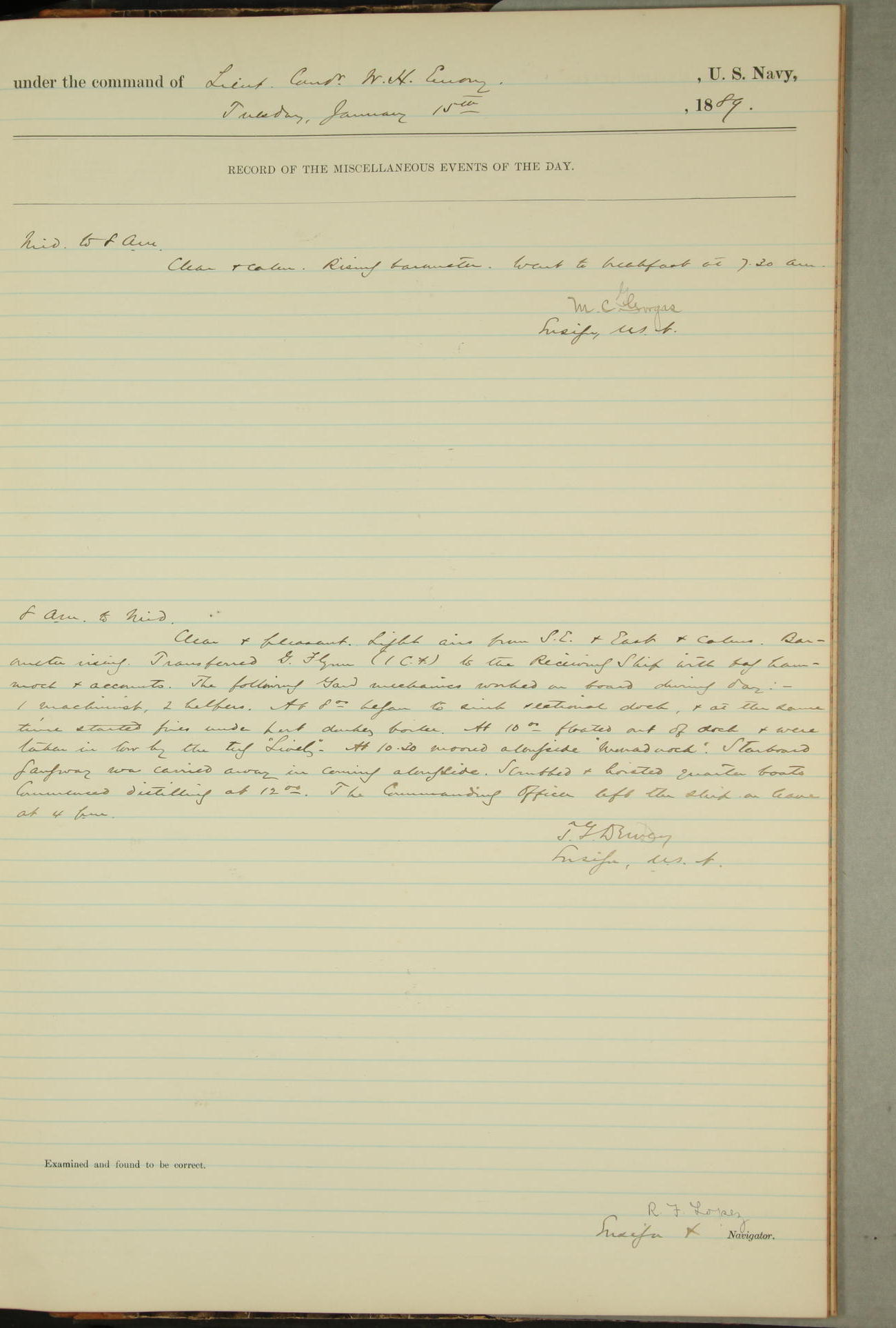 JA Dearborn - At 10am a Summary Court composed of Ensigns Simpson, Gorgas & Dewey as members with Asst Paymaster Lovell as Recorder convened for the tial of JA Dearborn (CH). The court adjourned at 11.20 to await the action of the Comd'g Officer.