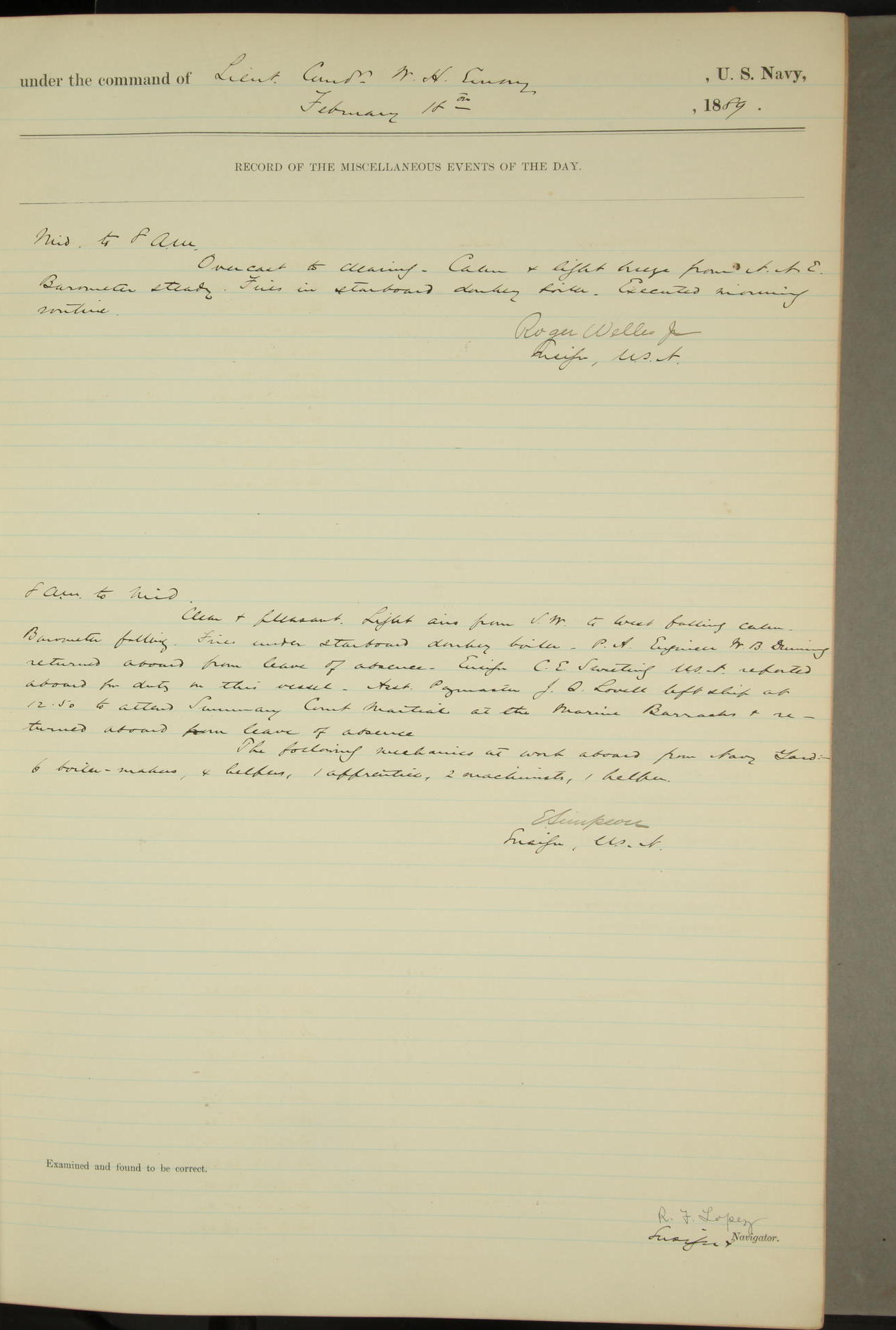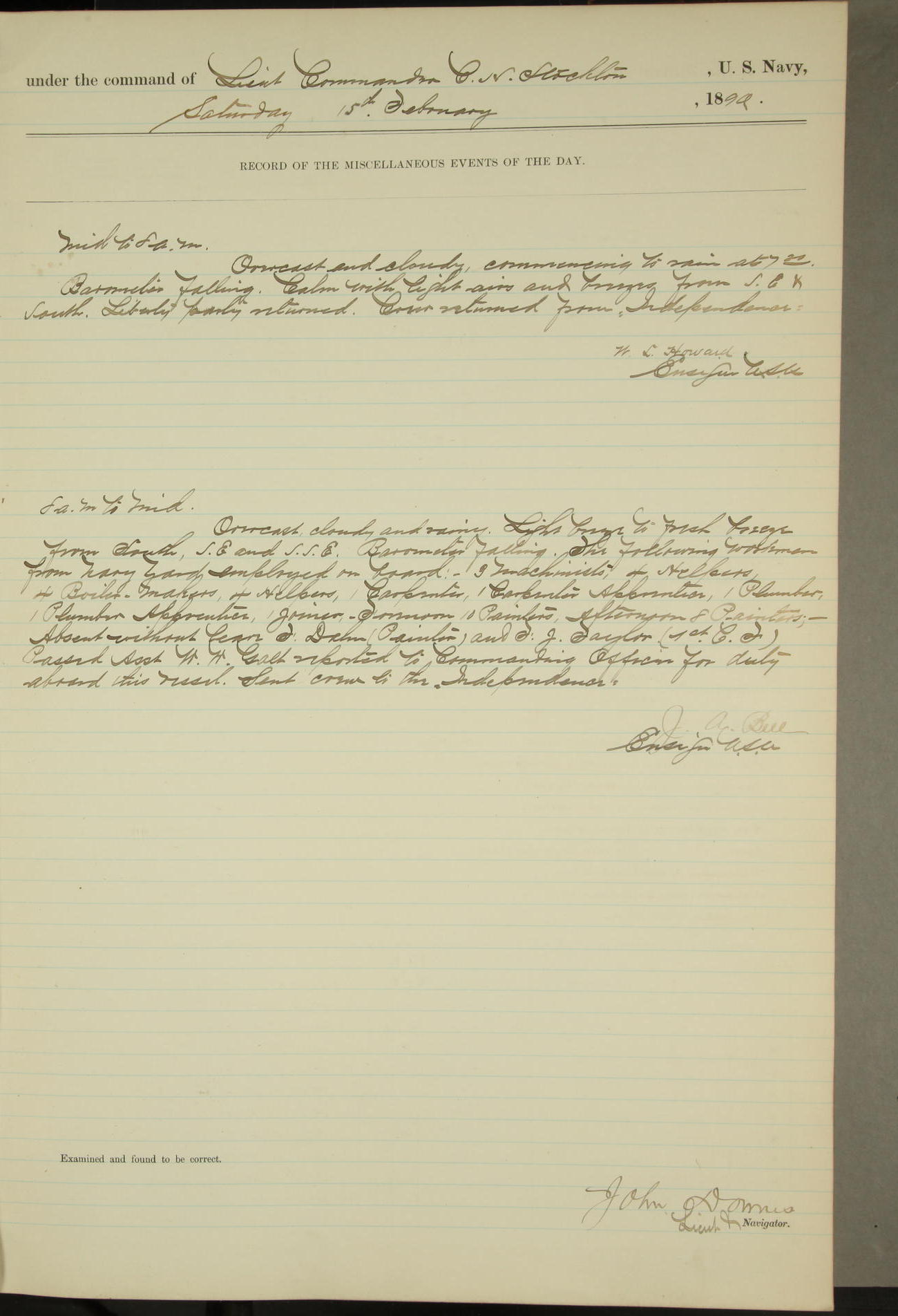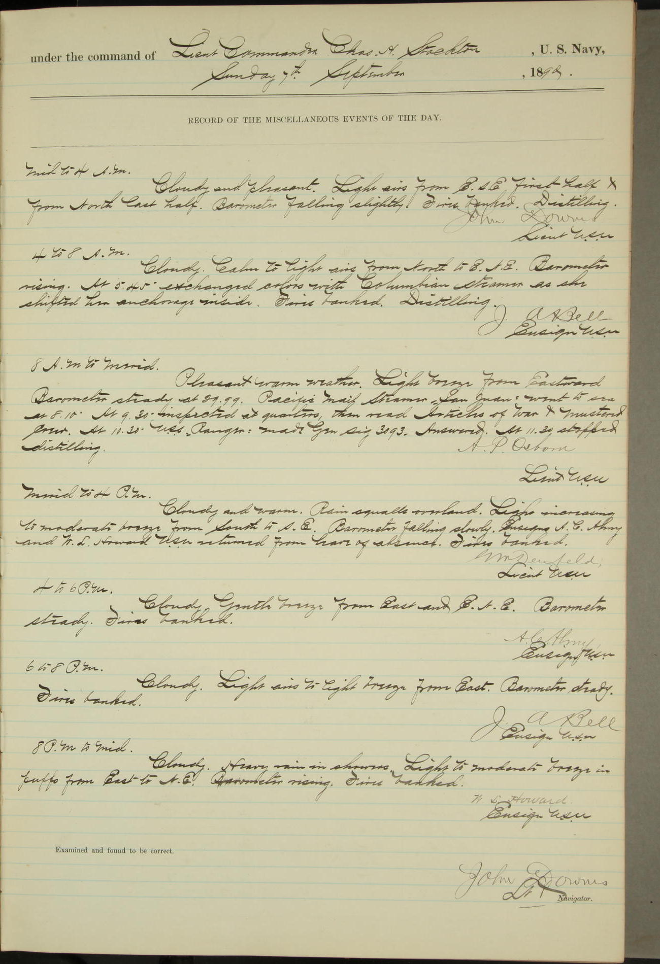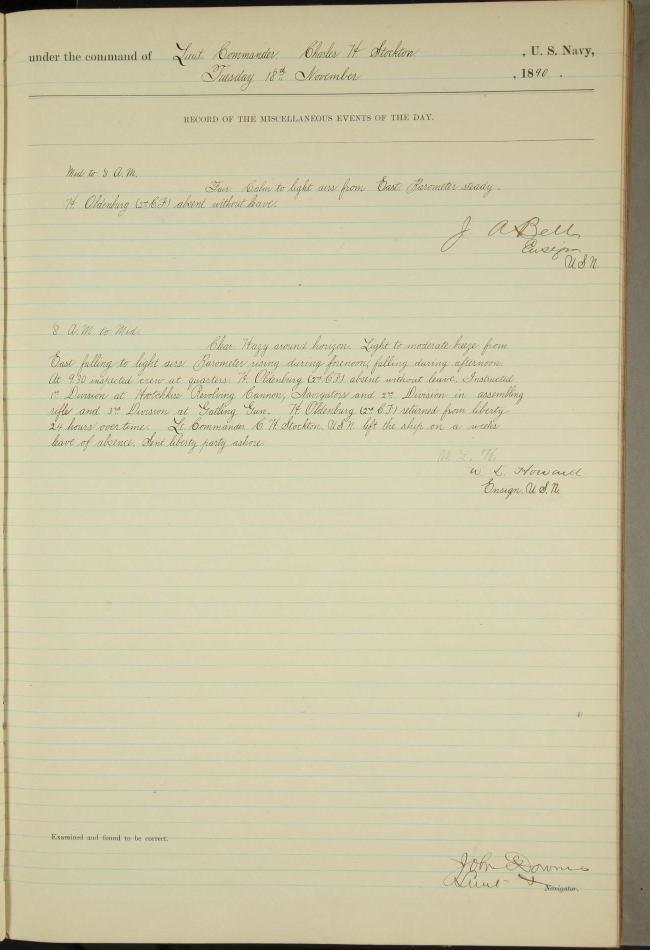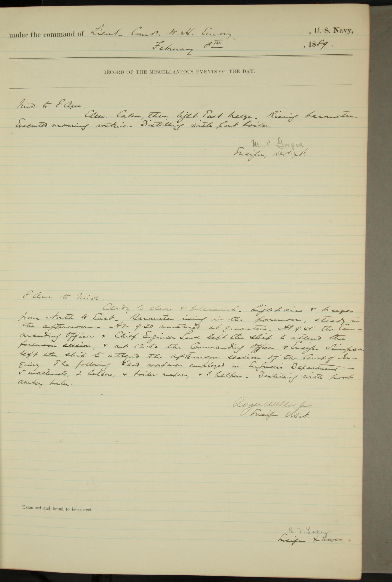 JA Dearborn - At 10am a Summary Court composed of Ensigns Simpson, Gorgas & Dewey as members with Asst Paymaster Lovell as Recorder convened for the tial of JA Dearborn (CH). The court adjourned at 11.20 to await the action of the Comd'g Officer.