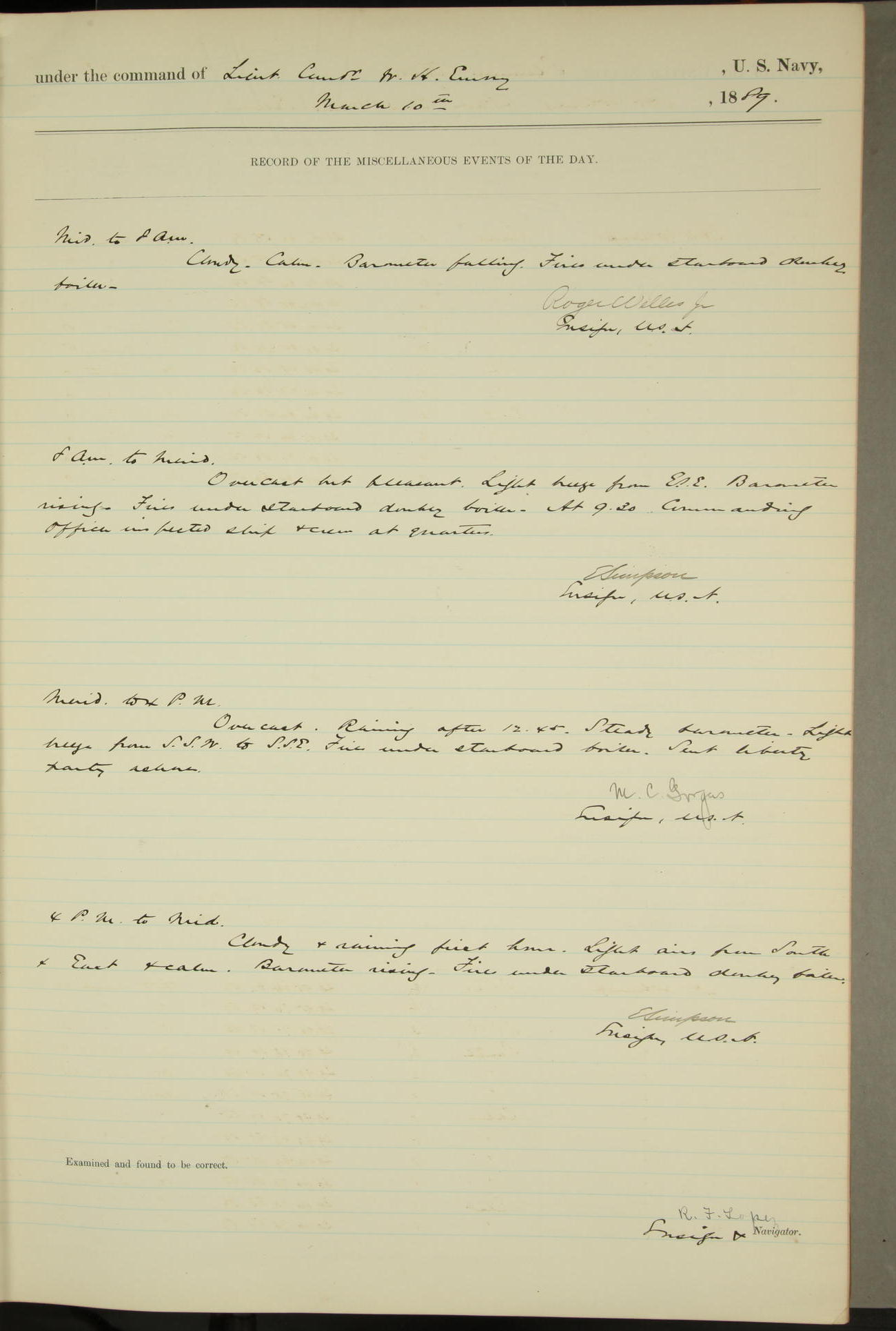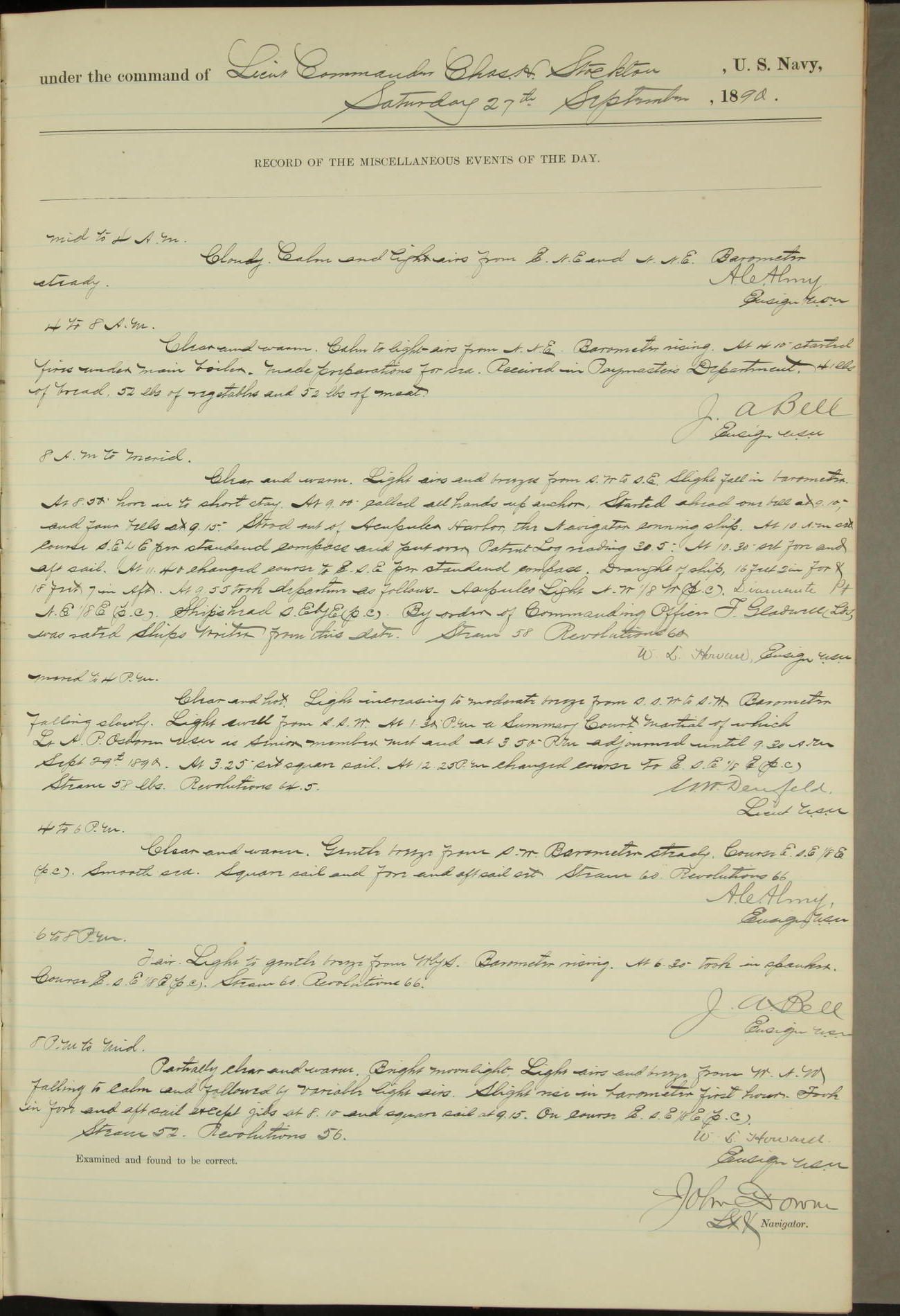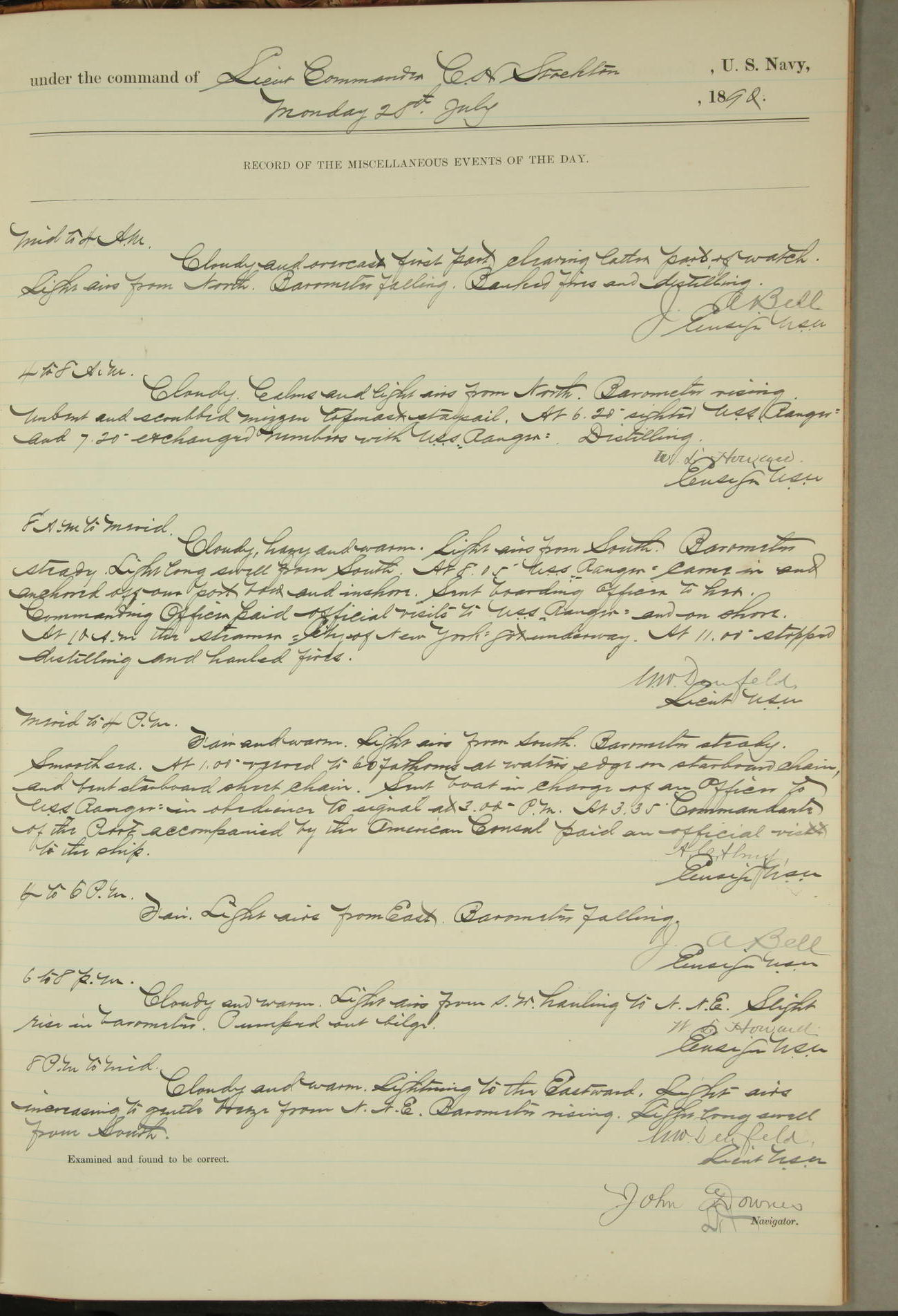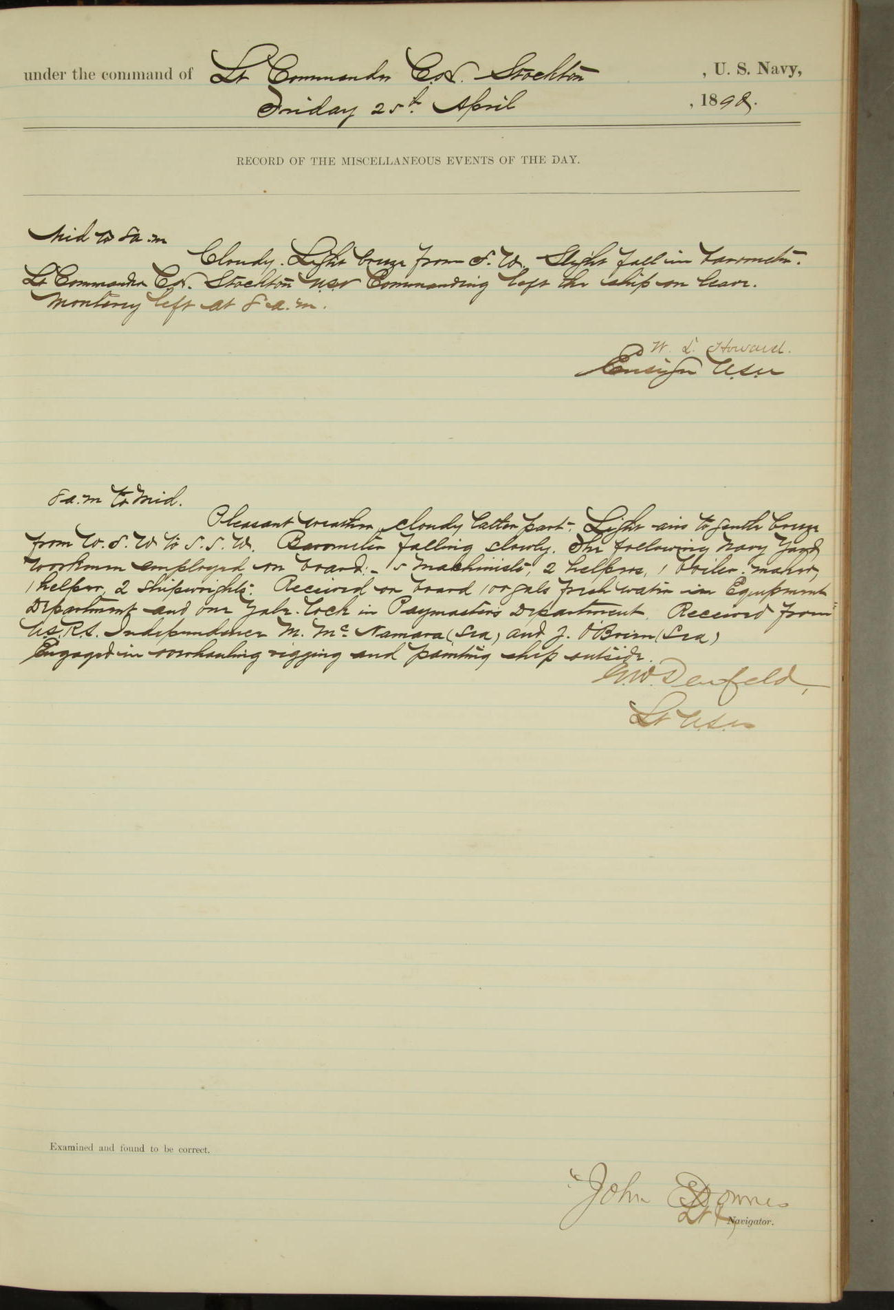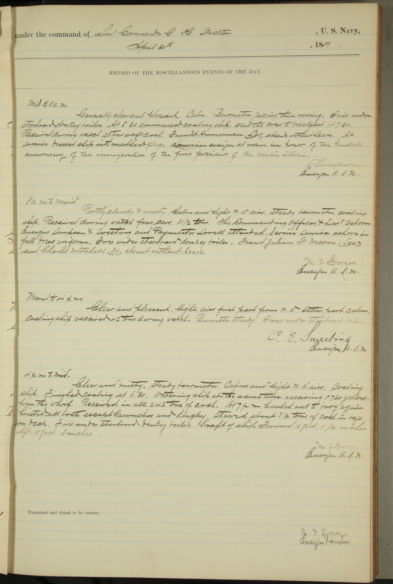JA Dearborn - At 10am a Summary Court composed of Ensigns Simpson, Gorgas & Dewey as members with Asst Paymaster Lovell as Recorder convened for the tial of JA Dearborn (CH). The court adjourned at 11.20 to await the action of the Comd'g Officer.