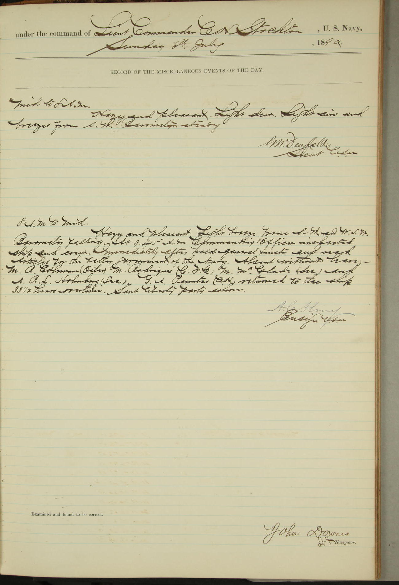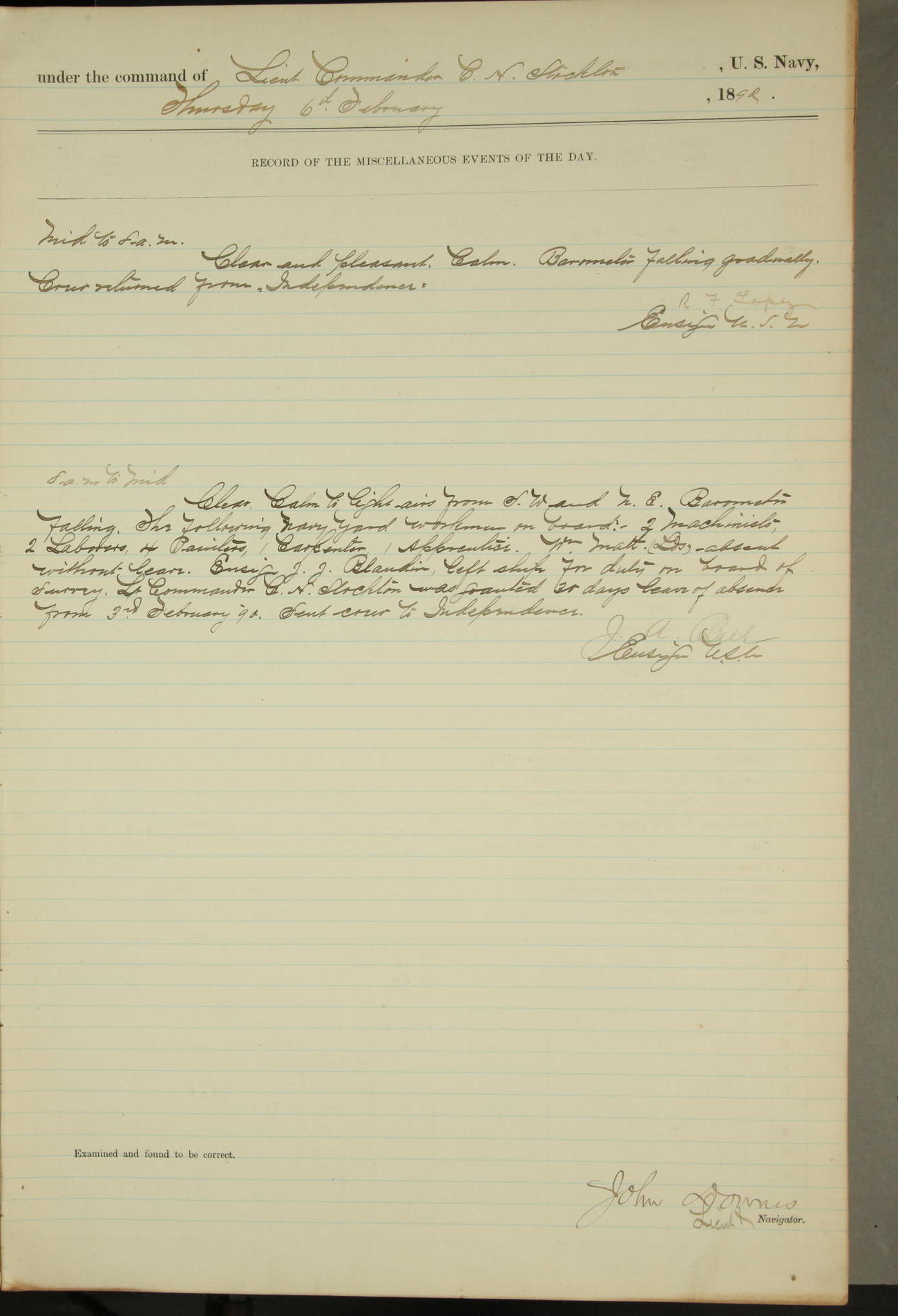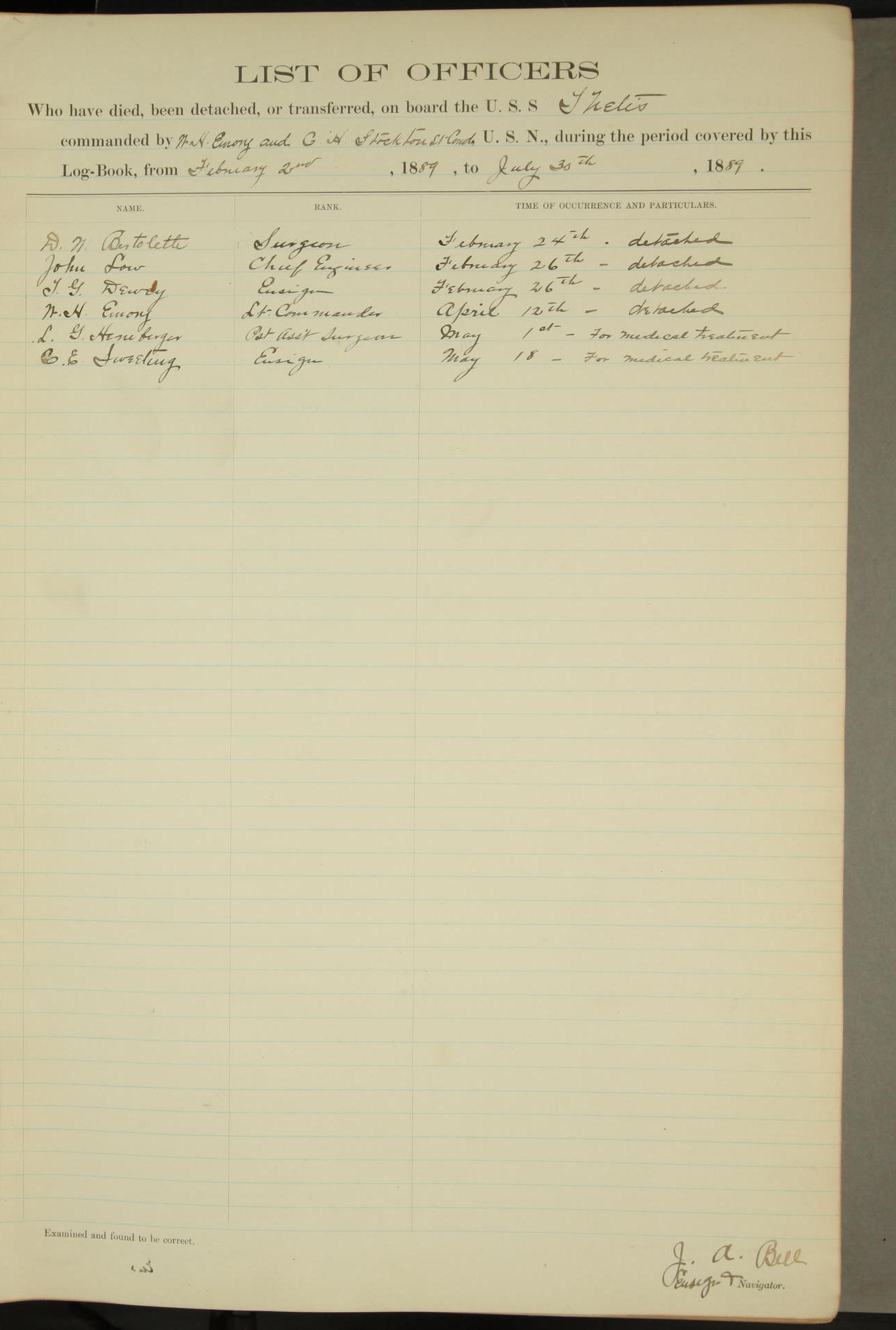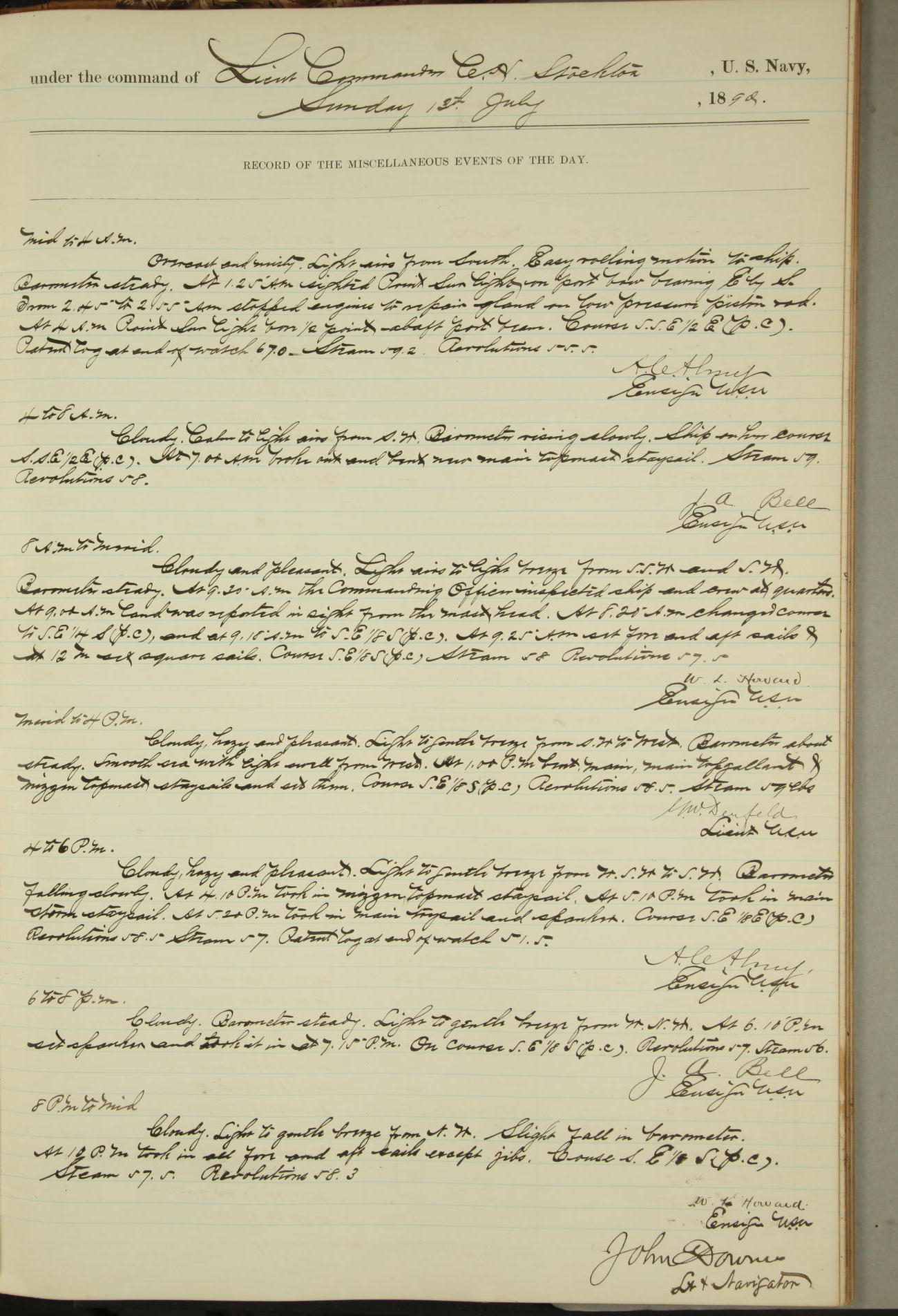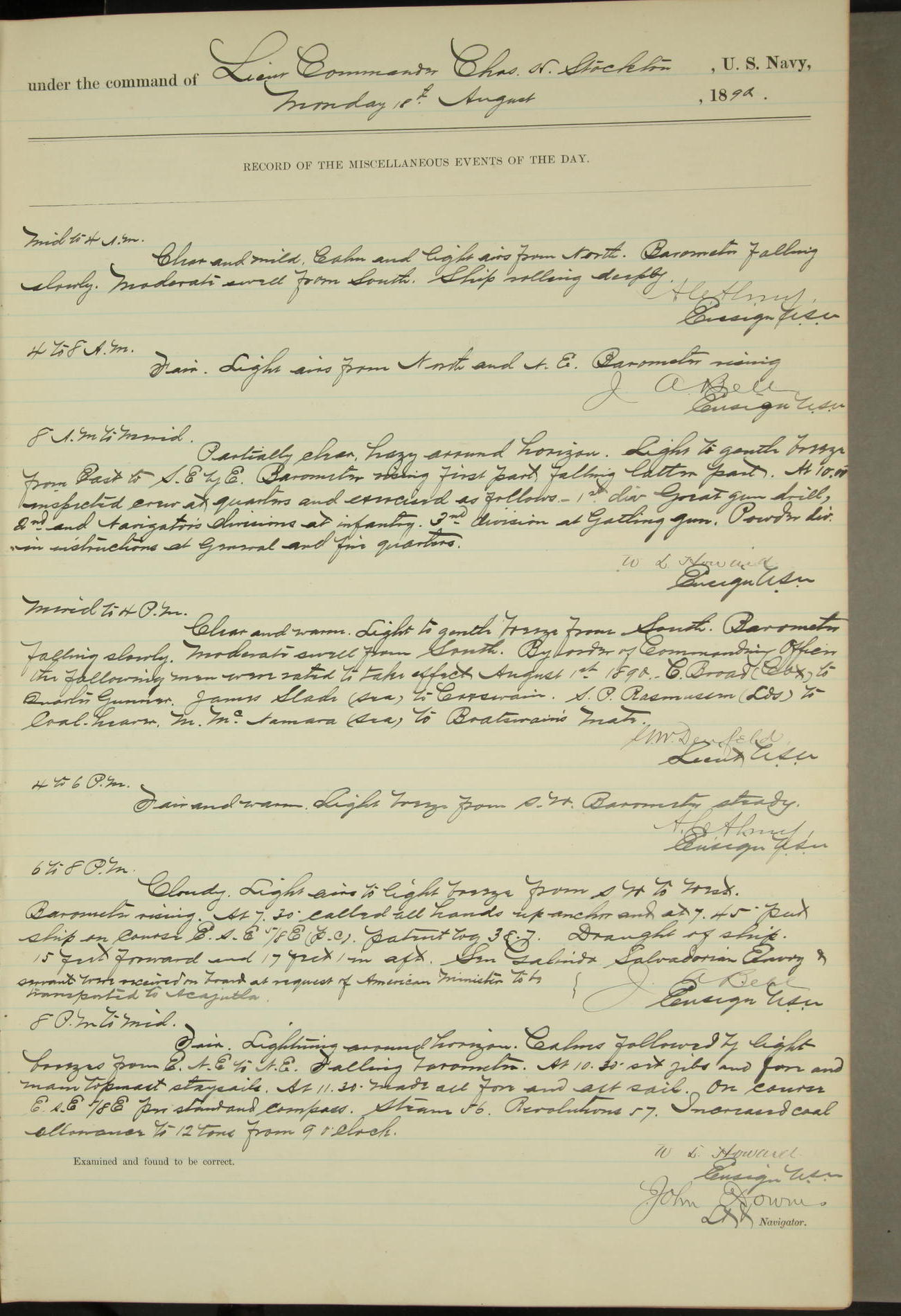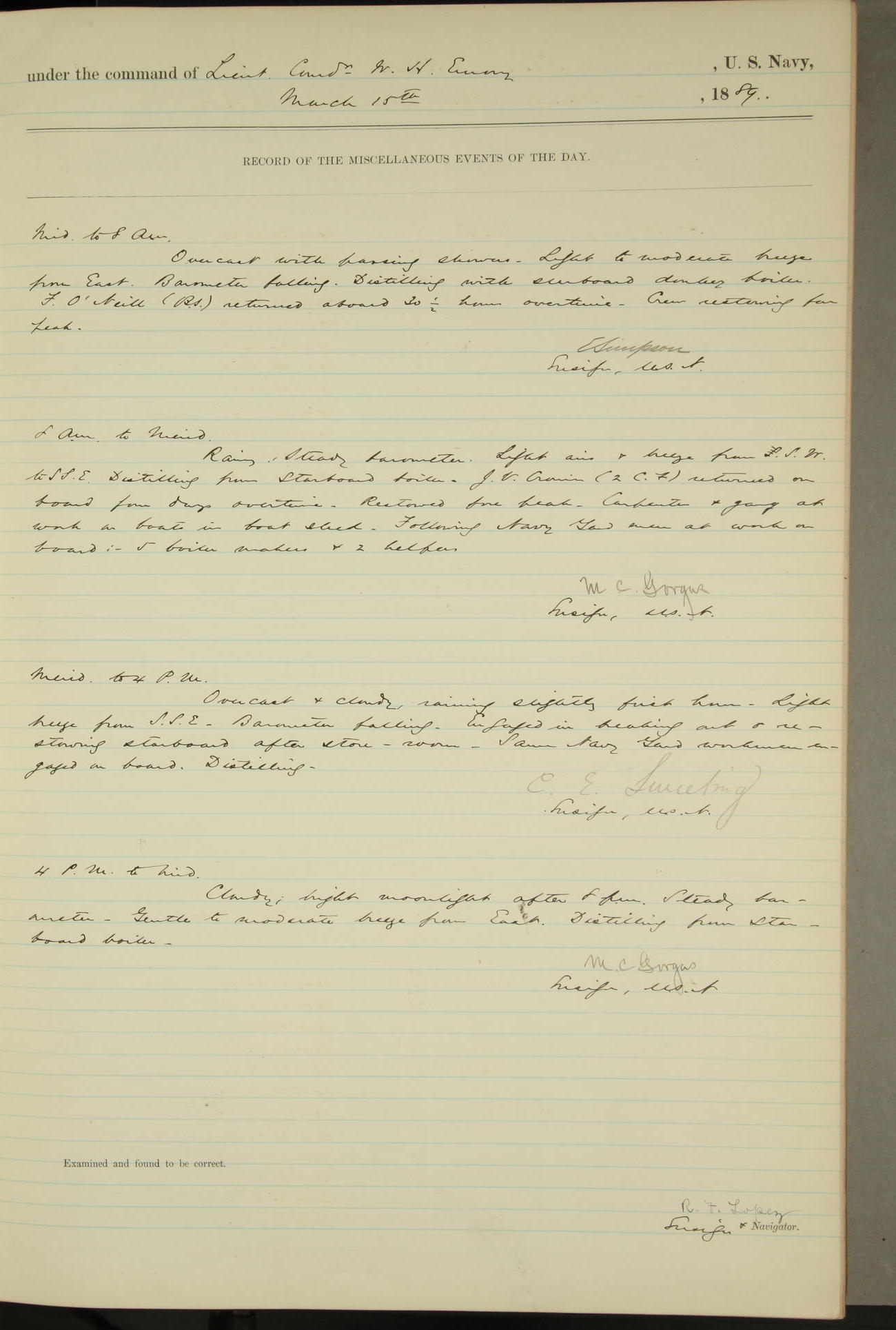 JA Dearborn - At 10am a Summary Court composed of Ensigns Simpson, Gorgas & Dewey as members with Asst Paymaster Lovell as Recorder convened for the tial of JA Dearborn (CH). The court adjourned at 11.20 to await the action of the Comd'g Officer.