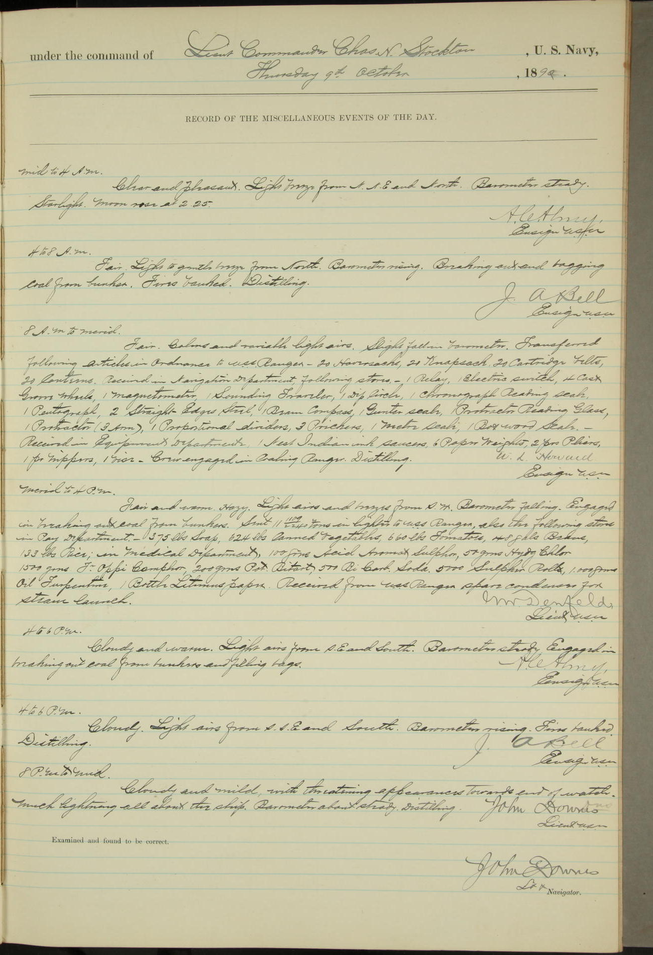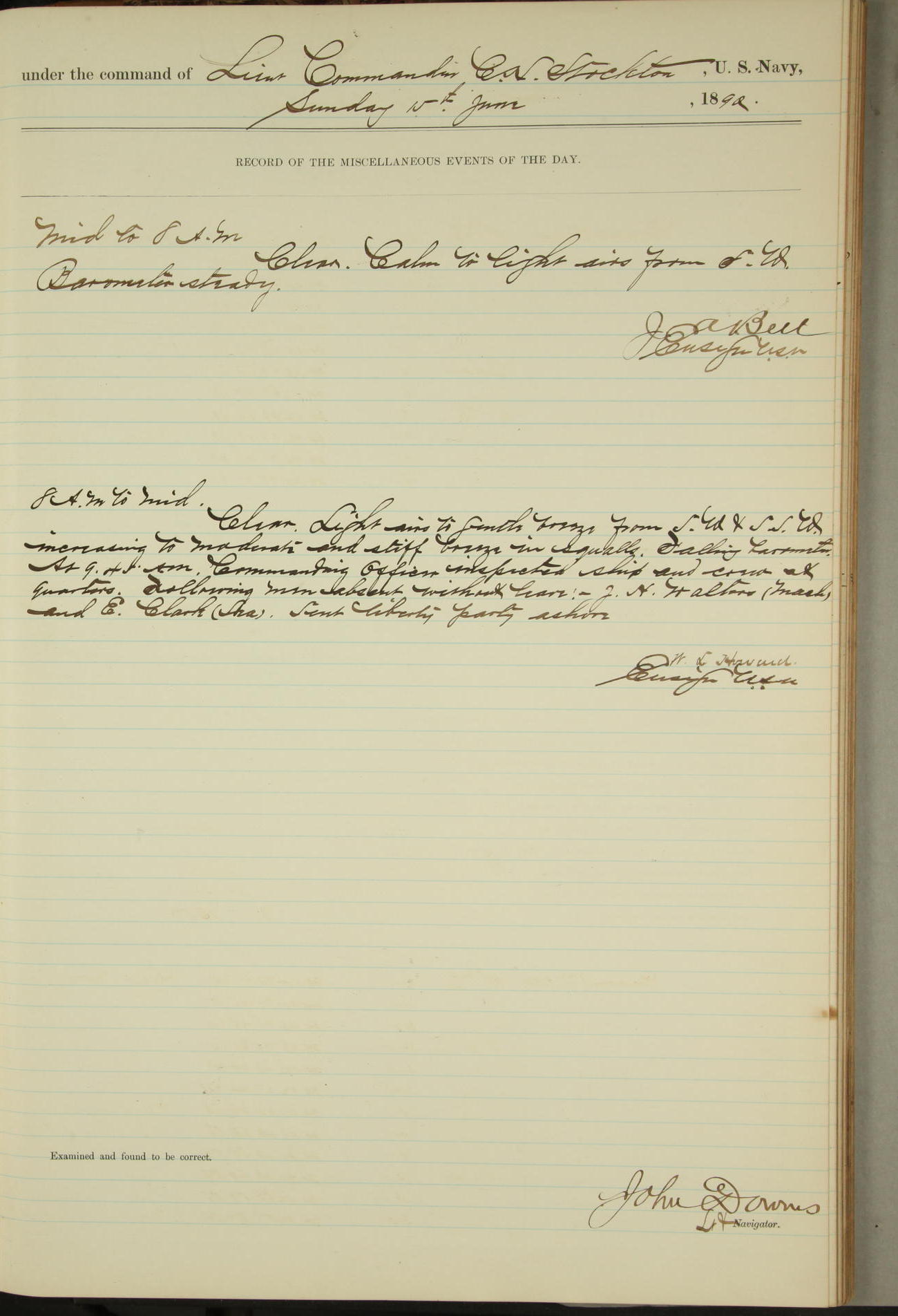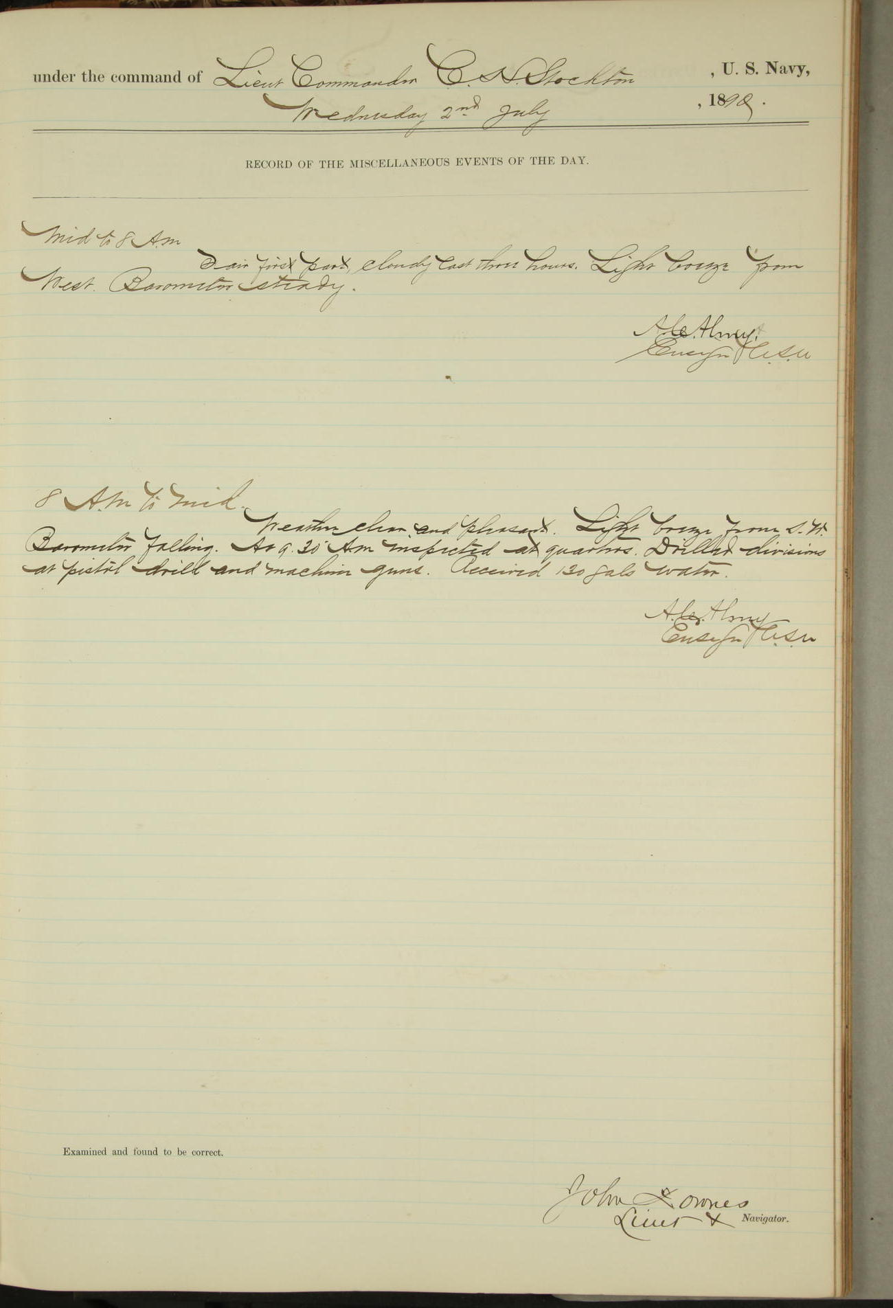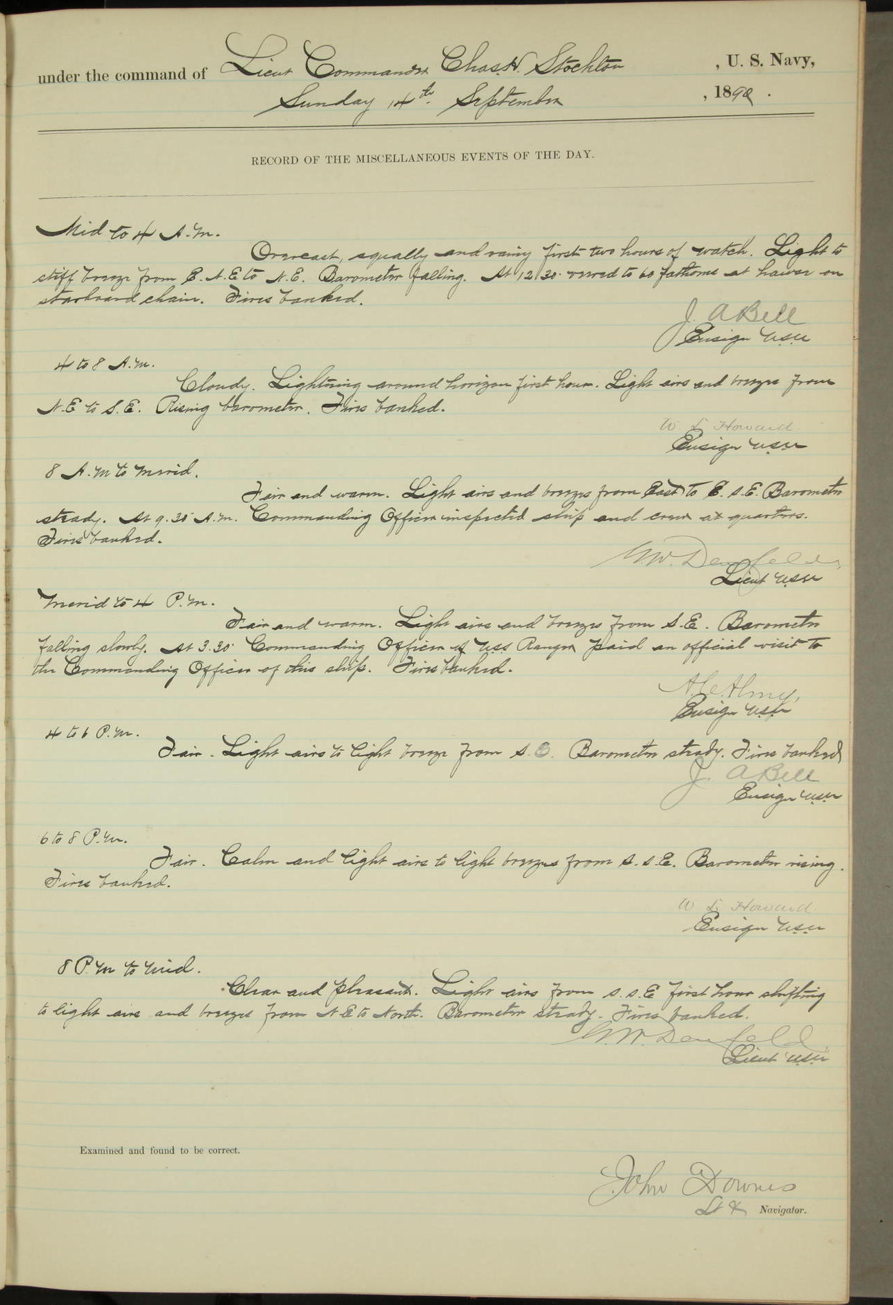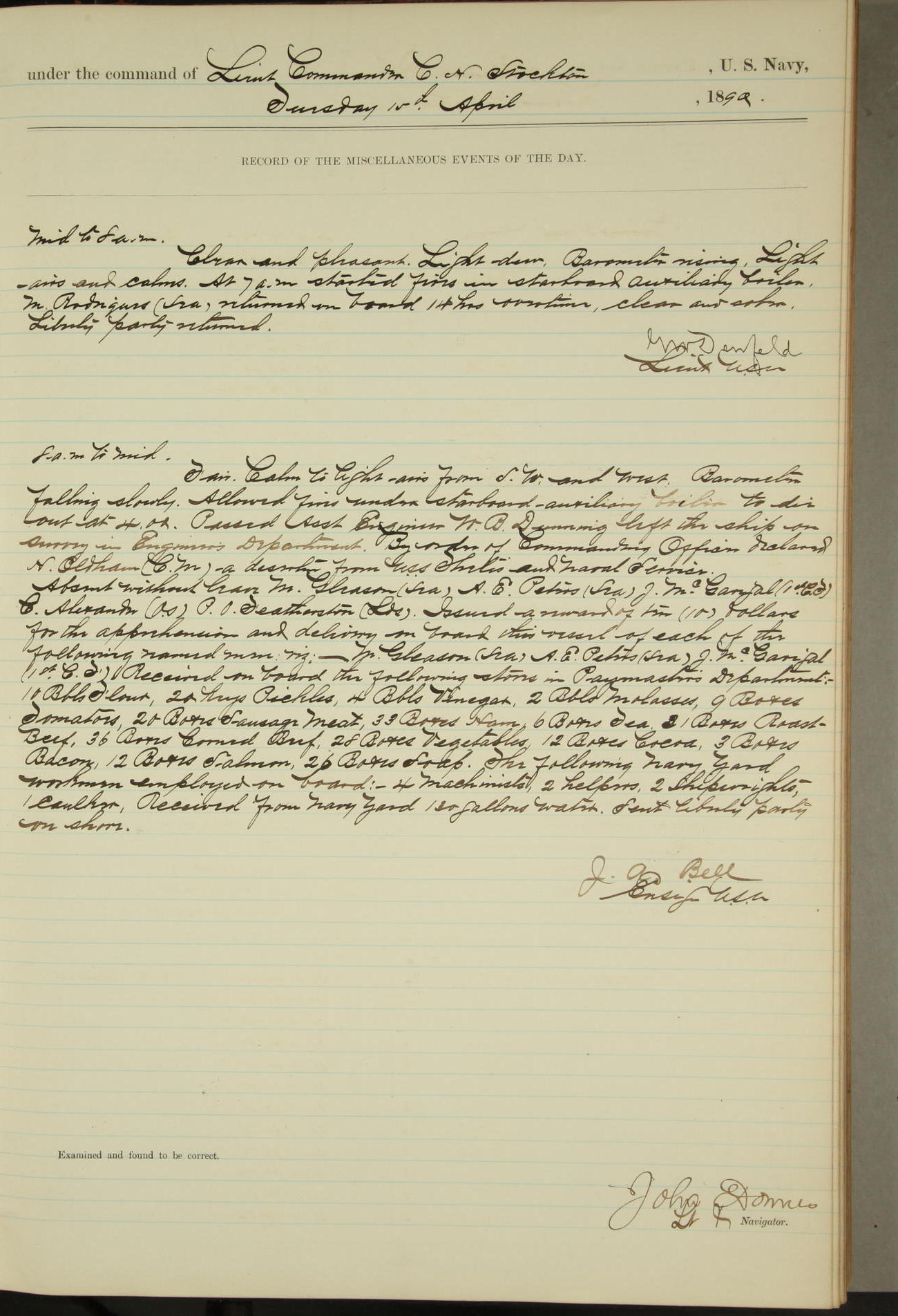 JA Dearborn - At 10am a Summary Court composed of Ensigns Simpson, Gorgas & Dewey as members with Asst Paymaster Lovell as Recorder convened for the tial of JA Dearborn (CH). The court adjourned at 11.20 to await the action of the Comd'g Officer.