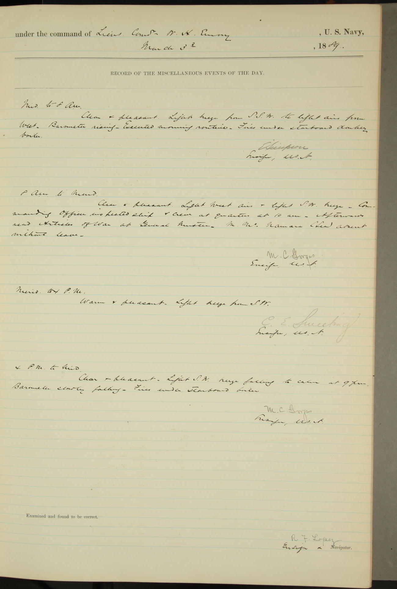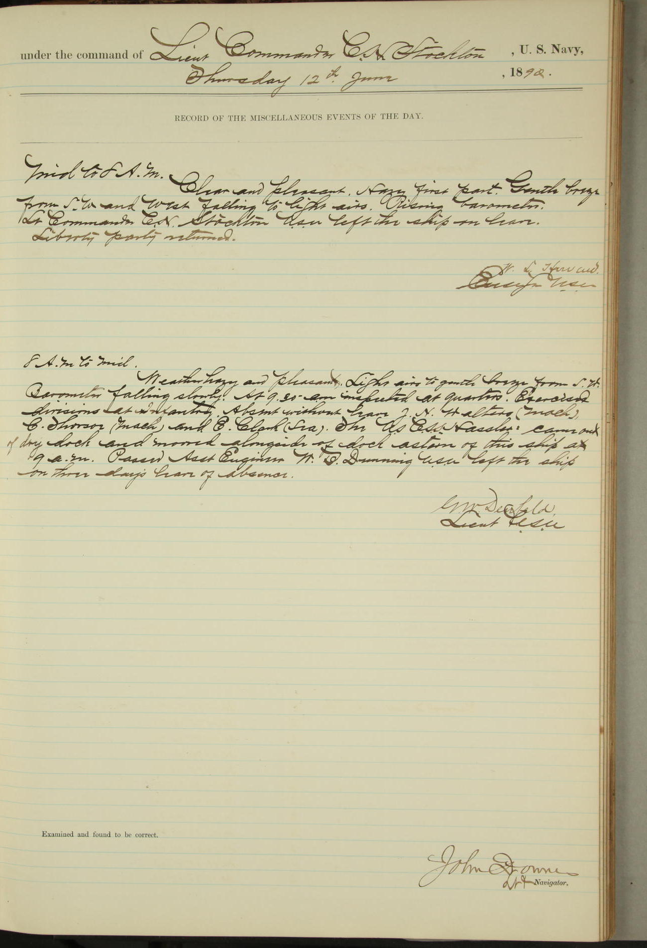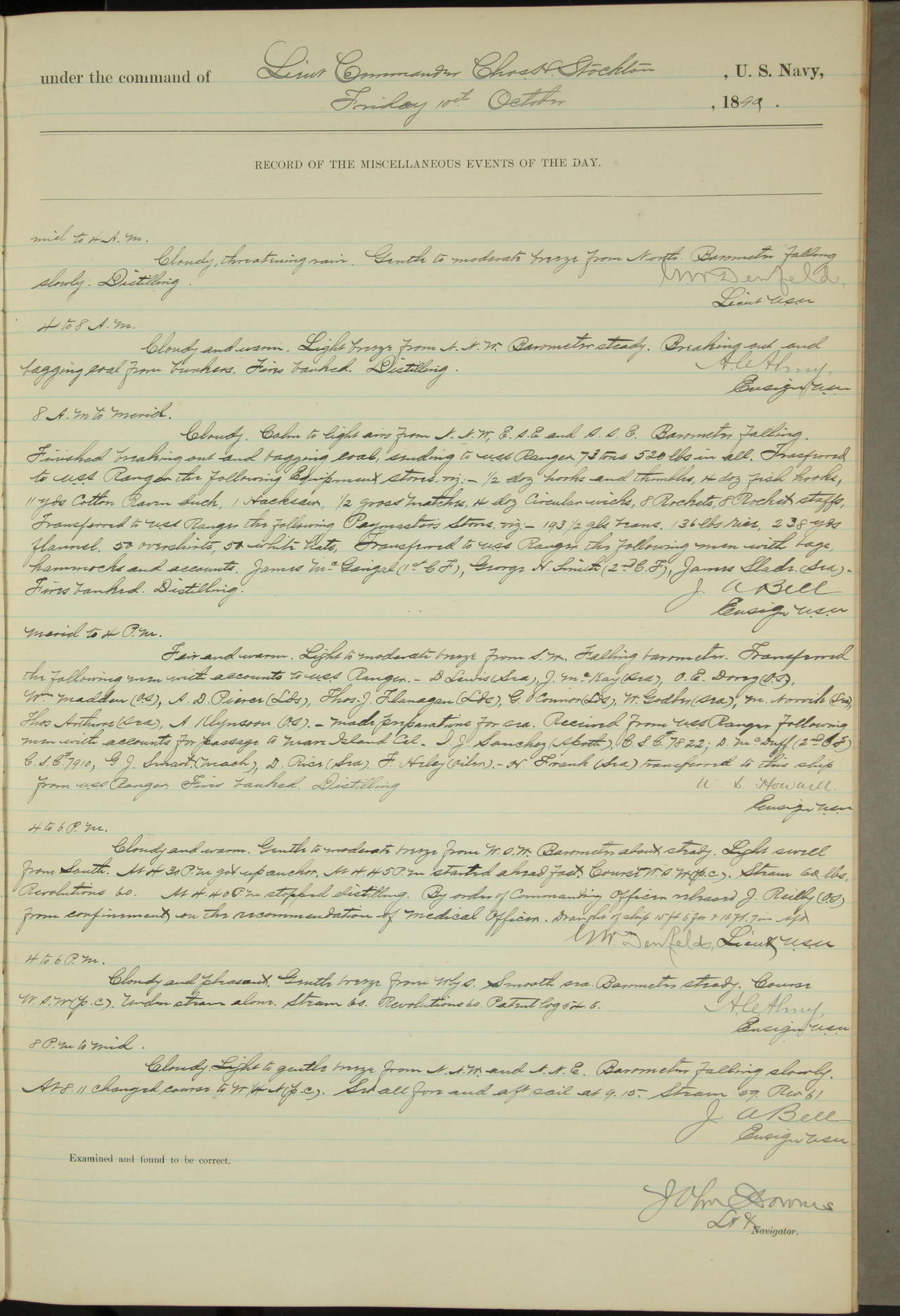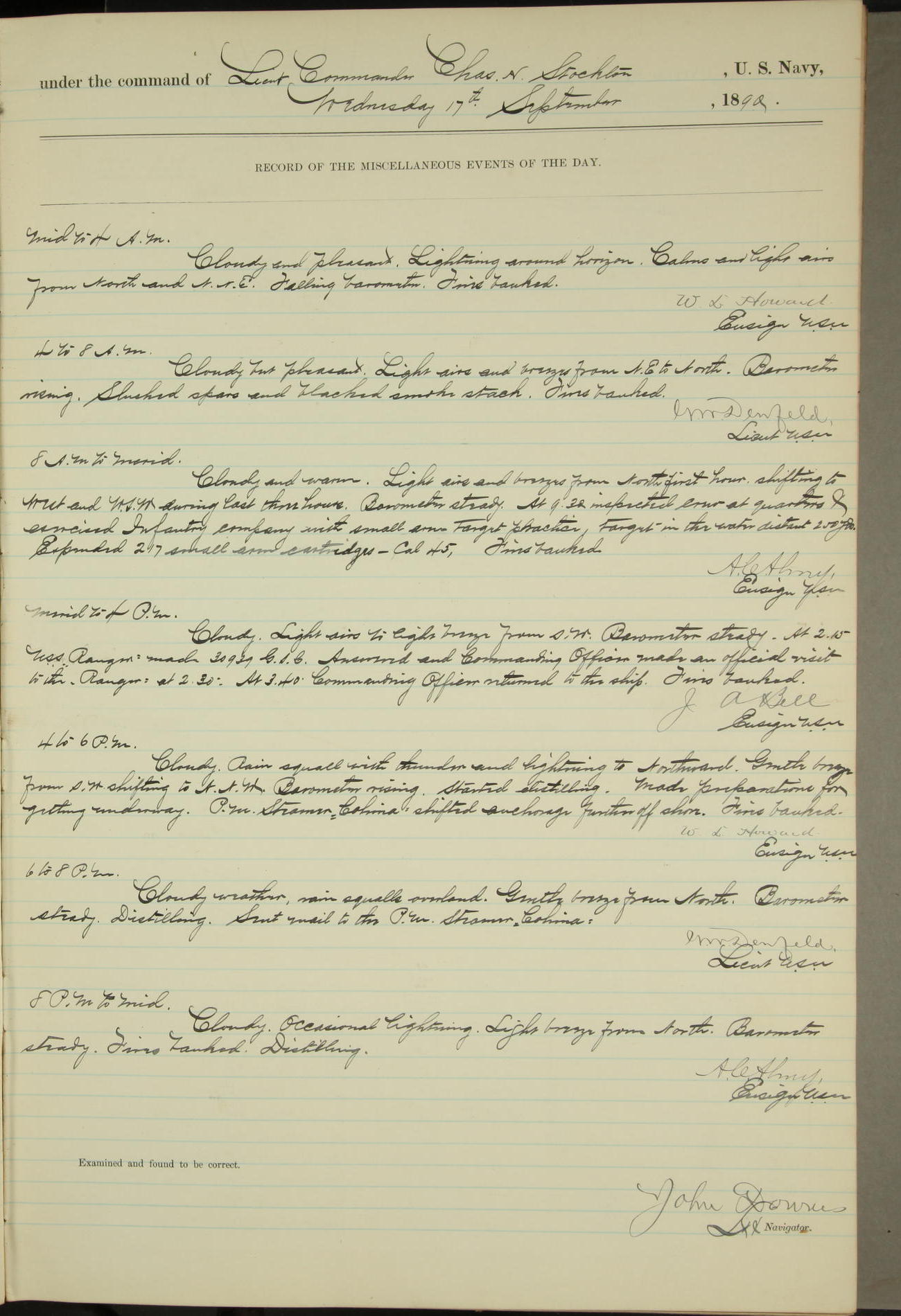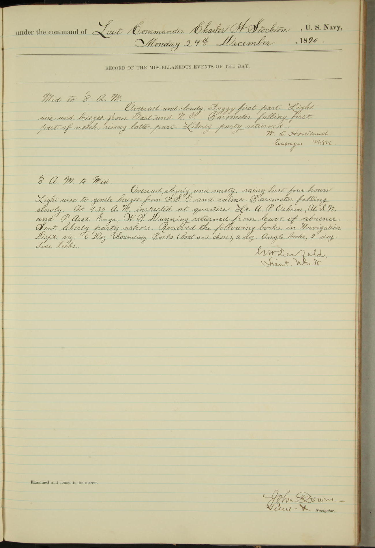 JA Dearborn - At 10am a Summary Court composed of Ensigns Simpson, Gorgas & Dewey as members with Asst Paymaster Lovell as Recorder convened for the tial of JA Dearborn (CH). The court adjourned at 11.20 to await the action of the Comd'g Officer.