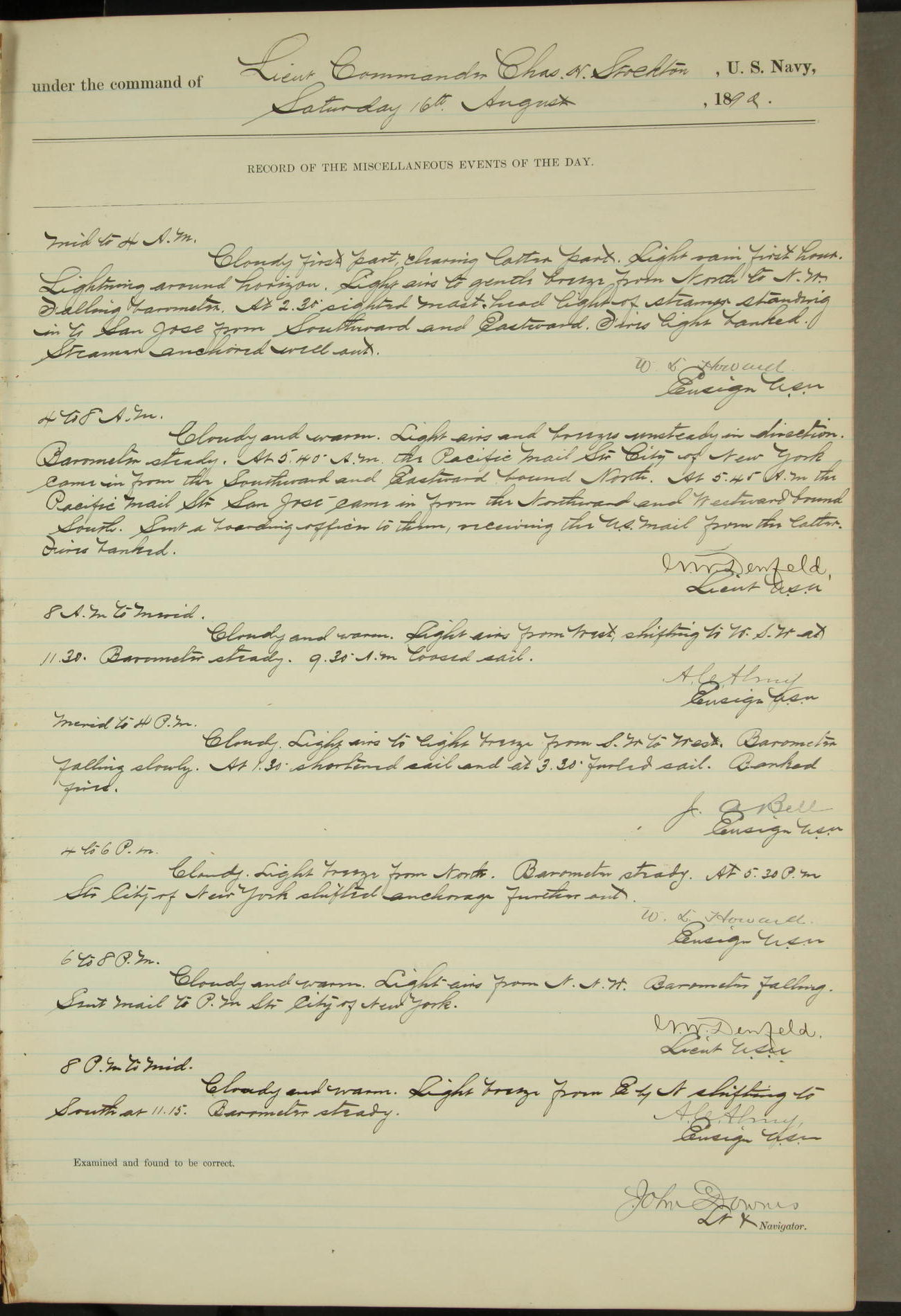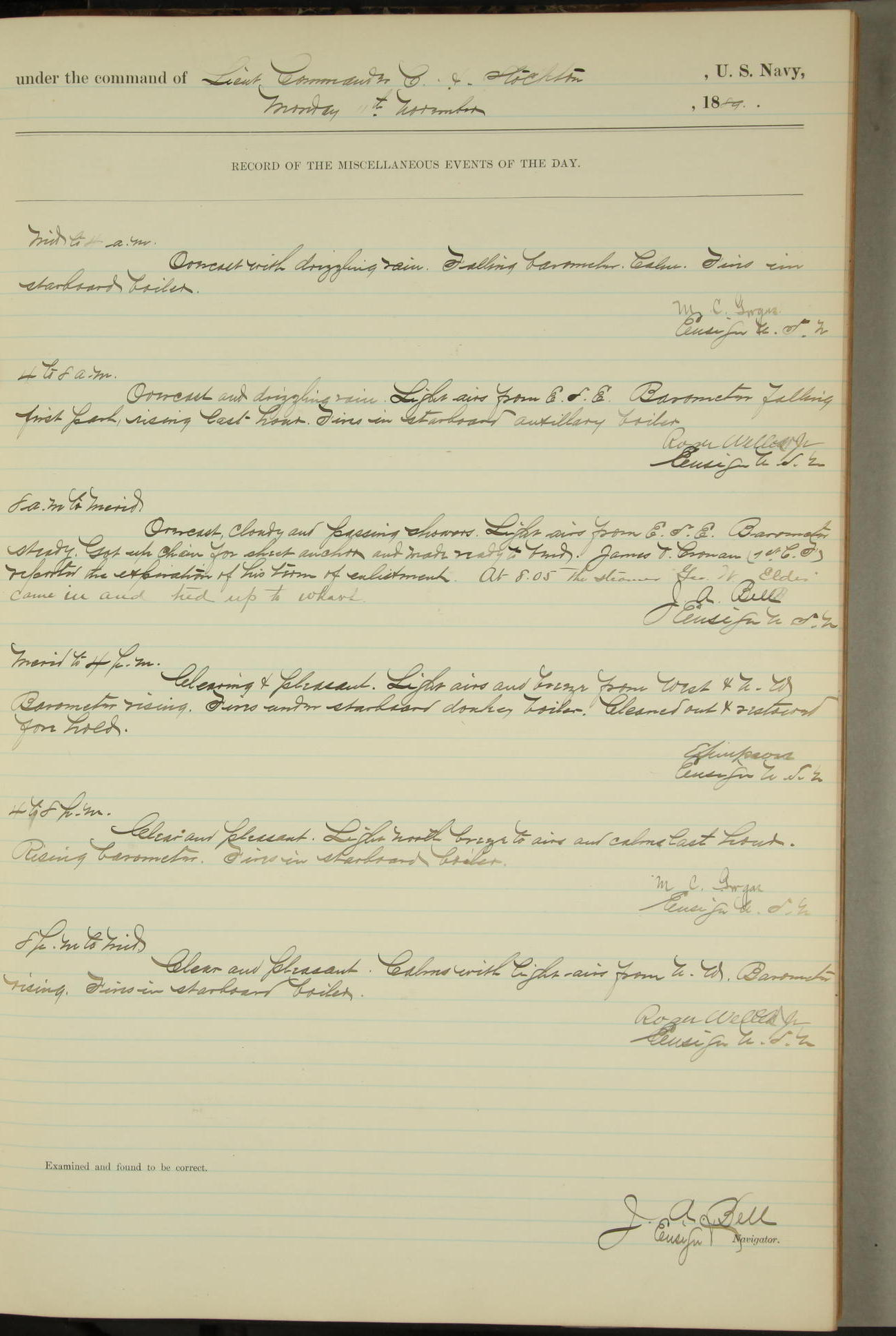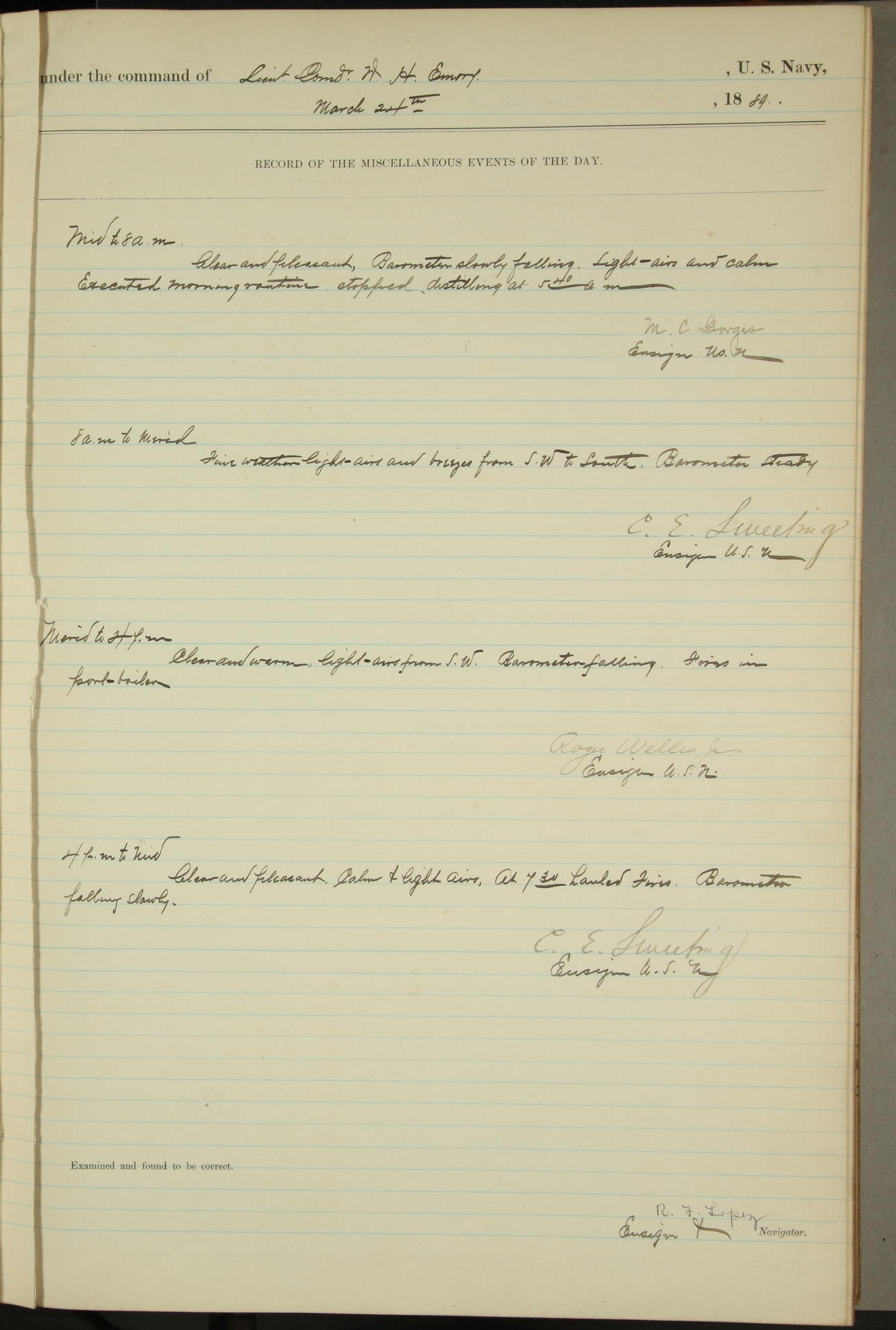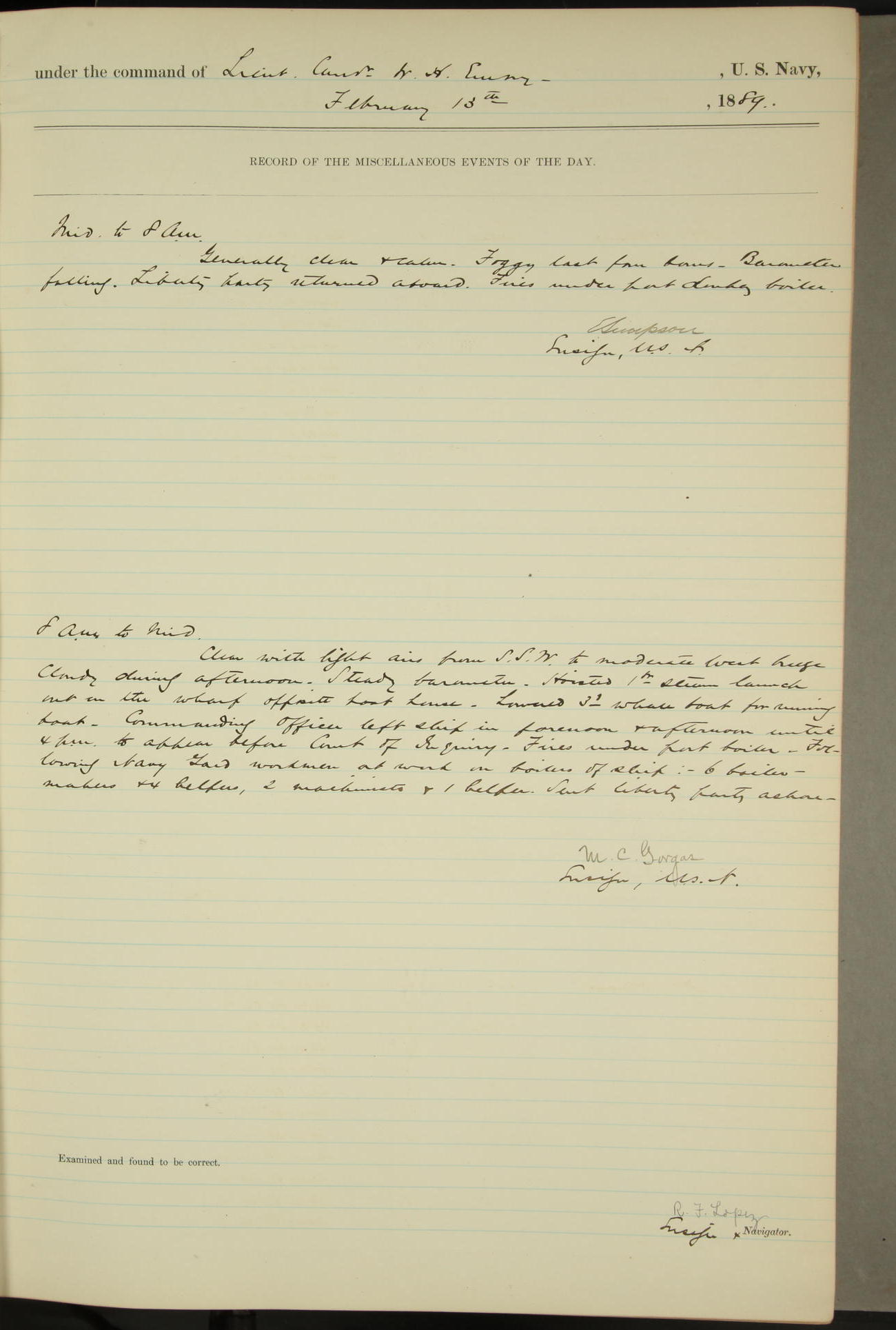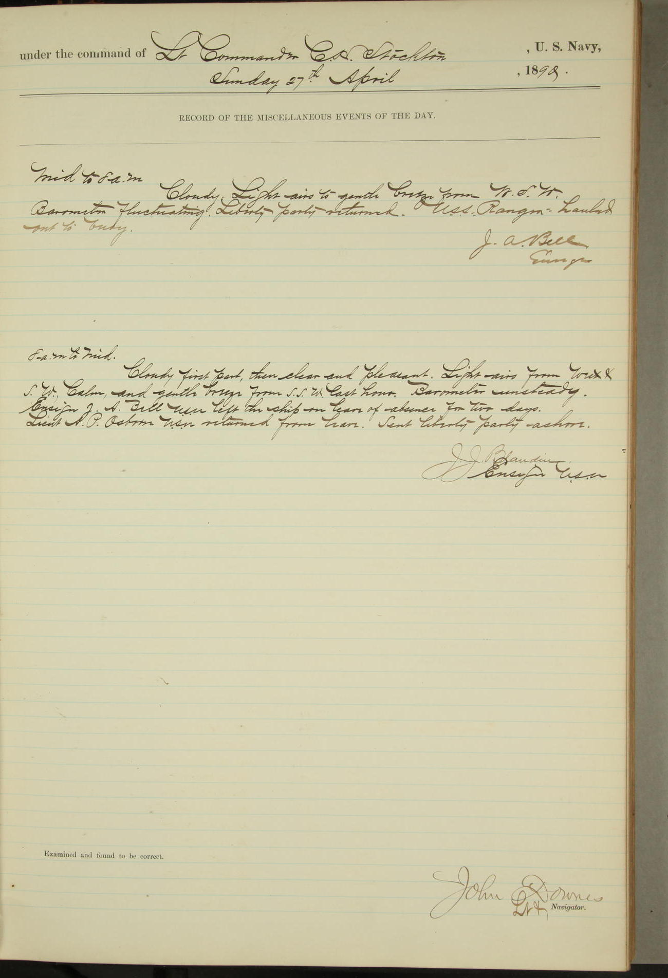JA Dearborn - At 10am a Summary Court composed of Ensigns Simpson, Gorgas & Dewey as members with Asst Paymaster Lovell as Recorder convened for the tial of JA Dearborn (CH). The court adjourned at 11.20 to await the action of the Comd'g Officer.