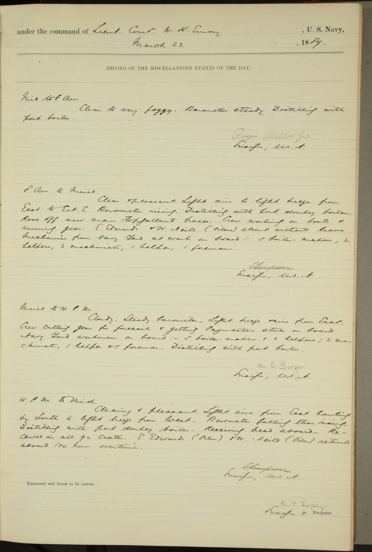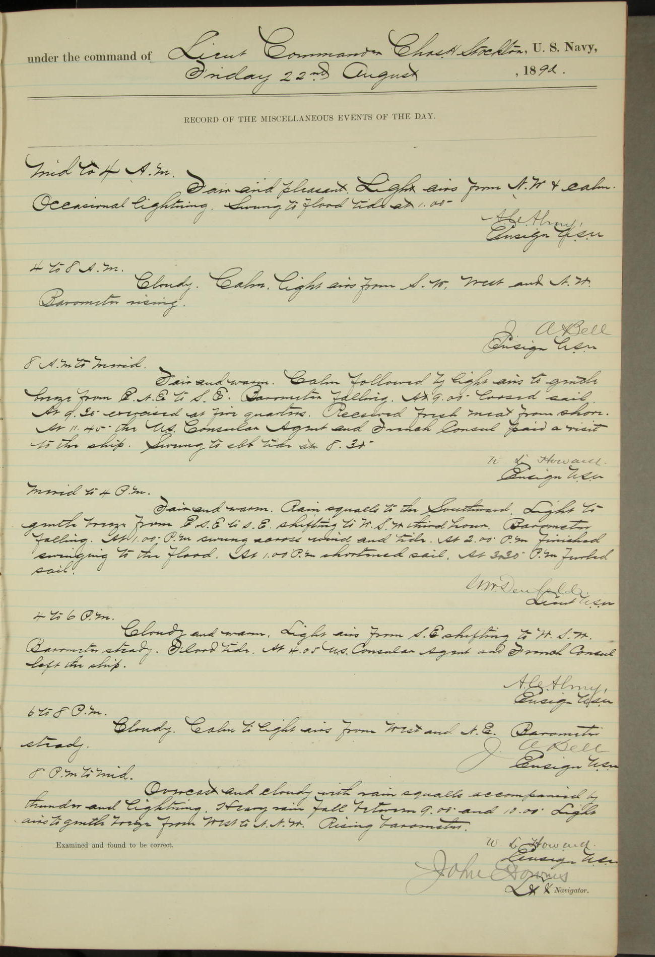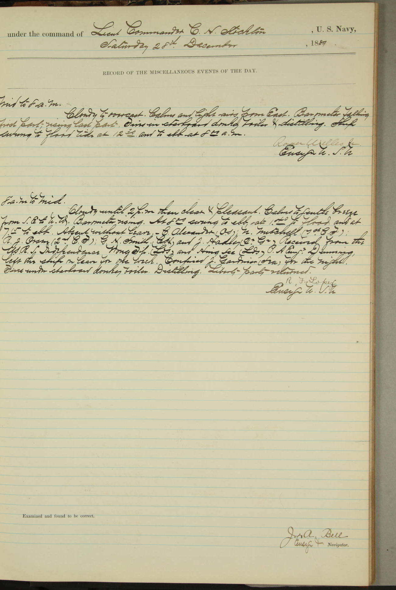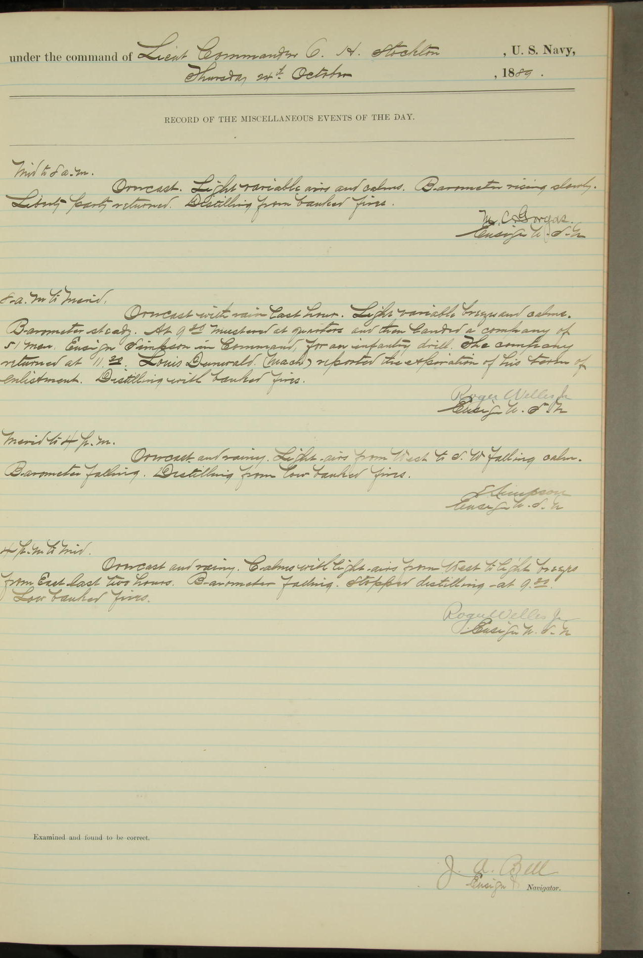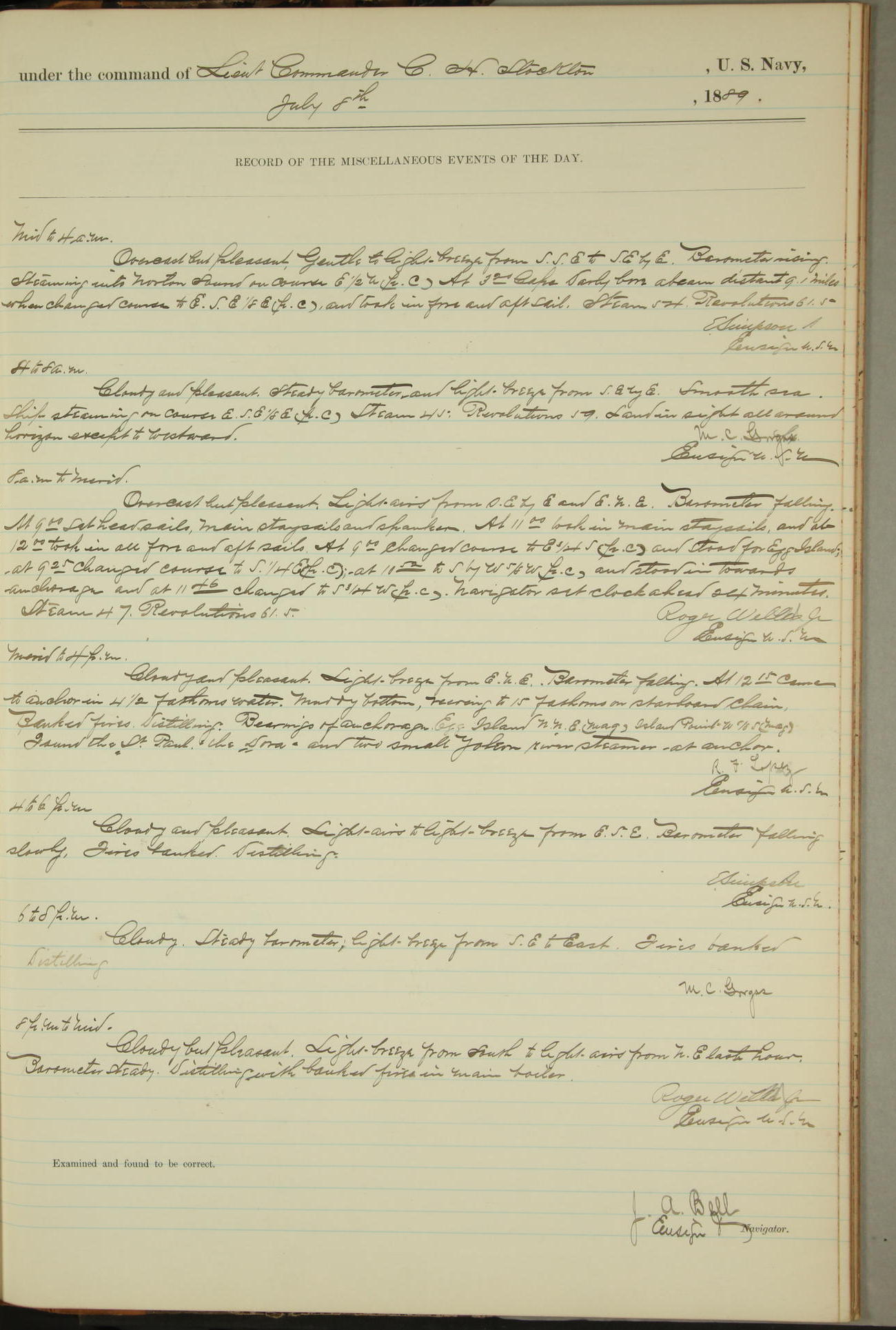 JA Dearborn - At 10am a Summary Court composed of Ensigns Simpson, Gorgas & Dewey as members with Asst Paymaster Lovell as Recorder convened for the tial of JA Dearborn (CH). The court adjourned at 11.20 to await the action of the Comd'g Officer.