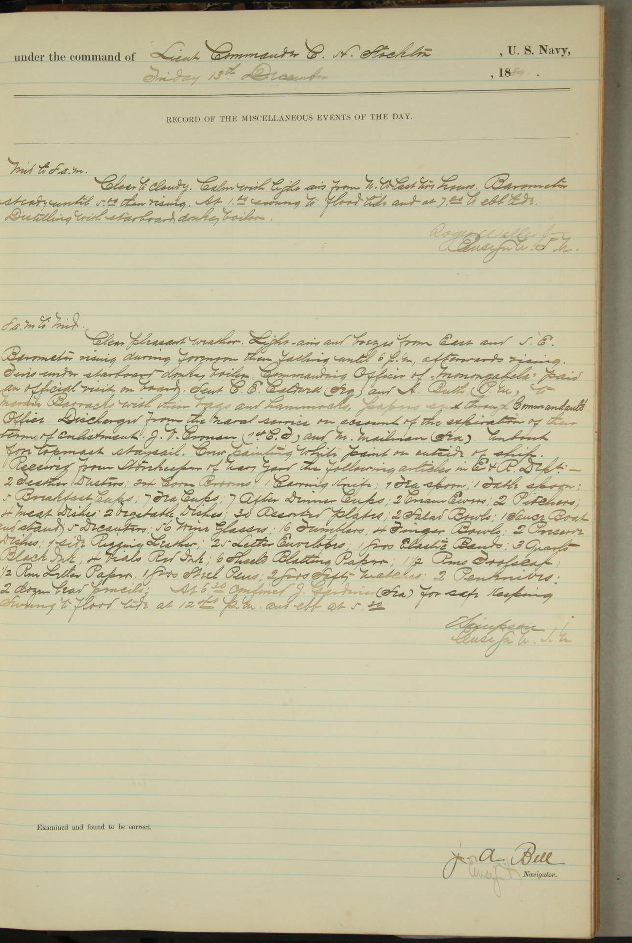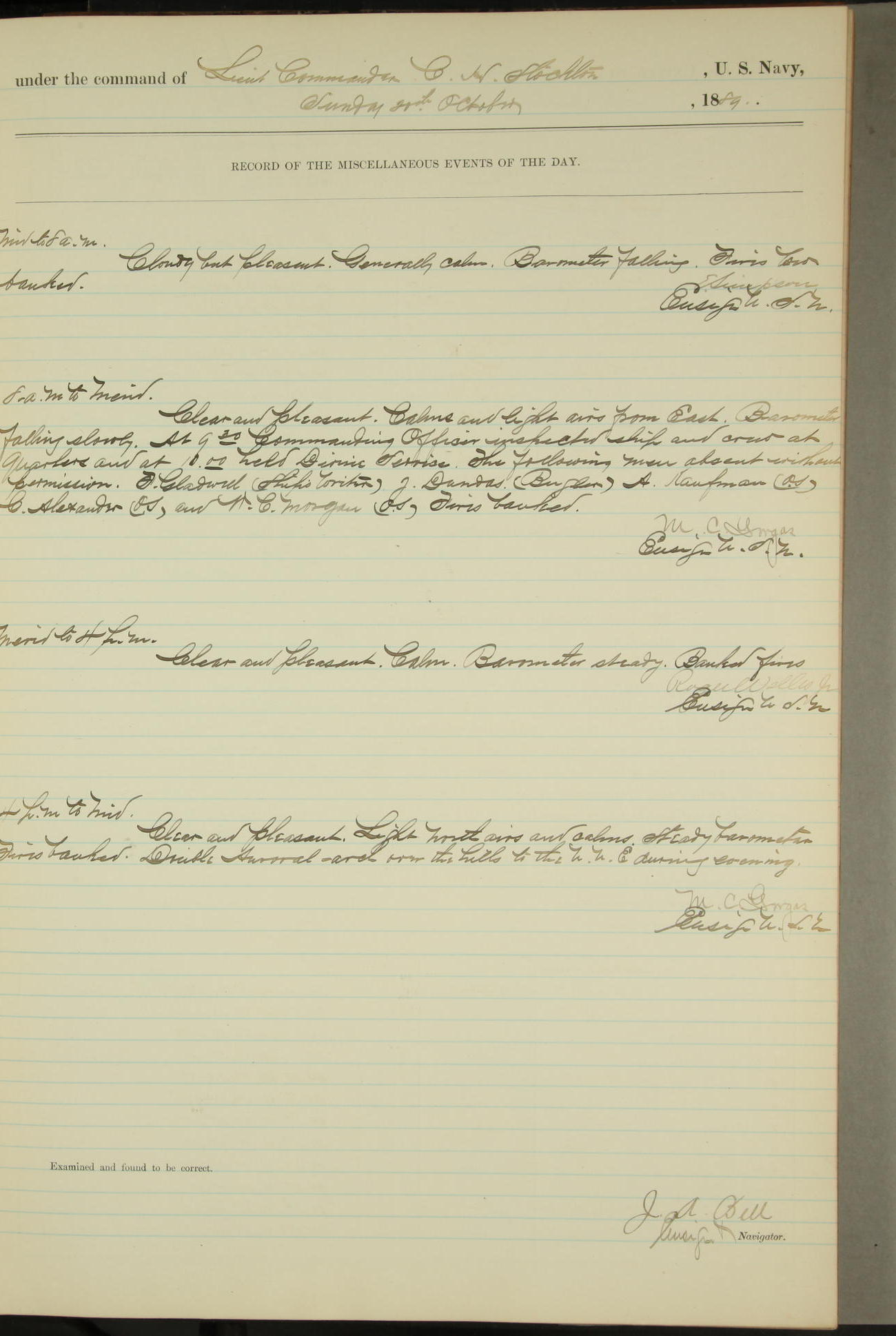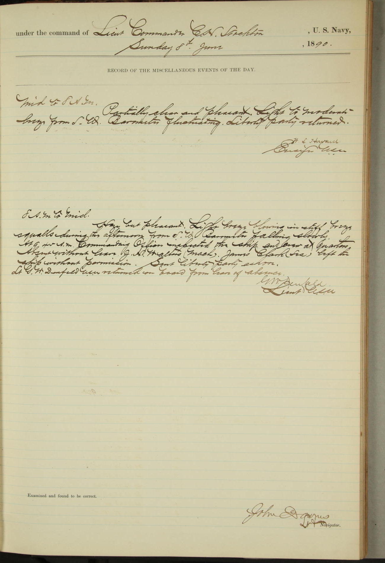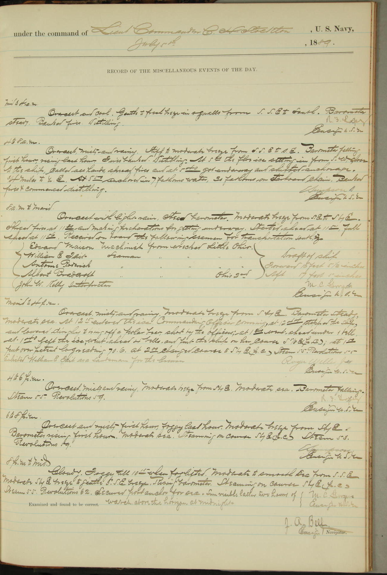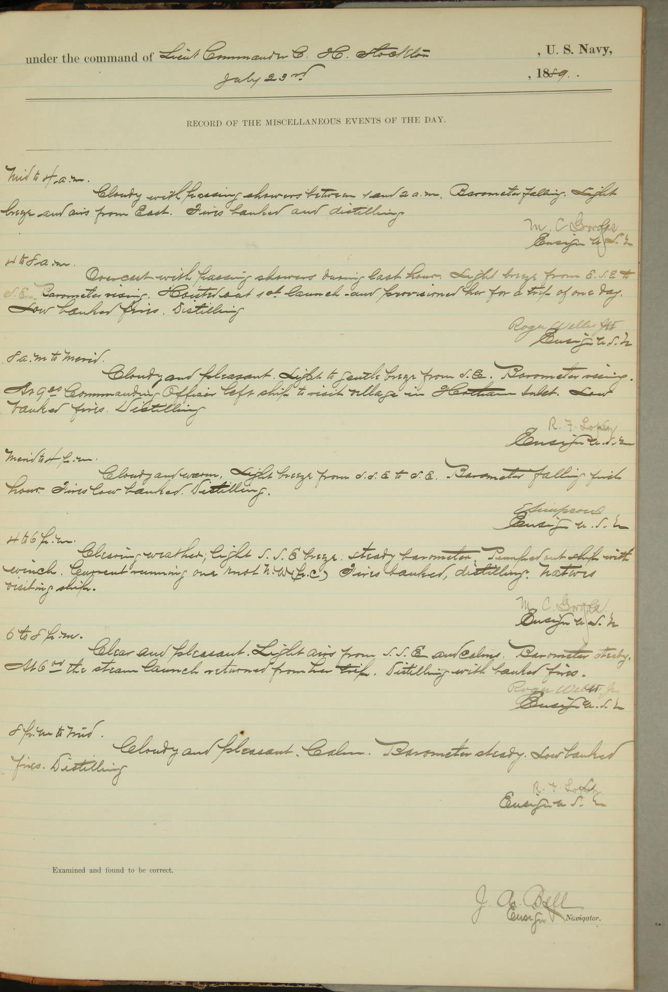 JA Dearborn - At 10am a Summary Court composed of Ensigns Simpson, Gorgas & Dewey as members with Asst Paymaster Lovell as Recorder convened for the tial of JA Dearborn (CH). The court adjourned at 11.20 to await the action of the Comd'g Officer.