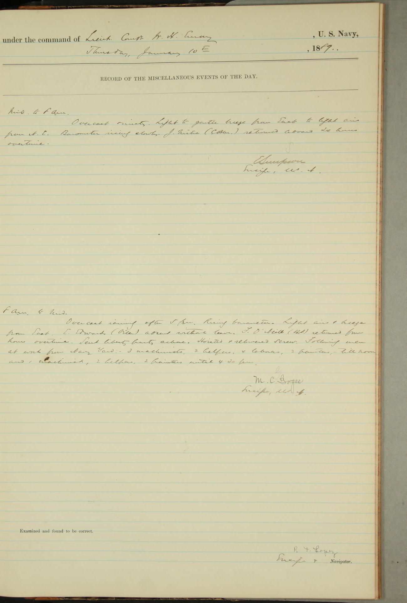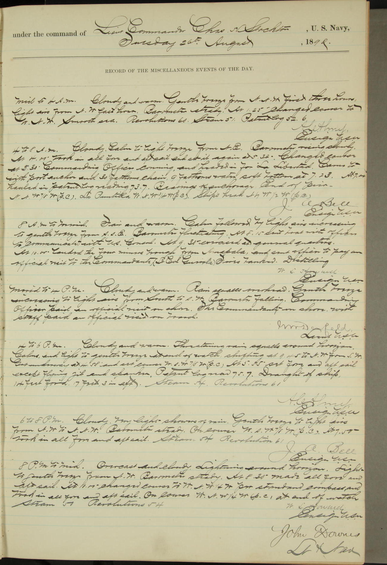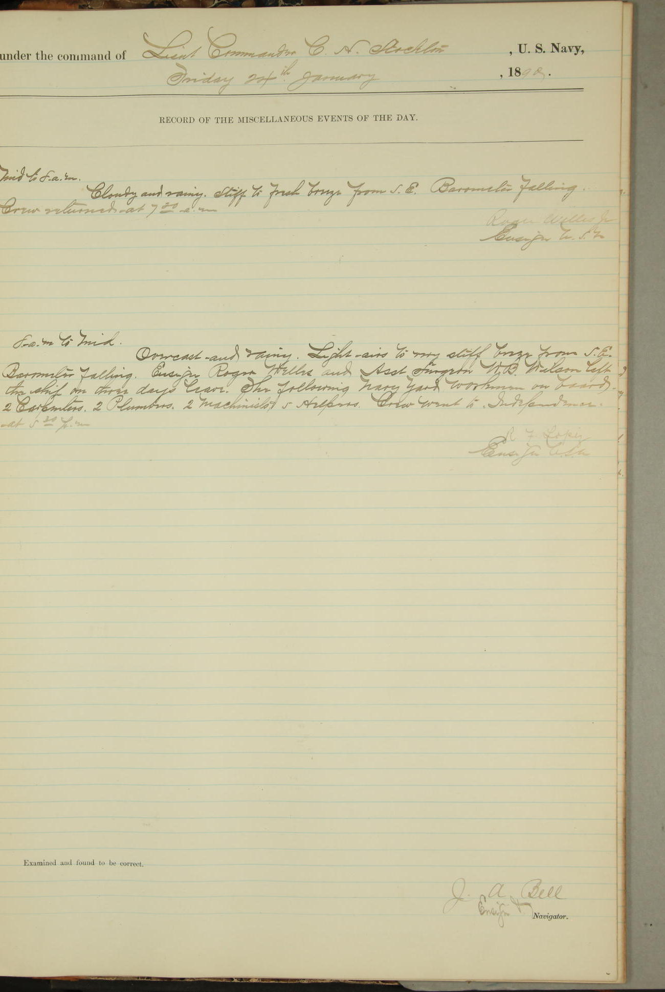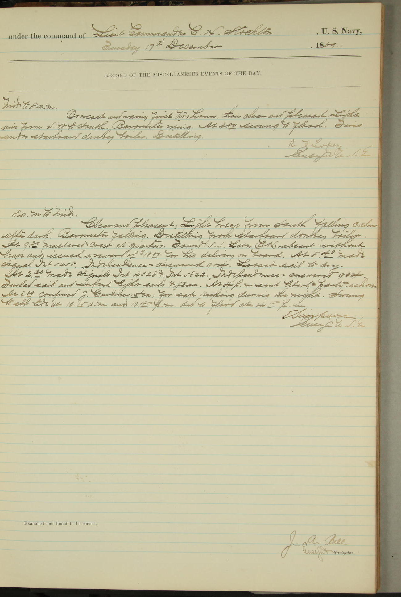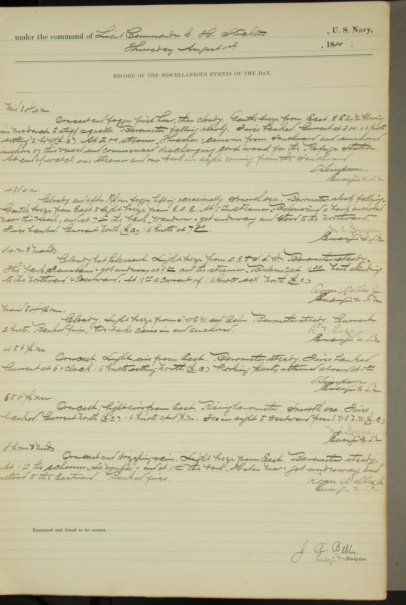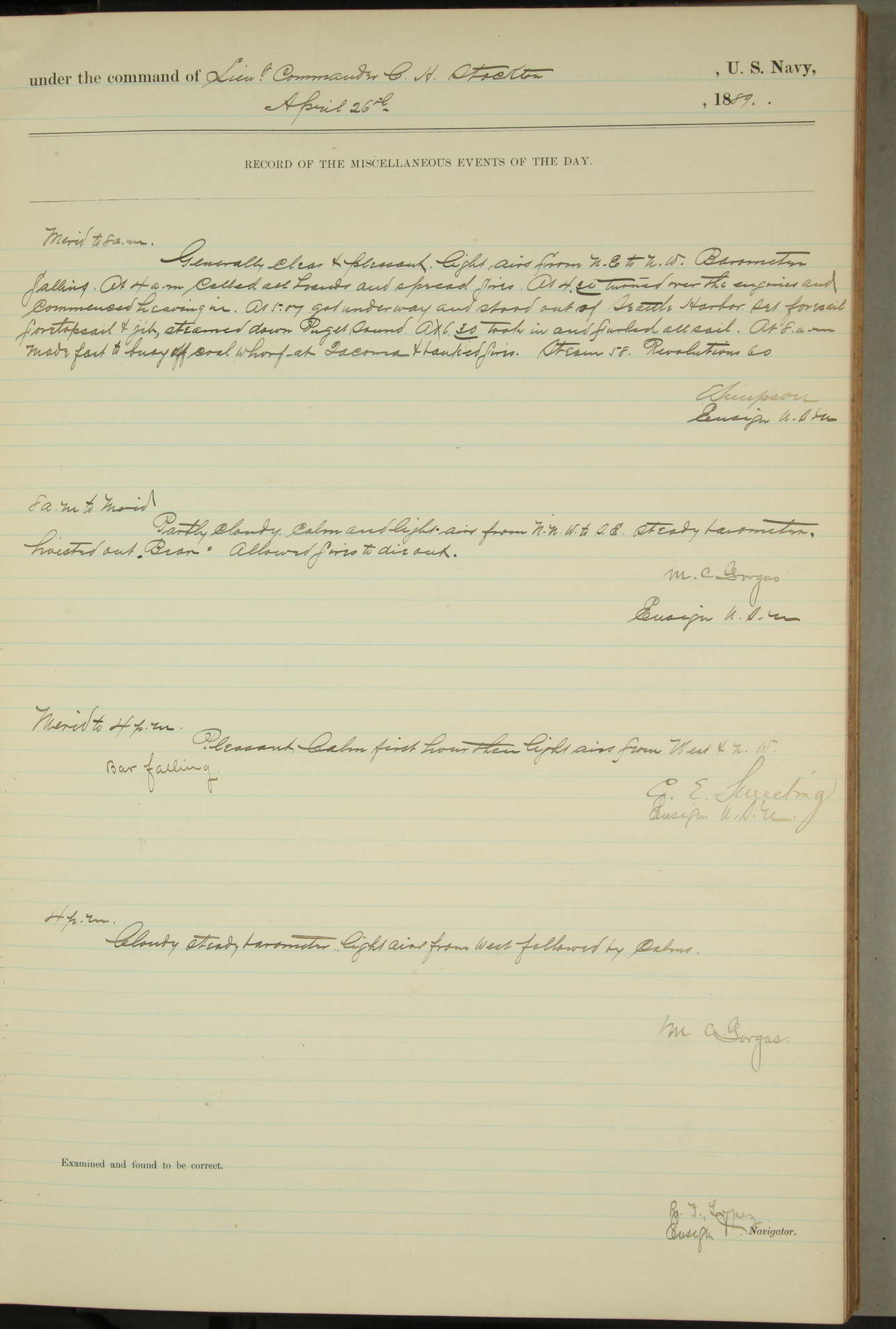 JA Dearborn - At 10am a Summary Court composed of Ensigns Simpson, Gorgas & Dewey as members with Asst Paymaster Lovell as Recorder convened for the tial of JA Dearborn (CH). The court adjourned at 11.20 to await the action of the Comd'g Officer.