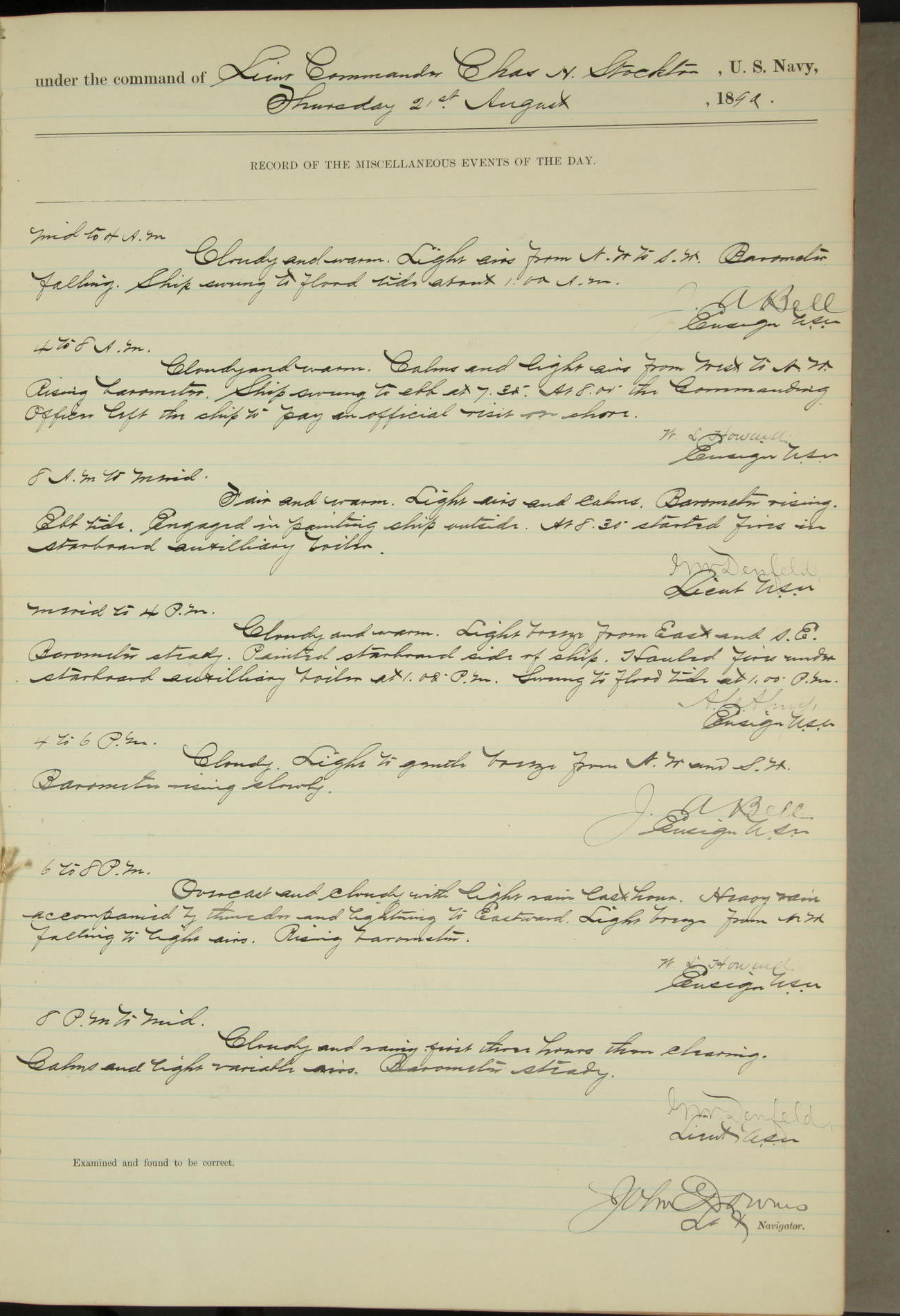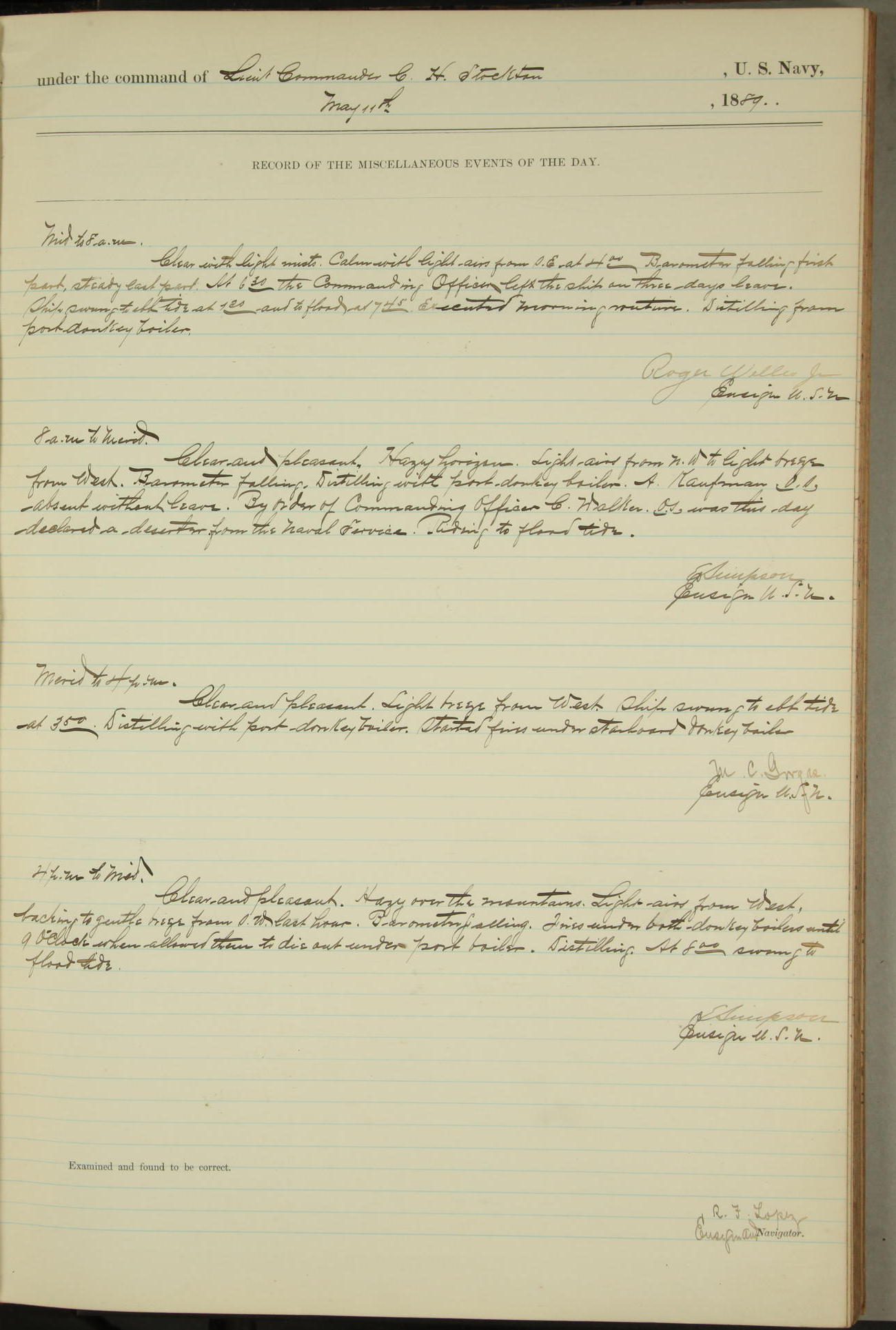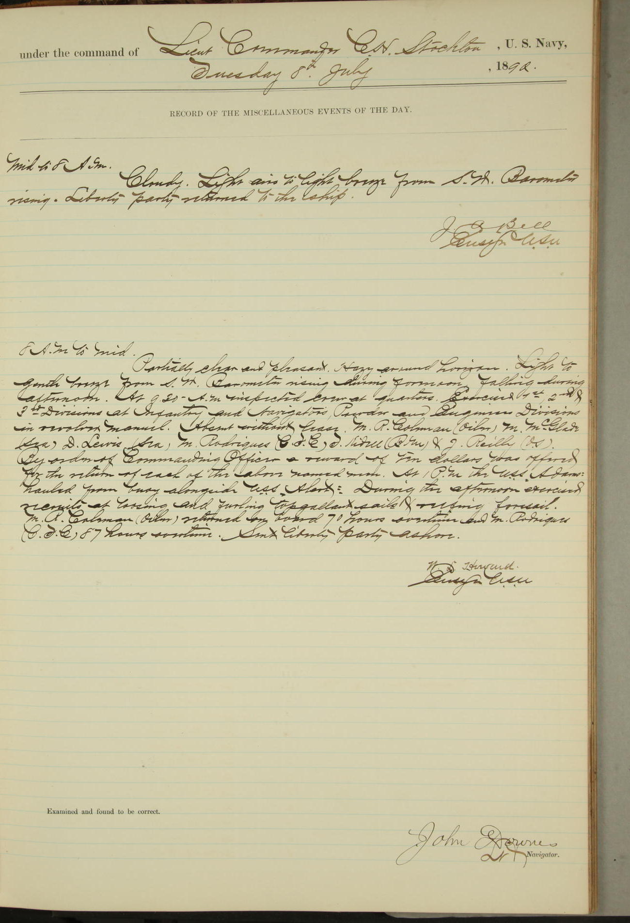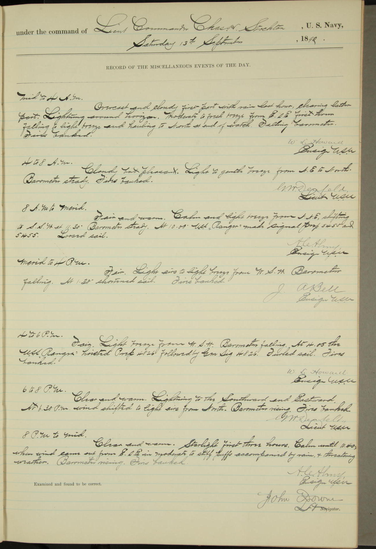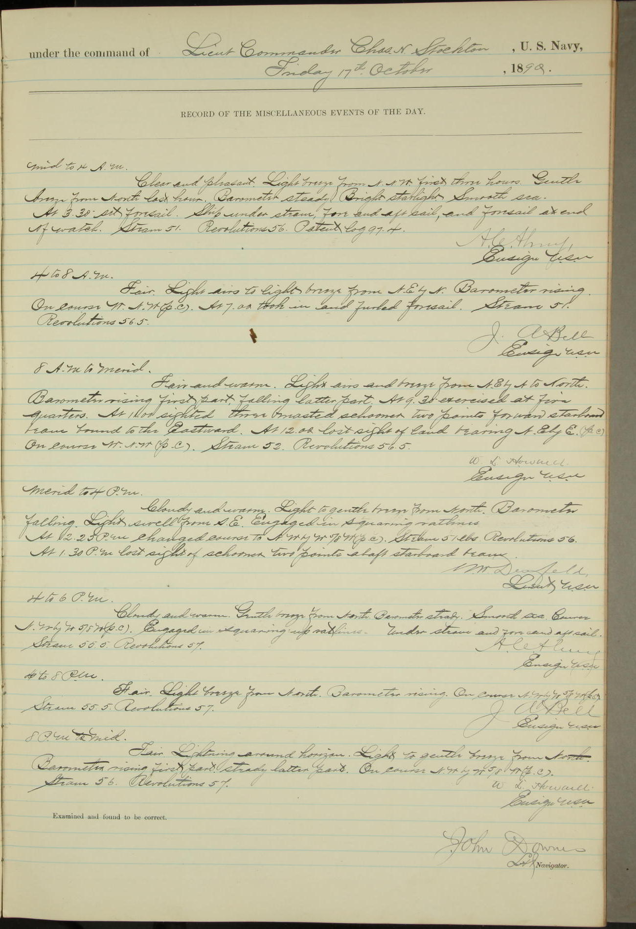 JA Dearborn - At 10am a Summary Court composed of Ensigns Simpson, Gorgas & Dewey as members with Asst Paymaster Lovell as Recorder convened for the tial of JA Dearborn (CH). The court adjourned at 11.20 to await the action of the Comd'g Officer.