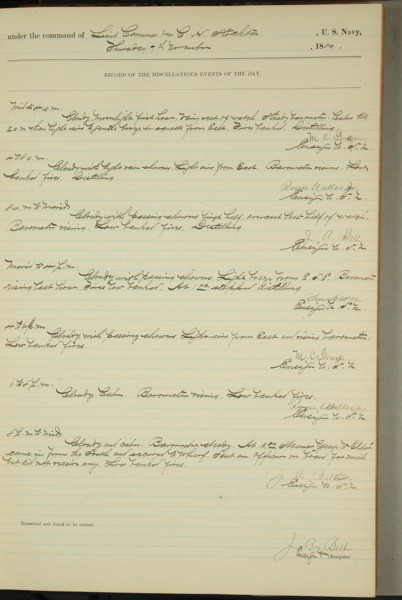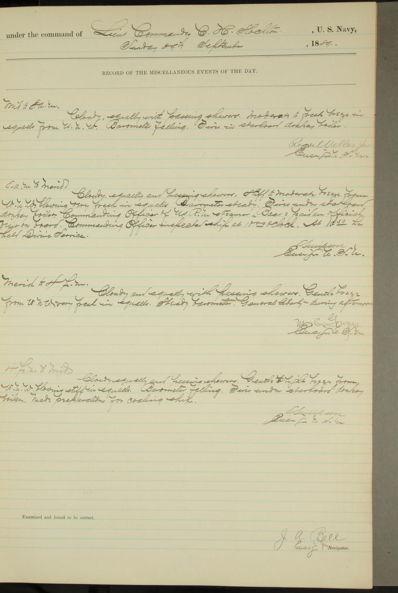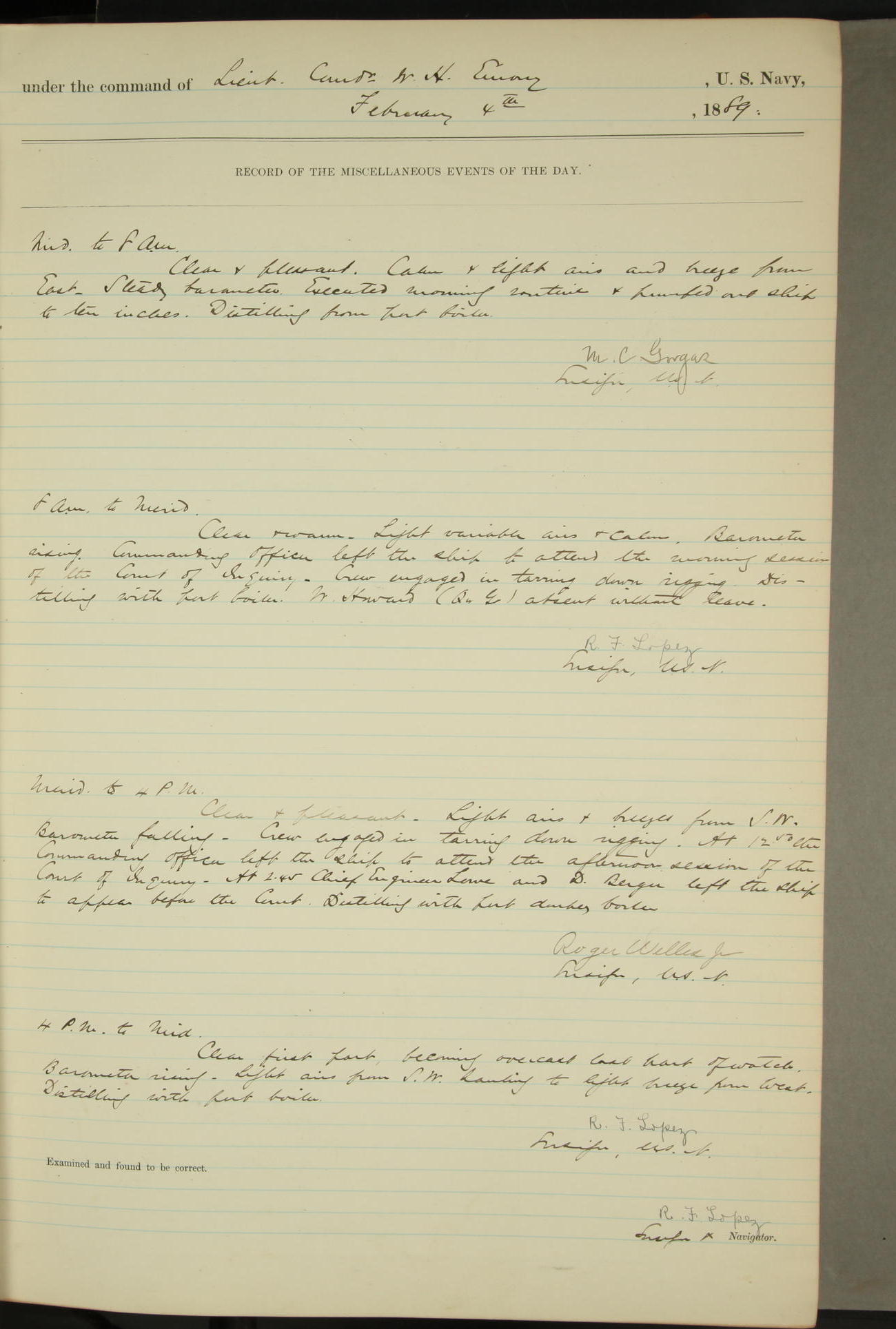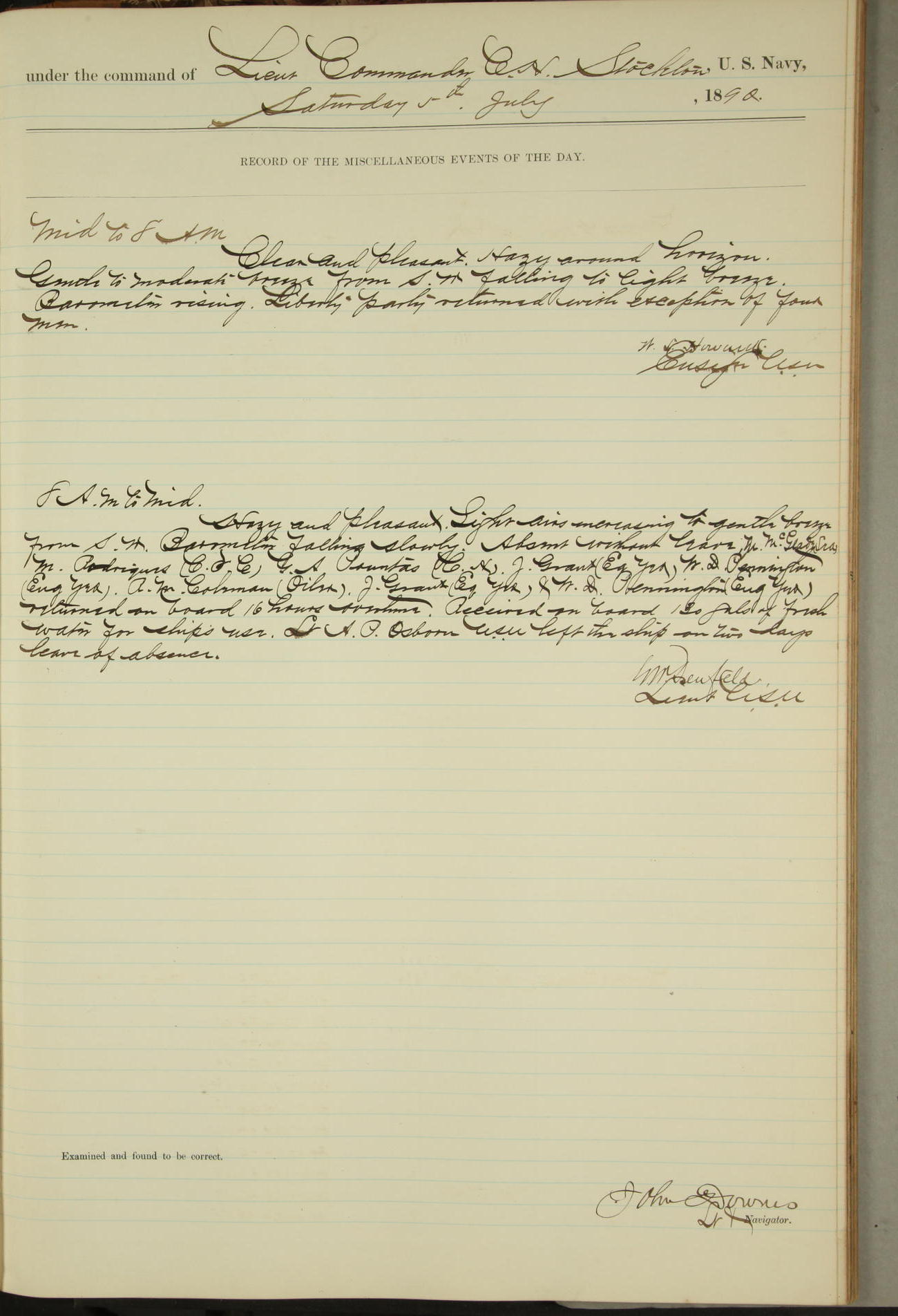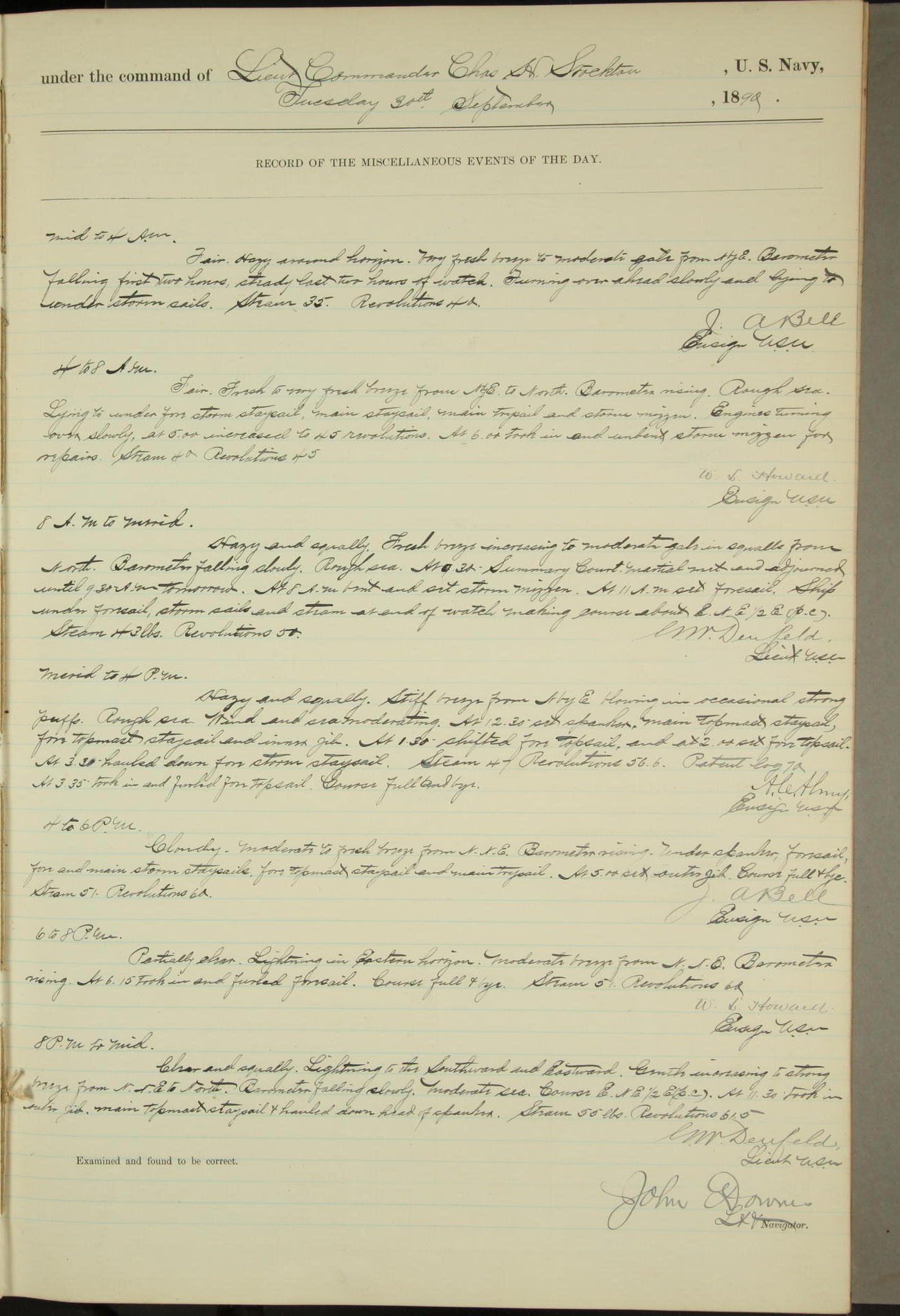 JA Dearborn - At 10am a Summary Court composed of Ensigns Simpson, Gorgas & Dewey as members with Asst Paymaster Lovell as Recorder convened for the tial of JA Dearborn (CH). The court adjourned at 11.20 to await the action of the Comd'g Officer.