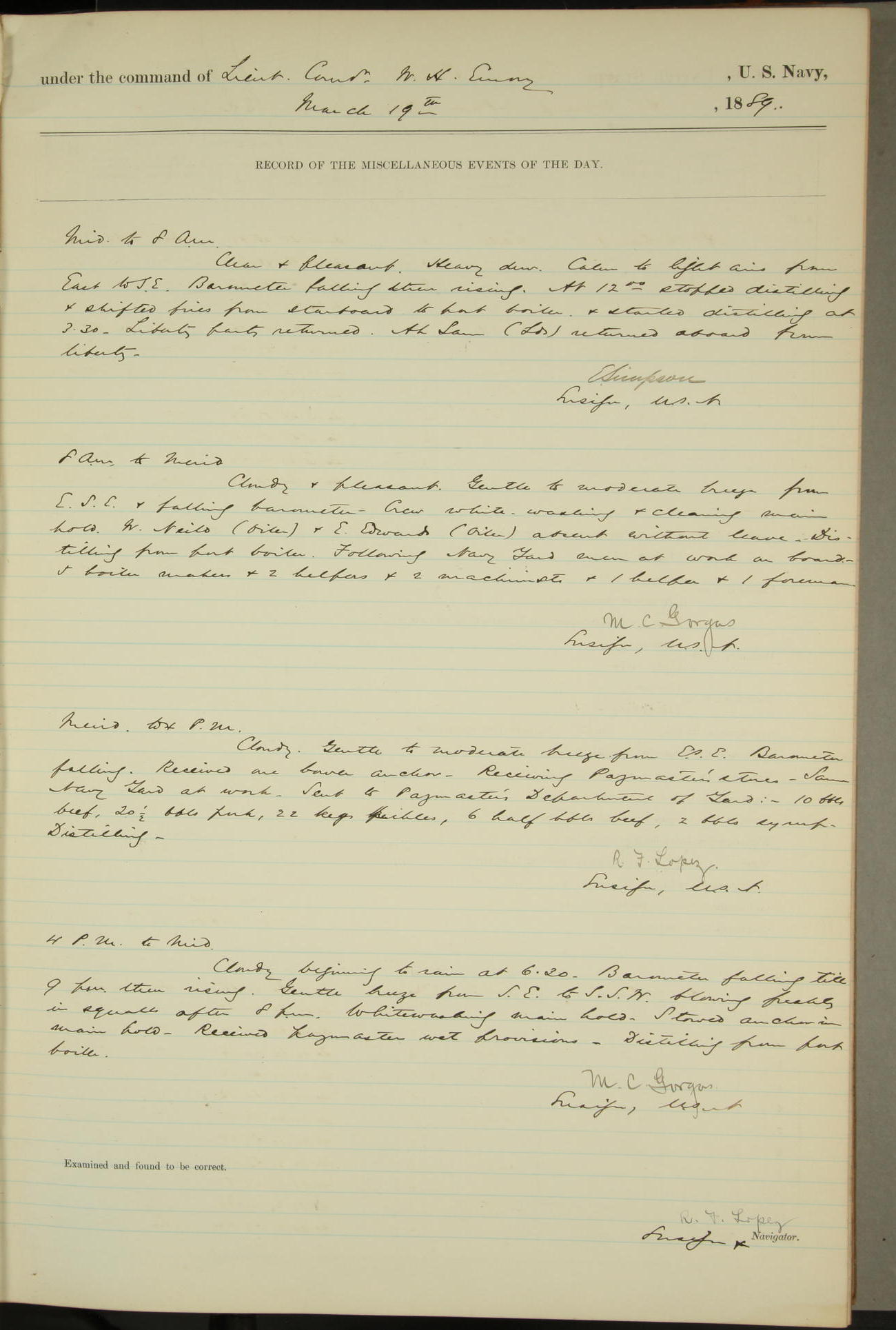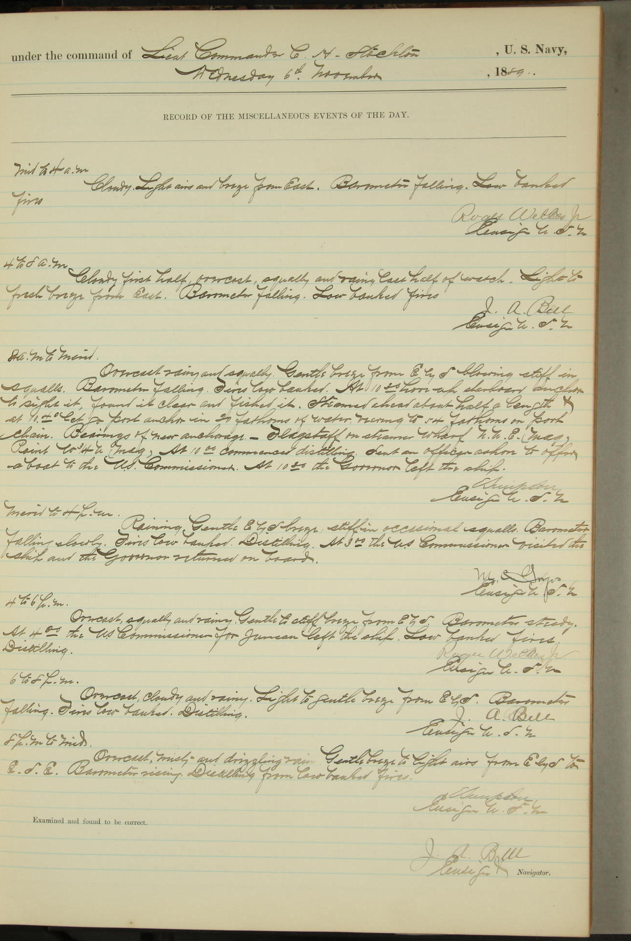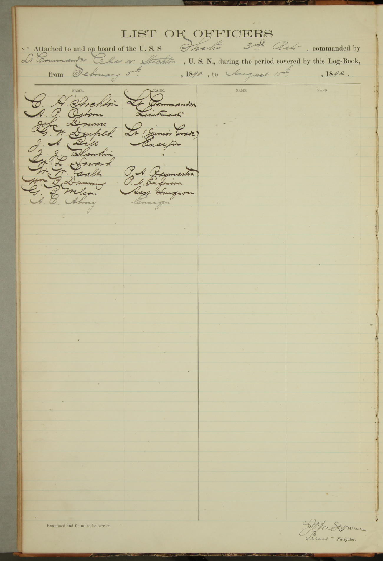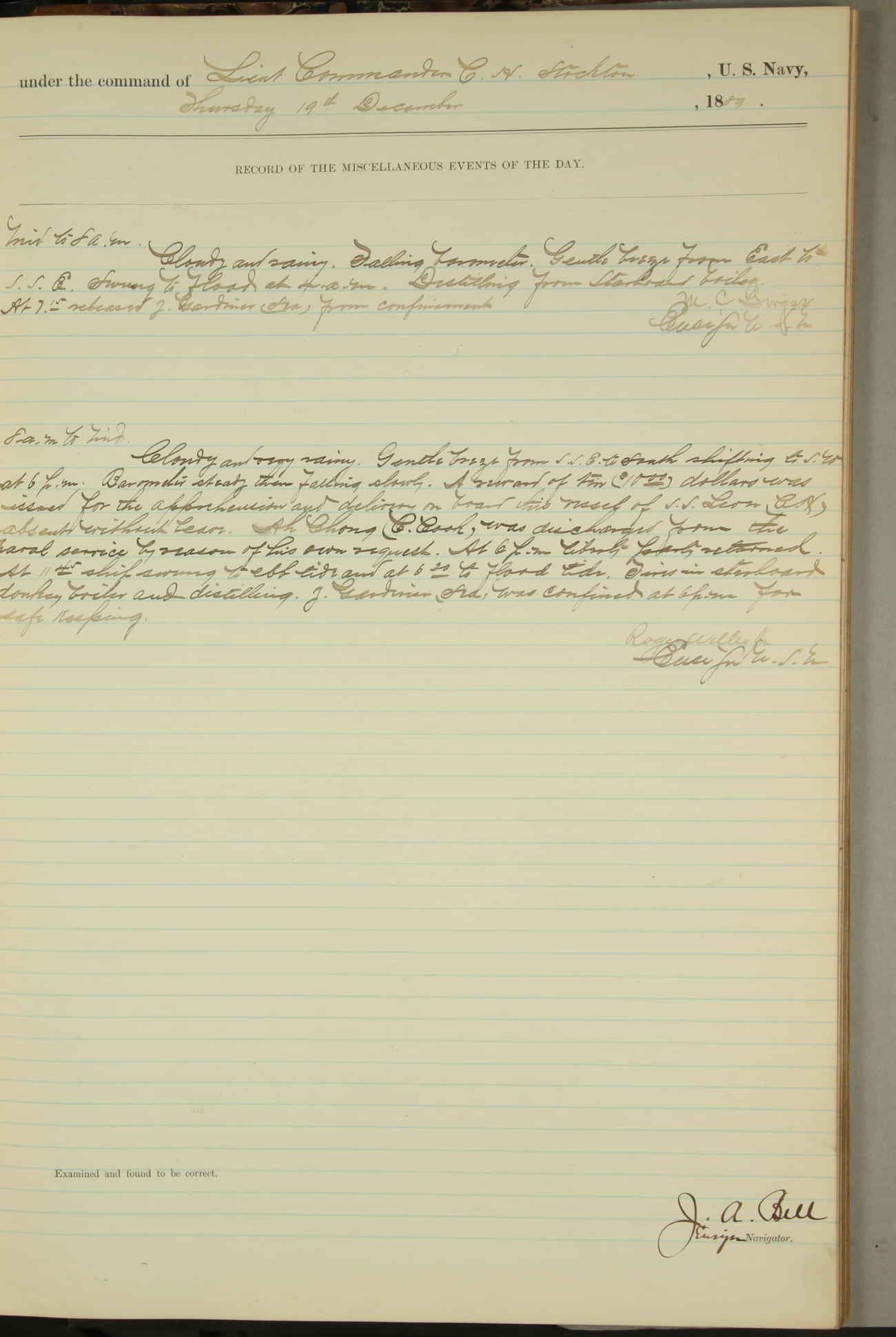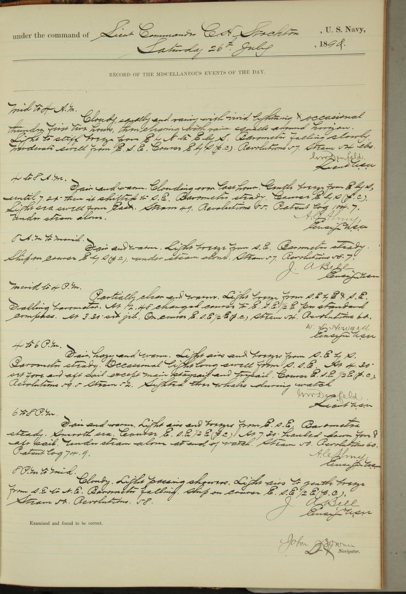 JA Dearborn - At 10am a Summary Court composed of Ensigns Simpson, Gorgas & Dewey as members with Asst Paymaster Lovell as Recorder convened for the tial of JA Dearborn (CH). The court adjourned at 11.20 to await the action of the Comd'g Officer.