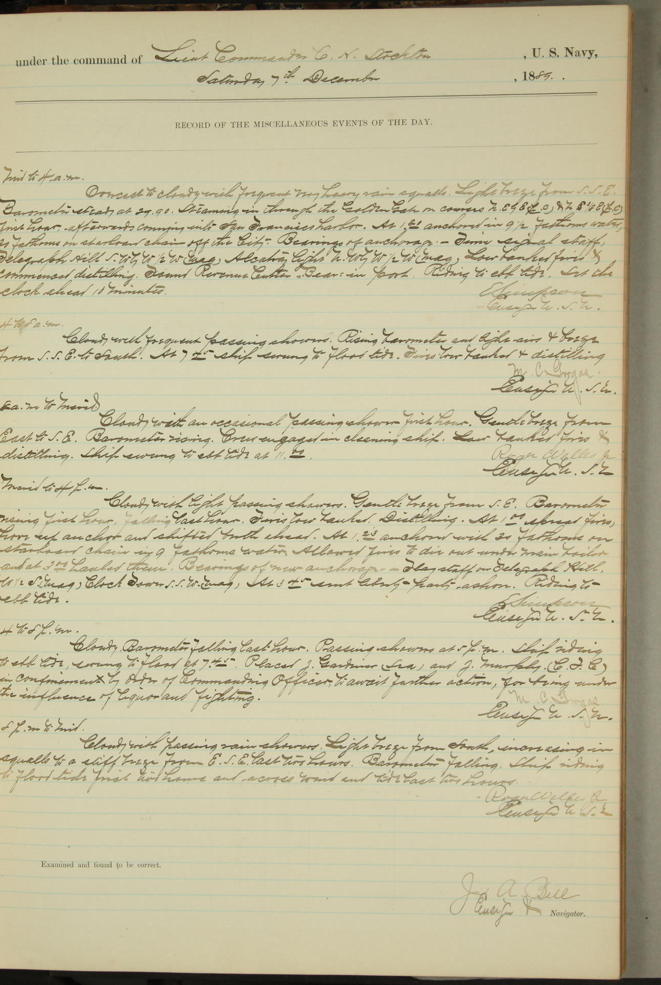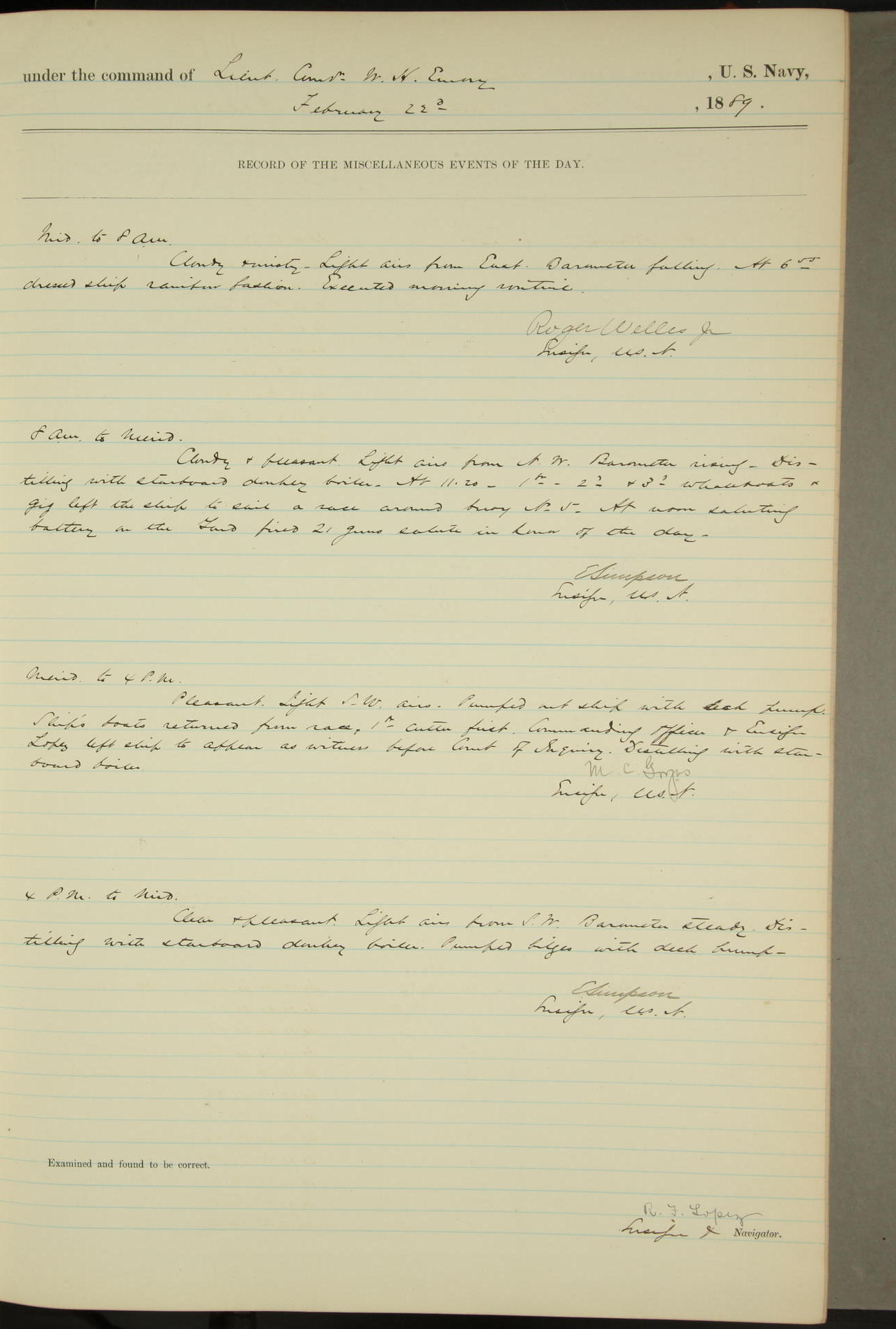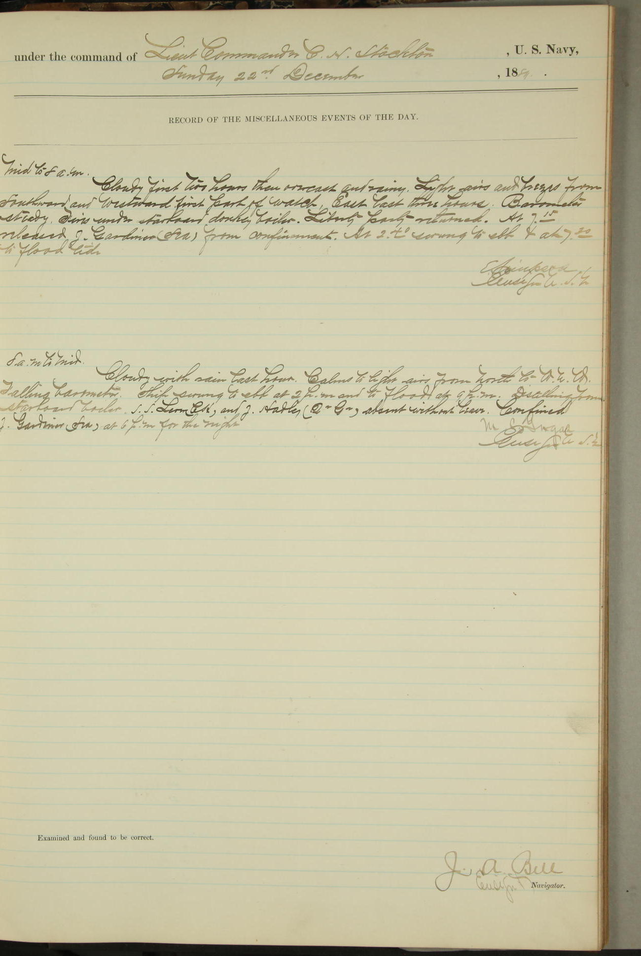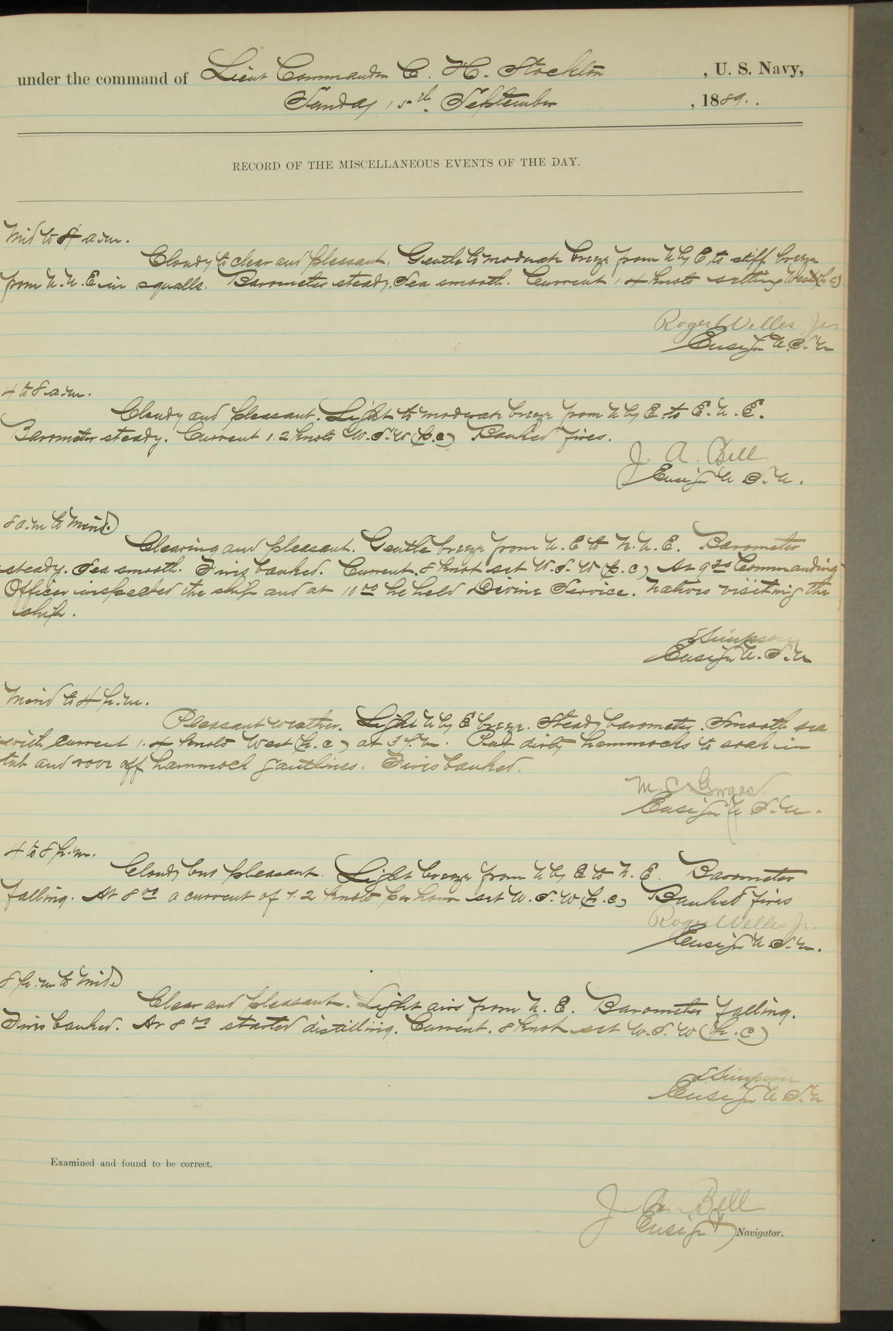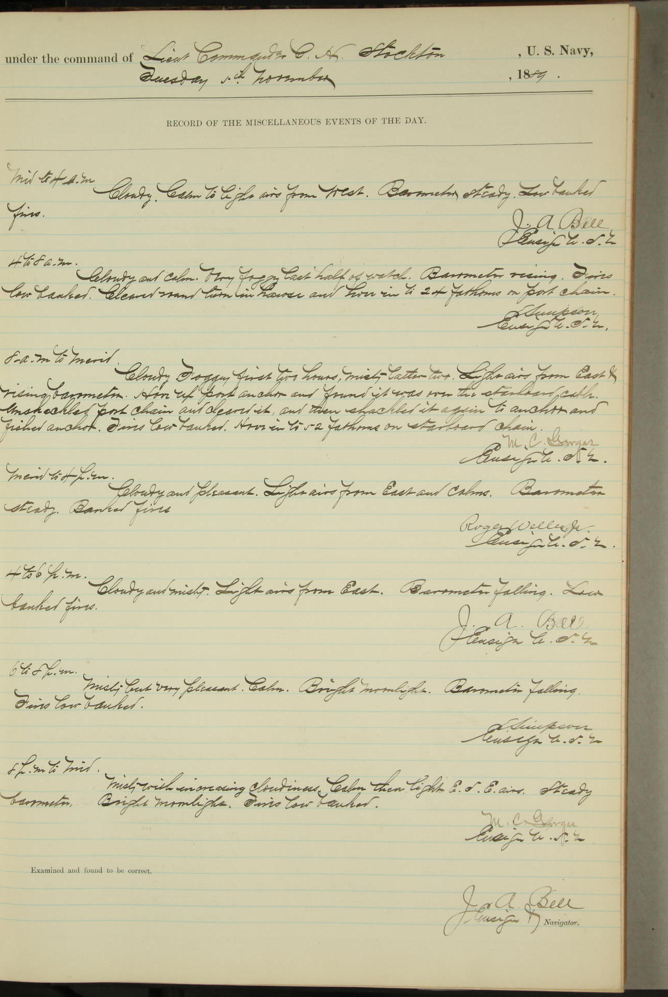 JA Dearborn - At 10am a Summary Court composed of Ensigns Simpson, Gorgas & Dewey as members with Asst Paymaster Lovell as Recorder convened for the tial of JA Dearborn (CH). The court adjourned at 11.20 to await the action of the Comd'g Officer.