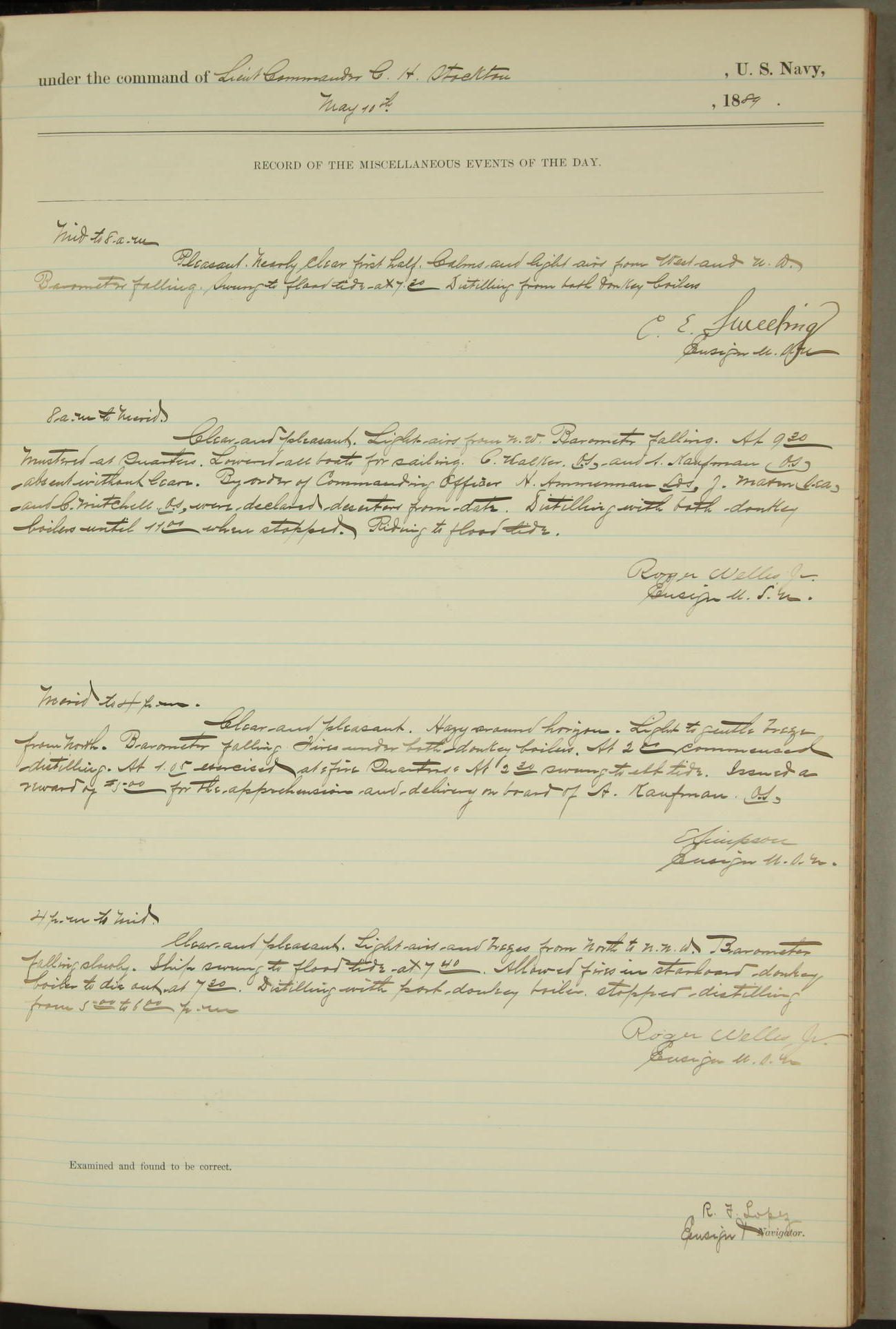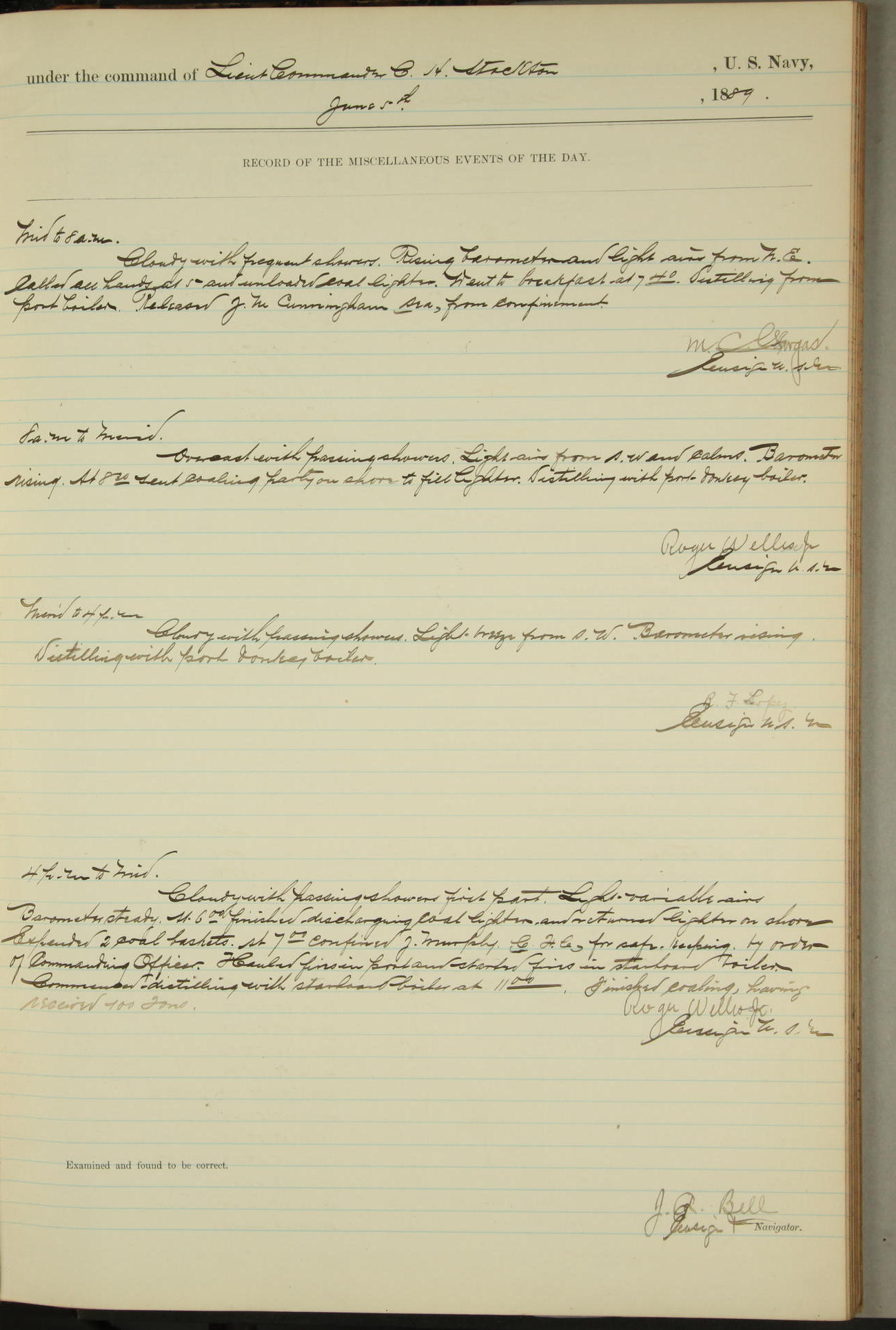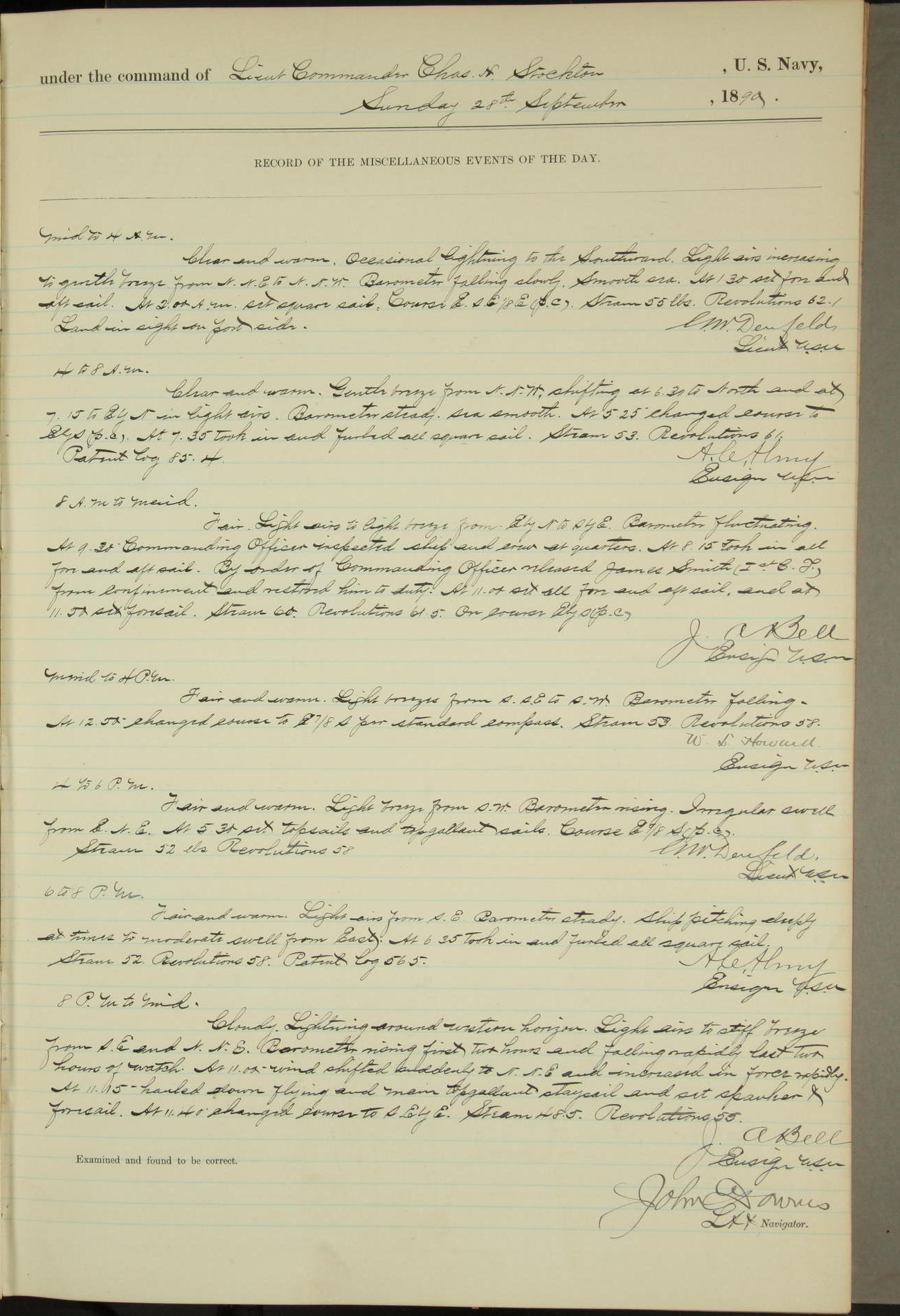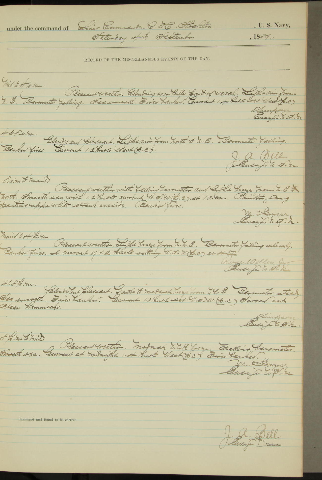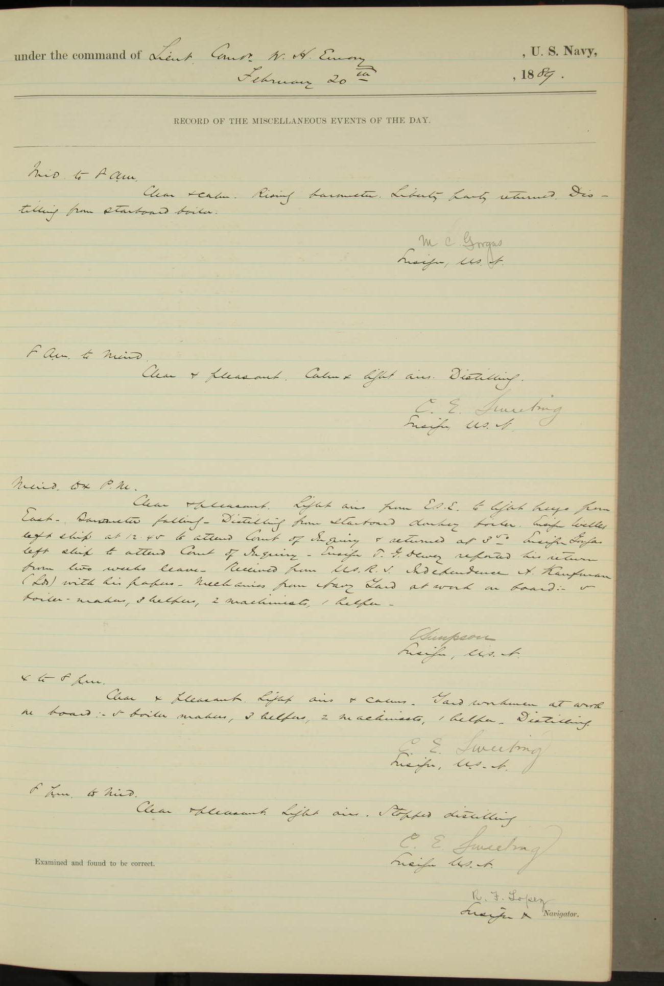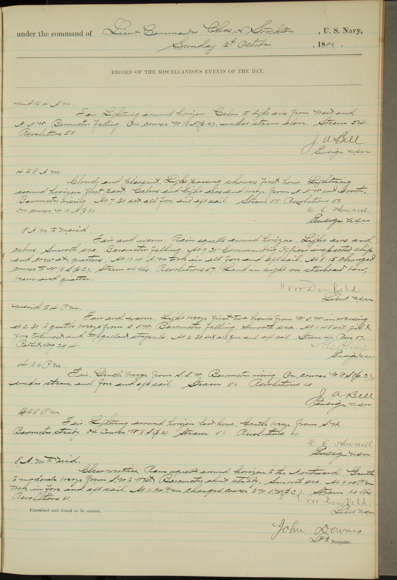 JA Dearborn - At 10am a Summary Court composed of Ensigns Simpson, Gorgas & Dewey as members with Asst Paymaster Lovell as Recorder convened for the tial of JA Dearborn (CH). The court adjourned at 11.20 to await the action of the Comd'g Officer.